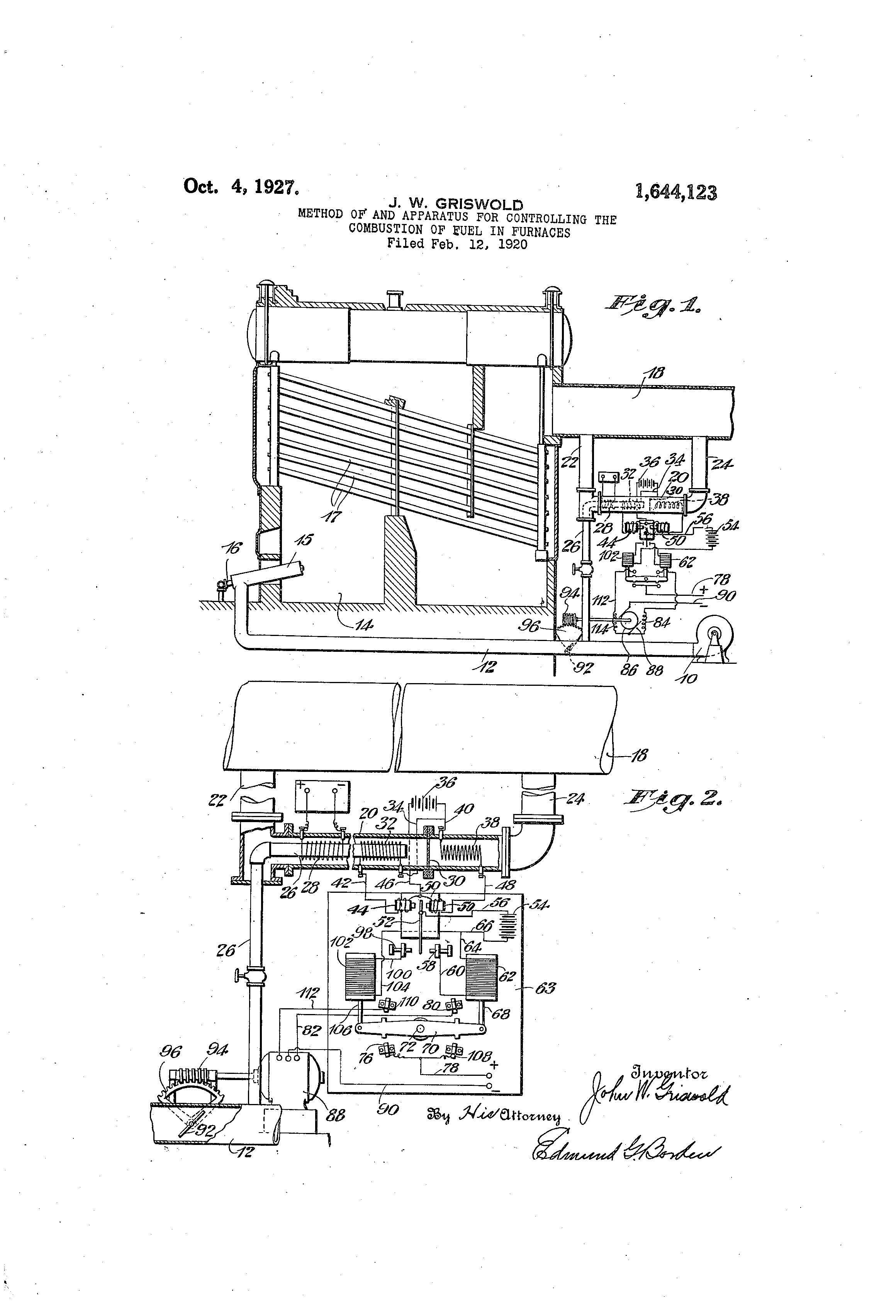 1,644,123 tainer, tavo resistalic,, wires riiounted in s-qicl container, Pn electric eiretiit l'or each -wire, ineaiis to introcl-Lice air itito gas passiiig through saicl container before the gas reache,@, the first of saicl -1@Nlires, a cont,,te@ meiiiber iaio nte iii saicl containei,s betiveen said vvires arraiaged to burii gqs ppss'lii(,- -,@'roLi oii(,@ -wire to the other, and i-iiea,.is 'Lo@- iiiclicating the diff ei,eiice in curreiit flow thru said ivii-es. io 19. The combinati6ii of a (yas stiiiple container, a con-ibustion catalyst iratin't-ecl i,-i s,,ticl contai-iier in position to force gas passiiig throti(,,h said container to floN-, throucli said catalyst, and separate inepns mountec iii said 15 coiit,,tiner it opposite sides of said catiliTs,@, arrangoi to me,@,sLire respectii7elv 'uhe teiiil. i)erature of tl-ie gts before aiid aftei- passlii,throtigh said cttalyst. 20. The coi-iibinatioii of a o-as saiiiple conO@Q taiiier naeans for causilncr flo w of gas 'ilirougIL the contain-'r, a combus@,ion catalyst mouinteci in stid cont,,tiner i7-i the patli of flo-vn, of tl-i(,. c,as, iiieans for iiiixing air Nvith the gas floiv&, ing throuo;h said coiitainer, @iiid separate iiaeans inounted in sqicl contaiiier at opposit(,@ sides of said cat,.tlyst arrlnged to iiaeastire respectively the tei-iiperature of- the gas before and af 1'er pltssing throtioh s,,tid catalyst. 21. The conabination witli a ftirnace ol,: @O naeans responsive to tlie pres@,iiee of coii-ibi-istible constituents in the gaseotis products of combustioii leaviiic, the furiiace for autoiiiciticallyreotilating the ratio betiieen the rate at ivhich T'uel is actually burnect in the 1-uri-i,,tee Lind the rate -,@u A-vhich air is suppl;ecl therelo foi- thecombtistion of the T'uel. 221. The combii'lation -with a furnace of .,@ieaiis i,esponsive 'Lo tlle reseiice of coiiibustible consl,-ituents iii tb@e ga@,eous prod-Licts lea@Tino,@ the furnace --For automatically decreasiiig the ra'tio between the rlte t- -wliieh fuel is ae'Ltially bui-ned in the furnace ancl 'Lhe iate at iviiicii air is stippliecl for its coiiibiistion on an iiierlase in the rel,,ttive aiiioupt I of sa'd coiiibust,'ble constituents in saicl proclucts. 23. Apparat-Lis for regulating coinbustioi-i in a furnace coinpri,,iiig iiieans for oxidiz4ng coiiibustible co--,istituelits of the gaseoug 30 proc'Lticts of coiiibustion Troli.-i the T-Liriiace, i cl iiiealls i-espoiis've to tl-ie ali:iotiiit of o.@l,in 1 clation pi-oduicecl for atito)iiatically decreasi-l,g the ra",io beL'Weeii 'U-he r,-,te at ii,hich ftiel is aettially burnecl ;.n 'LLirnace and th(, -@5 rate at vvl-iieli air is supplied 'lor its coiiibustion, qs the aiiiouiit of saicl oxidation in, el,e,ase,,s. 24. Apparatus for @egulatiiig combustioii in a, furiiace coiiliprisll'lg in coiiibiiiation co mealis tending,to mai,-itain the ratio betweeii t.1-ie rate at vvlaich 1-uel is actually burnecl iiA the furnt,.ce and the i@ate at which eir is sup pliec[ 'Lor its coiaibustioli in excess of 'Uhat a'k, ivhich con-iplete coi-iibustioii occurs, ancl i-,ieaiis autoliaatically i@espoiisii,e to the pres, c5 etice of coiiabutstible coiisti-tuents in the procl ucts ol' combustioil leavino,- the fureace for clecreasii-ig saicl ratio as reqiiirecl to keep th,-aiiiouiit of said constitueiits si-nill. 25. TI-ie coiiibinatioii with a 'Ltirnace hav - 70 ing a combustion chamber, a fuel stipplyina iiieans aiicl an air suppl,ying means, of means for automatically increasing Ind d'i-ninishp - ii-io- the air s-Lip lied as the amoliiit of combtisti'Dle coiistitueii'ts -in the prodilets of t' co-,-.qbtistioii leaving the flirilace increases ,til-d diniinishes. 26. The i-nethod of conti,olliii.o, furnace con-ibus'L-lioii which inclucles the steps of preheating flue gas from said fur@-IIce ancl callsi-,.-io,- tl-ie coinbustion of an uncoilslimed elemei@.t of coiiibl,.stioii reiiiaiiiing thereii-i, aild utiliz,"liothe increased teiiaperature resultilig LI ft,oi-ii the coiiiblistioii of said flue gas to control t]-ie supply of an eleinent of coinbu.-tiod S5 to the furiiace. 27. A metiiod o'L controlling furiiace coiiibusli-oii iviiieli includes tl-ie steps of heating Liue gas froiii saicl furnace to substaiitiall3t -its lgiii-tio--i teli-iperature aiid b-Lirnii-ig an un.@ 90 constiiiied eler-,aerit of collibustioii reiiiaining tlierein, conipari.,ig the heatino- effect of a qliaitity o' fllie (,,as so ti@eated L iaith a staiid, arOL of compariso.-i, and regtilatino., the si-ip. ply of an elei-iient of coii-lbusl@iol-i to tlip@ fur 95 iiace in accordap-ce ivitli slich coiiiparisoia. 28. The iiie'uhocl of controlling furnace combustion w'ilicli ineltides exposing a teiii, pere,,tui-e respoiasive meaiis to flue gas, cau,,- ino, the coiiibustion of an eleiiient o-T coiii, 100 b ustion reiiiainln(,y in said flue gas, exposing t secoiid teiiiperatt,,re i-esponsive iiieaiis to @ulie increased L(,inperatlire cau-@ecl by reason of s-aid comb-Listion, aiid coiiti-olling th6 sup@ d -L iiient of coriabustion to the ftiri)!,T o' ali ele 105 in accordance ivith said teniperatur(, respoi-isiie n-ieaiis, subst-@Liitially as describecl, 20. F-cLrn,,ice control apparatus includini), n iiieans for causill(Y coilli.)ustion of an unconsuiilecl element of coinbustioii i,eiiiaiiin(y ill 110 tlle flti-I gas of the furnace, aiad iiieaiis aettiallecl in accorciance Avitli tlle Coliaparative heating effect of ), qliantity of gas so ti-eated with a staiidarcl of coniparison, s-Lich iiieans beidg effective for controlliiig a supply ofan elon-ient of coi-nbtistioii to the furi'lace, substantially as clescribed. Iii testimoiay iihereof I affix iny signature. JOHN WILLIAI\L GRISWOLD.