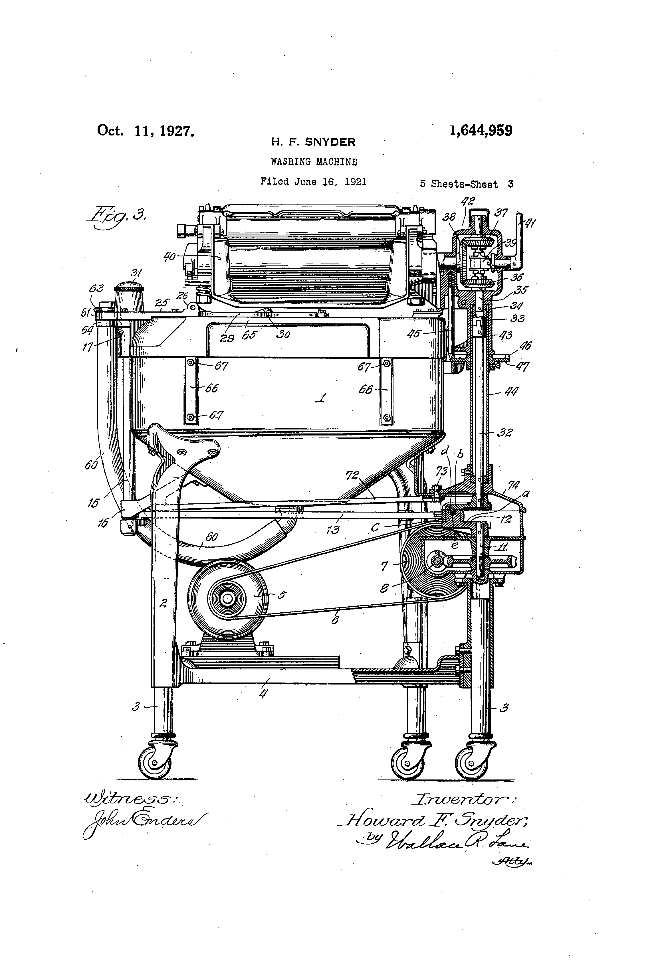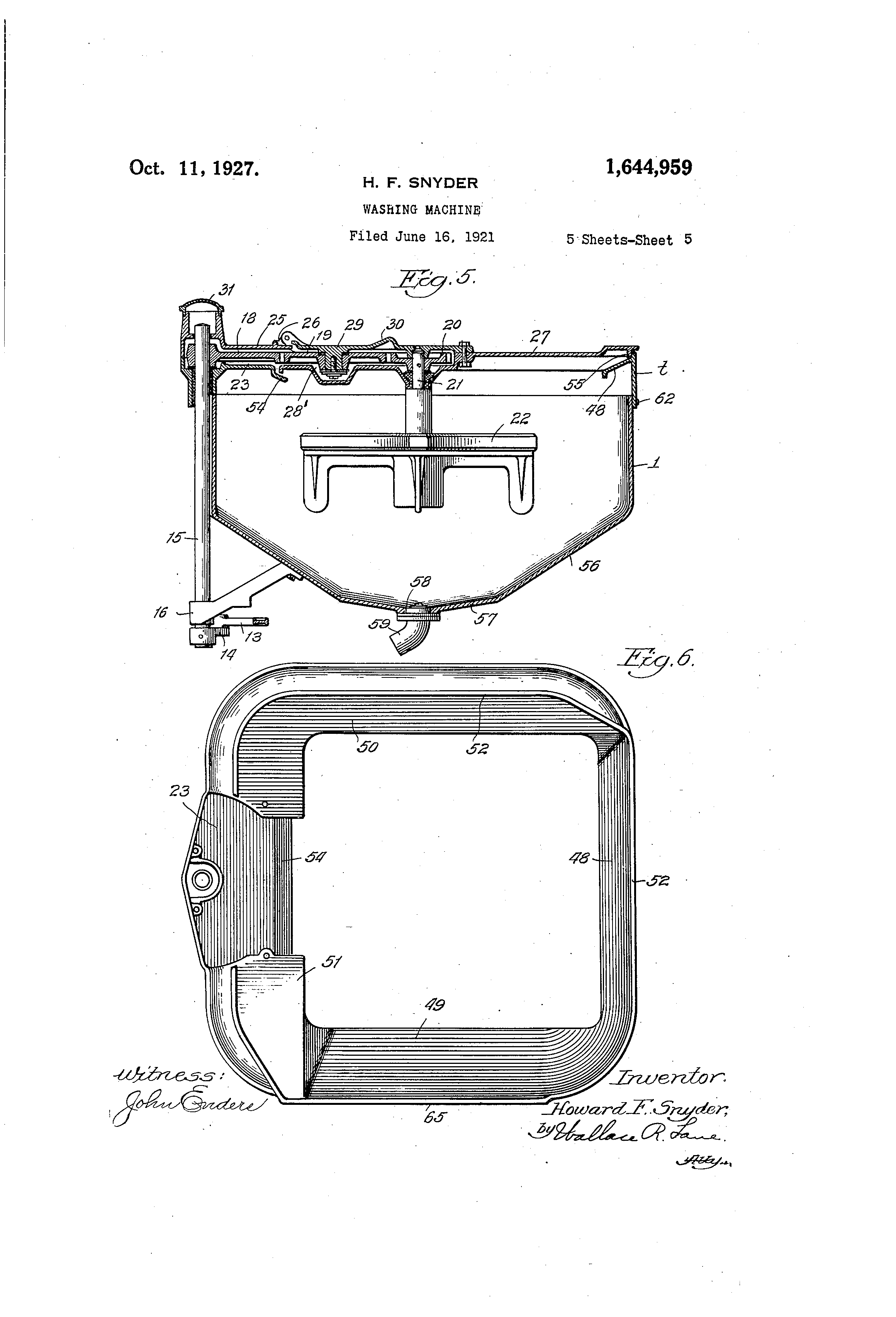 Patented Oct. 11, 1927. 19644,959 UNITED STATES PATENT OFFICE, HOWARD F. SNYDER, OF NEWTON, IOWA, ASSIGNOR, BY MESNE ASSIGNMENTS, TO THE KAYTAG COMIPANY, OF NEWTON, IOWA, A CORPORATION OF DELAWARE. WASI-IING MACHINE. Application filed June 16,1921.---SeT:ial No. 477,888. This invention relates to ivashina machines, an(I includes ,imong other iinprovements such construction that either before or after a period of use a need 'Lor increased i5 capacity can be met b)r merely -@ecuring an auxiliary - washin- m'achine, substantially similar in constructioii to the first iiiachine (except to omit the i-notor and -,vringer), to be colinected to the first n-iachine for opera'L;-on from the mot6r thereof, to enable botb machiiies to work together as a unit. . Among the further object-s of my invention is to provide for the all-t,,tchment of an auxiliary -washing machine to one already in 15 use, in a quick, simple and efficient manner, both machines to be driven from the motor of the first iiaachine by a simple ,ind quickly effected.connection, and both served fr'om a single swinaing -wr.in@,yer; ftirther to pro20 vide novel means fo@ codnecting together such plurality of machiiies; further to generally improve Nvashing machine construetion; fLLrther-to so construct th(@ top portion of the ttib or tubs that spilled water will 25 run back into the tub instead of on the floor; further to form the body portion of the,t-Lib ,of metal, preferably aluminum, and sloped toward the center to permit the easy attachment of a hose, or the like, to effect ready 30 draiiiin(y of the tub without tilting the sam,e; further to provide washino, machiii@ tubs constructed ,vith one or mor@flat sidos at the upper portion; to so arrange the dolly clriving mechanism in the top of the tub as 35 to render the top thereof substantially unobstructed and practically flat; further to provide an improv-ed washing machine tubformed of aluminum, which will not become watersoaked, rust, corrode, dry out, slii,er 40 or split ther to increase the capacity of clothes @'ausrhing machines while occupyino, a small floor space; further to render poss@l-ble the was@ing of only a few pieces with little water, and peri@it removal of t-he 45 water from the tub without tipping the tub; further to provide improved means for automatically throwino, the washer out of gear when ihe lid is @aised, and into gear when the licl is closed; further to provide a 50 washing machine extremely easy t-o operate, and having the main worIKing parts enclosed in oil tighf cases, and to eliminate danger of accidents; further to provide a washing machiiie . especiall.7 adapted for use with a 55 swinging 'Wringer, 4nd a swinging wringer , tliei,efor; furtl-ier to provide a washing inachine constrileted substantially entirely of. inetal, and one that can be easily cleaned, alivays saiiltary, and lio-l-it in weiglit; further to so combine a -wa@shing inacliine and 60 swingin-wringer that the latter can be i-emoved bv nierely lifting it from the franie; further to prodiice a washing machiiie of maximu m simplicity, efficiency and economy; and such further objects', advantacres 65 and capabilities as will latet more fully @ppear. My invention further resides i-,i the combination, construction and arrangement of parts illti:strated in the acc'ompanying dr'Lw- 70 ings, and while a preferred embodirnent i-- sho@in therein, I desire the same to be understood as illustrative only, and not as limiting the scope of my invention. In the drawings:- 75 Fig. 1 is a perspective view of a clothes wa@,;hi no, apparatus ernbodying my invention. Fig. 2 is a plan view of the arrangemen-6 shown in Fig. 1, but omitting the gear casing cap from the lef'u hand machine, ancl 50 with tb.e wringer removed. Fiol-. 3 is a sectional view on line 3-3 of Fig. 2, but sliowing @he -v@ringer in position, @he main parts of the wringer being showii in elevatioii. Fig. 4 is a vertical longitudinalsection oD. a central vertical plane, taken throuo,,h botli tubs of Figs' 1 and 2. Fig. 5 is a, vertical section throulrh one of the tubs on a plane at right angl@s to that De of 'Fig. 4. Fig. 6 is a plan view of the top of one of the tubs, with the cover and a;ssociated parts remove d. Fig. 7 is a fragmentary sectional detail., 95 showina the manner of connection between the two tubs. Fig. 8 is a detailed plan view of tl-ie op.- crating parts beneath the tub. Refe ring to the drawi-ugs, Fig. 3 sho-wo ioa the main or primary washing ii@achine of iiiy ifivention, in which the tub I is mounted upon the legs 2, having adjustable extension.Q 3 at their lower-ends. 'Seciired to and extending between the legs.is platform 4 car- 105 ryino,, any suitable form of motor 5, whicli. is connected by belt 6 (or other sllitable power transmittiiag means) to drive wheel or pulley 7, carried by shaft 8, which shaft as seeii iii F' 8 lias fixed to rot4t@ thc,-re- 110 19- 1,644,959 'tli worm pinion 9, meshing with gear 10, mounted upon the lower end of. vertical shaft 11. Fixed to t-he upper end of shaft 11 is crank arm 12, to which is pivotally con6 nected the connecting rod 13, whicli at its oppo,gite end is pivotally connected to a second crank arm 14, mounted at the lower eiid of vertical shaft 15, which as shown in Fig. 3 is journalled in suitable brackets 16 to and 17. Fixed to the upper end of shaft 15 (see Figs. 2 and 5) is seoinental rack 18, mesbin(r with liorizontal (year 19, which in turn hqs driving engageiia@'nt witli ' on 20, plni fix,ed to t-he upper end of clolly shaft 21, which shaft extends downwai-(fly into the tub and carries the agitatiiig or dolly member 22. As seeii in Fiys. 2 aiid 5, ttie segmental rack 18, gear 19 and p@nion 20, are seated within depressions or casings, by reason of which the top of the tub is substantial flat and free of projections. Sur'y rounding depression 23, within which segmental rack 18 is seated, is an upstanding rib 24, and coveriiig this depression is a cover pla-te 25, form