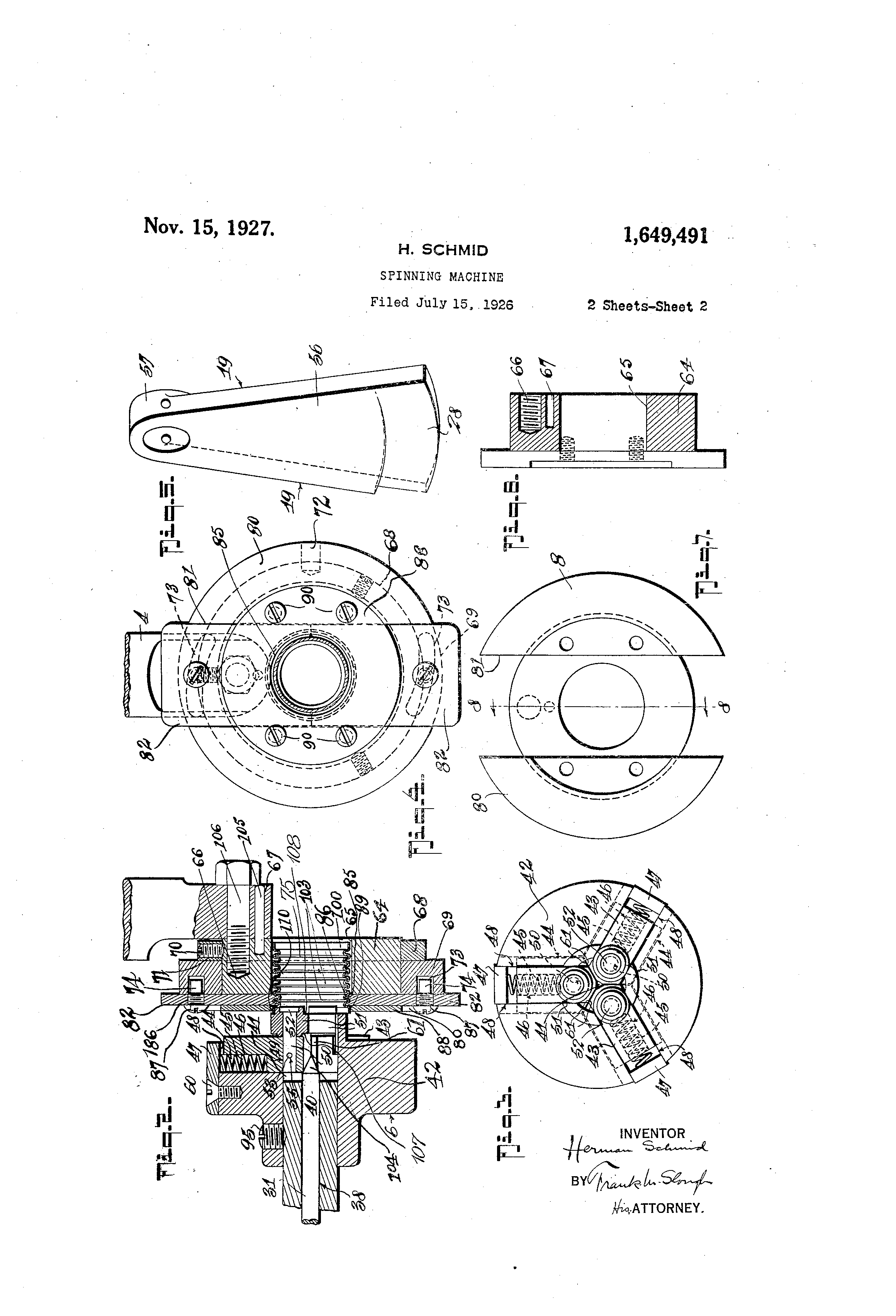 Patented Nov. 15, 1927. 1)649)491 UNITED STATES PATENT OFFICE. HERDEAI@T SCHYLID, OF CLEVIILAND, OHIO. SPINNING XACHINE. A-pplicatiorL filed Tiily 15, 1926. ScriaI No. 122,535. ivly ii-iveiit;on relates to a iii,@ichine for ex p-,tiicliiicr inetallic tubular ,irticles -,tnd more n particul,@Lrly it relates to a machine for smoothi-P.L) - cfoiith portions of met,,tllic tubes, slich as tubular belloivs. One o-l@ the objects of nay irveiition resides ii-i the provis.ioq of -n iiiipi,o-,Ted expai-idini-n-eclianisiii adap'Lecl to roll the clefoi-mities i@) in the iiioutli oi' tlibtilar bellows of a w6lll@noivn t3,pe iyithout -vve,,ikeit'ng th6 s,,,me. Aiiother object of illy invention is to provide such a meeliaiiisiii N-vhleh ri-itiy be reaclily acljtisted for operating oii iiieta Ilic tubular articles of varyjp-g cliainelers. I .5 Aiiother object of nV iiivention i-, to provicle an impi@o.ved maelilne of this type -whieh is siiiiple and efac-lent and citir,,Lble in coiistruction. ,Lncl capable of qLiiel@ly and efficieiitl)T iiiipei-fectio-iis frolu the in 20 ter;.Ol: ar@d e@.-@terior -@-,,alls of tub,,@ end 13ortions iii aii etteacious iiianiier. Another object of n-iy invention is to readily el'@ect the grippin,), ancl accui@ate positioning of saicl tube iiiouth for such siiioothiiig 25 operalioi-i, parallel to the corrtigations in the tube. Otl-ier objects of iiiy inventioii ancl t-l-ie inveiition itself Avill be ,ippareiit froiii reference to the folloivin(T de--- cription of an eiii:30 bo(liment thei-cof ivlilcl-i embbcllinent is illustratecl iii the accoinp,,tnyiiio, dra-wings whereill: P-,efei-i-ii-ig to the dra-vvings: ri io-. 1 is a sicle elevational view of an ap35 para@Lis einbodying my inventiori. Fig. 9, is a tongit,,idinal inedial sectional v@e-w of Lt clie ancl iiiandrel per se.einployed I in 'Lhe s,,Licl eiiibodiiiient, iii operation., li'ig. 3 is a froiit elevatioiial view of the 40 (lie part of Fig. 2. Fig. 4 is a front elov,,ttioiial view of the iiiai-t(lrcl part of Fi(y. 2. Flo,-. 5 is i perspective vic@w of one'6-f the pai@t,@,@ eiiiplo@,ect iii the eiiibodl,.iiei-it of Fio'. 1. li5 Fig. C) is a side'elevationql vie,,v of a iiieallic bello-,vs, ,tclaptec[ to be oper-,tted upoi-i L by the appi@,,ttus. Figs. 't to 10, iiieltisive, are vieivs, iiiostly iii otevatioii, of soiiie of the i)arts comprised iii tli@, said ciiibodlillent. and Fio-. 11 is a-perspletive view of another part emplo37ecl tliereiii. P.eferrino, to all the figures of tlie cirav@,iiigs in ,Lll of Nvhlch like parts are designated 515 by like 1--el'evence eb,@u-,,tctei@s, at 1, T show in 9 @ ciioril t t,,Lble for supportin(y iiiy improveci naachine frame generally de,-,sigiiated at 2 I and ,it 3 o,.enerally aii ex 'anding iiieclianism n p aiid rliindrel carr'ed Lil)on olie eild of the said fr,,ime, aiid coinprisin- a die niandrel t) 60 ind article gripper supp,ol-tiii(y b,,tr 4, .t die jiiandrel 5 and an expanding die 6, said expancli,,io,@ CLie tnd n-lanclrel will be hereiliafter n-ioi'e flilly desetibed in detill. The iiiachine fraiiie 2 foriiied preferably of a, siligle casting comprises a btse plate 10 and a iiiai-ii body 11 and ldter,,Ll projection 13 i-ipon ;xTlilch the trious parts v of the machine are c,,Lrriecl. The main bocly pbrtio.n 11 exte-tids -L,.pivl@rdly froin'tlae bise 10 ind is 70 aperttired a@1j,@icelit one end to periiiit preferably a di-iven pulley wheel 12 to rotate tlierein al'id provided at the opposite end u A ilh tlle lateral integral pi@ojection 13 adapted to support the maiidrel supportin(-Plbar 4. 7,5 The franie is suitably ribbed abotit @its edges such as at 14 to reenforce the san-ie for li,,,Lvy operations. BeariDg boxes 15 aiicl 16 are proviclect and disposed aclj,,tcent the upper edge of the so fran-ie being prefei-ab@y cast inteoi@al thei-eNNitli ancl,ai-ranged iii spaced relatioii to eacli other ind aclapted to rotatably, s-Lip I port ,ii-i operatin- shaft 17. Said shal-t'lias provideci on one eiid Iiii oper,,ttor's h,,indle 18 and at its s5 o j@osite enci t caiti 19 secured p thereto pref erably by i t,,Lpered pin 20i as shown, or in any sliitable iiianner. Thrust collars 22 aiid 23 are iiliounted on the shaft iiiterniediate it's encls ancl contigilious to the inner -%valls of the I)o be,,iriiig boxes 15 alid 16 and Idaptecl to preve nt I.ateral displacement of the shaft tl-ierein. Preferably tapered pins 24 are iiiserted into suitable opeiiings i-E the collars to ietain the same in positioii on the shaft 17. 95 Bronze b-Lishings 26 and 27 @tre inserted iilto the joliriial boxes 15 and 16, respectively, to 1)roiide an efficleiit be,,iriii-- for the shift. The caiii 19 Fig. I aiid Fio@. 7, colilprises pref-erabl.y bod poi-ti6ii 5.6, htv'liio@ ,i loo y cyl'ndric,,il I)ortioii 57 it its upper encl and a beveled face caiiiiii-ed po-i@tioii 28 at its lower encl iyl)ieli depencis froi,,-i the sliaft -17 preseiitlllo,- the beveled face laterall.1, of a. holloii, cylinclrical sh,,tft 30 and contiatious 105 to -.t die expander rod 31. Stiid shaft 30 is horizontftlly disposed substaiitially inidway of the fran-ie and rotatably supported in bearing boxes 31-), 33 apcl 34 all of which are provided witli suitable bearilig busbing 35 lIQ 1,649,491 of brojize, or the li,l@:e. The pulley iybeel 12 Is secured to the sliaft 30 adjaceiit oiae ejid by a pin 94, as slio-VN"n, or iii @itiy well l@nowji and aclapted to ro'L Ite said sliift I I , Nvlien i,ece'v'iiu poii,ei, ti,6iii a ,@oiirce, ii.ot slioivnl blit i,)ie;"or,,ibly t piilley Lelt di-iv(-,@-i I)y aD. el,eCtriC iiiotoj--, o@,, 'L-lie lilce. TI)e oppos;lte extreiiiit-y of the sh,,tft is acltptect to cai,ry the expaiidii-i(,, die 6 socu.,i-ecl thei-oto by 1( piiis 95, oi- tli(, like. Thrust collars 36, siii-iiltr in construction to the thrust collars 22 and 23 qre seelii-ecl to the sliaft interniecliate its encis and c ontic,yuous to the oppo@,ecl iliner faces of the I r) beariii-S 33 aiad 34 to pi-e-veiit lateril iiiovc,li'lent of t