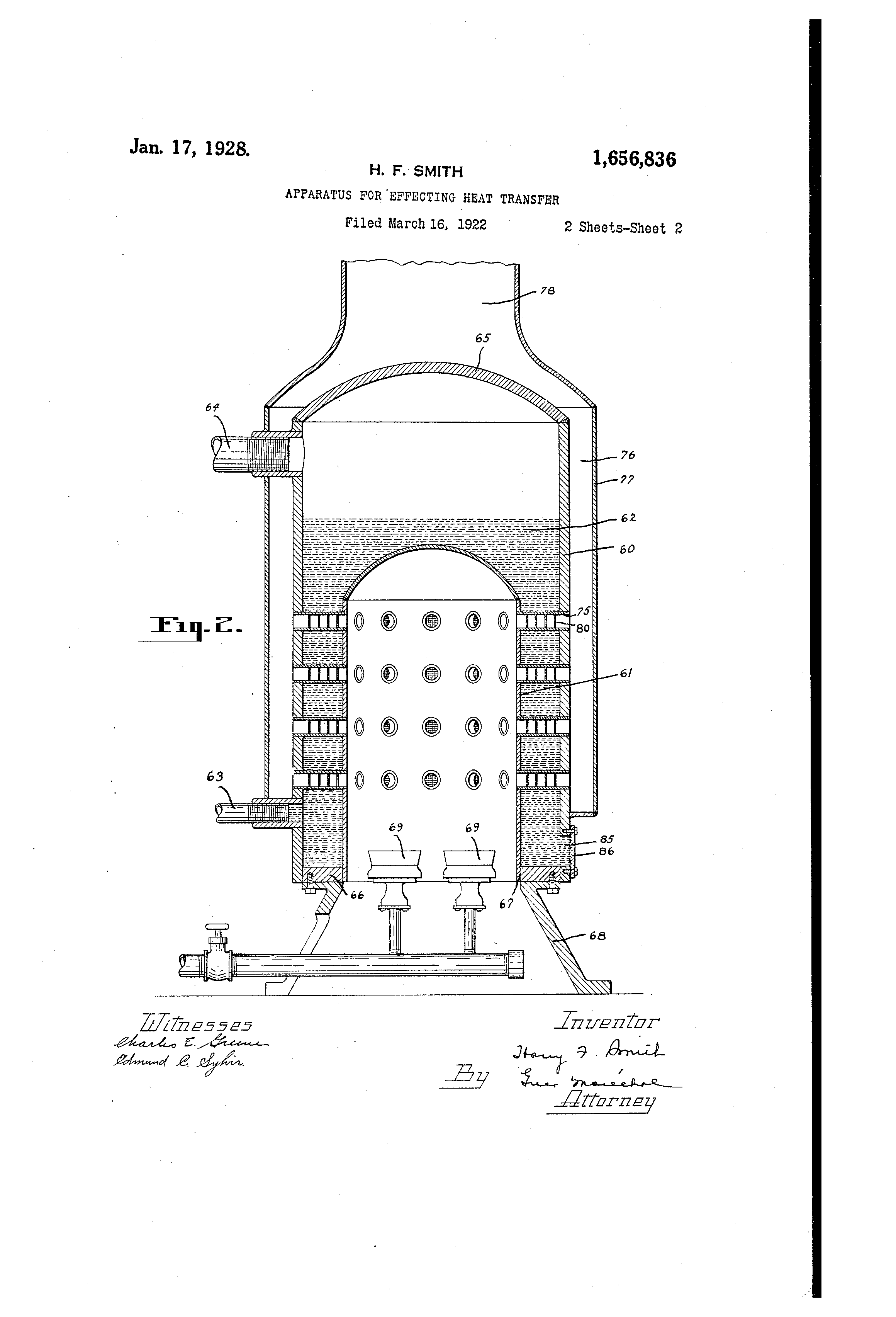 This iiiventioia relates t6 heat tr@iiis-iei@ , alid niore i,)artictilii-1 f -f I ii-i y to the trans er o ieat ' connection with lieating app,,tr,,iti:ts, Stich as boilers, tind the lil@ce. 5 one oil the prin(@ipal objects of this in@,eittion is to prov,ide an in-ipi-oited foriii of beattraiisferring a p,,ii,atus, pai@LiCILIlirl3, ad,,ipted p for heating;-witer to pi@OlTide 1-iot ivater or steam, whicli aT)p,,ii,attis is siiiiple and cheap 10 in construction, efficient iii opei-atioii, iiid of small s, e wl-ieii coi-.apare(I to otliei- fo s of .z I'm Nvater-lie,iti.ig apparattis of the sai-.ie cipacity. Other objects al'id a(lvantao-es of the iiitn e ci@ p 15 ientioii -",ill be appareilt, froiii the cl s -i tion t'llereof set o-Lit beloiv iilieii t,,ili@eii in coiinection Nvith the accoiijpanl,-iiig drtN@,ing. In the drtnving in lil-(' chrracte@@-s 6f refei-ence desi(yiiite lil,:e 1:)arts tlirouglioiit-. the 20 sei@eral vieivs tliereof Fig. 1 is a sectional iie-w of t siiii le forin p of boiler conslriieted in ,iccordap@ee ivitli this inieiition; ind Fio@ 2 is a. zect,ional vie-,v tbro-Ligli i inodi25 fied form of c-oiistriietion. This method of heat transfer is of @4eneral application; bti't. for piirposes of des@@iption it is illustratect qs beiiig emploATed ill tllo tr,Lns'Ler of heat from beqted g-,ises, siieli @is 30 lieated prodi-icts 0-' coinbustion, iiito iv@itei, to heat tlaat wp@ter for -Lise in -, hotis-liolci hot w,iter sistem or to geiierate steana. AiiO, in Fig. I is showii -, siinple, blit ver-v elfeci@ive .ind efficient, tyl,@O Of ap@arattig c@)iistriieted 35 for carryiiig o,.-i tilis iiiethod of he@,,t transfei,. In tli,,it figiire the Tiiimeral 10 desigiialles tl-ie oilter shell of a water lieatei.@ or 1,)oiler -which is preferably covered ivith suitrble laggii-i to etit down lieit losses fro g@ , m tli.e 40 sl-iell by radiatioii@into the atmosplio-re, this 1,,to,-ging being shown cqs eiitirely convelition,,tl il'i construction ,tnd desigiilf'@d by the nLin-ieral 11. The upper eilcl of tbe, I)Oiler is clo,-,ed by ineans of tl-te he,,id 12, having i, cen45 trally ,irriiged openina 13 tliereii-i. The lower end of the boilei, is close(I I)y meaiis of the heacl 14 ivliieh has a celitr,,iti.y ,,-,rrq,nged ope@ning 15 therei--,a. This openil'lg lr) is internally thre,-,cle,-l Itnd is ,tcl,,ipted to receive a 50 corresponclingl@,T tbreaded exteiision 20, ried by tli- i-iten-iber '-)I, which seri7es to s,,lp1)(,)rt tl-ie anci to )Ilso receive ivit.hii-i its hollo-wii-itei-@or29-.tlieburiiei@28. Wliiletliis biii,- iiei@ iiiiv L@e ol-' an clesi.red consti-tic@tlion it y Patented Jan. 17, 1928. UNITED STATES PATENT OFFICE. HARRY F. SMITI-1, OF DAYTON, 01-110, ASSIGNOP. TO Tl-!E CAS RE, Col@,i-eAbTY, OF DAYTON, OHIO, A COI,'PORATION OF OHIO. APPARATUS FOR EFFECTING HEAT TRAIT,'S-VER. Ap-plicatioii filed March 16,1922. Serial No. 544,256. is sliowii as@ beiiig of the inducti6ii t'vi.)e, fuel@ r)5 of any desii-ed char,,ioter sticii as gas, il a--ad tlie like, being iiitroclticed tli@POLI(@l-i the pipe 24 and drawiiig iii at tile sairie tijiie, ai.r in the proper proportioi-i, tlii-o,,i(-Ii opeiiings within the pl",@te 25, iv'iiilh opeiiino,-s ai@- e@not 60 shoivil iiiasiilucli as tlils type of b-Lil-iiei- is 6f coiiventional co-qgtriiction. A pliii-ality of opeiiings 26 ire proiidecl iii tb(, iiieyyib@r 21 throtigh ivliicli air foi- coiTibListion is adiii'ttecl to stippleiiicit the -stipply oi" -.i@ en- 65 I tei-ino; tl-ii-otigh tl,,e air port-,s in the pl,,tte@25. Rigidly s I ec-Lti-,-,cl vtithiii the opeiiiiig ii-i the ext-eiisioii 20 is ,t ttibe 30, o@r cop_ -nay be of bi-, ss or @ilti ' pei, tholigii it i ll'IIRUIU oi, Ln-@, other ma-L-C-r@'LLl xvhicii is a good con- 70 du or of heat. Aiicl by t@-e, tei-iii '@'o-oocl e(n et di-ictor of lioat" is iiieiiit soiiie i:yieta-i. ivliieh is a better coiicltiotor of Itic,,tt th,,iii ii-oii. The practice of tliis' iiietli6cl .toes iiot iiecessaiily iftvolve the use of a iiietal of Iiio'll co@idi@te- 76 t, tivity as the iiiateri,,il foi, the @,tbe 30. T)Iit @'iie effectiveiiess aiici eflicieiicy oi;" 'cl-ie metliod of hoit transfer is matei-iallv iiici-ease(,l if a j-.iiet-il of this chai-aeL-Or 1S Its'ed. This t-Libe 30 is so constructed that Avii(In so the extelisioii20 is tbrOLCLedi ei-igao'ed. ivitli- . y ill t-Ile opellilio' 15 tl-ie U]PPOI. (@i'd of tii6 tiibe ivill exteiid throtir,;I-i the opc,,niiag 13 in tl-ie uppei@ liead 12. The liead 1.1-) is pi-ovided with a ll)oclket@ 31@ t,liei-eiji@ AA,Iiieli sei,@,es as @t 85 stliffing box to i-eceive pacl,-i-@-i(I 3@), -which ZL, may be of ,iiiy coiiventioi-i@Ll charzieter. The, glal'id 33 extends - iiito the stiiiiiiig box for coiiipressing the ppel6iig to eltect ,t tiglit joliit and preireiit. lealc-,,,ge o-12 Avi,-,ter or steam 90 froni -witliin tl-ie boiler iO tlii-otio-h the opeiiing 13 sliitab-le sttid bolts exte-@idi-n(- tliro-Ll(,Yh the glaiid 33 ,ind I)eiii(- th@e@id@,dl@7.ii-iounted witliiii @ocli:ets ill t ii:ieiiij)e:L@ 12. to gi@e iiny desired COIUPressloi.1 'C)il tl-ie piclciiig. 95 The iiiel'i'lbers 10 @iiid 30 ai-(, 1,)l,e-.@oi@a'[)Iy eylindrical, and c(,Iaxi,,,I, @,.l @"pace 4,tO tlii@iq beijig provided betweeii t'liesc, ti@,,) iiie@l@,-Ibers )-Vhiel-i is acltpted to (,,oiit,,iin the iit,,tter to 'oe lie,,ited, and ,ilso to contliii iiii- ivhere the genlo( eration of steaii,. 1F, desii,e(l.. V,@@Ta'(-er (@n'L-ers the space 40 thi-oigli tlle pipe 41, AAhicli opeiis ilito the lower eiid of tli.,it s a ce, tli(,, lieated p iv,,iter or geli.erate0i ste,@,m 1:),,issing off thro,i(,Yh tihe pipe 42 wliieh is coi-inected to the upper 105 end of the ,;pace 40. As showii the app,,ii-at,-Lis is ad,,ipted to function as the hot witer heqter of a holise- hold -w,,tter supply systeni, the hot i@,ater from k-he space 40, diiiin(,- the tisual eirclilatioli 1),Isslllg tlll-o'Ligh t e I)II) 42 t6 the place of stora (lic-, (@ooler -w@iter rettiriiiiig tlii,oticyl pe 41. If desired the pi@pe