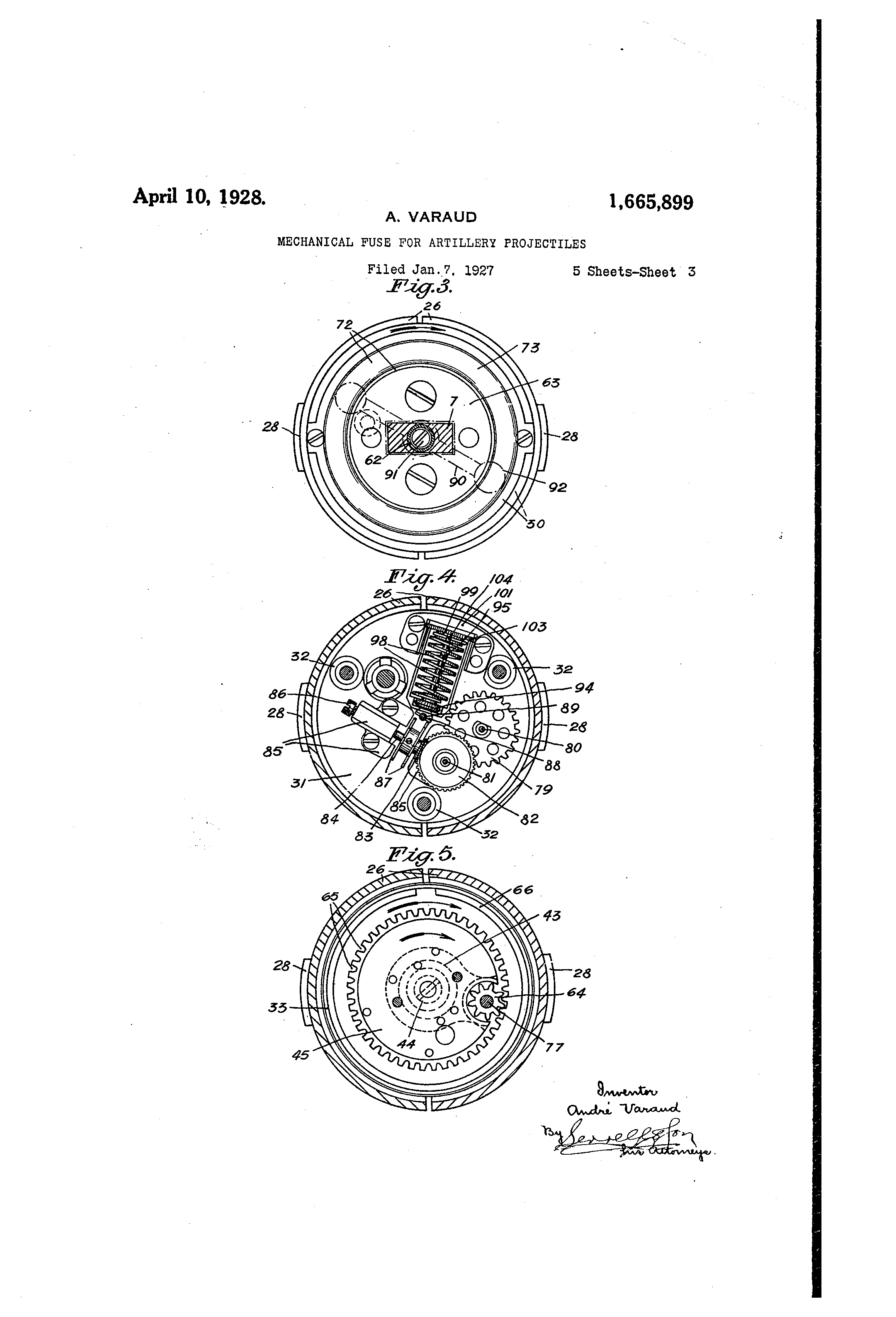 claim as my iiiventioi-i: 1 . Iii a iiiechailical fuse for artillery pro jectiles of the type in which the power member of the clockwork is constituted by a 80 barrel shaft arranged in the axis of the :fuse in stich a maniier as to describe several revoltitions in one direction for effectin 9, prior to fii-iiig, sliiiultaiieously the wiiiding and the setting or adjusting of the fuse, and in 86 the invers(,, direction and during the trajectory under the action of the power spring -,tiid for drivi-iig the i-otary member control[in 'y the release of the striker member, and also for transmittina the driving power to 90 a i-eotil@ttiii(y device of the clockwork with a cle,,tcibeat enscapement and a spiral balance, in combination a fraine, for bousing the difforeiit iiiovable'members of the clockwork said fiame being composed of at least two; 95 p,,trts, one of them being a fixed one and coiitainin g tllg, power spriiig, said fixed part beiiiinteci,al with the fuse body, and ai mov@bl e o@ne adapted to become, pri'or to firiiig, displaced angtilai@ly with regard to 100 the fixed part, f or effecting simultaneously tli(,@ wiliclino- of the power spring and the I@tjustin g of' tiie til-ne of ignition of the projoetile clia,rtye, means bein- pro-@ided, which, in function of the inerti'a, ai@e adapted to 106 rendei-, dui-ino, the con-iplete ti@ajectory, this i-iiova,ble i)-,ii-t 6f the frame iiitegral with the sa.id fixeci part. 2. A ftise as per claiiii 1, in which an oscillatiusafety n-ieliibei, is ai-i,ano-ed in such a 110 iiiaiinei-, that the power of iiiei-t.ia generated by the linear acceleration of the pi-ojectile is u,ed foir i@evejitin(y in spite of the centrifugal force@ its oscillatioii during the passing of tll@ I)rojectile througli the bore of the 115 -tiii, the centei- of gravitition of said i-nember being outside of the axis of rotation of the projectile in order to liave the ineniber to oscillate as soon as the linear acceleratioi-i has reached its eiid, that is after the 120 projectil e has left the bore of the gun, the said oscillatioi-i being used for causing the release of . the reguliting balance of the -V L u,,@ e. 3. A fuse as per claim I in which iiieans 125 ai@e provided for pi,eventing any axial disI)Iacern eiit of oiie' part of the clockwork fraiiie with regard to the other part and for holding the two f raiiie pirts a cei-taill interval apart froill one another for lodgilig one 130 of fhe rotar members -of the clockwork in y said iiiterval. 4. A fuse as per claim 1, @in which means are provided for maintaining@ the movable a part of the frame coupledl,,with the barrel shaft of the@ fuse until the monleilt of firinc,,. 5. A@ fuse as pei- claim 1 in wliieh the movable, part of the fian-ie liouses the gear train and. the i-e-ulating device of the clock Nyork iO and is an-L-ilai-ly di,@placed prior to firing by means of ,i l@ey disposed in the axis o the fuse in the I)oint of the latter... .6. A fuse @s per claiin 1, in ANhich the barrel sl-iaft constituting the power member l@5 carries on its top porti6n a crown wheel witli inner teetli in constant mesh wi'h a pinion of the gear-train@ which, as well as all the otlier wheels of- said geat- train, is held iinmobilized@until firino- the ectile, but P"O' 20 which patticipates @in the rotation of the movable part of the fr,,tme in silch a maliner. as to serve, @rior tlo fii-iiig, for catising the barrel shaft fo partal,,e in -aid r t,,ttion. $0 @l-. A fuse as per claiin 1, in ivhich. mean,@ 25 are provided foi, preventing the balance ot the regulating device fi@olii rotatiiig respeetively until the momeiit of the@ (lepartu@e of the projectile and until the accelerttion has come to an end, in, order, to immobilize. dur30 ing all this ti-Me the@wheelsof the @,ear train b@ means of the escapement @vheel @adjusted in its inoperative- position in the course of manufactl!re and in order to allow, prior to firing, the crown with inner teeth and 35 carr.ied'by the barrel sl-iaft to be rotated too when the inovable fr,ame part is, rotated,by the pinion in constant mesh :With the same. S. A fuse as per claim 1, in which, steel points are p@ovided, mounted as to be axial40 ly movable in'the body of the :fuse above t@he . mo-vable part of the f rame, in such. a manner as.to allo-w them to peneti@-,tt-e b@ the effect of inertia at the mbment of firing in the tc)p surface of said movable part so as 45 to render it integral 'with. the body of the fuse. A fuse as per cl@ini 1 in -which the fixed part of the frame liouses the barrel and the 'ke devic(@ 1 controll'ing the release of -the str' r 50 m6mber and is fi-xed t6 the bottom of a cylindrical cylinder composed of at least two parts and within the 'top part of -@vhich t-he inovable part of the frame may rotate frictionally. 55 I 10. A fuse as per claim 1, in, which steel. points are provided mounted s6 as to be -,txially movable in the bo-dy of the fuse -@ibove the movable pat-t of t.he frame in such @t manner as to allonv them to penetrate by @60 tlle effect of inertia at t-lie moihent of firin(Y tn f said mo in t,h6 top surface o vable part so as to rei,.ldei- it integral with the body of the fuse, the said stee'[ points bein -r carried by 9 a plunger mounted slidingly in an axial bore of tlie:body of the fuse above the-@liiov@ble:65. part of the fraille, dt least one centrifligall naelill)ei- beina provicled - %AIiieh is aclapted.to theretipon T)Iace itself behiiid said plunger for the puipose of iniiilobilizin& it ili@its operative. positi@oii duriiaotl-i(@. coiiiplete:70 trajector of the projectile. y 11@@ A fuse as per clai-M 1 iii @vhich an, oscillatino,- s,,tfety ineiiiber is arranged in stich.a n-failner@tliat the po-@vei@ of inlerti@t geilerated@ by @the linear acceleiation of the,:projectile 75 is tised foi- preveliting,, iii spite. 6f the_-ceiitFifLIo-al foi,ce its oscillitioii durill(,y tl-ie pas--ino- oi@ the pi@ojectile thi,ougli the,bore of the' ion of said meiiixis of rota