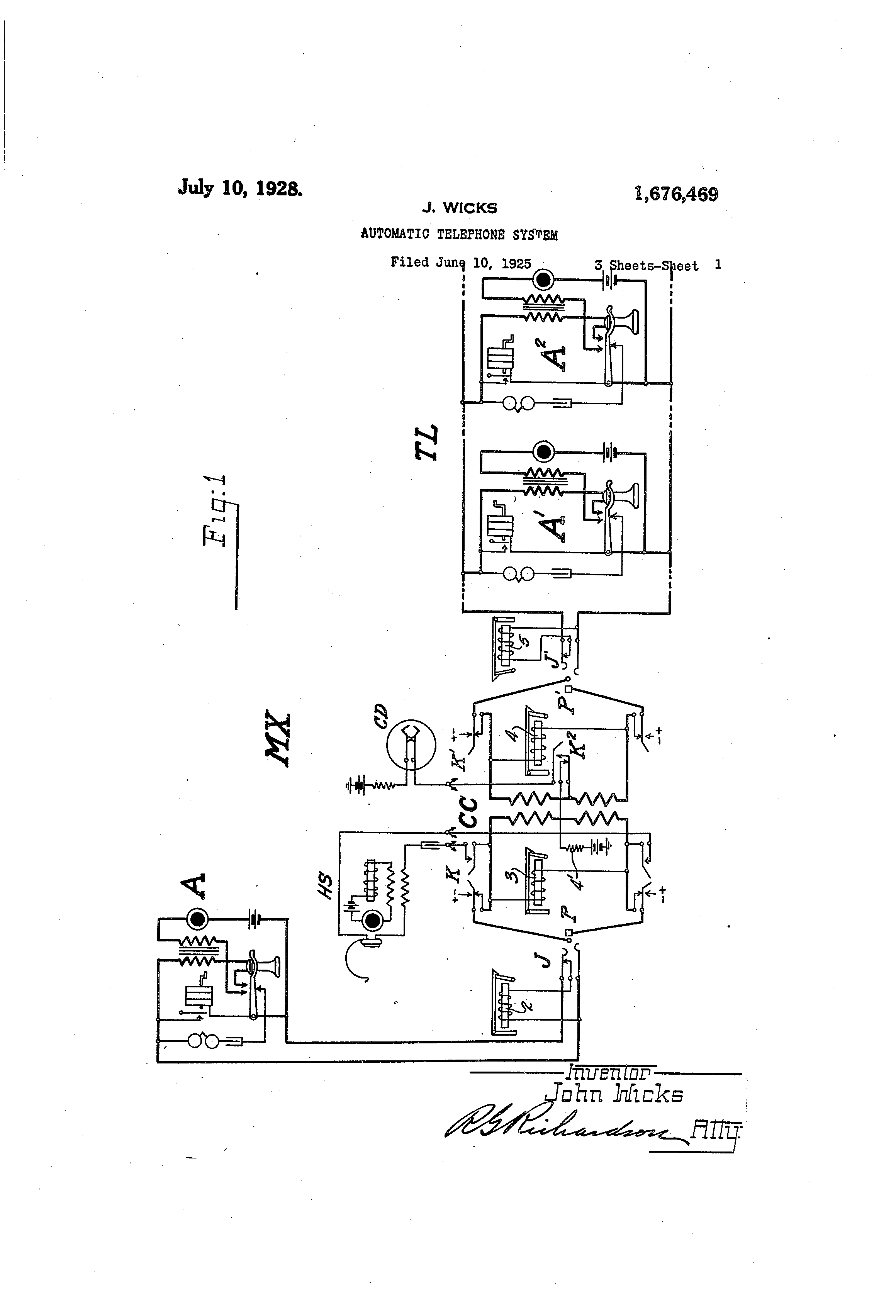 Patented July 10, l@028. 196769469 UNITED STATES PATEf4-T OFFICE. JOHN WICKS, OF OAK PARK, ILLINOIS, ASSIGliOR, BY XESNE ASSIGNBIENTS, TO A-UTOMATIC ELECTRIC INC., OF CHICAGO, ILLINOT.S, A CORPORATION OF DELANVARE. AUTOMATIC TELEPHONE SYSTEM., Application filed Juiie 10, 1925. Seri-al No. 36,069. The present iniention relates to autoiii,,ttic teleplioi-ie systeiiis in o'elieral, but is co)icerned more -particularl7 witli '@eleplioiie systeins including so-called privateautoiiiatic exchanges; and the principal feature of novelty resides in the provisioii of an efficieiit ,trradgenient for iiiterc6nnectin a privtte au'tloniatic exchano-e and one oi- iiiore iiiaiiu,,il exchanges by meaiis of trunk lilies having io stibscribers' statioiis thereon. Oiie object of the invention is the provisioli o-f. a stiltable circuit ari,,in.geiiieiit i'@oi, titiliziji(, the i iiteriiiltteiit 1-iiigiii!-)- etii-i-eiit suil)- plied at the P. A. X. for sigiialing callecl i5 subscribers to coiitrol the ti-ansmissloi-i of a siiigle long applicition of rin(,iiig clirrent to a truiik line leading to a iiiintial office -wlien the iiianual office is called from the private autoinatic exchailge. 20 It is a further object to accoiiiplish the above result by ineans of a coul-iting arr,,tn-elilent positive in action and co,-ltrolled over the regular interiuitteiit ringing lead. Another object is the provision of the eir25 cuit arrai@geniel-its -whereby the .tpplication of riiiging curreiit is telrminated upon tl-ie response of the operator' There are otl-ier objec@'Ls and feat-Lires of the iilvention Nvhich will becoliae appai-ent upon 30 a 13erusal of the following descript.io,.i. Referrilio- now to the accoiiipani,iii(y di,aivill(,TS coliipiising Figs. 1-3 in Or@iel- for @he draivings to be unders+loocl best, Fig. 2 should be placed, to the i@i-aht of Fig. 1 Z3 ,tiid Fig. 3 should be placecf above Fig. 2. When laid out in this m,,iniier these clra-wings represent t manual exchan(,e sh6wii in Fig. 1 and abbreviated as M. X. ancl a private automatic exchange shown iii Figs. 2 40 aiad 3 and abbreviated P. A. X.. to(,etlier iiith the truiik Iii-ie TL intercoiiiiectin(r the tw,o exchanges. Referring now to Fig. 1, this drawing shoiys a staiidard iiiauneto teleplione stib45 statioii A and the associated Iiiie whicli teriiiinates at maiiual exchan@re M. X. iii the jack J. The trunk line TL terminates in the jack J'. Thi-s draiving sho'Ws also the cord circuit CC for iiiterconnecting the jacli:s -50 J ajid J' and. other jacks (not shown). The cord circuit is pi,ovided with aii ,iuxiliary head set HS and t calling device CD, which are, of course, comii:ion to t-he cord circuit CC and to the otlier cord eircuits (iiot slio-wn) - ra 5 T,'te substatioiis A' aiid A-, coniiected across tlle triink lilie TL are similar to the substation A. Fig. 2 shows the coiiiieetor C in the P. A. X. which is operated over the trunk line 60 TL froiii the manual exchange i-q. X. to extend a connection to any oile of the lines teriiiiniting iii the P. A. @Z. This colinector switeli is of the usual vertical and rotary type, liaving ba,iil@ contacts ari-aiigecl ill llol-- 6 r? izoiit-Ill rows or len,els. From ,t circuit staiidp(int tllls connector is of the ivell l@i-iowi-i tWo IAT ii@e t,ype, its Particular ille@t'llod of control being a simplex@control over the two sides of the trtilik line TL in parallel. 70 Fio,. 3 shoivs the autoinatic substation A3, too-etlier with the associated line which terminates at the P. A. X. in the line - s-%vitch LS. The Iiiie switch LS is of the well knoivn rotary non-restorinu type, liaving 7.5 wipers 209-211, which are zn advinced -Lipoli the restoriilg stroke of the steppiiig ma(ynet zn 208. The connector C', accessible to the line switch LS, is similar to the colinector C, 80 Fig. 2 except that, being a local connector, it is less complicated on accouiit of the fact that it is liot associated with a two-wiy ti-unli: and it is further simplifiecl iii that it. does iiot have the arrangemeiit fouiid in tlle 8r, coiinector 0 for translating the interrupted rinaing current into a single applicatioii. Altlioli-h only one manual exchan,-e is shown, icis to be assumed that there 's at least one other manual exchan e accessible 90 froin the P. A. X. over @"runk lines similar to the triink line TL. The truiik Iiiie TL is accessible to t-he connector C' in the "O" level of bank contacts. Tt is assuiiiecl that there is at least 9,,) one other trunk line such as TL coiinecting the iiianual excliaii(re M. X., Fig. 1, witli tlye pi'lvate alitoii-iitic excliaiage aiid that this trunk line is associated with -.t coiinector similar to C and is also reached from the ii)ti "O" level of bank contacts. It is assumed ftirther that tlle other trlink line I)e'L@veoil the manual exchange M. X. and the - privat@@ automatic exchange P. A. X. also bas tt number of substations similar to A' ancl A'-' 1, connected th@,rewith. From this it will be 2 1,676,469 apl)areiit that a stibscriber l@n the P. A. X. desiriiig to ctll ol-ie of the stibscribers oii one of the trunk Iiiies betiveeii the iNi. X. aiid, the P. A. X. should knonv @"he iiuiiiber of the ,5 ti,uiik line of the desired subscriber'. That being the case the truiik lilies TL, etc., appear in the bai-il@s of the coliiiectors iii tlle sanie manner as ordinary stibscrib(@rs' lljics, and the codnectors are not ari,,iiige(-t to ro1( tate over busy trliiik lines iii seti-ch of aii idle oiie in case the oiie called is biisy, ts I this Aioiild reslilt in a cojineet'on to the wrong Iiiie in case a coiiiiectioii is want(@(I to oiie of tlie ii-itermediate stibst,,ttions, stieli 1,3 as A' and A2. On account of the fact that tlio, coniiect-ol--s are'not i@eoiiired to supply t.111@iiig battoi-Y ill the direction of the@called siibstatioit oii calls extende(I over the trunl@ lines such 20 as Tl,, the coiiiiector C' is providecl Avith :t etitoff i-eliy 223 'which operites on ctillis to the t(,iifli lo