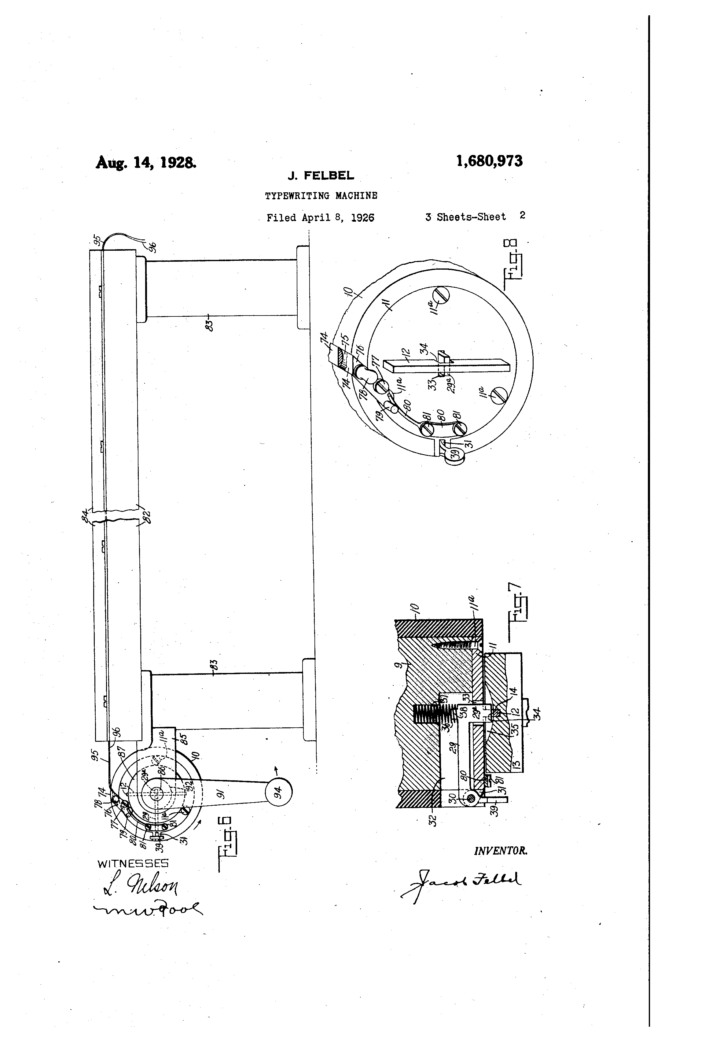 Letters Patent, is:- 1. The combin,,ttion iiith the det,,tchable platen of a tYI)OWritili- lilaelline. of- a table 120 or support, bea@,iii.gs on said tab'L(, for said platen, platen i,otatiii@,y- iiieins a,,;sociated with s,,tid bearings anc'[ a (,tiide on said t,,tble for f@cilit ating the applicatioii of paper to the platen ivh I ein it ig illotinte(I on said be,,iriiiys. 125 2. The c(,,mbination with the dettchtbl e pla ten of a typewrit'jl-l,, ma,chine, stid platen bei ng provided with a paper clamp WI-iieli is det achable with it of a table or suppoi-t, bearings for said platen on sai.d table @a 6 1,1380,073 liandle oii s,,ii(I t@il)le foi- i-ot,.ttiii(r ,,,tid pliten, iiie.iiis for aiitoiiiaticilly coiiiic!cting said li:in(ll(, witli s,,i';d plit(@it tii(I 1)1.iteii is al)l)ti(@(I to s:ii(i :iiitl @t !,tii(le oii s,,ii(I t-,ible fol- ficilit;itili(r tll(@ iiltl@o(lil(:I,ioll of P.11)('I- fi-oiii siid iiito tli(! cojiti-ol of the ('I'Ill-lp. pl.ateii (lettel),11)le fl-oiii its lieii@iligs iii the typ(@wi-itiii@, iii@llcliii.iv, iii(I I)i-ovid(@d at 10 its (,iids witli iiieins l'or t(,iiipoi-,ii,ilv eiiiya(Yiii,lr I]] ,@et, Ielitit)IIS]Iil) ivitli I I-ottti@(,Y iiieelifix(@(llv ,ii-i-an,)-ed oji .1 ,tippoi-t located extei-iol-l@, of tlic@ tyl),?,Wl.itei- Wll('.I-eby a foi-in -iii@l t dill)lictt'ii(, sliect iiiay be wotind slie(,t @ I @,- 15 tocretliei.- oii s,,ill(l platen i-vliilc it is detaclied. 4. A detacliabl(@ pl,.i,teii 1)1-ovid(@d at its (@iids witli iii(@.iiis for teiiipoi--,t,i-ily enga@-,ijig iii set i:-el,itioiisliip v;itli a rotatinf, iiiecliaiiism fixe(ll,), ai@i@,iii,,cd oii a siippoi-t located exteriorly 20@ of the tvl)ewriter )vliei,eby ,t form sbeet .iii(I a dijl)liettiji(, slic(@t iiiay be ii@oiidd together con sii(I plat 11 iiid wlie @by said 1)1,iten m,,iy - I)c disen tliere,,iftei ga(reci Ti,oin siid i@otating n iiiecliaiiisiii aiid rc@stored to worl@@@ng i)ositioii s 25 iii tll(l t,vl)oii-ritet- i@-itli the foi-iii l@ect aiid the (Iiil)fl(.,,;iting sheet rei(ly to be inrritten on. 5. Tlle iiiiproved iiietliod of prepai-iii,, the 1)1:tten of ,t typeivi-itlil& iii,,Ic I llitl(' foi, 1)1-0(111cii)g iiianifol(I copies wliieli c(lisists in wiiidin,- on the platen i:ipoil a t:-.I)le SL!l@ftee :I plu- 10 i@alitv of tijyies t 'kioi-l@ slic,(@t iin(I .t iii- ,Iieet to-etliei- wlitell ll;iv(@ I)I-CN-iolisly beeii laid oiit fltt oi) sai(I stir4@a(@(,, 6. The iiietli(-Icl of pi-(@p@ii-ijil(-, tli(@ pliteii ol' 'I t@,I)elN-1-itiilr iii;icllill(@ for 1)1.o(itic., 35 iiiy iiiaiilfold col)@es wliicii coi),,ists iii the papoi- aii(I (ItiplicatiDIr Stl'il) Oll .1 surfice to a gILe tiid tlieii i-ollijitr tli(@ thei,coii iiid wiji(iiiig tiie ing sti-il) the i-eqtiisite litiiyll)el. t)f 40 7 . In coiiib'iiatioji x@itli ,i tyl)(,,ivi@it"i)(, iiia. 1 1 , chine, iii extei-iorly i;i-i-aiig(@(I p,,tl)c@l- ,i i i (I platon stipport, said t),I)eivi@itiiig mtcliin(" IJL'in(, provided w@tli a detaciiil)].c, I)Iiiten a(ltl)ted to be traiisfei,i-ed to siid stip])t)rt ari(i 45 wliile tliei,con applied tlier(,to tli(s from the stipl)oi-t :tn(I tli(@n retiti,Dc@(i to @aid t,,)e iliacliine witli silti(I p,,tpt@i- tlitis al)plie(@. 'i ,,necl it the boi -ougli of LAIiinl)attt;li, city 60 Of NOW Y6]']C., "III tlle Coillit@.11 of N(!@@' Yol-IC -ii tlils -otli (1,1 an(i State of -'@ow Yoi 0 f April, A. 1), 1926. JACO]I FELI@l,,L.
