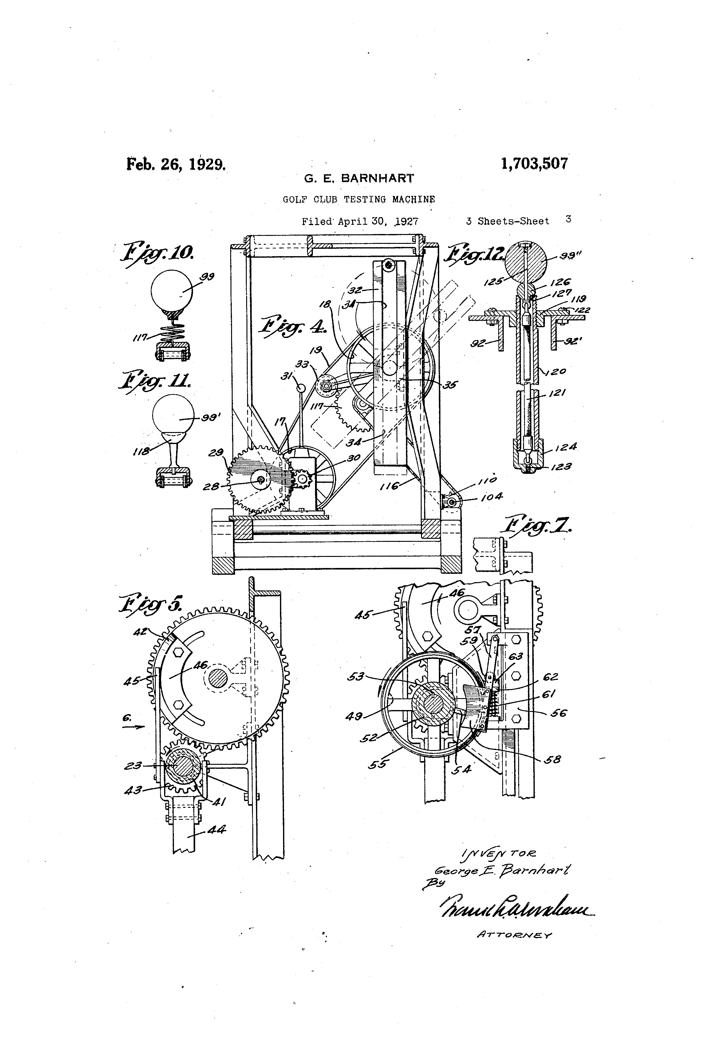 1,703, 507 75, i cii,@;liioli 1)e to 'k)o @i@ 'PC: 11 seeLii@e(I by 0,)Itg 01- I)evel 10 @@ Cilo be secti,,,e(I ill)oi ciid be;l@1)' bv cre-w 80, -103 o' a s-,,,-t-lonli colyipi-isiit(,i a-,-i exs s 5 C-shaped eiiieiits 8i. t,,@iisibl ni@iin sectio- ]Oz,-@ ft ' i 0 o@ The eii,7[s 82 o@ saici eleet-@ri-yir@,g sect;oii 105,-th,,@ iiieiits as k',) t'lie 10,@ ') b-@ b,tel@: siip@'@ice of t'lie I)IaL'o 70 ol, 8,'! I)A7 a' '3 tln ITCI (iiiih 10( 10 of the s(@i@eAvs 80 I By iii.eai)s oi-' the @10,9 111,i li@lotLo@,-l iii,,ty b f@, it ii-I 1,)o tii@it a cit,l) I 1,, , g i '00., or 'ts eqiiii7t to ,i, spi-ocket (-,i@ it,- , ,I@t 1 10, on 1,1@ sliift 101 b,y m,@aii,@ o r as a eiie@,-tg(,,d ],)y tll(- 'O' 1)0,1114@s, 1 1 3,- the I II(] a t clii"@-jeCl 0 ij3T a 112, t,- the lollp,.it,@icliT)@ll "Ilx;-" 0 i' 1) i @i ap.-, 1'.,l cii-icl, i)ioi,'(](@cl Si(-,e,,-e 2t") o-.@ z@- iv @v,'Lth sp-@- @o@,kolu 115-,t sl)i@oelzet ch@t-i,,i 116 bv tlic@ do,'@@('d oi@t@Iiiil-s --)'7' 1, C, .1lie L ai (I ovei- ,@i)i-ockets 115 11-0. i I)c, undoi-s'Llood t-bat the d;@,-iteiiObje@,,t of i,-"4- ios I)OL @i @@i (I -vnoeii 5 'ror e'iosely 'Ire ilite,-ideci to be st;cli ,@s ,iiv O'@ I @l(@ OT of ul@),i-'tv lo a(,,vaTice or-e of tlilll golf )@,ilis to .@-).O I fcl.ill)s ill@,.y be -;III 99 oi-ve; I I I 0c,, I io 1) u,,se @,,bii!@e) T 1,11,,@y os(, I o@-' (AV @ i,.ito Fticli a posit,- 'I()Il ill',@ 90 i,)O" (,Lo S,7, OL- ,,ny iiiipact or 0-,tll(@,r poi-t,,C-.A-s o,"- ' v ;, (I (I t'lici@c@oli, i: 11 suif, bt beiiio- st)oivii as prov-.dec7L ti saiat,, f- a 31@' ai-ici as (lisDosc,,l ti-io b,@,,tke- aicl, - tii)on -WI-iether ,-@.(,t-,ual Slitl@t sect;loii 2/1 -t,-- (id II)ail@@ oi.@ i,.ILetillic or o,,@'-her liqrd balls 99' -,re 95 i,i,v sliqt-t secti(,i-, 2.o-,-shovi.,,.i be adv,,in-,ecl by che)ii 98, or it@-, (--,qii-"vao t be-,ti-in t,,- @,lo,,, c-np-,-I c,,f tl,.e I ii@,iy prov,CLe o@,-i s--@,,ic't ch.).iii 23 t e e s , C O , . - . I p r l l s l n ( v S P -'i s - le 11 I (,ii,y 1)i@o@,ide iiietns, ,;i7,cli tli(, ii iias 117, l@ 10, or r tl(,Ilecl j-acl@: I'!, fo-e V,'II-Yiliff -,lie I riiav eii:iploy oiv(lo(IO, 100 a,@ ()f ',lie, moii'l-io--qetl 0.1",-v ii sys'lleii:i td at !"- S, Fl.(7. 11, oi-. i@l Al'i@h tl)-e sleeve 2C), b,,,,t to - i)i@ovl,,I,e -,,, se 4,iie -Ls 'L@) f(,,r siipporti7,ig orciiiia,,-@y golf be obvi,9,+Ied, lllly sec,,i,-e 4,C) 'tlio o,.- otlier yiel(l,,),I)le ti-,e 1:)@itli. cleiiie, .I,t,s 9@., "Cl) 11 iliemiili-;-ch lie@Ilds oi,- n-io.,- iibers I)e,.@ I @i pl@,til-@ 119 ,,,ulp,,)ol-t, t), 105 19',) t b-v @l ;ol-f cli,,bs o 0 (I sA@,, i i ii by iiietiiis sii-iillir to th,)@@e a lioi,,,,i 1,)e -ror (Tireelb-I@)T er i,y of ,i, speci@,,l ('olf b'-Ill or o'Lliei.@ y e ( I C,- o@,, (S' 0 i,,ction 99". The pltt,@ i@', 310 4;) the.!lo ,T .1 - lo, bsti@ . .. ....... 'Co 11 @,., @,@ i @-, @ I L c @,2 @(I tll @@n(I ()2' ',)y v e,,[ scilc@VVIS or bo'it,,@ ',,,- ?2 ,i,(l tlio 6@ ,):"-ot,-"" - Coll LI ect I,t 21 ' s , , @ l o w i i a s i@) ' v ]III(-, 88) 't@l extol. iblc@ ele@.1lici 9. fli-@iiie -,in @3ye, 12'@)' IL-0 lq, 1) c@ @is C)Il il)lo @)zJ ,i'- tl e Icw(,r cli oj' t, tul )e, () 2 .ii 'Llie, -o foi-iiie(i ol@' f oi., stioi-tl o@" i.,,i 2 @l exte!@(I e ll,,-till @Vit@Iiii) ol.. s -I.;,@ i) stipl)oi.,@ s 127, 11@'O LIpl)et' ,I' CI (II li Vl@ O'i Or IIOIIS@ill" @o.-I@ olf 1).t 199 or 120. ",I)Strilet' tlic, el iiiocle, ()f i,)ns@ 1 To ,,Ilc ")I, t"Lle 96, 9 I 'co @beei-i i? evl sliatt empi()@l(- Fi (,s. -1- - nd 2) iii conneel,,oii v,,T';th j,(,sci@ip@..on thereo-i'-', a f,,eir 100 jlipT,L C) i d t), I fol.,o,@@,iilg - Ci--ts: 103- tLlie f t 9-i t,,iy sui aii@3- lll@@v Oes, @0, -iiaebiiie liaviii@@ beeii iiie Del"l,,@, @i@her,@.,- d(-,s;i@i-@ied. Pi.'iinari!NT foi- use iii ftseeirt4iniTiobe,'-w en. For exaiiiple, asLzu.,ii,.nu the la,-zt- the behavior of hollow inetillic goll club inclu-,Iing EL uni.-,Iormly ro@uallecl sh,,tf'f,, ancl iiieans ioil' transmittin( a non-UD; T-0@'nl 1110@TCI 9 @ I i-ne-.it therefroin to said securi-,ig t caii,i-ol)era4-ecl cititeli beinz bet-v@,een sai-,l unif or,-ii-ty r(i,ated sliaf @, ,incl, s.Ili-cl s@liaf'u s-,cLio.-,i L-3, wlil,,.cl-i said ,,,e@,tir'ing are carrieci. 5. In PLieaiis -,fL'or t-lie of 5olf clubs Aiilen svvuiag throu(,,h a-.,es: ior releasably sceLir@ID(- .t (,,-ol@IL' cl@Llb at ,tn -,cljus'c,ecl a.igl-- -,Lnd elevation relative -'L-o a ,iiecl Point-, T, aiid means for elti',j tliroi.igii slicl secti@,'Ill:g ill-.-.iis, successive str6kes stibstantiall.y "Mitatiro, tbe of actii,-.1 play, sa,ict. I.iicILic-lip-g, @t iiiiii'(-)ritily i-o'tated iiieaiis inelti(iiiio- ,t di-ivei-i sb,-tft sect-i( "(I@ )n -i tf aiis.,, iii Cciiig a iioli-Ullifoi,m iiio@- cineii u in to said seciir-' in(r ii:ie,,iris, 2 iiiterposed betnve-,n said iiii;foriiilv l'ot a'(ed shaft ,incl said sltaff@ sec'u-ioii. 6. in meaii-s for testiiig tli,., oTgolf cltibs wlien sAvLiiig through qres: iiie@tis for releasibly seei-ii@i-ng i g,,)I.f club ad2@) justed aiio,!-@ tiid elevat,Lo.i to r-,xe,], point; a-nd me,,ins -_Cor 'U(- , sal-(:i tlirough saic', sectiri-ii(, mea-- as Sill lees @ ive strokes, subst,,tntially ]ii)-itatiD(@- tli(, tid st-i-oic(,-' iii "O of aettii@l play, s, impartido iiis incltlc@ing a uni-formly rot,-@tecl sha@"L,, -aii(i meaiis includ,"n-- -, di-t-,,Teii shaft s,3ct;,Or, fol@ a Doll--Lllllf orii) thc,i-efrom @-o S,,tid sectirin(, means,-a, s ip@-I limitino- me@giis bein(,- interposed - bety,7ee-11 @7 t, 00 sllld clriven shp.Tt @ection ti-id s,,ti(I s(@eiirjn,r means. 7. in means for testinp,@ a sha-.@t: a 1)i-@ToteCt holdin-(: or,a@-tnizptioii; releas,@,ble fol, . I 40 seelirin(, said shaft ,it a desired t.- 11(li(liDg oi-g,,t-.nizatio-.i; means f,)i'I n ,i, yielcl, 0-,L it 1) ',I 1- tl)].e obsti-tic'u-iou in the p,,i,, sli@iTt,; an(-]. ille.9,iis for ,,o ,Is to -cl 1)(,tw(@(,il 4 -II m(@,,,iis fol. to-Icl@iiig ,t @Nl I' i-tes -,ii iiiii)act iieiiabei@@: ,i pi-vc,'L-e-,! I 1 i (- I cl ioi@o,f,,-.tiiz.1t,,6n; -i". l@ 5( S(leurlil(, Saiet sliaf'b- at -i desti@ed s@l 1 (I. 