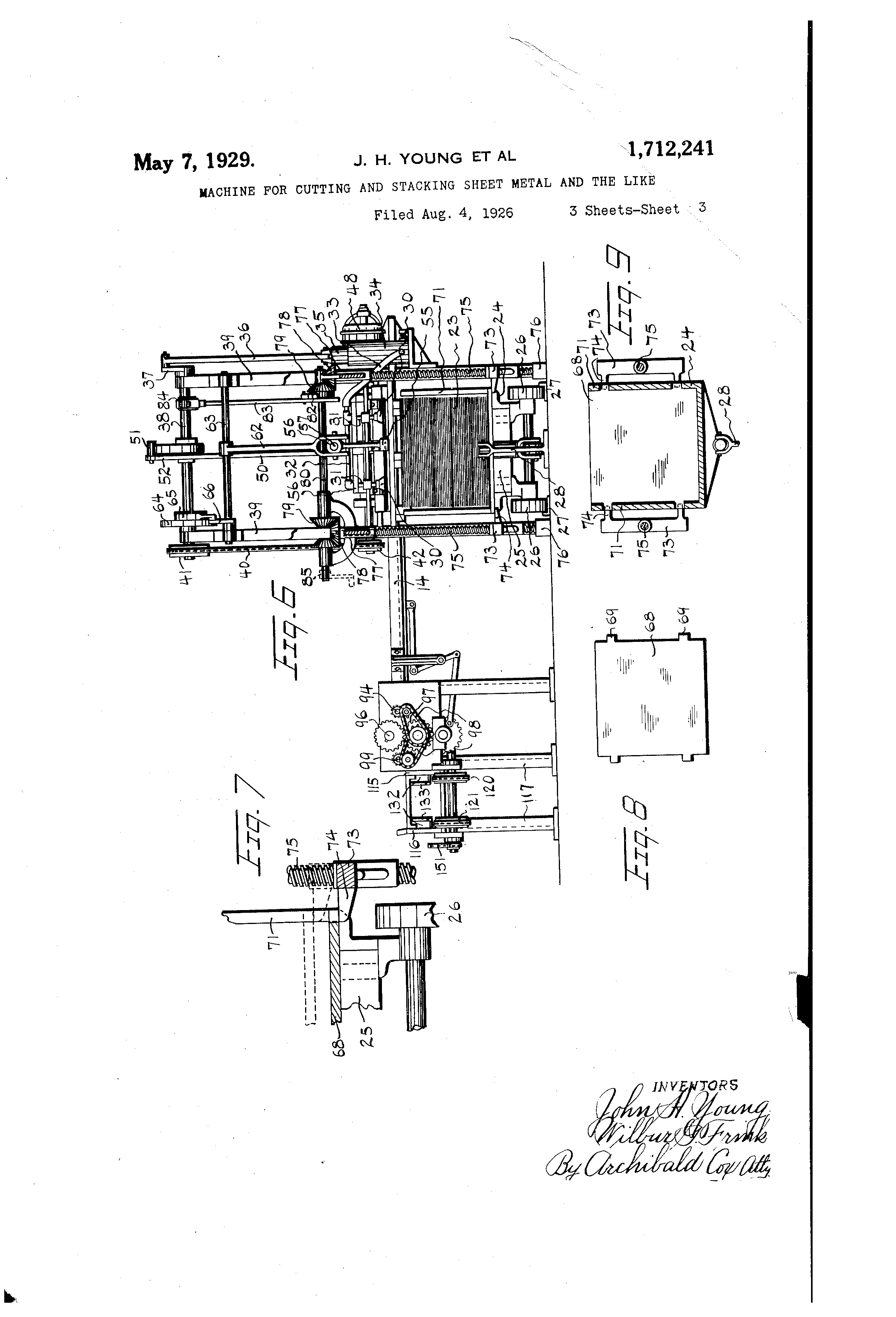 PatenW May 7, 1929. 1 7129241 UNITED STATES PATENT OFFICE ,TOHN Ir. YOUNG AND WILBUR G. FP-INX, OF XIDDLETOWN, NEW YORK, ASSIGNOP.S TO THE BORDEN COMPANY, OF NEW YORK, N. Y., A CORPORATION OF lqEW I-FRSEY. MACHINE FOR CUTTING AND STACX=G SHEET XETAL AND THE LIKE. APPI'@eation Illed August 4,1926. Serial No. 126,990. The invention relates to an improvement in macliines for cutting and stacking sheet, metal and the like, aiad niore particularly to an improvement in macliines for cutting @nd stacking for subsequent treatment the tin plate out of which are formed the body portions of cans and other containcfrs. One object of the invention is to provide a niachine of this type with improved means 10 for feeding to it larze sh@ets of metal which are to be slit or cu@'into blanks of the requisite shape and size. Another object of the invention is to provide a, sheet cutting or slitting machine with means for turning 15 or inverting certain of the cut blanks so that the burrs on the lateral edges of the blanks will all point in the same.direction, thereby facilitatina subsequent operations on the blanks. As these machines have been 'con20 structed heretoforel an operative has been requii,ed to turn over or invert certai of blanks so as to cause the burred latera e@ of all the blanlcs to point in the same direction. A further object of the invention is to 25 provide a, machine of this type with means for receivino, the blanl@s and st.ackin- them in a hop@per f@'oni which they are fedinto the can bo'dy forming machine. Since the cutting maebine operatos to discharge the blanks 3( therefrom so that the burrs on the lateral. edges of the blanks all point in the same direction, the conveying and stackinl), meaiis opera,te to keep the blanks in this saine position relatively to eacli otlier and stack them 35 lip ivith their btirred edgesill I)oiiating in one clirectioii, pi,eferably downw@ii-dly. These objects and other objects incidentdi to their accomplishment are carrled out in the improved ii-i,,tchine for cutting and staelzing slieet metal @O liereinuffer fully described and particularly pointecl otit in the appended claims. In the accompanying di@-,iwings illtisti@ating the pi-eferred form of the invention, FiLy. 1 is ,i top plan of the eiitire machine, slio-@vii@z the iniproved means for feeding the large sheets o@- tin plate or otlier metal to fhe slitting mech,Inism, the etitters for etitting the plate into the body blinks, the n-ieaiis for inverting each secon@l or alternate body blanic, the conveyor B -,qiid the devices for stacking the body biinIKs, F'ig. 2 is tnend elev@ition of the macliine sho@%i,n in Fig. 1, witli certain of the parts re,[i,ioved for.@lc@- is trness of.illitstration; Fig. 3 section on an enlai-ged sc,,tle tal@en @along thp, line 3-3 of Fi-. 1; @r@ig. 4,is an enltrge@i front elevation of one I of the body blank guides; Fig. 5 is a vertical, longitudinal section on an enlarged scale through the hopper in which the body blanks are stacked; Fig. 6 is a front elevation of the improved macliine, 60 looking from the riglit in Fio,. I witli the stacking mechanism removed; T, ig. 7 is a detail of part of the sheet feeding devices; Fig. 8 is a top plan ijf the movable bottom of the sheet carryin(r'trtiel@; Fig. 9 is a longitudinal 65 section through the sheet carrying truck; and Fig. 10 is a, pers.pective view of the upper end of the body bla.Dli: coiiveyor, and of the upper end of the hopper in wliieh the body blanks arestack ed. 70 The improved machine for cutting and stacking blanks, as illustratecl in the drawings, compnses a sheet feeding mechanism generall y indicated at 12, slitting devices 13, sheet or plate advancing means 14, a series of 7.5 rotary cutters 15, the devices 16 for inverting each alternate blank, the conveyors 17 and 18, and the blank stacking mechanism 19. The feeding mechanism 12 operates to supiply the machine with the large sheets of tin plate 80 or the like. The slitting devices 13 divide each sheei into two parts or plates 20 -,ind 21 which are advanced by the means 14 to the cutters 15 by which'the plates are slit into body blanks of the requisite shape and size. 85 These cutters 15 operate as usual in machines of this type and the plates Are slit in such fashion that the burrs on the loncritudinal, literal edges of eaeb alternat@e blank@roject in the same direction, the burrs on the first blank 90 projecti ng upwardly and the burrs on the next blank projecting downwardly, and in likeorderthroughouttheseries. Thedevices 16 operate to invert the first and stibsequent alternate blanks so that the burrs on their 9@5 lateral edges wiil point in the same direction as the burrs on the other blanli:s. The blanks ire can@ied by the conveyors 17 and 18 to the staelting me@hanism 19 where they are piled one on top of another in a hopper frorn wliieh lo( they are fed to the body makin- rnachine. The sheets 23 of tin plate or the lilce to be cut into the body blanks are carried to e,machine on a truck 24 wliieli fori-ns part of- t-lie slieet feeding niechanism. The truck com- 1(5 prises a body part 25 supported on the wlieels 26 adapted to run on the traelts 27 wliieh are iii alinenient witli the upper part of the mechanism ivhich transfers the sheets @-rom the truck into the inachine. ']Che truclr is manipu- I 10 2 1,712,241 lated and guided by means of the handle 28. By !naking the truck wliich carries the load of tin plate to the machine a part of the sheet feeding mechanism the machine is enabled to run for a longer period of time without attendance than it is possible for similar machines provided with sheet feeding mechaiaism as heret6fore constructed. The sheets are transferred from t-lie truck 10 and fed into the machine by means of the transfer meebanisin comprising a plurality of inverted suction cups 30 mounted on the lower ends of the vei,tically arranged tubes 31 connected by the trahsverse pipes 32. A 15 flexible tube 33 connects the transverse p