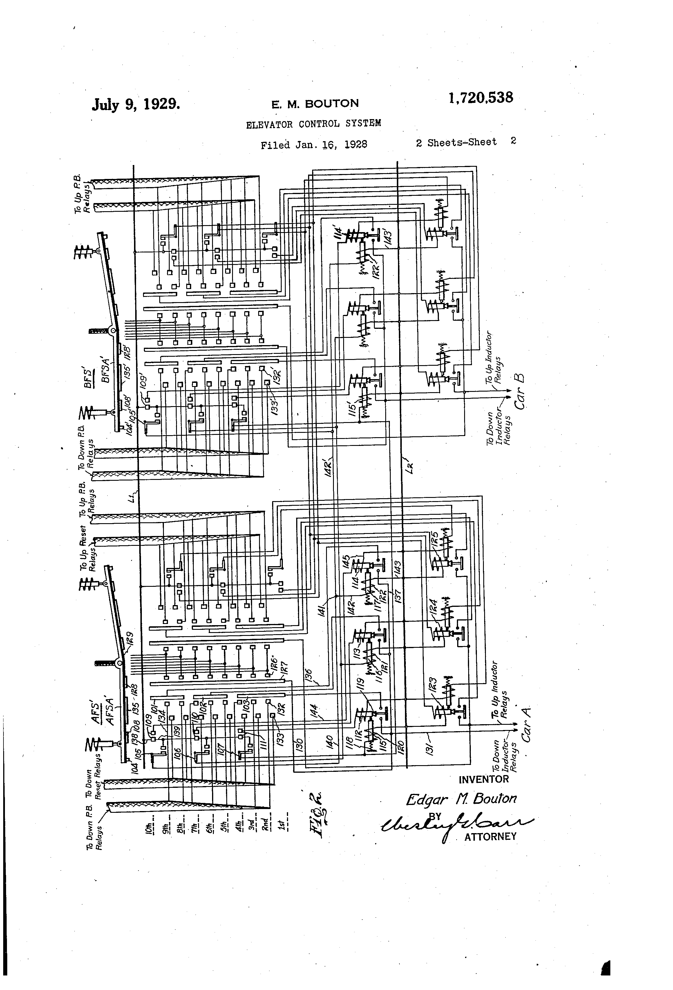 Patente,d July 9 1929. lt72Ot538 UNITED STATES PATENTOFF,ICE* EDGAR M. BOUTON, OF CHICAGO, ILLINOIS, ASSIGNOR TO WESTINGHOUSE ELECTRIC & MANUFACTURING COMPANY, A CORPORATION oF RENNSYLVANIA. ELEVATOR-CONTROL SYSTEX. Application filed idnuary 16, 1928. Serial, No@ 247,156. R Ell S S U E D My invention relates to ccfn I trol systeiiis and cars are automatically stoi)ped @t the several , it has pbrticultr rolation to systeins of con@. - floors in response to passenger-operated pushbuttons, and wherein the approaching ol: two cars, travell-ing in the same direciion within a predetermined distance, prevents the first 6o car travelling in that di@ection from stop in p g@ in response to the passenger-operated- puslibutton s. My invention will be described with referenc e to the accompanying drawings, where- 65 in: Figti re 1 is a diagrammatic view of my control @ystem as applied to two elevators operat, in(,@ in adjacent hatchways; and . Fig. 2 is a diagrammatic view o'f my block- 70 ing or zon@ing system as applied to two adjacent elevators oi)eratinz between ten floors. Fir,ure I illustra'tes a control system for two el6vators, A and B- the drivino, systems' for which are identical and. the control for 75 only one of which will theiefore, be specifically described, the letter A preceding the refere nce characters for the, parts descr-ibed. T.Li e control systein for elevator car A comprises a coiatrol system bf the variable voltage so or WardLeonard type and inell-ides a drivin(-r motor AM o,f the shuntwoiind type having a shunt-field winding AMF and an arm,,tture AM'. Directly coupled to the armature ture AG' of a generator AG. The generator AG is preferably of the compound-wound winding AGSF, and a demao-net'Die generator go in "loop'9 circuit with the armature AEM' of a hoisting motor AEM. The hoisting motor AEM is provided with a shunt field winding AEMF and bas its armature AEM' direetly coupl6d to a hoist- 95 ing drum AD, over which a cable AC, suspei,,iding the elevator car A, passes to a counterweight AW. The hoisting rnotor is controlled as to direction and, speed throuo,,h the agency.of an loo up-direction switch Al, a down-direction switch A2 and a sp6ed relay A3.. These relays are c erated by the acttiation of a e'ar T, switch ACS mounte,a upon the elevaior car A. Each of the floors iiatermediate the t eirml- 105 nal floors.traversed by,tlie elevator car A, is provided with a pair of call ptish-buttons, on6 for "up" and one for "down" travel. The call buttons for the third floor are desi-nated by the reference numerals 3U and 3D, re- iio 'O stop only when travelling in th in AM' of the dr.iving motor, AM is an arma- 85 trol for roa;d veli'cles, elevators, hoists and similar,. apparatus. 5 An 6bject of my invention is to provide a control system for elevators wherein the elevator may be started by an attendant on the izar qiid stopped by the persons desijring to use the car. I li Another object of my invention is to pro.. vide a control system Tor elevators wherein the car is started by an attepdant on the car and stopped by the operati.on of push-buttons, either at the landings at which persons 15 desire to boarl the cux, or by push-buttons -,vithin the car corregpondincr to the floors at which passengers wish to leave the car. Anotlier object of my invention is to provide a contiol system for a plurality of cle20 vators in a bank,. wh6rein eacli of the cars js started by an attendant on the car anid wher ein passen@ger-operated means'at the several landiilos'traversed by the elevators will cause the @Arst, car to approach the cor25 responding floor to stop for such passeiager or passengers. Another obje6iL of my invention is to pro-. vide a control system, as described in tlio preceding aragrtph, wherein the car will p e direction ivliich the passenger wishes to go. Another object of my invention is to provide a control system for @ plurality of elevators in a bai@i, wherein eacli car may be started by the attenddnt on the car and stopped in respon@e to@ passengeroperated push-buttons and wherein the fir t car . to approach the floor restores the passen er-op9 crated butfo'ns and preveiats cars approach40 ing@,the floor subseque-ntly from stoppingr at sueh floor. -&n6ther object of'my invertion is to provide a control systeih for a pliirality of ele. vators operating between a plurality of floor@ls, 4,3 where in the shaft for each of the'ears is divi(led into a plurality of zones or blocks, each including several adjac6nt floors and wherein the condition of two cars being simultane ously within a zone or block prevents the 5o car which first entered. the @ zone from re ceivin--si(ynals or being stopped.at any floor @n t5 witliiia that zone in response to calls froin floors witbin that zone. Anotlier object of i-ny invention is to prolo 55 vido a control system r elevators where'n 11720,538 spectively, those for the second. floor by the reference numerals 2U and 2D respectin,ely. While only foui- floors are illustrated in the drawing, it will be obvious from the followinlr description that the system may be applied to a@y number of floors without modification of the essentials of my invention. No buttons 'are shown for the terniinal fl6ors since, in the usual iiiethod of opeiat10 ing elevators, each car makes a complete trip from one terminal to the otlier whenever the ear is started in either direction and since limit switches are universally provided fo'r automatically stopping the car at the termi15 nal flooi-s. Push-button relays are sho,%vn connected to the res pective'push-@buttons 3U, 3D, etc., and, are designated, respectively, by the reference numerals R3U, R3D, R2U and R2D. The 20 coils of these relays are respectively connected in series relation with contact members on reset- relays S3V, S3D, etc. These relays comprise means for registering and cancelling calls for service at the correspondi ng 25 floors, as herein.after more fully described. A push-button for each of 