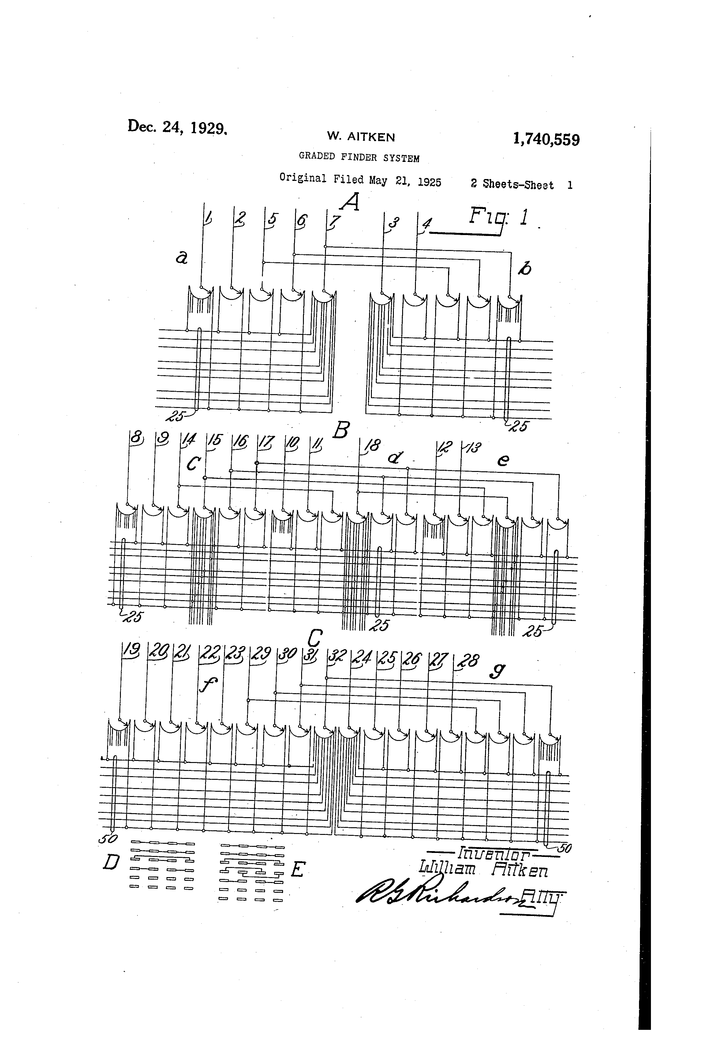 Pater,ted Dec. 24, 1929 12740@559 UNITED STATES PATENT OFFICE WILLIAM AITKEN, OF LONDON, ENGLAND, ASSIGNOR, 13Y MTESNE ASSIGNXENTS, TO AUTOMATIC ELECTRIC INC., OF CHICAGO, ILLINOIS, A CORPORATION OF DELAWARE GRADED FINDER SYSTEX Application filed May 21,1925, Serial No. 31,808, and in Gr,,,at Britain.A-iigust 21,1921. Rene-wed September The present invei-ition relates to telephoiie systems employing iutoinatic switches ,tncl is niore partictilarly concernecl with systems @inplo.l,in(y s-",itches of the backwari-Ily huntIII(, o@ fi@cler type. As is well kiiown, tlle fu,llctionperformedb theseswiteliesis'esseny tially sli-nilor to that of line-s-,witelies of the forwar(Il btinting Lvpe. blit the coiitrolling y arrangements miist of course be clift-erent ancl in creneral the qtiantities i.nvolvecl will be 10 li @, ffereiit ,ilso. When the switel-ies ,ire usecl for connectinff ,t ca,lling siibscriber's Iiiie ",ith a first numerical switch, if Iii-iesivitches aro used, they must be provided inclividtial to each cilling line and lience ,t large iiumber 15 are i@eqliirecl. These switches however, ,ire comp,tratively el-ieap and sin-tple to m,,tn-Lifacture -,tnd furtl-ier, the selector snvitches to which the line-s-witel-ies have ,tccess may be arr,,inged i-n coinparatively lar(ye groli-os, for 20 instance groiips of 25 so that the nlimber of expensive selector switebes is redliec,(l to a minimum. Witli finder-snvitches on the otber hand, if they ai,e arranued to be of larg@e 25 ca,pacity, a special switch construction is necessary if undtil.y long h-Li-nting time is to .be avof@lecl, wl-iile if they -.re st,,indard switelies of small capacity, not onl-.y miist a mucli larger niiinber be ei-n,,-)Ioyed, btit siiiee 30 e,@tch fincler-switch is uslially clirectly linli:ecl to a selector switch, the expensive selector s-",itches mlist also be provided iii greater qu,,tntity. The object of the preseiit invention is to overcome tlii-s drawback to the use of fincler35 switel-ies ancl to enable a sr,,iall. type of finclerswitch similar in codstructiori to a Iiiie switch to be employecl without Linduly inere,,tsing the ni-imber of i-i7Limerical switches to Ayltich 40 the fiiider-switel-ies are linkecl ' the invention, in a system .i-@ecorCliDO' tO employing 'hncler-switches which bunt for l,ines arrangecl in gi-oups corresponding to the capacity of each finder-switeli, some of ,15 the.filider-switches are connected to inclividtial terminals of the succeeding switchino, devices, wliile others are connected in m@iltiple to'the terminals of tl-ie succeecling switching device. 5o According to another f-eature of the inven29, 1928. tioli, in a svstem eiiiployi]-ig bacl@iv,-,rdlv hiinting swite'hes for connectina subscrilers' lines to numeric,,il s%vitches, the nlimerical s@ vitches are arrangecl to be taken itito use in a definite order of priority, ii-i -wliieh order the 55 swit ches are accessi.ble from s,,iccessively larg er groups of subscribers' Iii-ies. A ftirther feature of the inveiition is tl-tat in a system employino, fincler swltcl-ies for conn ecting a catling @tibsei-iber's line to ,i co first nl,.merical switch, tl-ie finclers are adal)ted to be taken into use in t definite order of priority, the finclers aclapted to be first tal@ en into use for connectiny with a callinlu li-ii,e beiii(Y linked to indiviclual sivitelaiiig (le- 6 -iose t, vices, while tl ,ken into use when all of the first eliss are busy are coqnected liq successively 1,,Irger grotips to s-witehing devices co,-nmo'n to M-ore ihan one fiiider. Tiie in@,ention be bet4l-er unclerstooci 70 from t'le fol-lowiii (y degeription of i prefe,-recl emb odiment t,-tlc--n in coriiinction iNi'L-h 'tlie tccom panvino, clra-%Vin(rs. It Avill be undcrstood that tli.@Ligh the foriii described concerns the nov el. arr,,tirigoi-iie-.its of finders for Colll)-ecL'Il-Ig 75 ,,iibs cril-ers' lines -@@o -.q,,-imerical s-,Yitches, tl,.io inve, ,itioii is not limite(t to such use -,qor to tl-io exac t eireiiit arranoe-Tilents sholvn. Re ferrin(y now to the clr-Lwin(ys, Fig. I sliows virious arrapgements of fi@-iders -wl-iich so are possible accordip!E@ to i,lie @ilventioi-i in illust rations A ai-id B 25 point -ii-,iders ai-e tisecl and in illtistration kO 50 1 oii-it finciers ,ire i - Lised. D and C re@7,I)ectii,ely slioiy two ,irran(- ei-aents of -wl-iat iiity be term-ed "(Yra@iiiig"' 85 Z, iTi the b,,inlcs of the finder allotters associated Aiitli the various groups. Fig . 2 is a eireiiit di,,tgriiii shoivi-Tig the actiia l coth-iectioiis ii,heii finders of t'Wo di (T'erent groups are coiinectecl in ilitiltiple to a go comi non stieceedino- switcla, wliile Fig.@3 shonvs I the wiring of the fincler allo't,ter banks. In illustration A there are slionvn tnvo grou ps of stibscribers' lines a and b, e,,ich uroti p comprising 9,5 lines -which are served 95 b@v five finder-switches. In each groul) it is ,ti,ra n(yed thtt by means of an allotter (not shown@) the fipcler-switches are taken into iis6 in a clefinite orcler of priority, f-or instance the tru-,ik lines asrociatecl with i-iic finders in 1.00