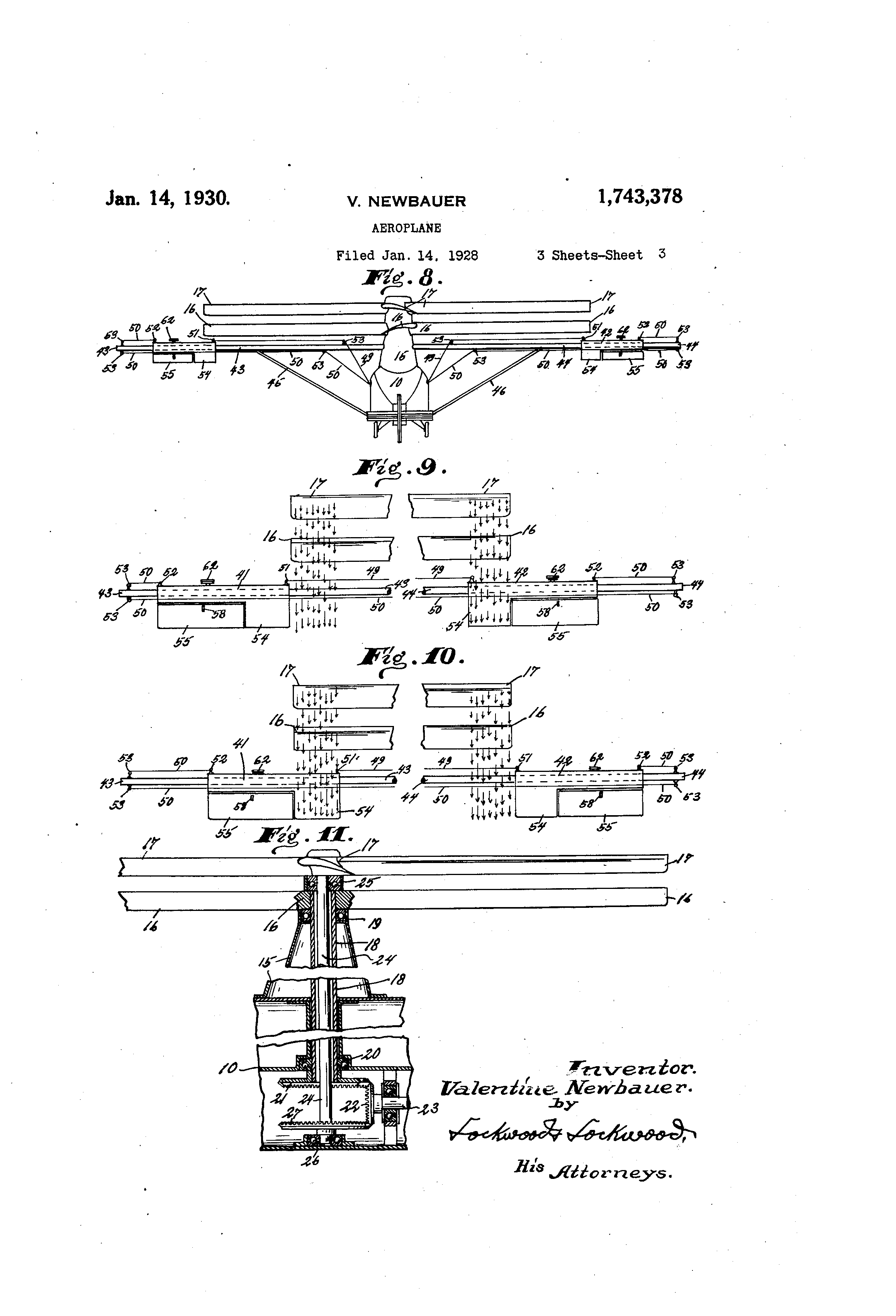 K-at.ented Jain. 14, 1930 11743.9378. UN.ITED STATES PATENT OFFICE VALENTINE NEWEAUER, OV LOS ANGELES, CALIFORNIA, ASSIGNOR TO NEWBAUER VERTICAL AIRPLANE CO., INC., A CORPORATION AEROPLANE Application flled January 14, 1928. Serial No. 246,768. This innention relates to @n irnprovement in the construction, ciperation and control of a vertically risiiig aeroplane; aii(I the 1)1,iiicipal object tliereof is to provide a siiiil)le and efficient means for obtaiiiin- and iiiaintD -tory tainiii(y a saf e and satisf a(, equilibriiiiii both in a stationary position al'id in flight. To that eiid I provide a pair of lifting wliigs attached to the top side of the body and ar10 range(I traiisversely tliereto ancl drin-eii to raise and lower the aeroplane in vertical lines, with the wiiigs so driven that they coact Nvitb ,tdjustably mounted si(le ailerons and also adjustable elevators in the rud(ler 15 -oup to maintain a relatively perfect equigi@ librium of the aeroplane that is fully under control of the pilot. That is the adjustable ailerons are connected to a stick control so that t-hey can be manipulated by the pilot 20 to positions best adapted to effect a satisfactory equilibrium. Another object of the inveiition is to provide a sin@ple and effective means for iiavigating the aeroplane in a relatively vertical 25 line both in -.iseending and descending. To Vnat encl I provide each of the pairs of liftiiig wings -with four blades spacecl equidistant apart with cael-i blade forrned witli proper curves and cainbers, and varyino, pitch an30 ,,Yles and vacuum etirves from the hubs to the outer ends of the " in s to effect the greatest liftin a power possi@legwith the wings rotated in op'p-osite directions so that their momentiirn in cooperation witli the mantially manipu35 lated side, ailerons and also the elev,,itors at the discharge end. of the troughs in the'rudder roup will colinterbalance ancl not cause the gody to lose its equilibrium and the aeroplane spin or go iiito a nose dive or tail spin. Also 40 this reverse rotation of the lifting -%vinos effects a compound tlirust to the air that aids greitly iii a quieli: verticil rise of the aeroplane in a relatively straigl@t upward course. A feature of the invention @s shown in the 45 construction and arrangement of the side - ailerons which are ,tdjustable so tli@it they e an be move(I bv the pilot to a neutril positi oii in which botli will be effected alike by th e downward thrust of the air from the liftiil cr wings or rnoved to a position whereby 6ne 5 0 ai @d not the other will be' depressed by th e tlirust of fiir, tliei-eby laterally stabilizing th e aeroplane; Llso a feature of invention is s hown iii the construction and arrangemeiit of tho ruddei- (yroup in which the elevators 5 5 a re adjustable Zo caiise aii upwarcl or doivnw ard tilting of the nose of the aeropltiie oi, - h olcl the aeroplane iii a baltneed horizontal p osition. le con Features of inveiition are shown in tl 60 struction, combination and arrangement of parts whereby an aeroplane is provided that is neat and pleasing in appearance, easy to construct, assemble and operate, and which is safe and durable iii use and effectively C,5 stabilized. A feature of inventibn is shown in the construction of the side ailerons, whereby thev automatically n-iove their respec'uive elev af@r wheii they are nianually shifted by i 7 o D ilot to laterally stabilize the aeroplane. ' Otber objects, advaritages and feattires of in vention. may appear froni the accorn-pan ving drawings, the subjoined det,,iiled des @ription and the appended cl,,tims. 7 5 The accompanying drawings illustrate the iii vention. Fi-ure 1 is a seniidiiorammatic view of a n aeroplane constructerin accordance witb th is invention. Fig. 2 is a fr,,tgmeiital dia8 o g rammatic plan view of the tail ailerolis and iudder. Fig. 3 is an enlarged fragmental s ectinal view on the line 3-3, F;@g. 2, slio.wing th e aileron tail elevators iii neu@ural position ,i nd also indicatina by arrows the cotirse of 8 5 th e. air fron-i the fiftiiig win(Ts tlii-otigh the zn ai lerons, 1)arts shown semicliagroLit-nmat@ically. Fi o,. 4 is a plan vie-%v of a side Lileron, iis z@ it s support and operating i-neans. Fi,-. 5 is zn a fragmental plan view o@ the support shown 90 2 1,743,378 in Fig. 4 with the aileron removed, showing the rack and pini6n for autolmatically actuating the aileron elevator. Fig. 6 is an enlarged cross section through one of the ailerons,showing the means for actuating its associated elevator. Fig. 7 is an end -vienv of the aileron shown in Fl 4 and 6 showipg I alt e IF Fig. ered positioias of th a, @ron elevator. 8 is a diagrammatic rear view of the aeroplane 10 showing the side ailerons in neutral position. Fig. 9 is an enlarged fra-amental reir vie-%v go showii inpi-. 8, showin analo iis to that, g the side ailerons shifted toward the' ri--ht so that all the ai'r thrust is on the right hand aileron 15 and not on the left. Fi-. 10 is a view analogous to Fig. 9 showin igy " ihe side ailerons in a reverse position, and Fig'. 11 is a fragi-nental vertical section through the body of the, aejroplane showing the means for drivi,ng the lift20 ing wings in reverse directions. The aeroplane includes the usual body 10 with a nose and tail end, landing wheels 11, slcid 12, ruddei- 13 aiid nai,i-atiii- pi-opeller 14, it bein understood tliat@nthe iropeller 14 25 is driven ty a us,ual aeroplane engine, not shown. Mounted; on the top and secured to the body 10 is an extension 15 that supports the liftiiig wings 16, 17. These wings are driven 30 in opposite directions to prevent spinning the body 10 as well as for the purpose of aiding in stabilizing the aero_plane. As indicated in Fig. 11, the wihg 16 is mounted on the upper end of the hollow sliift a5. 18 that is supported in the bearings 19 a'nd 20; and a bevel gear 21 is secured to the lower end of the shaft 18 that is driven by t bevel gear 22 on the engine shaft 23, it being