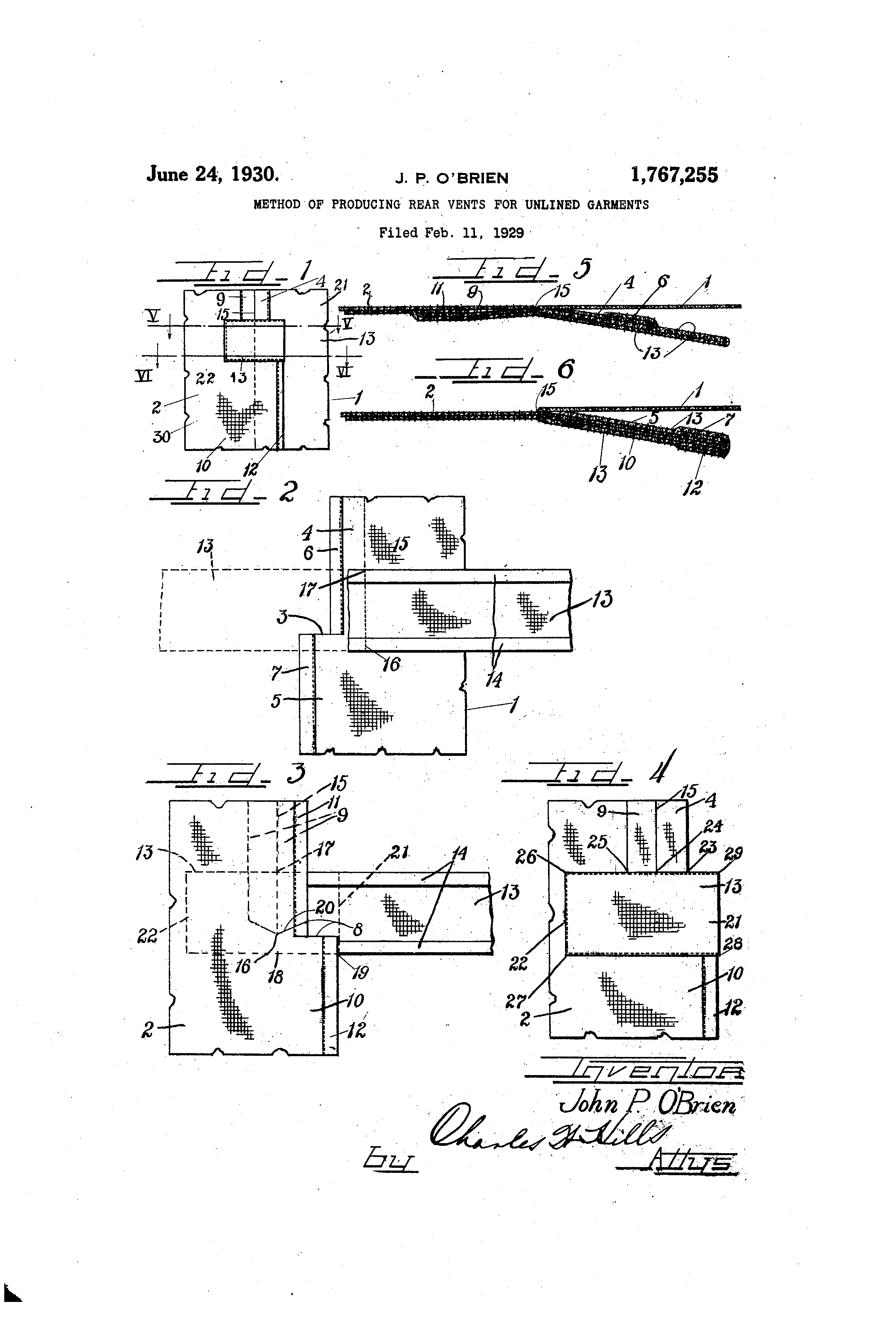 1 7 67i255 tion as h6reinbefore described, the garment section I is no-w removecl fr6iii beneath the garlilent section 2 iiito the posit.ion illustrated in Fi(rure 1 and the garn-ient is.pressed along zn the seam line 15 and continuing'along the line 30'pi-ovidi.n(. a crease between the gar iiient sectibn 1 aiid the vent:underlay strip' 5. The reinforeiiio: strip 13 which covers the intersectioii of the g,,trment vent with the lo-wio er end of the center seam 15 is entirely free of. the g,@irinent section 1 so that any strains applied to the vent polrtion of the Lyarment are iiot transferred to tli@ o,,arment @ection 1 but teri-ninate in the stronlyest Dait of the velit reiii orcemetit along the line @ 18-19 wliere the stitching penetrates throul@- h four rs of the garment to form a very strono, laye t, seai-n tr,,insversely icross the upper end of the ven.t underlay sections 5 and 10. 20 AITI-lile the invention is described as pertainIng t6 the rear vent of an urilined or skeleton seam inla3, strips and vent underlay strips, laying a piece of reinforcin materi@l trane;ver'sely ac--oss the' inner facge of one of sai d 45 seetions and then securing the two sections and the I)i.ece of reinforcing material togetber by a, sin-le seam stitchino,, then bending the al str'ip of reiiiforCiDg material over ong the line of the se,,tm stitching and stitchinly an50 other portion of the reiiiforcino, s@'etion thr.oll(,Ii the two underlay sti-il.)s forling part t, of the garment section, then cutting one @of the inlay strips of the seam and pressin 9 open said seam, after -which the reinforcing 55 str@ip is beiit oi,er on itself to co@er the lonver end of, the seam inlay strips and the upper end of the vent uTiLderlay strips and final'ly stitchi'lg the edoes of the reinforciulg strip to the seam inl,@y strips, the vent underlay Go strips, and to the inner surface f one of 0 said garment sections only. 2. The li'lethod of pr6ducing A vent for an unlined garment, said metliod consisting of seamin(gy it:,,ogether two sections of a garmerit 65 to a. cert,,tin point at the jtitictioii wit-h a vent iv,ill of course be understood th@t the improved methocl m,,ty be applied in the forming 25 6f reinforcement at any i,6nt. provided in other portions of garments or in similar article8. It iNill of course be tinderstood that iiiany changes may be made and numerous details -o of constriietion may be variecl through a wide range -without departiiig from the principles of this invention, and it is therefore not purpos;ed limiting the @atent granted hereon otheriv,ise than necessit,,Lted by the scope of ,@?,5 the -,ippeiicled claiins. 1. Th6 iiietliod of pi-oducing a reiiiforeed vent for uiilinecl gari-iients, said niethod consisting of pl,,teino, tii,o notched garnient secsection to provide seam inlav strips ancl vent underlay strip@3 and securin@ one eiicl of a reiiiforcing strip2 iii'said seain and bending silild stril) oi7er the,end of the seam and the erid of the i,ent section and stitching the mar(-rin 7 0 of the reinforeiiio-, strip to the @eam inlay and vent Liliderlay st@ips and'to 6ne@6f said garment secti6ns onlv. 3.@ The '@tl@od'of produciiig a vent for an unlined garment, said method consistiilg of 75 stitchii i(r oiie inar@in of strip togeth ei7, ivitli the seam s ai,r . of g,,irme nt sections u@ to the inner enci of a-, ient s strips and vent Lind6rlav strips a e 80 in(y over the reinforcing strip and st th@ margi s thereof to the seam inla n and the vent underlay strips and to e iniier f ace of one of. saicl garment sections @only. 4. The method of producino,- a, v6nt for ail 85 unlinecl i@arment said i-nethod consisting of garment slich as a man's c6at or overcoat, it -,Seaming tivo sections of a gariiient toaethi i ) i s b e n t o v e I cl@iim as my inveiition: 40 tions -with the outer surfaces of s,,tid sections sliperimposed one on the bther to provide two (yarment sections tnd the strip of reiner to a 1:)6int to which a -i,@nt is to start to provi@le tinderlay strips and securing one mar,@,nn. of a reinioreing strip to said sections oo by the seam switchin- and then,stitchino, t portion of anotlier@m,@roin of said reinfo'rcin, strip across the o;erlapping underla:y strips of, the garment sections after -,vhich the reinforein str r upon itself 95 9 - to cover the ;,ntersection.of t,he garment seam and the vent there6f and finally stitching the in,,trgins of the, rei@to@eing @tri-D to the inlier face of- one 6f @,,iid garment sections only. "LOO 5. The' inet-hod of pr64ucino, a -@enf for ail tinlined garillielit, said metliod coiisist-ing of placin- two garment sectio.ns face to face and.la ying a reinforcing stril) across one of said o-arment sections ,ind then seaming flie io5 forcin g rAateriiil with a single seam stitching to provide overl,,tpl@ing searii inlay st,r@'.ps tnd ve strips and bencf!nL)- the Pt underlay ileinfor cilig trip al.on(y the,, line of said stitch- 110 ing and a@ai@ stit.chin- a po@tion of the reinforei no, strip and tivo portions of the garLI ment sections together across the @ upper end of the vent, then opening the seam ii-ilay strips and bendiii.g the reinforcing strip ovei, 115 that T)ortion of the g@rment -where the end of t,@e , seam joins the end of the vent:,,i,ncl then stitcliing the reinforeino,, strip tog-,ther at one corner and flirthermore stitching th6 m,,trgi n of the, reinforcing st,rip to the seam 120 inl,,ty strips and the vent underlay strips anct to the inner face of one of the garment seeti6ns onlv. 6. The,metliod of producing a vent,in aii 12 5 tiiiline d (-Yarment s,,ticl method consisting of@ ltying ti@vo sections of a garme@t face to face ai-id then I.ayi@g a finisbing st-rip transversely ,Lcross the inner I face of one of said garment sections and stitchin-Y.-th@ tnvo garment 130 @lifs iing E@ttil) too@et lei,,il6no, tioh' fi;c ro& 8titohiifg coiinection8@ Nvith I'' ",I , , ,, - , 1, -- eS.Cet ie a 8 strip @loii@, @,q@id cr L tlfe @titcliiiy Z7 ' 