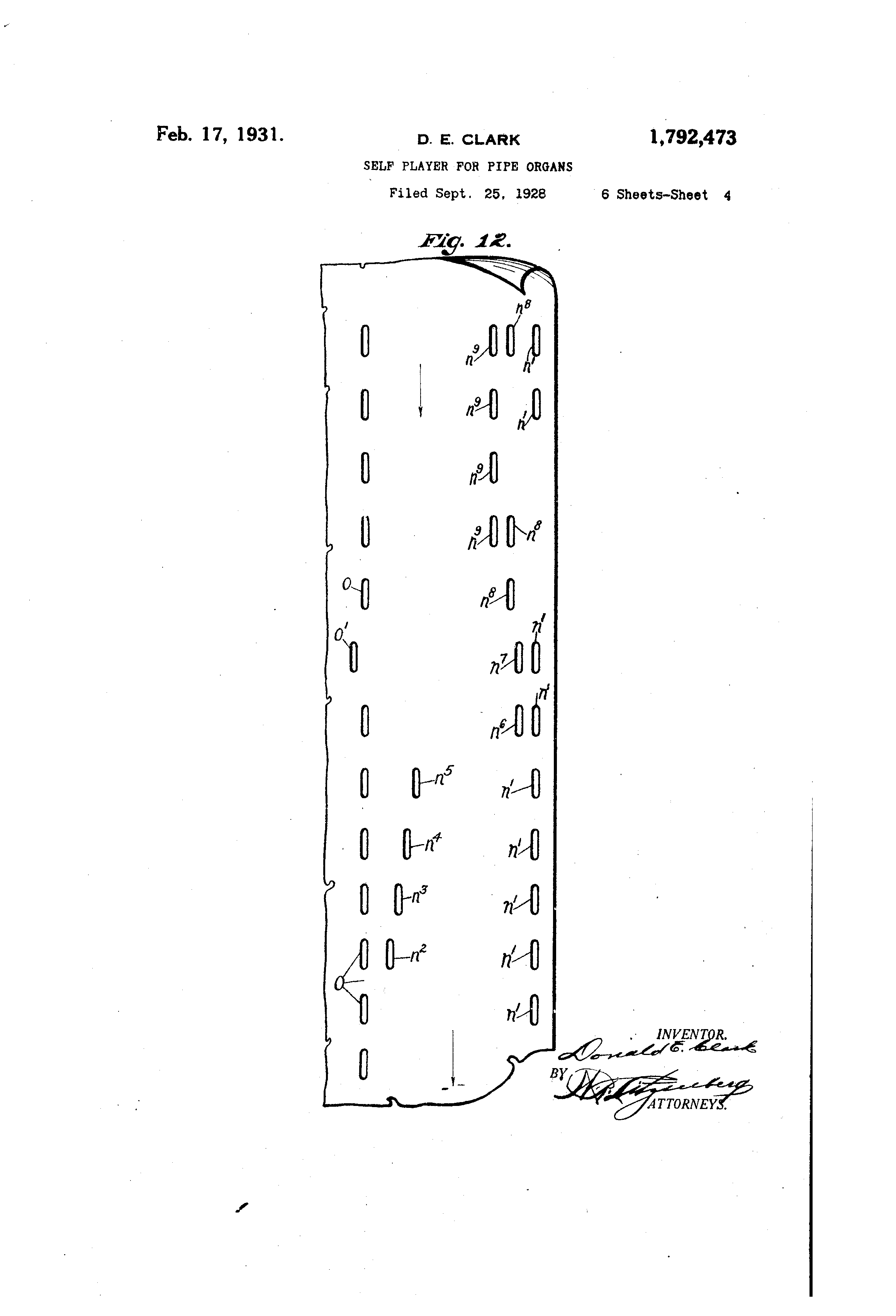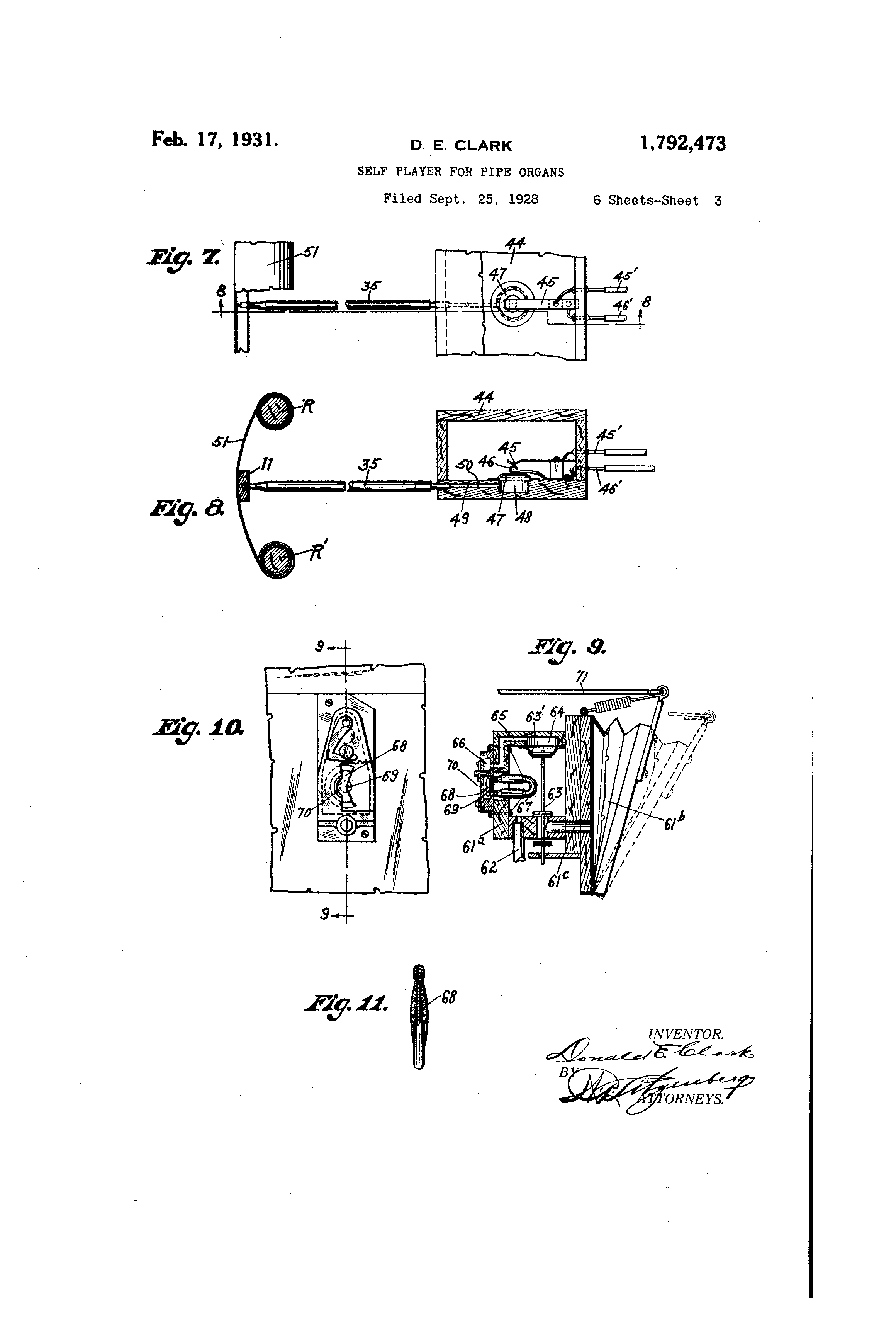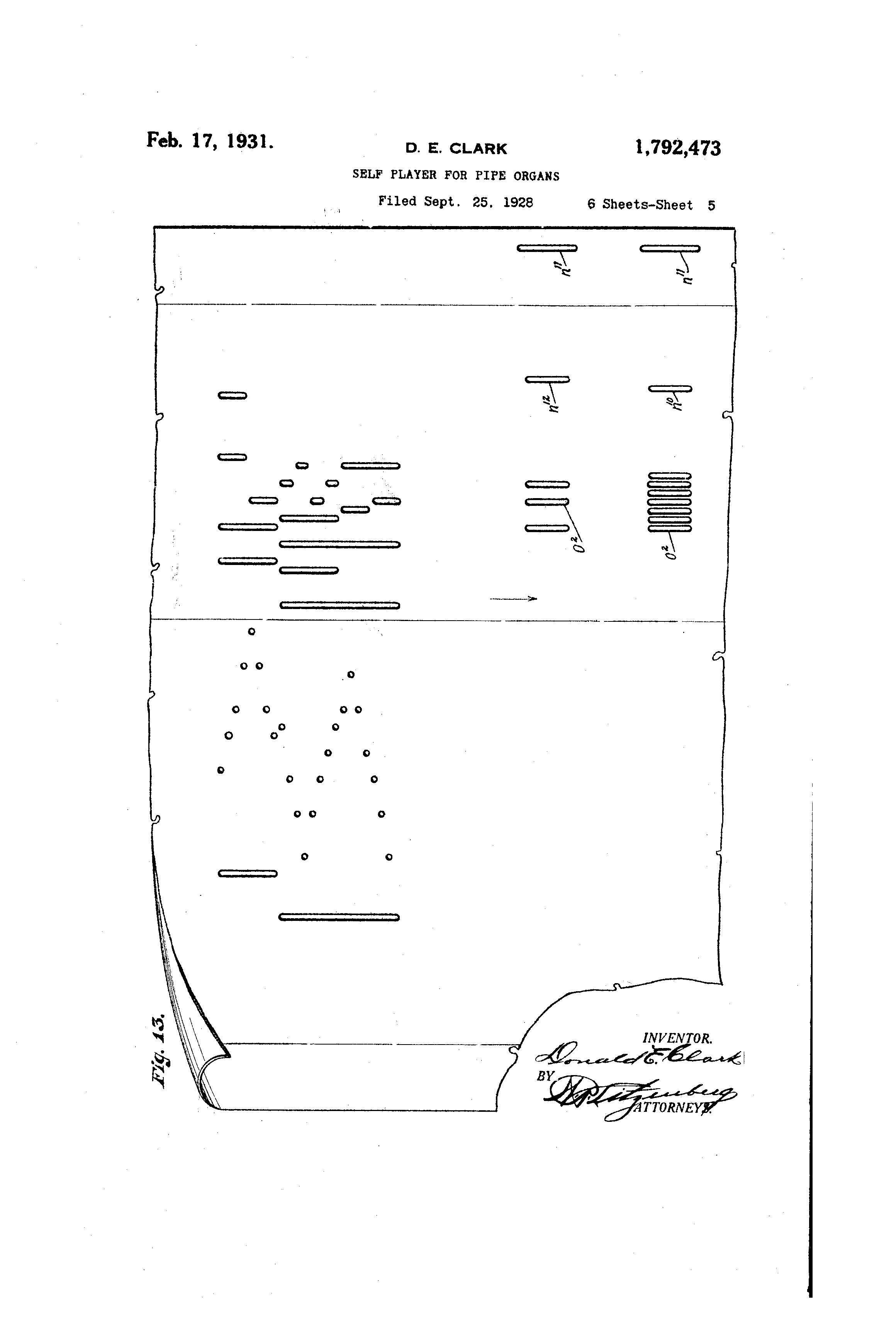 1,792y473 which is oiie of the new or additioiial holes added to i-iia!K:e possible m)7 inve,-itioii, aii.d whicli cont'rols the operati'on of 13neuiiiatic 61, which ;.n ttirii inoves bar 80, alid thereby diseii(- a,,,es contacts 80' fi-on-1 their respeetive i)ari,ilel ineiiibei-s aiid bi,e,-,I@s theQ@i@eiiltestab'iisliedbyhol@e,@"f. matic v'if. ciiso brings into en(pa(y-.ineiit co,-ltact moinbers Soal 80b , 800 -@i-nd 8011 wilh v.,,-!.,tical parti.ilel mei -ii:bers 76 77', 78 -@lad '.79. These coiit,@c4i-l iiieiiibers 80,1, Sob, SOc aiid 801 are conpected. respectively, to 9'-', 93,2,4aiid95. Thevalsoopei',tt(,Lo i,,, ove'io@'- zontal swi@'cli mer@ibers 84, 80D. 82 S',', ]- (@- spectively. Thus it will be seeli@ th,,il.- ii iii 'tb hol,,,@, al,@cl @-'-2, -s corijiiii,,,t;o-@@i ivi .; openecl, t cii-cuit,is established throuoli 4,),', vert;,cal iiiembei- 79, contact 8011, to clectricall,y operatecl pneiiiiiatic 95. Thi-s pjieu2C iiiat;-c cilises the operlition of the iiaov.,ibll(,, liorizo.'n.tal iiiembei.- 81 bi-in(yin(y iiito eD-a(-c-iiient coiltpct ]I-ieinbei-s 81' ivith their respecof wl,.@icii cc;16,@.",2t;ve vertlc,,,! iiieii,.bei-s, oiie -fiber 74, th i.-eby c,( i-@ipleting a circuit which causes the depressi-oia of o,,,,e of tile stop tablets 113, iii the inariier indicated iii Fig. 5. Supposin- that hole 37 remaiiis open ai-@d also liole 22 and in conjuiietion with these 3o two b.oles, hole 41 is opened, it will be seen that by a si.milar process the same stop tablet will be made to lift throtigh a ciicuit established I)y one of contact inembers 82' on movable switch mei-iyber 82. Similarly it ivill 3,@ be seen that if iii conjunction with holes o7 and 22 1-i-ole 40, is opeiied, the stop tablet 113, shown I directly to the left hand of inovable switch nieiiiber 83, wi.11 be depressed. It will be lil-"L-,-d, if i-n colijiii-icl,-]'O'l W'Itli lioles @it)@d 40 22, hole 39 i.s opened to est,,tbli-sh ,i clre,,iit thro-Ligil 39' to vertical men-iber 76, aiid one of contact i,-iembers 84'. This shows five distiiict purposes f oi- )vhlch hole 37 caii be used. ,LdC In , fitioi,, to tliese, let us stippose that hole 45 37 is opeii ancl I)ole 21 is opened, through circuit 21', electrically operated pneui-natie 60 li'loi,,e,s switch member 85, and causes contict li'lei-pbers 85' to iiiake coiitact with their respective vertical members an(I ' eirellit i-,z; 5o establiglied to oiie of the 1,:eys 1001 of maiiual 1,3. 1-11 -"ii coii-Liiie@cion witli holes 37 aiid 21, hole 22 is opeii(@(1, thereoy interriii)tiiig eoiit,t,,@ts 80' it @yill be clearly seen th@t oil 1)7 tile, ke 100, oii i-aarual 13, will be affected.' If, y however, it i-s desired to havo, tl-.ie saine i).ote pla-y oii both of the manuals, only two lioles 37 @iid 21 are iiecessai-y. It will -,tliso be secii t'iiat if 'iiolo, 20 :IS 0I)e@ned iii coiiju-iictioii hole 37 bl, a similar process, li:ey 101. (,n 14. is affected by said hole 37. Tli e san-ie note , can be made to play oii one eac, ,,t of l@ievs 96, 100 alid 101, by openiiio, holes 2o tn aiid -9@i in conjunction with hole 37. Circuit brealiers 86a are showii on movtble switch ir@embers 86, which preient the oper@ifi6ii 6f pi-@ciiii-iaties 81, 8-oi 83 qlid 84, ti-teii@-lby p@@v@iltinr the depres8iii'g- or'r-@a-isiii,- o'f- the st6p ttible,;.,S, i@,liile sii,-itch 86 'is l@n 'op-ei-atiolli., Th is give", tlio playiii@,,), o-,, iyial,.iti,,'i'@ 14 f @I I.OI iiote @ - '-,e, 'tliail 13, @iiiki. @(liial .0 t-,,,) iTila@i-iti".1 @'112. If) 0i)i@llptioll of m'Ovabi-e-,,@witeli mely.-be,- 8,@', I'llii@ j@i' (,!-Ie(@f,@@ici'il;-@,- 58. It will be cleai-lv Feeii iii '(,he I:hac ii-iembet-s S't"t, 871) aiict S."c, ti,e stop ,'t-irectly to the lcft 'k-lo be, depi-es,,ecl, ceoi-d-iiig as their res@)ecl@-iv,,, e'reu-ts aie coiiip'etcd. It 'is tL@;o jil W;,tl-l liol,@ 19, if hole 38 i-s opened, a circuit is establl'shed to all of so lo ei- coiitacts of sai-I stol) tab'e'- 113, wldcli w I Ls causes tl-ieni to be rai,.@ed sili-itiltilleousl@,. I 1. li se'if-player mecha-,qisin for pipe oro,a.-@s, ii-lei,-Is fo,.- autoniatical.ly operating stop tatlets.,@ @@ivell shutters,,,;@-,Id i-neins includiii coinbii-iatioii, pneumitic iiieans for opelectric switch, said ineans beiiig ,,,,!,apt,-,,I to be controlled by pei-foi-ated sheet, iii ele,-@ti-;-c siii-tch to be op-li-ated, ,t eircliit i-iicliidiiig slid switch, ]Da,-Ilelt-le mea,ns ir,C,Ltidecl I;ii sai-d eircui.t to be eiiei,gized tliei-e f@-oiii, mechanism controllect by said magi-ietic n-ieiiis ii-teludiiir a sN@,-Itch iiieniber havi@i-@g a T)Iui-alit,v of coiitact el.el-,Ie-Tlll-s foiin'(- a@id 'oreakin- a pltira-'Iit)T of circuits sin"iultaiie,)tisly, eireiiits there foi-, s'uop tablets adq,pted to be electrically operated froill said c-;rcuits ail,-l sy,,ell sliutters aclapted to be, ele ctrictilly opei-ated frol-ii said el.-cl7,its. 100 2 . Iii self -player i-iieclianisn-i -,101' pipe oi@- - ans iising traci@er bar and perforated hiiisic s'il eets, mechaiiism for artomatic@ill-@, aiid iiidiv idtially opei-ating stop tablets atick movi.!',(Y sai ell shutters, said iiiechadism iiieludin(, Ill 10 @ with clecti-ically oi)erated stop t,,i blets ancl electricall@,T ii-ioved siitell shiitte,.s, clictii-ts tlieref or, fixe,-! switell ip-eiiibers fori-nportioiis of certain circuits, movable swi tch rnembers havi.-ig cont,,i.-t ele@-iien@'s coit- jib iic@eted wi-th cert,,ii_n circuit w,@i@es, iiacalis for sr@'lectivel moviii-saidirov,-tblesw;.f,climemy bei -s to mtice tiid b,.@eak cojiLr(-,Illii,.g cii-en-ilt-S fe, @@ s@ai.d stop tablets an-(!. sai-d s),,,ell sliiitters, si;l d in.-ans bein(y adapted to be coi -iti@ollec, 115 )13er@,itioji by iiiai-,Yiii@al pei@.1':oi-atioiis s@t-l(-l sheet, 11 iarg, iiil perforatioiis ,jitt,,I@aiieouslv cooperatiii@- i-@,,itli "' t@ ?@, liote 1)lay@.ii,), pei,fo.,ations '1,-o eft'ect si;-d co-,Itl,Oi '3. Iii s(, 1 .. If-p'ayer iiiecliaiiisii:i for pipe org,,,iiis USIII" tr-,iclcer bar aiid pei-forated itiu,-@ic