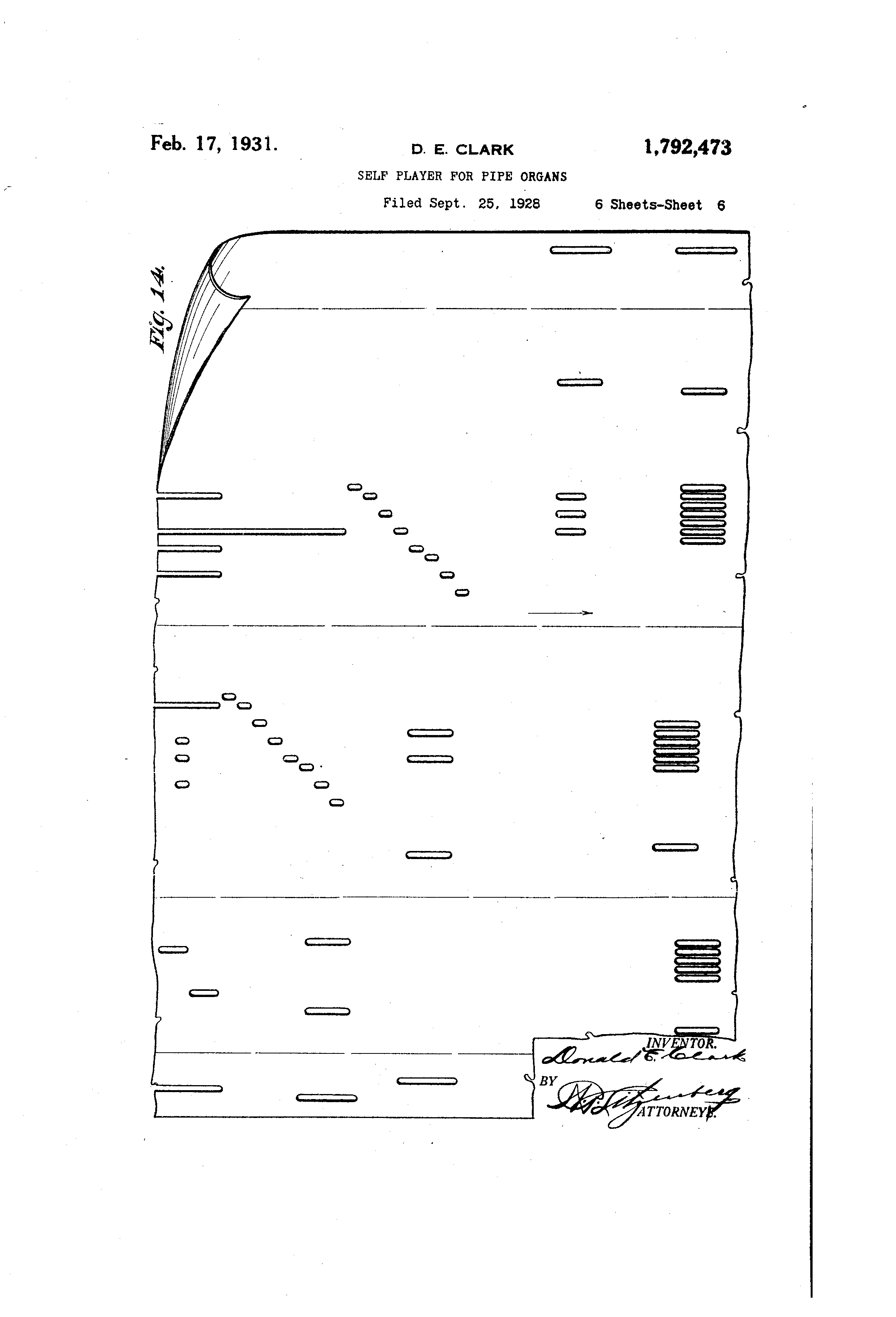 Patented Feb. 17, 1931 l @ 7 9 2 @ 4 7 3 UN@ITE-D S'TATES PATENT OFFIC@E DONAL]) E. CLARK, OF SANTA MONICA, CA.LIFOUNIA SELF-PLAYER EOL@T PIPE ORGA.W@ Applie'ation filed Sept6mber A@l,v itivelitioi) r(@,lates to se-',f-pl@t),(,:i-s foiI)ipe ot-gtiis,,ti)(I iiioi-(, pai-t;citllli-I N, to by i-tie:li).s oi' )NIii(!h I t@o eoli(141'ol fi.,Oj)t t[le lisii,.ii j-' of @t,@p(lar('[ plaiio i@oll iiot oi-ili, tiic, 1)@,dil an(I lil,,iijti,,il ilotes, biic@ tite itidivi(Itial illati-oii of ei (,-lit -five oi,: iiioi-c, stol) tat)lets. In I)i6esent player records@ A,,,Itliin tli(,@ iiot,,@ i,a@1--e, wlietliei- for piaiio oi- oryai-i; ea(-,'i perio foritti'on 1-)e-,-foi@iiis a single, iiiiietioii otili@. vvith iny iliveiitioii, I aiii at,)I(-, to cause ilics(-, saille@ I)t@lfoi@,,itions t6 perf oiini oi-ic oi- iiioi-e ,iddit'oiial f Linet'oiis, thiis iiial@iiir 't posn-Li@,@ie, .y itieans of add't'o al perfoi',tti-oDs in ,t i-oll 15 of standai-d inidth @nd I)crf6i-,,it;ojl, ati(.1 wlii-ch can @ be iiitde by pilt'seiit pet'If oi@,,, til-, ifiticiiiiier),, to control and miinipliltte an or('all in tho same manner tl-itt aii orf),anist tn z@ 25, 1928. Serial No. 308,221. Figuie 8 is a ic@rtical seetioii,,tl 'Llii-otig,h on Iiiie 8-8 of Fi,,. 7 Figtire 9 i.s an enlai-gred, vet@tictl see@'ul'oiial 1-i(,@w of ont, Of the electrically controlled I)tiettil-tatic snviteli bai- operiting devices; Fic.,tire 10 is ari eiid elevation of the saine, froll'i the l(@,ft hand sicle of F,@g. 9, with p@irts broken aivay; Fi-ure 11 is an enlargod edge Niew of in at-m-ature v,,tlve iiieiiib4@r, partly in sectioll, 60 Figui7e 12 is a fra(,tneiitary p6rtioji of a iiiusic roll showing how, Niitli@ my in-@,entioi tpplied th6teto@ a, iregulki- note playing hole therein citii t@e i-nade-ti) p@i@foriii a variety of differeiqt@ functions; 65 Figiii-e 13 is a. fragmehtary secti of a on standard music roll for- pi,,tiio showitig how niy idditi6nal holes ctn' be placed therein doeq,,iiicltld:@ng the operation of snvell shut- f6r automatically oper@Ltijici the stop tablets 'table for tho inusic td iiiiiiiediate ly folloav 70 20 t(,l@s, ptilling and cancellin& of iiidividual sul stops and:toe I)istons, one or all on said toll; p of-tliree iiianui,ls, or'tlie mai@ype-dal section Fi-ure 14 is a sitnilki@ -Vie8v s@lioiviiig a spe:m ciall p aiid the eclio organ pedal section. y pre ar6d mti@ic roll - alid: illustfatiiig T,I,itl8 witli a ii-iinimum of tddit-iohal . means how the stop tithlet@ clan be opei@ated in oiie 25 (r,,MeehaniSM I ain abl@: to control atid ina- section for one iiianukl while iiotes are beiig 75 nipulate the vtirloiis coilti-ol dcivice,,, of a pipe played from another sectioii on ajiother orp-@ii@ fron-i a -qtahdard r 11. manual. 0 In otder to full)T explalh rfiy inv4@ntioii, I I have shown so niu6li of @a-,i electrically opilltistratod oti the aocompahyiiig dranv- erated pipe orgaii as @ is neces ary to illi-is30 ino,8@,sufficieiit riiechanisn-i@to eiyibody my ii-t- trftte hoW my inventio-n cAn b @e ttta@lhed thei-e- 80 to f-Or the purpo@e 6f catisino, the A,,trious ventioti, ivl-iicl-i I will now-doseri Figure I is a dia'!-@,rarhiniti@ VleiN@ slioWinct coiittol8 to be atit6initticall.Y 01jer,,ited instead tl@ie control mechanism@ lq-Tld thcir var,,otis Of m-anti.a.Ily operatod, such oper@Ltiot bein,,,,, conneotioh@ eleetrically@ @tnd pne,,,iiiiatically. contr6lled fr6m tlle staiidard pialio roll @3 Figure 2 is a plan Y, ie,@@@ of @ @shtitter - width of record, ti fo,@,v adiiitiohal r"l@tf'orn- 85 inechani,- 'OT)er- tions beihg requiri@d iii sal-d pe--,f6-c@tOd iiiiisid m; roll. It makes possible t,he use of any stah-,IFi(,tire 3 is an end vica@, t'ilereof: ard eightyeiglit iiot6 ihti ic r6ll, Stich ,,ig are Fio-ui-e 4 is a sectional takeii oii litle now for 8alo and@wlii@h iie're origititLIly de@@4--4'@f Fi(, 3- 1-@ I I si,@ried to be played oii s@lf t,)Iavei7 pianos. for go Pi e 5 is an enl rgod view of the a stP self pl-ayer f6r pipe orgaii-q. t,tblets usiiq,IINT n-iahtially opertted; ]Referring now@morte in detail to the diawIri@ igtire 6 is a f ront vieiit of the i-ntiiuals a,,d ings, Fig. 6, 11 designatesi the usual tra@ker f o; ot pKia.Is of @ an oi,aan ---,Iated t6 a ti.aekei@ b,,i r 1 2 13 and 14 desig t@ @nate t tliree mantial over whicli t p r rat music E,,Iic-e aiid it) c giiate@3 tl).e pedals. Til,@ 95 4. bftr he e fo e(I t c iiioves; traeker bar 11 is showrt di-@ided into tli ri@e .Fi-- ire 7 is a plan view on aii eiilar,),t@cl sections @91 indicated by the brackets 16 17 aiid I I sea,le- of a -piieui-n atic sivitch control f foiii the 18, representiiig th@, normal corresooiidino, ti-acker. bar, also sliowing the ihtisic roll @over playing positions- of ea,ch section, ilndicatea I)o siid tra-eker btT by the licrht lines riinning therefroin to tiie lou 2 1,792,473 iiiaiitials while'L'he li (,Yht brokel-i li-i-ies rtiiiniii cy from stid tracker bar to said iiianti,,ils iiidic,-,te the keys Nvhlch elii be Riade to by use of the additional hbles in the tr,,icker bar .@-tnd paper roll beyond the ord-inary iiote playino-- i,ano-e. I bave sl,,owii eigl-it acldi-tional 'I sa'l lioles , t eacli of the opposite ends of ic tracker bar, said holes coiistit-Litl.iig expressloi-i holes and they are desio-nated 19, 20, 21, 22, 23, 24, 25 and 26, oii t'iie liiti(I eilil 10 of saict tr,,icker bai@, @n,@t 27, 28,-29@ 30, 31, 32, )4, oii tl-ie left 11 11 s i r 3 ,i n cl @o a,@ld e d olf a'd t acl,eL- bar, Referrin(y noii,- to Fig. 1, I have sl.iown ,i @of section 18 of said tracl@..@r bir 11, '@or"O' ii,clticling holes 19, 20, 21 and 22, alid also ,,t porti6n of section 16 of said ti-acker bar, including,, holes Oo7 to 42, iliclusive, wli;leh @ir,@ note playing 1-ioles aiid also a@ I)ol@tioii of th(@ left hind end of s-aid tracker bpr, including holes 28 and 29. My invention Iiie'L]-"des th@, additional holes 19 to 26, inclusive, and 'Ulie, holes 27 to 34, inclusive, in the opposite@ eiids of the tracker bar, whicli IcLr