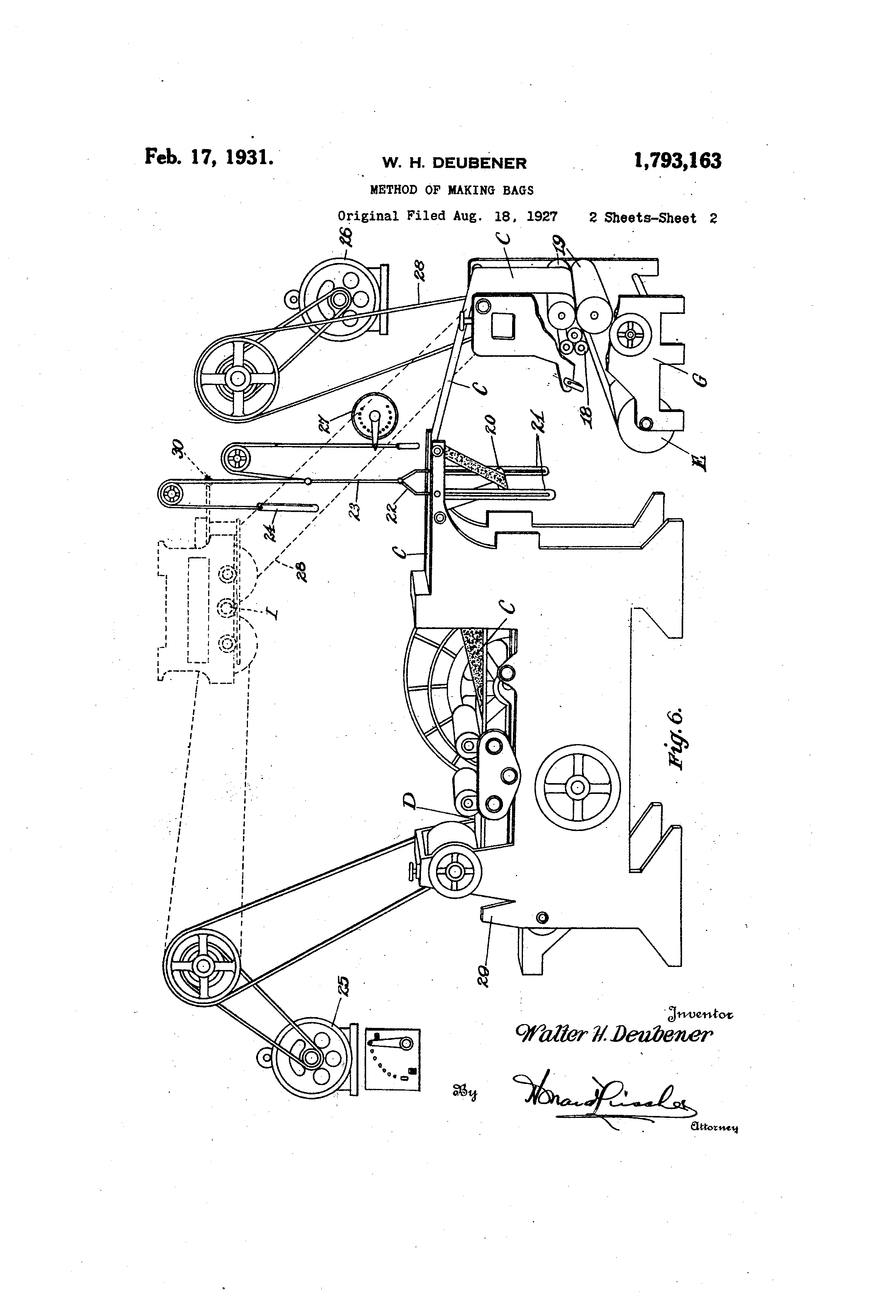 claim: 1. The method of making a shopping bag consisting in indenting, impressing and autorjaatically forming sl-ieet material into a bag with a decorttive indented surface extending so throughout the eiitire body of the bag2. The method of mav!nu a paper shopping bag consis;ting in iini7ressing into the sheet material a fi-qish t6 simulate f abric or leather, and automatical.ly making it into 35 ,t bag with sides and bottom portions. 3. tlle method of mali:ing decorative bags from a contini-ious sheet of material which consists in decoratiiig and indenting the said sheet to stiffen the same, and then forming 4o the same into bags having an outer decorative indented finish. 4. The metl-iod of mali:ing a decorative ba-g which coiisists of indenting and impressing ,,t mnterial and then forming the same into a 46 bag. 5. The method of making a shopping bag which cons!-sts first in impressing a continuous sheet of material, and then forming the ' to a bag ha-ving sides and bottom porsame in 50 tion wherein the decorative surface extends over tlie entire body of the same. 6. The inethod of mal@ing a shopping bag Avhich consists of impressiiig and indenting 56 a coi)-tinuous sheet of material, to sti:ffen the saine ,tnd then formi-Tig the same into a bag -with side,-, and bottom portio.-is having an impressed stirf ace over the entire bag, said steps being continuo-Lis and synchronized. 60 7. The method of making a shopping bag consistiT-io-, of dyeing a decorative finish to simlilate f abric, or leather on a continuous sheet from a roll and then forming a bag thereof, wlierein the sides and bottom por65 tioiis have an outer decorative finish. S. The method of inalcing bags which cons-'Lsts of the followin- synchronized steps; first indeni@ing and im5ressing a, material and then forming tl-ie saiiie into a baly. WALTER H. DEVBENER. 75 so 00 51, 12( 125 130