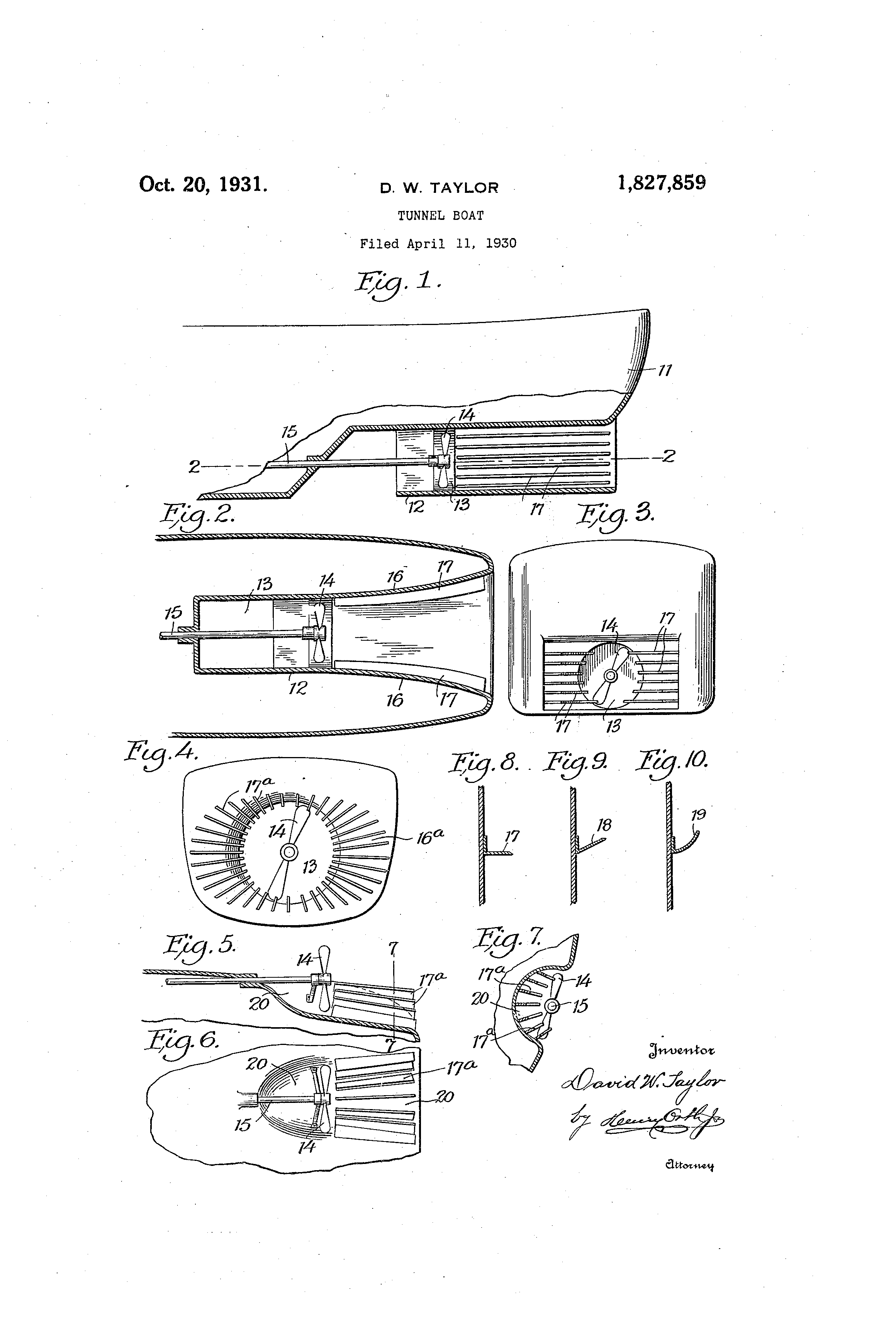 827,859 .on 21 just aft of the propeller. this;tunnel is opeii a,t the side towards the ivatei@. In any case whether the tunnel aft of the propeller is rectaii,atilar in cross-section, eirculdr, ellipt-ical, entire,ly closed on its sides or open a:t oine side, the fins are to be applied to the diverging walls of the rear end. of the u -he,@' @pelle@. t nnet@aft 6.f t@ In general wherever the Dropeller race fol 0 ows a hull siirface which is at such 6.,@kle to the axis of tl@e -rae-e, @ a.@,i-t -le:ives the -propeller@ t-hat an increase c,f pressure w6tild result.in an iiierease of forw,,ird thrust upon th6 h-dlll the installation of fins will produce an. in_ 15 crease of press-Lire upoti the h-Lil-1, the install,,i@.tion,@ of fins -,to prodiiee, @an increase. Qf pressiire @ upoii @ the t hull stitface by cheekiiao,, the rotation,i,i,i tl,- e@,race will be@,,tdvantage@iis: This loc,,tl@@ip-crease@ Of presstir6 wiII7; also @20 catise,--.tlie race@to h-Lig the@sLIrf,,tce b@-,tter and it @is: this! inclirect, aciion 6f the fins wl-iibh is particularly helpftil tuniiels. beit-the,@ivaterinore@nearly rnail,.itains the -Dref@sLite itblocitv relations Of@,a -fluid, a:nd. ect: the cheekir@ e sternperl @g of:@ th wtrd, vel-ocity@a@@tl-,e tunnel expands res-LtJts in the: 6f@:a useftil,for-ward tlirlist. Lo the fins may be @-of uniform wid @Fins@-in a circ'ular diverging @@@30 tnnnel- ihave,'Iittle to g-,tin,by, va-rying,@width, j@,,@T9. se e,, . ii @ Ly btit@- tho on, ih - sides o,f @ a@. t-Linnel@ @ of app.r oxiniataly:,Ir(,etangular setti6n)@,wayl-be ,wid @to ardtlieir@@afte - d enecl W r en g, with -a:dvan tage. al@,tuiii@el the combination@.with a tiini-iel diverging at its rear end.. andi, a pr@op,eller in th6 tLin@nel,- 6f moans in.,said dii@erging, end fto @ simultaneously - cheok - race, rota40' prci @duce a forwarclly 'propell'i iig ccmpol@ent on tt. w is@zof sai-d te divergingc ql th.e combinationi"W,Ith@a,; 't-Lmnel divergin@, 'it! its,@rear,eT-id,,and,a.ptopeller 3n the @@tlii@nel; @of .,means pr.oje@tito, .froni the@Id@ve@r.-g-i-iig iwalls Of !Sa'ld@%tuu-iiel@,to cheeki@ rqce,@ ratation,@. an-d. simiAlta;ne,Ous.1y, pro,@@du@ce ' a@-forwardly, propejhno-, force. on'@the diverging .,waJIs- of 1 said, rear- ei@d @.qft@. of .@ the @,pro,p.eller., 3.1 In,,4 tlinuel @boat,, th&, comWn,,ttiQia w,,ith tvtn-nel a,,nd-@. a@p.-ro,pol@ler therein,, said tuniiei dive,,ging, . fi:om@ the. p,roppllerposition @to! its reai,- ,&iAd,'of,fins projeeltin-, frorn the@@divor 9- -ing .,w, tlls, @of , sald raee.@ 4. @ 1-n:-.a.- ttinnet boat, the,.,coni@IDination @with and a, p,ro@peller@therein, di-N,erging from the propel lerlposit,ion@t6,,it-S rear E@nd;,of -fius projecting from the --diverginul,wq.@ll@;Of@.-said.race,'inereasim in@wldth t' I 9 f rom.,, ihe, propeller@@ppsi,@icn to. the@ rear. end of the tunnel. a, t-Lu-inel@ rboatz having @a tunnel7 @ubc@oss section.@,aiid de closed@@on its four, si s @@a prc,,p,@ller@@in@ tl@e tunnel, saicl tunnel havin g its tw6 sicles cliverging; of fins on the diverging sides extendin(y from the propeller Dosition aft that increase in width. In testimony that I clalim the fore@yoing as iriy invention, I have signed my name. DAVID@. W. TA-YLOR. 7 @ I @ I