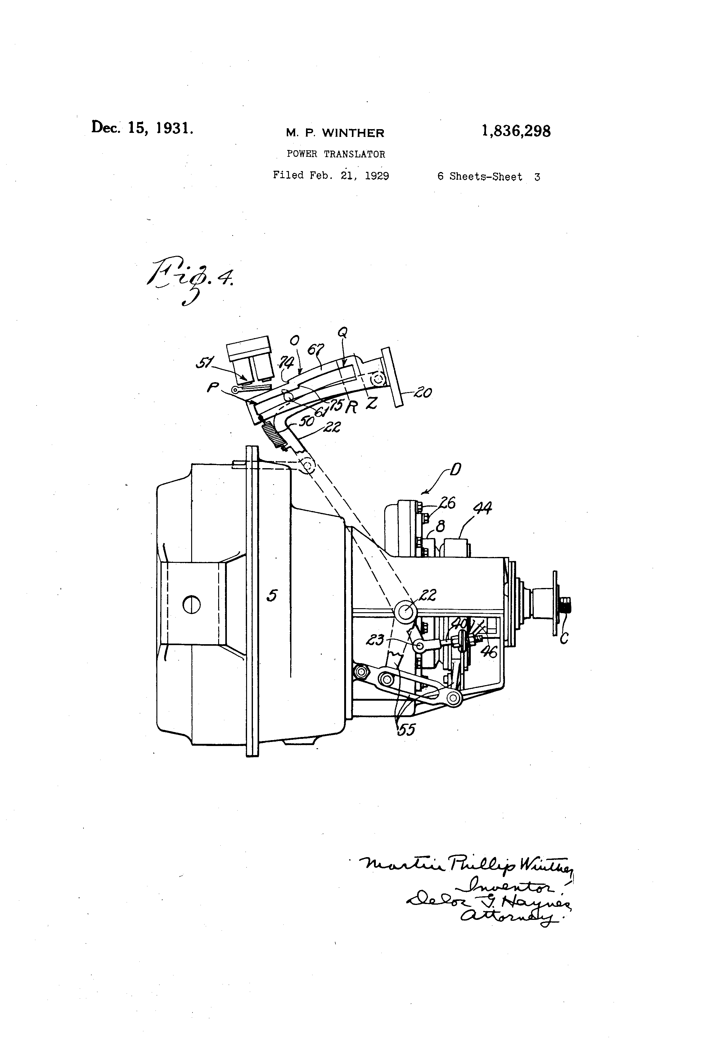 Patented Dec. 15, 1931 l @ 8 3 6 t 2 9 8 UNIT-ED 5TATES PATENT OFFICE XARTIN PHILLIP WINTHER, OF CHICAGO, ILLINOIS, ASSIGNOR TO THE WINTHER CONTANY, OF WILXINGTON, DELAWARA A CORPORATION OF 3)ELAWARE POWER TRANSLAIEOR Application Illed February 21, 1929. Serial No. 341,654. This invention relates to clectrical,powei- Fig. 2 is a I 'tudinal section taken CI]1 91 trans lators, and with regard to certain m4)re - througli the translator per se; spec ific features, to an alternating current Fig. 3 is a fragn-wntary section showing.a power translator of improved type for use clutch release rod detail; Fig. 4 is a side elevation of the translatoir OA on a reduced scale showing certain operating linkages; ' Fig. 5 is an enlarged right-end elevation of Fig. 4, certain portions being broken away and/or eliminated; 60 Fig. 6 is a fragmentary detail showing a spaced connection between certain members forming a rotor; Fig. 7 is a section showing the appearance on line 7-7 of Fig. 5; Fig. 8 is a wiri . iag (liagrdm; Fig. 9 is 9, simplified diagrammatic view of a ina n6t spider, a rotor and a stator showing electrical and magnetic fiel(i aciion aS 70 viewed from the left of Figs. 1 and 2; 9@nd, Fig. 10 is a diagramnaatic section taken substantially'on line 10-10 of Fig. 2, illus'tracting an epicyclic reversinlr gear' Similar reference charactei@s indie'ate cor- Ts i,espondin- parts throughout the several views of- the drawings. Ref@trin@g' now more particularly to Fig. I there is illustrated at A a prime mover such as is ordinarily used in automotive con- Bo struction, that is, one requiring a change in mechahical advantage between it and the point of power application as an accelerition pbriod is passed over, so as to adapt the speedtorqtie range of the prime mover to that at ,Sa the pqint of application. The power shaft B of this engine iscelectrically and/or mechanically connected with a pro@eller, shaft C by means of the translator or transmission D, herein'to be described. -.90 Broadly, the translator D comprises a multi-pole magnet spider 1 fastened to the Power shaft B a;nd directly rotatable therewith, this ma.gnet si)ider 1 carryink fin extension or clutc'h sha:k 15 piloted at earing 43, 06 in a part of the propeller sha-ft systern C. The clutch sha-ft 15 has splined thereto a driving male clutch plate 41. The propeller shaft system C is attached a'nd rotates with a cluteb housing 2. The 101 15 improved electrical means functioning with. of a number of U-bars, the section being taken fj i 5 inore especiall iii motor vehicles and the .y like, but being applicable, also to.other purposes. Among the several objects of the, invention may be noted the provision of means for 10 translating power from'a. prime ulover to t4e drivino, wheels of a vehicle so as to ad:n,@t tlae limited effective s@eed-tor'que range of the foriiier to the unlimited effective speedt' @que range imposed on the latter, wherein 0 alternating current is used, whereby the advantage is'had of eliminating sliding'c()ntacts for carrying an elecfrical.power circuit; the provision of a device of the class 20 described having a short power circuit with a consequent r6duction in weight and losses, the provisioii of a device of the class de' scribed wherein a, simplified form 6f rotor used for driving the prop6ller shaft is ae25 ttiated bc@th bv engine torqtie and electrical motor torque; and the provision' of a translator of the class described including in combination certain improved dual hiah. speed, direct connecting'features adapte& to @,- con30 omize f uel and increase operating speeds. This dev-lce is an improvement in the constriietion set out in I the patent application of Martin Phillip Winther and Anthony Winther Serial No. 321,071, filed November 22, 25 1928. Other objects will be in part 6bvious and in pait pointed out hereinafter. The invention aci@ordingly coinprises -the elements and corhbin@tions of elements, fea@ 40 tures of colistructl4Dn,l and arrangeiiients of parts which will be exemplified in the strueture hereinafter described, and the scope of the application of which will @be indidated in the following -claims. 45 In 'the accompa.nying drawings in which is illustrated one of vari.cus pbssible embodiments of the invontion, Fig. I 'is a diagrammatic side elevation showing the translator applied to a prime 50 mover; 1,836,298 attachr,aent is made by wa- .y of studs 26. Th e clutch housing 2 carries a gear 200 wh@ich meshes with a gear 201, the latter being nested with a.gear 262 and rotatable ther6- with as a, unit on 'a countershaft 203. The gear 202 mesl-ies witl-i a gear 204, said gear 204 being affixed with a, sleeve 205. The sleeve 205, bv means to be shown, is attached to and rotatef, with a, rotor 71, the lo latter being piloted with respect to the magnet spider at bearings 58. The rotor 71 is thus geared (by way of gears 204, 202, 201 a.nd 200) to the driven clutch drum 2 and clutch pressure plate 42 movable witli said .15 drum. The clutch case 2 and plate 42 form driven female memberg for releasably gripping the driving male clutch plate 41. Siirrounding the laminations of the rotor 71 is a sta-tor 39 located in a housing 5, the 20 pow6r shaft B being rotatably borne in respect to the housing 5 as is the propeller shaft C. The above describes the primary interacting features of the invention, namely, the 2r, rotatable magnet spid6r or rotating field member 1, the intern-iediate rotor 71 and the stator 39, the rotor 71 b'eing aeared to and with the female portions @f' the clut@ch. There is also -an epicyclic reverse gear con30 nection 19 actiiig between the clutch housing 2 the sha-fting C and ari extension 15 of the rotating:Held member -or spider 1, which connection may be used at -,vill by operation of a certain clutch band 44 to be described 35 more particularly hereinafter. The spider 1 forms a rotating field member for generating aIternating current in indi'cator bars 32 located in th& intermediate