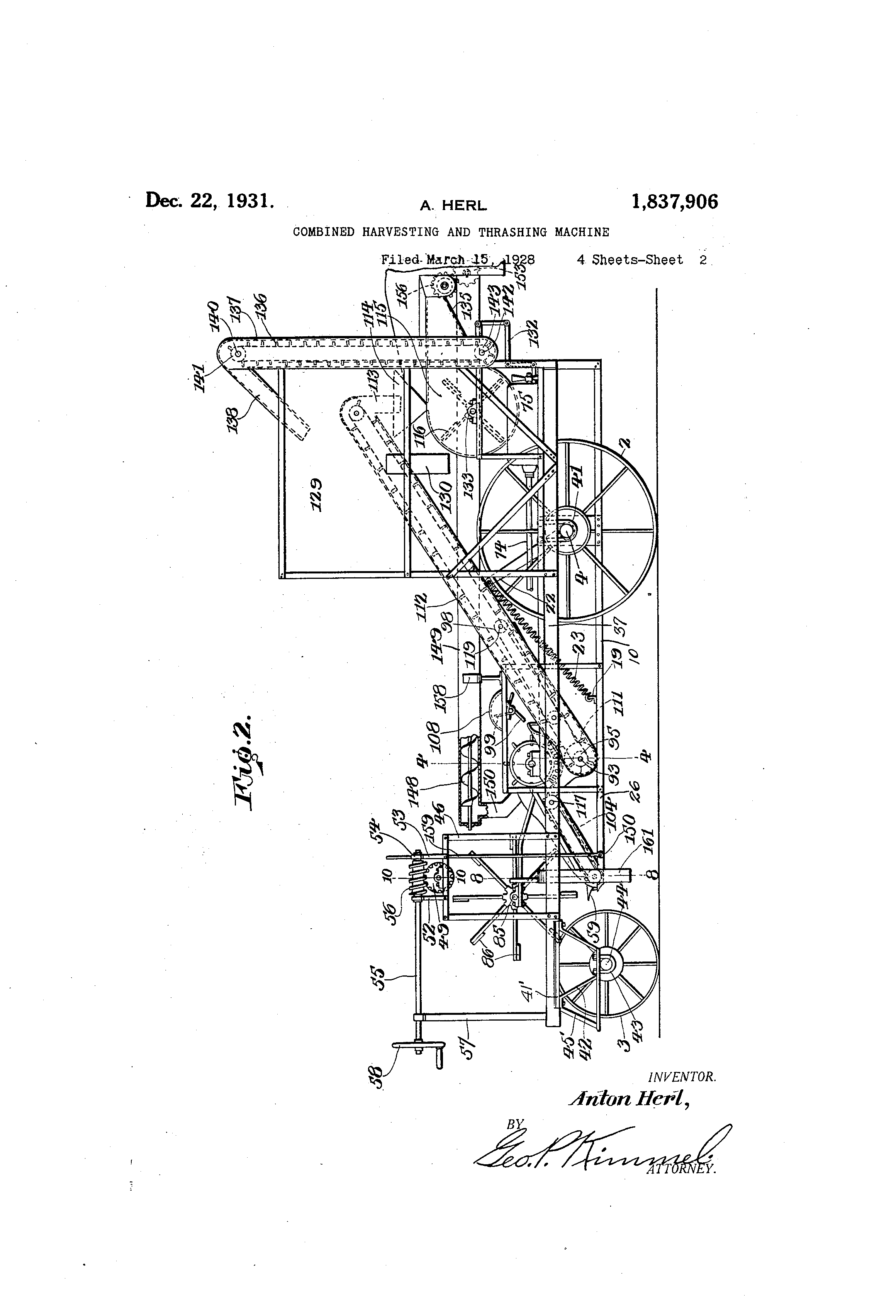 the graiii ,tiid the. latter has a lateral spout 130 for the clischarge of the grain into a wagoii or receptacle. The chlite 112 is arraiiged inwirdl@ of the bin or hopper 129. fpn chiiiiber 115 is provided by -) housii-ig 131 arraiiged above and supported from secti'L,ons 8 a-iid 9 of the frai,.i 5 at the reir @lie I A st,,ib-'Iiz g rlecha--tiislii encl of f a@-lei. i ln 132 is provided for the blower or f al-i clevice I @- T-i d iihich f ti-@ic'u-ioiis 'o stab-@ liz e su,-h d(-, vice iii a iei,el position -,vhe-ti the f r,,tme 5 is tilted in the maniier as herei-paflu-er referred to. The fan sl-iaft -Ls indicated at 133 an-d dr;-vei,i -@"roin the belt 82. The bottom 1 @'4:, of 15 the liousiiig 131 has an incliped part 135 for d'Irec'ciiiothe ('rain to a SP;ral conveyor 136 rra n-ae@l below the lower ciici of the incline,,', part 135 of the bottom 1,9)4. The spiral coiii7eyor is clisposed tr@insversely with ;-espect jo to the hoising 131 ancl is providej -'Lor conveying the to tl-ie lov,-er end of a vertically disl,)osed eiidless coiiveyor 1'6. opei@ating throligli a el-@ut'Le 137 ivhich opeiis at its lower end into the housiiig 131. The c'-,iu'e 26 1,@')7 extends above tiie b,,n cr Lopl)er 129 aiid is proi7ided witli ,I cl.epei,,diro,- spout 138 -w,ii-ch dischar-es i@,ito the b-in or hopper 129. Tho z@ chute 137 supports a -I-ia'Lt 140, provided iv;-tb NV - ,t pul.lev 141, over h;ch trtvels the upper 30 end o-,' the conveyor 1'6. The cliuite 13-i fur"Llhe,. slipports at its lower encl a sh@,:Fl@- 142. provi@led Nvith t drive pi-!ley 143 for the co--Liveyor 136.. The sh-@ft 142 c.-,tends from tiie lower c,@-id of the chute 137 ,tnd carries ,i 3s sprocket gear 144. above tlae i-iicli-ned por'uion 135 of the bottoiii of tlie hc)usin- 131 is a shake,-- device 145. The spi-oci@:e-t nuelir 144 is operatecl by a ch-,Liii (Trive i46 froiii the shaft 1133. Position--d at the upper 40 of the inclined portion 135 of the housiii,y131, as -well as de endino, therebe'l-ow, is a p n spiral cop_veyor 14@ dispos--d trtnsversel.y of I'V il ,tnd it' in the housin(, 131 ancl whi-eli is I)t@ovicled for condtictinu off the ii6n-tlirctsbecl graiii aiicl dischargi-ii,- i-t into ti for@vc-,i-dl.-,T e.Kteneii-,-ig sp-'@ral conveyoi- 148 aii cl wi-iieh -loiiOi.ticts the s,,ime to one of the convevors 1-04 for supplyi-rtg -.t to a thraslier element. The coil@,eyor 148 is r-,ioii.-ited in i,, casing 149 ht,, - 50 IllY its forniard Pi-td provided with a derei-id1--@ig discharge spout 150. See Fi--Llre 2. The conveyor 148 is ol)(,rtted froiii the chti--.q clrive 146. A s,o,),ft 151 is supported froi-.-i the retr end of @he chlite 149, and carries ,t sprocl@et .55 pi.nion 142, ,t sprocke@lu ge,,tr 153 ind -,t bei,-eled go,ir 15J@--. The sprocl@et nion 152 4s drii-er. from tlje chain 146. T@ei beveled ge,,Lr 154 mesh-@s -with a bevel-ed gea- 1-5,,@ provided on the re,,ir end of IL-,he s'ii,,ift of the spiril cotiGo VP-yor 148. The spi@ocl@,et gear -L53 mes@'t@es with a sprocket gear 156 fo,.- med oii one eiid (,f the shaft of the spir,,ii,conv'ey6r 147, -whe.--.bv the la'uter is operated si-.-,iLil.tL)neoiisly -w'lt'h the spiral convey6r 14:8. The shelker device 65 145 i-, operated by a@ belt drive 157, froiii the 4 1)837)906 fan shaft 133. The casiiilr or chute 1,-IX9 is i-iiounted on t support 158. See Fi.gi-ire 2. The frame 6 is tilte,-l by a ver@.-tcally shiftable ,ipertured liftiii- rod 159 @vhi-@h is p-vwith frim-- 6. The roOL 1 59 70 o'ally coiiiiected selec-velilreceivesthe.pins', erriedbythe clisl@ '@O @o provide for the ele@,P-tiii(y or lowering of the i,-od. A g -Liide iiieans -L -'61 is provided -for frame 6. The 'rame 6 co-tistitlites the tr-oek of 'lie 75 iiiach;.i-io a-Tid ti,.e bars 38 '09 proviOLe a later,-I'tv offset or siib-frla-ie for the jilotor, ancl th@it 'Lr,-,me Nvhich supports th-- bin or hopper. The uicli-Tig --,I'Ieails 161, in cor@nec9 'Uio,,i iiith @'-.he s-Lippol--t 2k) te,,,Ids to @aiai-iital,-,i 80 'lie fraiiie 6 in line willi. frii--ae 5. u t, T-ie conveyors or ridclies !04 carry the cut I V,,he,,).,t fron-i the c,,itter clevice;nto'-@-lie tilraslier e-feliients 87 at qn ,in@cle of 300, ivhe,--e it is tfirp.,shec', ct sl:)reid, the f-@ill -w-ldth of lu-he 85 frain2 5. This provides foi- the sepg,,,!atioil of the -L-aill froiii the str,,tiv it least 97' bet-,veei-i the codc,.ive ur,)te,:s. From there the is ea,-ried. over to co@,iveyors or ri,dclles 98, at a spreac[ of approi@@iiiately twenty-seveii go ,,,-,id one-half feet. Whatever grtir is left -wi-11 fall tlii@ouo--,Ii tiic sl,,Its of cop-veyors 98 9-lici ZD sli@te eioiv--.i the portioii 1,03 of t'!,e @-,_.ough 91 a - ipto the bc)'L-,to,-,ii 101 of the The gr iii 1,)assiji- thr6ugli the co--,,cave fql'i. iito botto,-,ii 101 of troti(yli 91. J'he copi,eior 91 Nvill -,oiidt,@et the c,,rain to convelto-f ll'L -,ncl kviiieh 'li-i lu-tirn ivill el-e-vate it incl cl;.ssoi-iie iii 1-iopper II/',x -@lo be Ie@@ecl tll)on by the fan 'Lo cleaii the cht,i from the ioo T"ie conveyor 136 -,vill conduct tl,-ie cleai-ic,,,l g-.,-@aii-i --'@-0 coiive)Tor l@"T '1' d'- 'LIie grai-,i itito bin or hopper 129. It is tbou,,,,,I-it that the iiia@iy advaii'ua(,es of t , ,t ra-@Lehiiie in accorclai-ice iviti-i ti-iis inven'ti-oii 105 ,inO, for the -oi-irpose set caii be reidify Liiiderstood fron-i tiie foreqo-lr.,v cleFcrlptio,,i, .1 tt,.I,:eii i@ coiln6ctioii i,-L r@ t' - accompac@yiiic, clr@71T.Ig , Y,,herein i s s h o i v - . i ' u h e p r e f e r r e c l e i i i s bociiiilell3t of -.lie biit ill is 'uo be iiti- 10 derstood t@l,-,t chailges be 'iiacl which -F,,ill L; v)7itliin'u-he scoi)e of 1-iie ii-iventio-.n -Is Wh,,Lt I clail.1'1 is: - e f o r t h e p u r l ) o s e s e t f o r t h , 1. I-Li a machiii t set of i-otat-,ble cyliliders ar- 115 ranyed in eidiv@se opposed rel,.it-Lon, a-.q ope-ra'Uiny shaft comiron 'uhereto, t, set of eiidless fro--qt co-,iveyors 91-1,aiio'ed forwardl\r Of and extendi-iig a'u an tipN',,arcl i-nel.illation to said cyli-iide