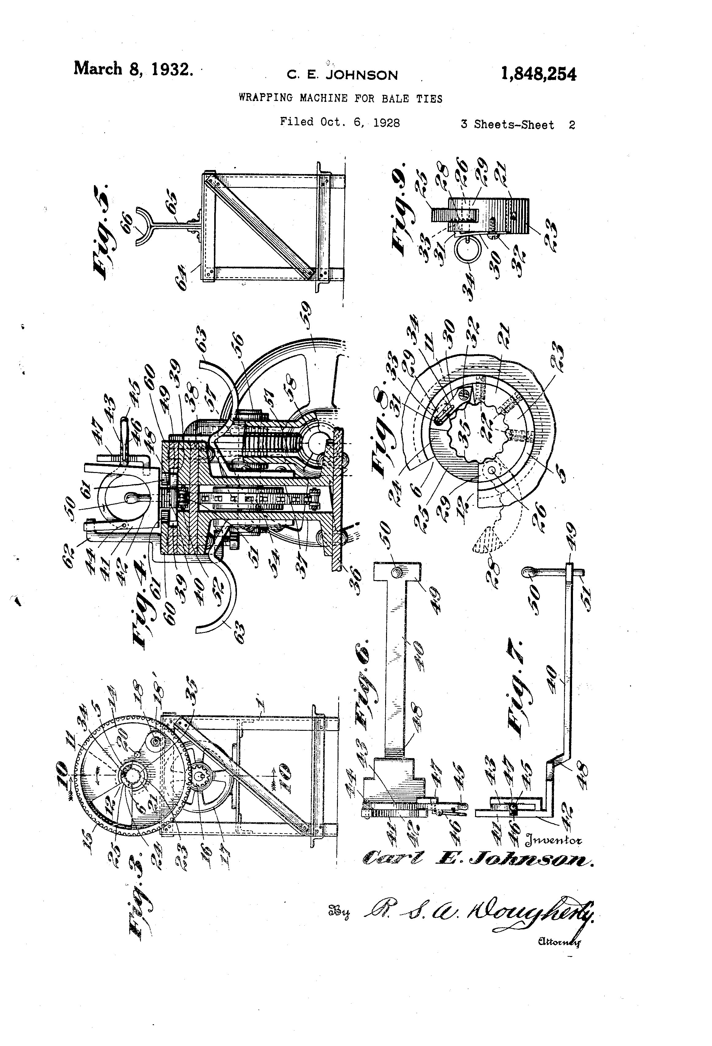 i-atent,@d Mari, 8@@ 1932 UNITED @STATES 'PATENT @@OFFICE CARL R :OHNSON OF SPAWWWS P(INT, NARTLA". A GNOIL TO,BZTW.MNN STEM' 'COMPANY WR&PPING XACHME FOU'RAT @T33M AppHeatlon filed October 0, 1020. - Serial so. $10im; My invention relates to, WI-4ppi . ai - - iuac ines h' aiid. to the' coinmercial packak@ or bundle formed thereby, and is more particula@ly adapted for use in relation to wrapping wire bale ties of w-ell known -iy@6 having an eye or ur apped end of. the bundle -and then win4 it b I spirall-,V aiid continuously. around the bundle until ii reabhes nearly to thia op ite end of, POS the bundle where it@ is -given two or more tight wraps around the bundle and cut off loop foi,n-ied @at one, end while the opposite . and then the end tied securely thereto. eiid of @the tie is lef . t straiglit, althoujfi it is then eciver this opposite end of the bundle with burlap and attach it thereto in the usual@ manner. The bundle is then r6ady for shipment. 6 0 Having thus - aiven a gen6ral descriptio n of mv invention 'I will n order to@make OW the @ame rpore Clear, ref@.r toithe accompanyin three sheets of drawiiigs, in which like c ear@acters of reference indidate like parts: Fig. 1 is a tbp plan view of my improved INTrckPping machine; Fig. 2 is a front elevation irtistrating the position of the bundle at, the b4nning of the, wrapping operation , rflechanism, the figure being, taken. on the '@ine. Fig. 3 is an end elevaiion' of - the wrapping 70 3-3 of Fig. 1 , looking in the direction of the arrows; Fig. 4 is a transverse section drawn oii a 75 lai,ger scale of the de and feed m'echanism for advancinothegb'liiindl e of bale ties while wrapping, ta "@en on the line " of Fig. 1. Fig. 5 is an end elevation of the receivmg trougli standards, the'figure beiilg taken on 80 the line 5-5 of Fig. looking in the diree,tion of the arrows; Fig. 6 is a detail top plan view of the cla;np feed bar drawn on a larger scale; Fig. 7 is a side elevation of the clamp feed 85 bar illustrated in Fig. 6- Fig. 1 8 is a front ejev'ation of the chuck clamp and enouzh of the adjacent parts to show its relative position thereto drawn on a lar,,er.scale; Fig. 9 is a side elevation of the chuck,clam p illustrated in Fig. 8; Fig. 10 is a vertical longitudin al sectional I elevation taken througli@the. center line of the 95 niachine on the line l(@--10 of F-i 3 of I the 9. ,wrapping mechanism and the adiaernt portion of the guide and; feeding. mechaiiism e nd tach it thereto by,@ire in the:usual manner. I. showing the bundle at the 'oeginning:of the 4r>(l t.hen attach one end of@ a spdol of wii-e to t.his wrappiing operation; 100 also adapted for use in wrappi:ng straightened and cut wire lenths or rods and the like. 'The wire bale ties of the above meat-ioned type are formed in a bale tie. machine which is adapted to make the finished,tie and convey it into a receptacle where the ties are received atiid piled in parallel relation to each other 7z with the heads at one end and the straight ends at the opposite end of the pile, this continues tintil two hundred and fifty bale ties liave been form6d. which is the number reqili-red for each bu@dle, the receptacle is then 2i atilt,,L)iiiatic'ally tripped or dumped. Th I is buindle is tlieti inspected and prepared for shipiiient. Heretofore it lias been the practice to tske the biiiidle of IL-ies froni the bale tie formin@_,- maebine, cover'each end of the bundle '-3 liviih burlap or the like protective mateiial ancl securo the same thereto by means of- a piece of -wire wliieh is (riven oiie,or more turns p arouiid the sides of eac@ of the burla ped ends of the bundl@e. As bale ties are of consider-a able length the intermediate portion of the bundle was sin-iilarlv bound togetber at interv,,il,@ by short pijces of wire which were "iven one or more I turns arou@nd the body of t%e biindle to form a ring and the ends twisted ing a --5 together. In handl nd shipping these btindles wbich are of considerable weight, the la],-!zer size@l bale tie bundles weighirig aPpr@-ximatelv one hiindred ponlids, these bindin@z ri-,i,,,s @'ecomic disarran@ed by sliding on 40 tlie- btindle aiid it has always been necessary after sliipiiient or,haiidlin,@ to redress the bundles, thereby entailing cotisiderable additional time and expense. @ My iiii,entio-n obviates this difficulky witliout increasing the cost of wra-pp'mg, - Witli inl,'iinptov@d manner- of wrappinn, the bu@dl@s, I first apply the bui-lap to the @loop end,.g ot. the biin --le -of halp-'ti s a - at@. 1,848,254 Fig. 11 is a vei-tical traiisverse section taken on the line 11-11 of Fig. 10; Fig. 12 illustrates the first operatioii for wrapping the bale tie bun(Iles iii which the burlap has been applied to the loop end oT the bale tie. buiidles aiid attached tli creto by a wire,-which is giveii two ttirns.arotind the bundle and then having their ciids twisted together; 10 @Fig 13 illustrates the second step after the wrapping wire has been secured to tlle end of the btindle shown iii Fi(-,. 12; Fig. 14 illustrates the opposite or strai,(,ht ends of the bitle tie btindle at the end of tli(@ 15 wire wrapping and tyin- operatioii: 1-1 Fig. 15 illusti-ates the final operation after the burlap lias been al)plied aii(.1 s(-,cured to the end of the I)iindle showii in Fi(r. 14. Fig. @ 16 @ illustrates the finislied bale tie 20 bundle; and Fi(r. 17 is a@detail of one of the bale ties (if wliieh the I)iindlezis colii 0,;O,(I. p Referi-incy noiv to the cliar,,icters of refer(y ence on the drawin,_Is, the numeral 1 indi25 cates tiie base frame of built p @trtictura inaterial for the wrappi m, uPOIll whicli is niounted beari 3 and 4. A pipe. 5 is ri,-idlv se bearinc, having a slot formed the bl ck 2, rein throiigl@- 30 otit its lengtli as at 6 Nvhich is preferably of greater widtli at the rear portion of the shaf t to enable the bundle 7 of bale ties to be more easily inserted therethrougli before wrappingThe forward or narrower portion of 35 th