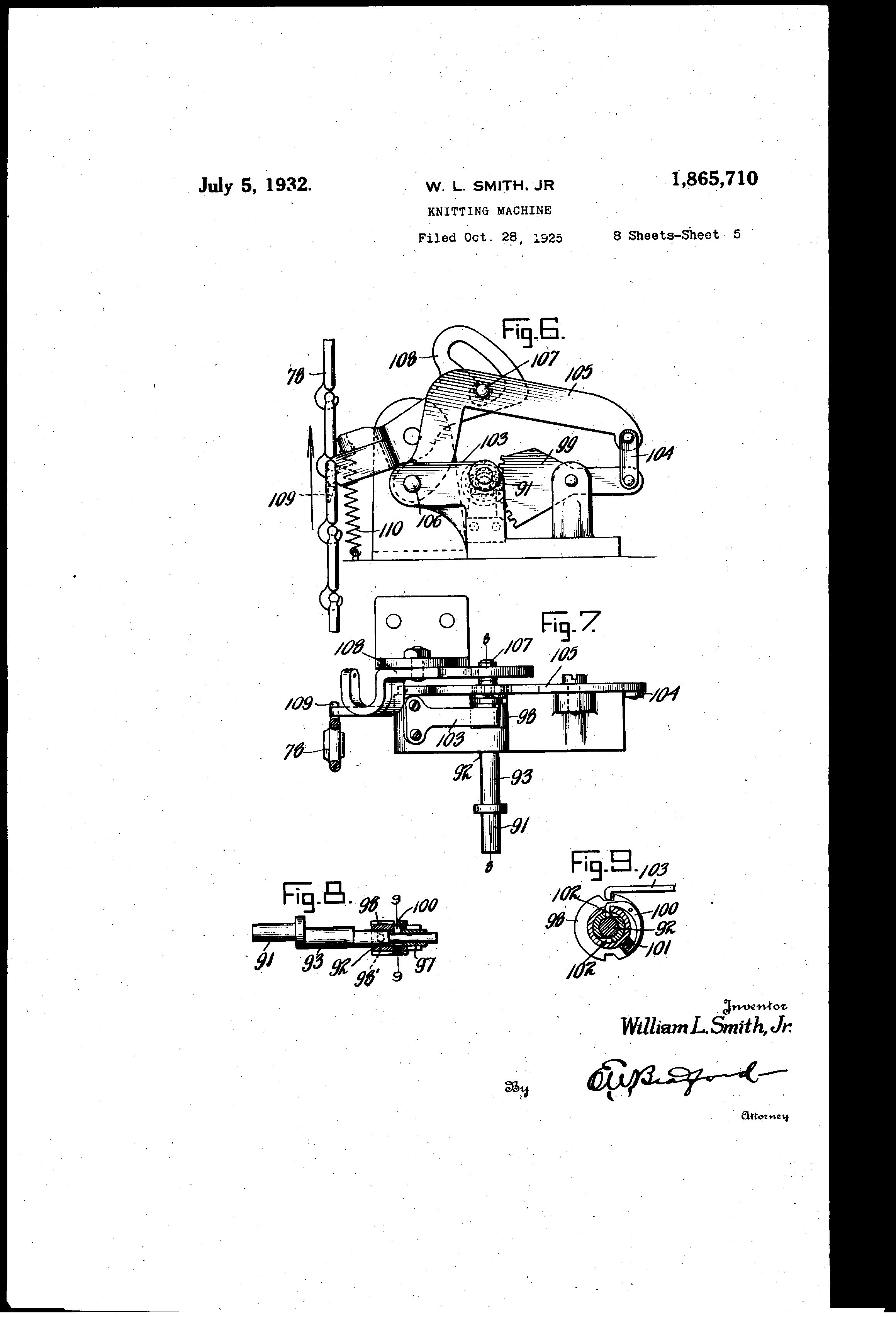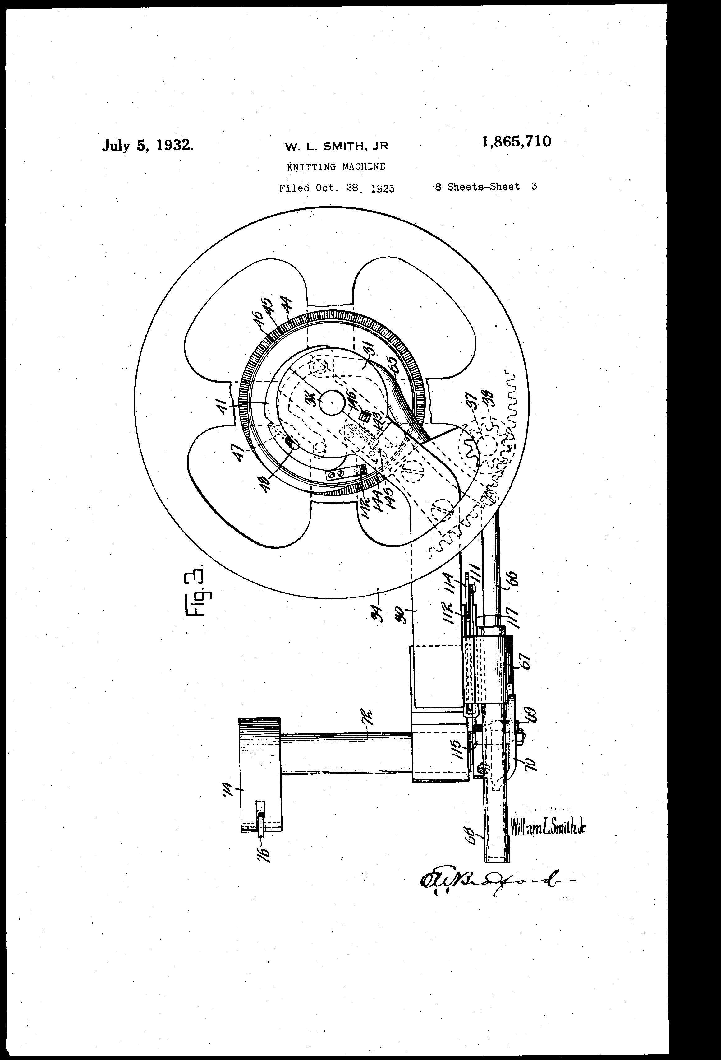 d July 5, 1932, Patente 118659710 ,UNITED STATES PATENT ..OFFICE WILLIAX L. SMITIL JR., OF NASHVILLE, TENNESSEE, ASSIGNOR TO XAT HOSIlagY MIILLS, OF NAS]EIVILLE, TENNESSEE,. A CORI@ORATION OF TENNFSSEE XNITTING XACHINE Application :aled Ootober 28, 1925. Serial go. 65,42(L My' said invention relates to 'a knitting - Figure. 13, a bottom plan of the dial cam inachine and it is an objec,t of the same to provide a circular machine of the type h aving a revolving needle cylinder with - moans r, whereby stockings ca.n be made thereon having ribbed tops with plain. feet provided with heel and toe pockets or pouches in usual manner, the w-liole being@ knitted from toe tb top in oiie continuous piece. It will be uli:. io derstood that the invention is not limited ii@ all respects to a machine having a revolving needle cylinder as some of the parts may be used with machines. having a stationary laeedle cylinde ' r and revolving needle cams. 15. Neither is it limited to the forming of stockings as other fabrics may.be formed thereon. Another object is to provide improved s. cams for operating a series of dial needle Another object is to provide. an n@aproved 20 pattern mechanism for controlling said cams. Another object is to provide an improved take-up for a machine capable of makii6g the fabric described. Referrin- to the accompanying drawings, 25 which are ;t@de a part hereof and on which similar reference characters indicate similar parts, FiLyure 1 is a front elevation of the machin@'of my invention, 3o Figure @, a rear elevation of a part of the machine on an enlarged scale Fi,-ure 3, a plan of the up'per part of the machine 7 Figurd 4, a development of the cams, for :85 -actuating the cylinder needles, Figure 5, an elev'ation of the pattern mechanism viewed from the right in Figure 1 Fig. 5a, a deta-il of certain parts shown iii Fig. 5, but at right angles to said filyurei 40 Figure 6, a similar elevati,on of a @art of .said mochanism on an 4nlarged scale, Figure 7, a plan of parts shown in Figure 6, Fio,ure 8, a section on line 8-8 of Figure 7, 'Fiiure 9, a s6etion on line 9-9 of Figure 8, 45 Figure 10, an.elevationof the take-up of the inachine Figure 11, a fragmentary plan,shoWin-- the take-up rolls, Figure 12i a fragmentiry d pattern etai 60 mechanism controlling the take@uop:' , cap siiowing the petrts in knitting position, Figure 14, a similar view showing the nee. dle projecting cam halfway in, i. e. in tuck position, Figure 15, a similar view showing the parts in the casting-off and Idtch-opening positioln, Figtire 16, a similar view showing @he idle po@,ition of the cam, Figure 17, a detail of a dial cam cap, Figure 18 - , a perspective of th4D upper part of the machine, . Figure 19, a fragmentary perspective showing some of the parts in a different position, and Figure 20, a modified yarn-pusher. Suppo-pting and diiving con?wotiom The general construction of the machine is similar to that of the well-known Banner machine'as shown in the patent to HemphiH, Ng. 933,,44 3, September 7, 1909, said condruetion including a revolving needle cylinder 25 and a stationary sup ort 26 on.which are mounted a @t, 27, carrvi . Lng (,-ams for I& the. cylinder nee(fles 27' (Fig.,4), the pickers of 'which one is indicated at 28, the instep cams 29, and various other parts of the mechanism. A bracket 30 is mounted on the support 26, so said bracket extending over the eyhnder and with an Aperthe dial post 32. bed outside cam ring 25'. 86 s lar gear 34. s secure to the upper end of the dial post by means. of a nift 35 said gear resting on a flaiige 36 of the post which flange rests on the bra@ket 30. As shown in Fig. 3 the web of the gear is cut out to reduce its go we ig 't b )lid if preferred.,. A ht, or ma sha :ff 37 ale d in a bea rm g su ppor 30 and said shaft cE Lr@ries be 39 the teeth (yf which me sh res the teeth of gears 34 ob: an d 33 sin with the mounted to m ported at theend of '41 is preferably 10 2 1,865,710 sleeve 40 said plate having a cam slot in which s fouower 42 (Fig. 18) is movably mounted. The.. plate 41 is here shown as being approximately on a, le,@el with the top of the latch ring 43. The dial 44 is secured to the lower end of the dial post in anv convenient manner. Above the dial is a di@l cam cap 45 shown in detail in Figures 13 to 16 and above this is a plate 10 46, preferably annular, which is substantiallv stationary but may have a slight oscillatorv movement, the extent of which is determinea by means of a set screw 47 engaging the pin 48 on the plate 46 extending upward t' gh .Irou 15 a slot in the plate 41 (Fig. 3). Pref@:,rably' iL lost motion connection is -provided between the plate and the plat-e 41 as this is,found to prevent cramping of the parts on the plate and their connedtions. 20 The cylinder is driven as usual by a gear 49 on a shaft driven -from a belt i-)O through a set of pulleys 51,-52, 5'0, ,-)4 I)eininterposed as usual for caiising tli - gear 49 and the needle cylinder to i,otite ol- oscillate 25 in well-known manner. Ii; invtiaion obviously the dial wiR have i.,!- .1@it,.iilar to those of the cylinder. Dial ea?" and controll-ing there30 toir At its underside the dial cam f@ap is provided with an outer waR or rib 55 (Fi@-. 13) combining in itself guard cams and iieedle retracting cams 57 aiad 58. The knockin35 over point of the nee-dlc retracting portion is at 56. The outer waR of the needle-butt -path is interrupted at one point by a gap closed by a gate 59 which gate is slidable in a. counterclockwise direction in Figure 17 to 40 open the gap and permit the removal of the dial needles 59' (F@ii. 13). A spring 60 serves to return the gate to closed position. The inner wall of the needle butt path is formed by a downward projection 61 of the cam cap which projection is reduced at. one side to pro . vide space for an oscillatorv needle projecting cam 62 pivoted at 63. The oscillation of the cam is brought about by movenient of the dial cam cap about th