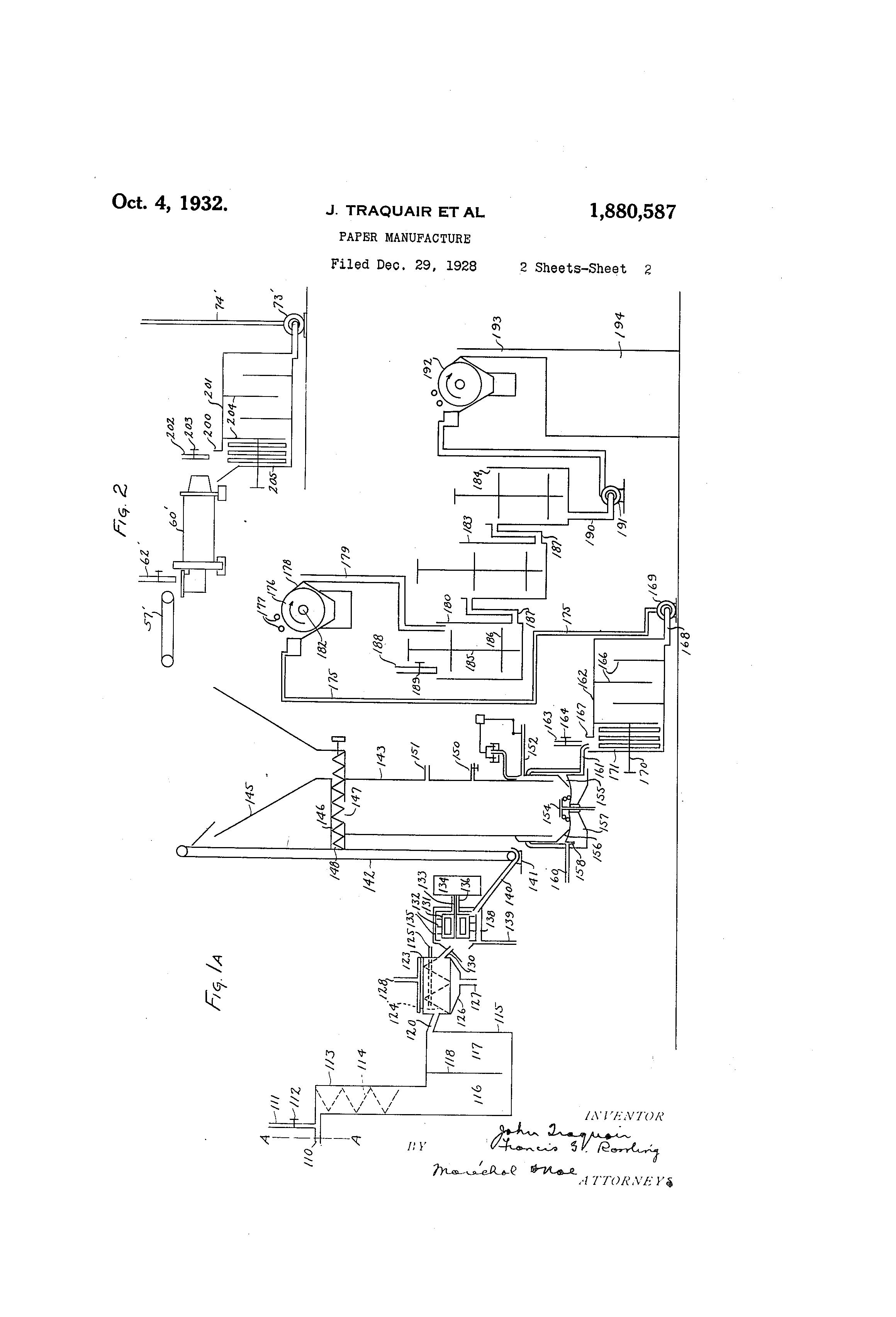 Patented Oct. 4, 1932 I 1 8 S O t S S 7 UNITED STATES PATENT OFFICE TOHN TRAQUAIR AND FRANCIS G. BAWLING, OF CHILLICOTHr,,, OHIO, ASSIGNORS TO THE MR,,AD RESEARCH ENGINEERING COMPANY, OF DAYTON, OHIO, A CORPORATION OF OHIO PAPER XANUFACTURE ,&pplication illed I)ecember 29,1928. Serial No. 329,082. This iiiventioll relates to the n-ianufacture of papei- alid the like from cellulose containing matei,ials, aiid-pai@ticularly to tlle preparation of pulp to be used in such manufacture. 0 - lie of the principal objects of the invention i@ to provide a method of ti-eating fibrous iiiaterials to produce a siiperio,r pulp product whiell iiiay be formed into paper having 10 strength, color and o4lher characteristics superior to the corresl)ondincr characteristics in paper forl-ned from the saine fibrous materials in other generally knoiin ways previously used. 1. Aiiotlier object of the invention is to provide a method o@f ti-eatin(y hard - deciduous wood, sticli for exaii, to procliice a white iple a@chestnut, Iiigh strenc-ytli suitable for the maiiufacture of higli gr,,ide paper, such as printing paper. Aiiother objoct of the invention is to provide such a inethod in -which material economy in the consuiiaption of chemicals is effe,- ted, aild which admits of recovery as by23 I)rodticts of materials dissolved from the librous material, to thereby cut down the 'Waste of the fibrous iiiaterial which has he-retofore been considered una-voidable. Still ar-loiher object of the invention is to 30 prc. vide ,,.pparatus for carrying out the above liac-tllod. Other objects and advantacres of the invention wi'll be apparent from tKe following description, the accompanying drawings and -ipl,e,-ided claiins. 35 , Iii the drawincrs in whicb like characters of reference desigir@,tte lil,-e parts throughout the several views thereofFi(y. I is a diagrammatic side elevational 40 view of a portion of a preferred embodiment of apparatus constructed for carrying eiit the niethod of this invention; - F; (p - la is a dia,-ramn-iatic side elevational -irieiv of another portion of the apparatus, 45 Fi(rs. I and la when placed end to end disclosin- the complete apparatus; and Fic,r. 2 is a diagrami-natic partial side elevational view of a, somewhat modified form of apparatus. 5o The present invention provides a method pulp product of good color and'iiicomplete digestion with cheirlical under of treating fibrous materials 'of various l@inds, such a@ various types of wood, straw, fibrous grasses and the lili:e, to produce, a finished p,ulp product, of exceptionally Iiiah white color and I hio,,h strenath, with marod economy in the consuinption of chemicals, aiid -%vith yields considerably higlier -than those heretofore obtained in the manufacture of wliite pulp Vith the known afid aenerally used pulping processes. The mef@od Go of this invention is especially adapted for the treatment of hard deciduous or non-resinous broad-leafed wood, such as a chestnut, oalk, gum, and the lil@e, to form a superior wliite or bleached pulp product. In ac- c5 cordance witli the method of this invention, tl-ie fibrous material is first subjected to an s@ch conditions of temperature and pressure and of concentration and character of Cheln- 7o ical as to looseii and soften the bonding materi al holding the fibers in their natural associat ed form, without substin a ' affecting the cellulos'e and while m j y L, a ntainino, the stre nrfth of the fibers. In this c@emical 75 trea tment, the cooking or digestion, which is effective to soften the bonding material bold ing the fibers to(rether is purposely so limit ed in its effects that any considerable defi berin or separatino- of the fibrous - mate- 80 9 2n rial into its ultimate fibers does not result, and there is t resultino, Iiigh strength and 3- ield of the tiltimate pr@duct. The partially dige sted material is then subjected to a multista ge and coordinated chlorination treat- 85 men t to complete the pulping or disintegration thereof, the chlorinaiion treatment bein g carried out in such wise as to prevent injur y to the cellulose fibers, maintain the hi,- Ii'strength of the ultimate product and co wur e a good yield. In accordance with this invention, the fibro us iiiiterial after being cooked and before bein g chlorinated is'extracted with an alkalin e liquor, this eitecting a material &onomy 05 in the consumption of the chlorinatino, agent in the subseqtient chlorination tre"atment wit hout deleteriously a:ffe6tino. the cellulose or appreciably diminishiiig'th'e y@-eld. Better results are secured -where the final stage 100 2 of the d . igestion or cooking is carried out at digester @mtil the required 6harge is'introhigh temperatures itnd pressures, as a subsequent extraction with alkaline liquor then results in a stir further diminished consumption of the chlorinating agent in the followi-nc, chlorination treatment. For purposes o-F illustratiiig'a preferred embodiment of the method, the invention is h ' ereinafter -described in connection with the treat10 ment of wood,-and more partic.ularly of hard deciduous wood such as leached c estnut chips from which tannic acid has been extracted. Referring to the drawin,-s, a conventional 15 chip breaker or hog is indicated at 10 which @erves to subdivide the logs or pieces of wood into chips of suitable size, such as a size @uitable for boiler fuel. If a supply of chips is available, such as leached chestnut chips 20 a chip storage may replace the chip breaker' The chips are fed by a, conveyor 11 into a feeding hopper 12 which discharges into a digester indicated at 13. This may be a conve@ntional digester, such as a stationary, I ro25. tary or tiimbling digester, having a feeding opening 14 closed by a removable c(>ver 15 and a conical discharge end 16 provided with a discharge valve 17. A steam supply pipe 18 is provided, which may,be connected as so shown for a stationary digester, or connected thr6ugh the trunnions in a rotating or tumblin