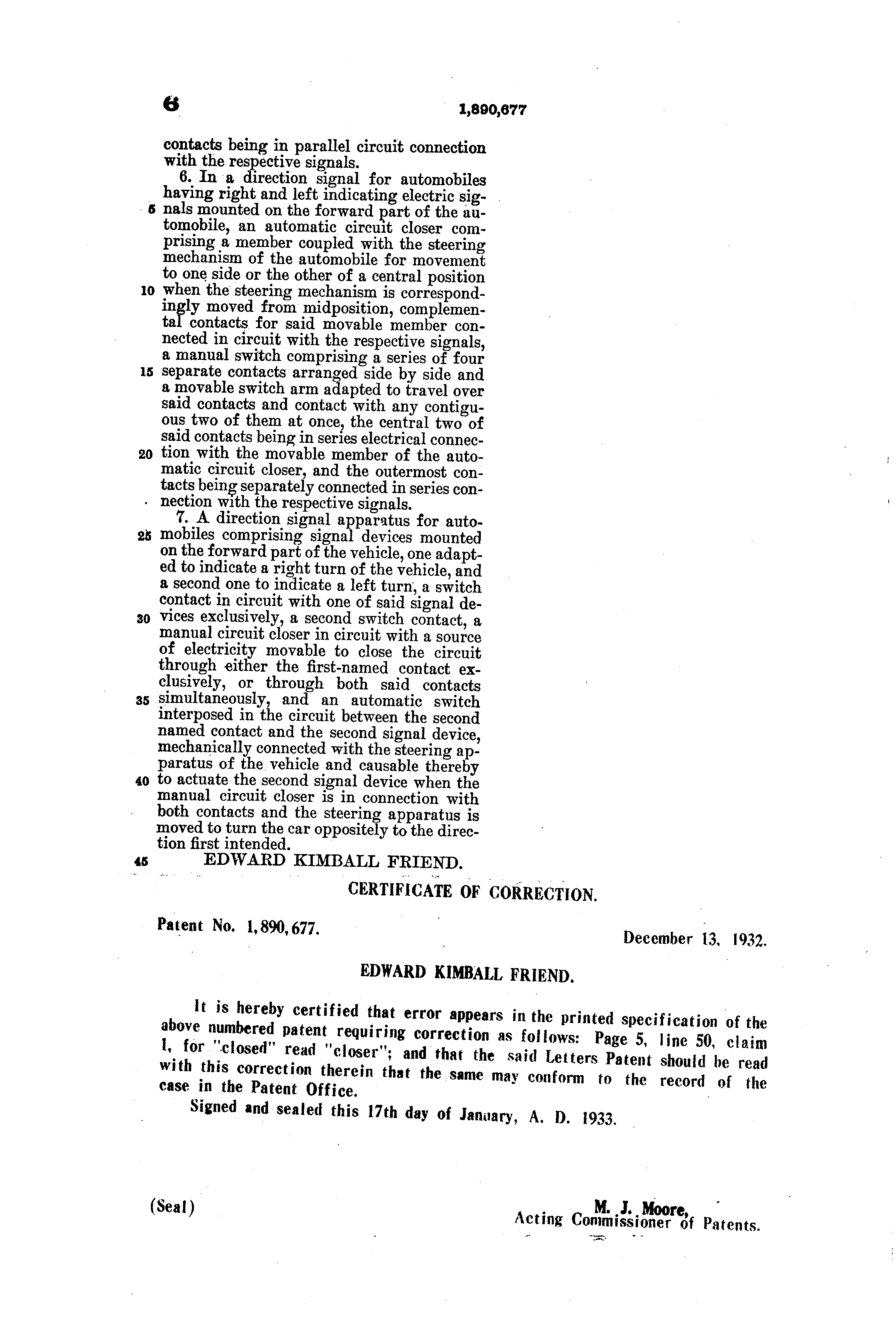 claim: 1. A direction signaling device for automobiles comprising, in combination with right and left ind@icating signals mounted on the forward part of the automobile and mech40 ani m for t urninl, the steering wheels of the automobile to r'@ght and left, an electric switch connected with the steerin- mechanism having m6ans for causing the appropriate signal exclusively to be shown when the 45 steerino, whe6ls are turned to rioht or left respectively, and a manual switek having a contact in se'ries with the before named s,witch, other contacts flanking said contact, each in parallel circuit with one of the sigr)O nals, and a circuit i2losed shiftable to engage tll.e respective contacts independently or either of said flanking contacts and the first named contact simultaneously. 2. A direction siiinalinz device for auto55 mobiles comprising electrically operable signal devices mounted on the forward part of the automobile and arranged to indicate rioht and left turns respectively, a i3teering g@ar, an automatic switch operable by said steer60 . Ing gear and haviiig means for closing exclusively the circuit to one or the other of said signal devices when the steering gear is turned in one direction or the opposite direction, respectively., knd a manua@ly operable 65 switch having a circuit dlosixig element in auto matic switch operable by said steering 75 gear and havin(-y means for closing exclusively the circuit to one or the other of said sigiial devices when the steering gear is turned in one direction or the opposite-direction, respecti vely, and a manual switch having a 80 coiita ct in series with said 'automatic switch and other contacts in separate parallel circuits with the respective si&als, said manu al switch ineluding a controller construct ed and movable to complete the circuit 85 exclu sively through either the automatic switc h or one or the other parallel circuit exelusi vely, or through the automatic switch and one of the parallel circuits sirnultaneously . 90 4. In a direction signaling device for au-. tomo biles, signals for indicating'right and left turns respectively, automatic control mean s adapted to be connected with the steeri@g gear of the automobile to operate said 95 signal s selectively, a manually movable switc h element, a complemental contact arrange d to cooperate with said element independ ently in different positions of the eleinent, electrical connections froi-n said con- 100 tact to the automatic control means, a secoi.id conta ct at one side of tl@e first-named contact in @arallel electrical connection with the rightindicating si-anal exclusively, and a third contact, at th@'opposite side of the first 105 conta ct and in parallel electrical connection with the left-indicatina signal exclusively; the second and third c@ntacts being -also arrange d for cooperation with the manual switc h clemi@nt, whereby placement of said 110 switc h element in differeni posi+,io@lis is effective to cause actuation of the signals by the auto matic controll.er or by the manual switch elem ent independently. ' 115 5. In a direction signaling device for automobil es having oppositely pointing signals in a forward location on the automobile, an auto matic controller operable by the steering wh eel of the automobile and engageable in 120 elec tric circuit with on6 or the other sicrnal wh en moved in one direction or the other from neutral open circuit position, a manual switch liaving a series of contacts and a movable contact aim traversable across said con- 125 tacts and engageable with an intermediate, and one of the otiter contacts at one time, the conta cts being in series electrical connection with the movable member of the automatic controller, and the next adjacent. ones of said 130 1,890,677 contacts being in parallel circuit connection with the respective signals. 6. In a directi6n signal for automobiles having right and left indicating electric sig6 nals mounted on the forward part of the hutomobile, an automatic circuit closer comprising a member coupled with the steering mechanism of the automobile for movement to one side or the other of a central position io when'the steering mechanism is correspondingly moved from midposition, complemental contacts for said movable member connected in circuit with the respective signals, a manual switch comprismg a series of four is separate contacts arranoed side by side and a movable switch arm aaapted to iravel over said contacts and contact with any contiguous two of them at once, the central two of said contacts being in series electrical connec20 tion with the movable member of the automatic circuit closer and the outermost contacts being, separately connected in series connection with the respective signals. 7. A direction signal apparatus for auto26 mobiles comprising signal devices mounted on the forward part of the vehicle, one adapted to indicate a right turn of the vehicle, and a second one to indicate a left turn', a switch contact in circuit with one of said signal de30 vices exclusively, a second switch contact, a manual circuit closer in circuit with a source of electricity movable to close the circuit through -either the first-named contact exclusively, or through both said contacts 3r, simultaneously, and an automatic switch interposed in the circuit between the second named contact and the second signal device, mechanically connected with the steering apparatus of the, vehicle and causable thereby 40 to actuate the second signal device when the manual circuit closer is in connection with both contacts and the steering apparatus is moved to turn the car oppositely to the direction first intended. 46 EDIVARD KIMBALL FRIEND. CERTIFICATE OF CORRECTION. Pat.ent No. 1, 890,677. F,DWARD KIMBALL FRIEND. It is hereby certified that error appears in the printed specification of the above. numbered patent requiring correction as follows: Page 5, line 50, claim 1, for "-closed" read "closer'l; and that the said Lett