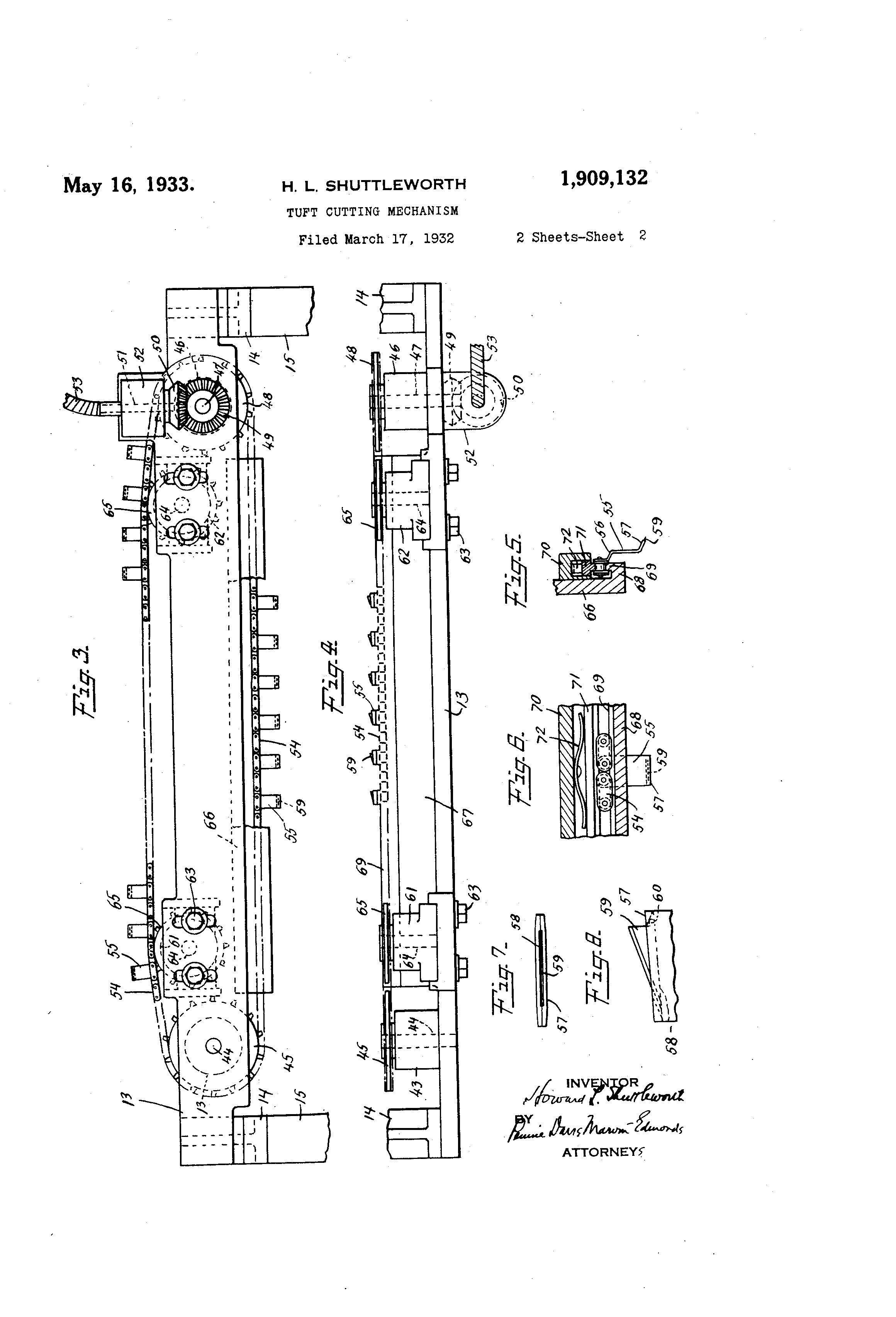 ii ectecl@ to the@ drivir@a means for the loom@, or to a sc@parate dri-%rini riiealns, such: as an e.lec-, triciiiotor. - .Achain,54isledaround,@ I pro eket Ni,heels .4-5 and@ 48 and knife holders 55 are iitouiitf-,d'@oii this chain at suitabip, iilter@vals.@ Eacli l@nife holder has a poi-tion@66 ottset from the.plaite of the eliaiii and ext@@diiiir outwai,d, bevo-n d the, chain a sul)stantial@ distance, the offset 13oi-tion termifiating. iii an end portion 57 Nvhlcli extends at@an angle to tli(,, plaii.e of the ch,-in. :The end poi-tlion hag a slot 58 in its (@dole ,ind in this slot is inounted a,knife blacle 59 of genera,lly trian,-ular @,liape. 'I'he ends of the slot ai!e underciit (@Fig- 8,) and the blade lias a projection 60 extendin- o.utwai-d from its,134se at one end, the prol@(ortions of tl@,e pai-ts beina stich that @the@ Icnife mav be iii-,@erted freely in the slot and then move(I erdwise s6 that the projection 60 li6s under ali 6verhaiigiii(, portion ,it one end of the slot ,i :n n (, i)d the @pointed end of the k ife lies tin(ler ,tn overli,,tngin(y portioii at the oth r end of e the slot. I@ no-rmal operation the movement of the eb.ain. is such@that the knives.tend to 'n be forced bv contact witli the yarns i to the locl,:iiig position; sbown in Fil-. 8 a@nd (..,9,llllot escape from their holden. TO maintain the chain taiit, the bar 13 is prov.ided@ at each end with adjustable bearings 61, 62 attached to @the bar by bolts 63 @viiieh pass@throi-igh slots in the bar. , In each of the, bearing@s 61 and 62 are shafts 64 carrviii idler sprocket wheels 65 which bear .1 9 ao,ainst the ebain and may be adjusted to "@eep it as taut as desired. Since'the 1,-nives d move in a s shoiil traight line dur,,ng the cutting, operation and thus cut the tufts at a, iini 'f orm height, the I)ott4om portion of the chain which carries those knives which take part in the actual cutt,ing operation: is guided so that it:will not sag,, and for this purpose a bar 66 is attached to @the angle portion 67 of I)ar 13, @ t-he bar 66 having a portion 68 -Nvhi ch underl.ies the lower stretch of the chain and terminates in an upstanding flange 69, the upper surface of which is ma4@hined and provides a si-ipport for the chain. Means are provided for maintaini;ig the e-hain in close contact with the su.rf ace@ of fla,nge 69, the means i.neluding a channeled @bar 70 detachably coiinected to bar 66 and lying above the ch,iiii "Iitb the ebannel facing the @chain. In the channel is disposed a vertically movable b,,ir 71 which, bears against@the chain and i.9 forced into contact therewith by leaf springs 72 seciired in the bottom of the channel@ and beariii,- against the upper surface, of bar 71. With@ thi-,@ arrangemeiit, the lower stretch of tlie chain which carries the knives which perf orm the cuttinaction at any instant i s@ stinported on the machined surface of flange 69 ,tnd is h d in contact ith th t surface by el w a tli e bar 71 resiliently forced against the chain, in the operation of the deviQ6, the. arms nt:knife@supc, 15.which ma-@ constitute thtfro ports: of. @a'n ordiiiai-y,-t@ft shearitio,, me n chanism are swung to advance the new cutting mechanism@ toward the yams which @are to be, @ut@. At the san-ie@ time, the back support 31 is advanced @so that its forward@ edge, en-. 70 - ages the varn above,the poiiits where the cutting is to take place. The chain oii which the -kni..fe blades are mo@nt@d always riins in tho sime dir@ction and: with either a contin'u@ oug o@ intermittent movement. As the cut- 7'5 ting,me@hanism a.pproaches the Yarns, the blades in the holders on the lower stretch of the chain eventually -como into contact with land sever th@ yar@ ends. :Since @ the blade holders 57 are inclined at an angle to the pl@,ne@6f i m6vement of @ the chain: and these holders lie@at a stibstantial distaiice beyond and at one side of 'the chain the knives can be brought down@ close to @ the, plane of the fabri@ so thai@ the pile: of the fabric is very short,, the now mechanism permitting, the tufts@tobe@cut uchmorecloselytlianispos-. m sible with the types of cutting mechanism heretofore used. The total weight of the cutting @mechan's I m is much leqs: than that of the @recipro@cating front knife of the shearing type of cutting inechanism :and; the new mechanism ca;n, therefore, be. operated at higher s eeds withp out producing undue,vibration. By reagon of.,the manner in. which-, the etitting blade.,,, are supported,, the pile is cut unif ormly across the fabric regardless of the width ;of, the looi-n, and no; (Tifficulties are encountered due to sagging or,benditig a@ in t-he@ case of the ea ng n.ives. sh ri k Also, the small knife blades 6f' the present@ cutting mpxhanism can be quickly removed and replaced so that thibre is little or no time lost in the operati6n of the loom in@ keeping:the cutting mechanisni in IDS pro@er:condition. , I claim, 1. Iii a, loom for weavino, 1)ile fabrics, the combination of means, for inserting in the, fabric pile varns drawn from a source of sup- 1'10 ply, and means for severing said yarns between the fabric and the, source o@ supply, said severing means comprising an endl(!Ss travelin g member moving continuously in one direction and knives carried thereby, said 115 me.mber and knives lying ati one side of the, gr6up of yarns to be cut, and a, smpport on'the other side' of the group of yarns for holdin@ them while they are being cut@. 2. In a loom, for weaving- pile fabrics, the, 120 combina tion of means for inserting in the fabric pile yarris.drawn fiom @a@source of stipply, a@id n-ieans for severing said variis be@ tween the fabric' and tho- source of supply, 125 said severing means: comprisiiig an endless travelin g member mo ving contintiously in on6- direction aiid, carrying knives, and a niountiiijr for the@ meniber movable t b 0 ring said knives into and. out of opetati-%,e position relative to the yarns to be cut. 4 1,909,132 3. In a loom for wea,ving pil