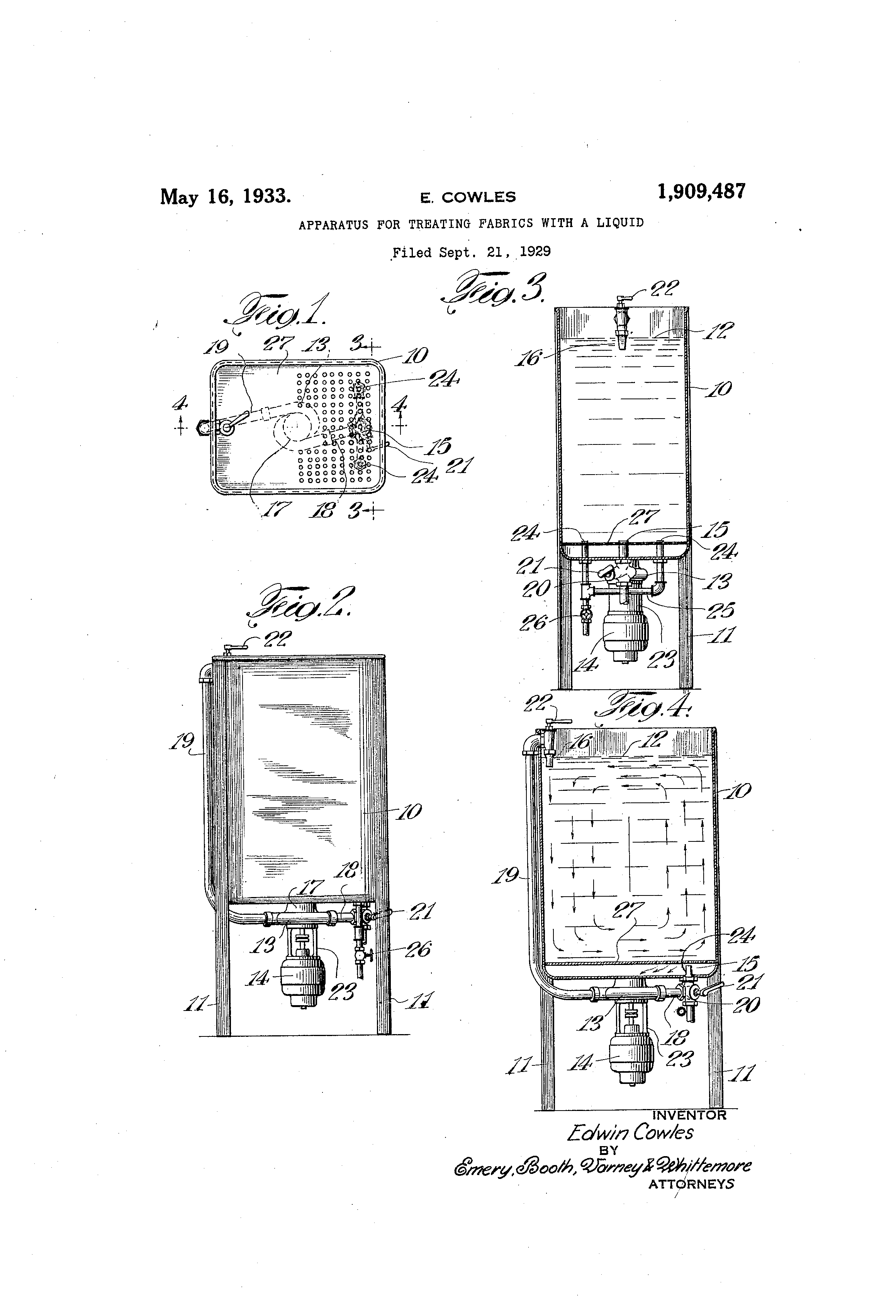 2 1,909,487 ployed. The nozzles ,ire (lisposed below the surf,,tce of the liquicl to mininiize this 'endeiicy but it iiiay beeoliie ob jectionable," iiotwil@hsta--nciiiag. But by "ocatinn- the aozzle -IC) iiear 'the sui-fqce o@r' th;,@ li,),uiOL ind clirectiiig it @, o Nllii ward th-, fp, bri-Is a,. e positively i@orcecl. (i.own7l'Irai-cl as tliei, @-:i-i-ive -@t tiiat locatioii oi-i trave'j- i@,. tt-,e prov,-Li-l-Lng fluicl, c,,irrenlu-. ""he reo,lilpting -,7a'.ve 22 -l'oT,- ttie nozzle 16 pro--I 0 Vides a,@L eduction in il(itat'o,,,. @.idency is ti,siiig 1: ii(rht fliiid lilce, na bthv,. In t.1-iis case p -.nozz',e 15 is ii-ici-eased c6ri-espoi-idiii(yly -@s the Ctovi,nfl-)w jet f roiii Y,,ozzle 3.5 1.6 is i-edi.leecl by the v,-,Ive. Spa,@-,cl ab-,ve the bottoiii o'l the tub there is clisposecl ft p,-i-,',-i-,tteci plate 27 which admits fli,iid L'o the,stimp l@ on the side of the Tl-ie -.",ei-for,,i'Lions qliite iilimerous 20 -Lc, p-covi-,-Ie @i lai-ol-e fj'Loi@;7 arei aiici a correspotid"P,Iyly lo%,/ flow velocity tliicii.-,,Yh f-he plate,. I i I 1",tilizt, he l@)ri,leiple Avl-iieh 1 b-,gve heretofore dei-elop-ld--tb -@ t of prllv, obstruction of tb-e 6iitlet by el.osely a large are,,t 25 oi l@ ,i'let wil@li ,t i,e'iocity the i-)resent doi,i-ce. H,-i-@e tlie, iii.et r-oz7,lc- 15 extends throll,ah the pl,-te, 27 i-P. th,- regi.oii o:@ -bhe oiitlet opepii-,,os in the -rla-,e wli.,--Ie ti-ie sliiiip is le,cated beneath an ii-ni-,erlorate T)ortion of the 1)1,tte. After the washiiig or otber treatiiient of o flibries 1-@ Li s IDeen cojnl,)j.,-ted, 1 it is desired to dro-in the tiib, 'Lhf,, v,,.@Iv,- 20 s i,urred to (,-@)@iiiect @vi.th I-h(,, oiit'@et ol-)eni-ntherei-n and tlie, liouid is ciuiicj@.1i, Yroyi the t-Lib, -i ct vin o@ the T,-,bri.es oii 'L-,he plate 2'@. It will be unclerstood tha'@ the, inv(,.ntion i-,iay be variously modified ivithin the scope of ihe subjoineci clainis. 10 What I elltiln is: 1. A liqiii.d treitipg l'or - fabrics, .in col-iibiD,,ttion, 6, tub, rde,,tps for eirctilatingI.i-qi@,id ancl fabrics i.ii the tub ;.n a closed pt'Lh disposed in verti-cal ing u(,",arclly and. 71@@s oll- o@)pos,.te s,:.des of thc,, tiib respec-'uively n,-! cl.osel-,7 ,I d,i -,t(,ent the I i)or't-lions of the ,,;i(le,s for respecti@,eiv fabric Libr@ic imiiiei-s@i'r.c,y iets, @i@eins for coiitrolliiig tl-ie ef-i,'ects of saicl ijozzles, there, beiiig ot,.tlet port,@,, s-Lii-rotindin@,y s,,tid upwardl.y directed --@iozzle, qiid i,, piiinl) foi- siii)I)Iyiiig si,i(I nozzles inci withclr,,t@,vino- fltiic.1 the tiib. 2. A liqud treati.iig ni,@tchiiie for -fabrics, ineaiis foi- eirei-ilatiiiiii coi-nbination, till),; @7 liqtiicj. ,in(,l faorief, in t closed ,)ath i-,i said CLil), ineltidinui@i@,ardly aiid dowi-iv,,ardly (-Iii.@e,eted jet iiozz.,ej@,, Ctisposed oii opposite s-Lcles 6f the tlib, beneflth the surface of @uhe liquid near the bottorn and top respectively' and ri,ieai)s for withdi-anviijo- liquid from said tub, said means includ;ng oLitlet ports surroundii-ig said iipwardly (Tirected nozzles. 3. A liquid treating inachii-ie f or fabrics, eITect, Y-7hen th6 .,@s -vjhe-@i, s@ticl means inellidcl--Irected noz@ii-i combiiiatioll, a tub having its 16-Tiffest diii,,ei-ision vertical means for eirculatin@,; liquid and fabrics in 'a closed elliptical orbit, includiu.u jet iiozzles on opposite sides of said tiib dirceted i,-i opposi'L-e vertical cli,.-ect;lons, 70 and meaiis for with,,'@.raN-ii-ig liquiet. froi-a said tub nc-ar or@o of said nozzles. 4. A liqiliid treatiiig in,@ichiiie for fgbries, in combina,-,'-On, -,t tub, a f a, se bol tom ior -.-aid tub, meaiis 'Lo cause a eirctilati-ol'i of liquid 4'5 i,ncl fal)ries ii a c'osed patli ii, EA;C'L tub inelluding meaiis 't-o cause a rap'd flow across said false bottom, and rozzles at oiie eclge of tlie, b-ottoin aiid stibs'@ap-'bially - pei@pendielilirtheretoto rodticearapi Ciflowa-",ayfroii SO p said -IL'alse bottoni, and means for - iv--@tfidrawiiio- liqui-d from sa;-d tub beiiea@LI-i s,.,'-Icl false bo'Ltolll. 5. A liquid trettin, m-,tchine foi@ fabrics coiiiprisilig in coilibiiiatioii, a tub providecl ivith two opposite a.-id appro iiiiate'y iertical@ x 3- sides, an ul)@i,,grdll, di-rected nozzle locat-,@-cl at the bottom of sa;.d tub idjacel'it one sl,,Ie for d'rectiiig a stream D@A,ardiv aloii(y tha' Li sicl-,-, a downnvardly d;-rectecl n@zzle loca;ted r-leii- 'L I-le liquicl level adja@el-it the opposite .ide for d '.rec@-ino, a sti-ea,,ii dowr-- ",ardly @.',-oiig that side, outlet o',)eii,.no,s s tiri,ouiiciii:io, one of sa,;'d nozzles, and nioa,-is f or supplyi s d i,,ozzles wil@h fluid tind @,,-ith-,Ira-,viiag d bof said outlet, openings. 6. A liqLiid treatiiig machine 'or fabrics y 1 coinprising iii combii-iat;-on, a tub provided with tiNO o,@.rioste anCL approx4@riately v(,rticall sides, an up-v,,ardl--y di-i@ected nozzle located all ("',-,e bottom of saicl ttib ad'a,-ent one side T-or directin-- a sti-c-aiii Lipwardly iloiig 4@haL side, a downillardly directecl nozzle located near the liq-Liid level tcljacent the opposit-- side for directino, a -,treain dowiiward'y along tiia4.side, iileans I-or supplying sa;-d nozzles with fluid and -vvithdrawiiig fl,.tid by w,- , of sald y outlet openings, and. i-ieaps for co.,itroll'_,ng the relative eitects of said nozzles. 7. A liquid treating i-nachiiie for -@labries, ill combinat;@on, a ttil,),, a plate sp,-ced fro.-ii one ivill of saicl tub, said Dlate being provided Nvith fliiid ou'Llet oj,-eiiings jiicans inel-Lidirig a iiozzle for dii-ec@.ing jets o'@- liquid @l-ie sides f the L-,,@b to aloiiu and paral'el to 0 cause a ral)id flo,@v of li(iti-Ld -,c-,,oss sa@Lcl pig@te, means to cause a jet of liquicl to flow a-wt,r frorn saicl plate in' the i@egioii of sa,@d ou4LIe@, openings, and aii otitflow opeiiing in ,,a-Id tub behind said plate. In 'Lestiiiiony whereof, 'L have signed illy name to this specificati.on ,-his Ilth dty 0-f September, 1920. EDWIN COIVLES.