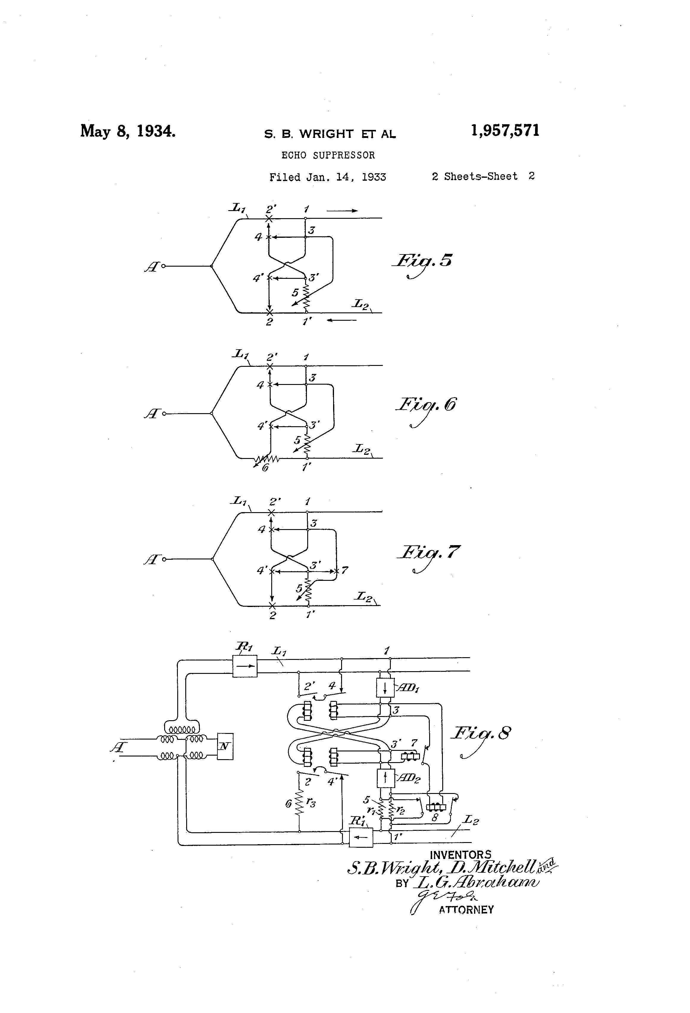 claimed is: 70 1. In a two-inay tel---ohone ei,@--uit incii-id-ing paths adap@.-ed for tran-siti:issioli in opposite d;reetions, apparatus,elatively n,-ar each er@d of 'Uhe circuit- comdrising meqi3s .e,-ponsive @@-o voice waves in the incomin.@ path for disabling the 75 outgoing path, means responsive to voice -%xiaves in the outgoing path for disabling the incoming pat-li, means respons4.Ve to voice waves in the outgoitig path for preventing the disabling of said path by later arriving voice @17aves in the incoming path and means responsive to voice waves 80 in the incoming path for preveiiting the disabling of said patli and for restoring the same to opeyative condition if it be already disabled, the method of transiiiission control vihich consists in causing waves in the transmitting path of 85 g--reater than a predetermined ma.-nitude to prevent the or-,eration of said last m,,nticned means by echoes fron, intermediate poinl- in the circuit and at the same time allowing said means to be operated by incoming speech v,,aves pro- 90 vided they are o-f @lifficient magnitude. 2. in a two-vvay telephone circuit includinrr paths adapted for 'Llransmission in oppos-ite directions, apparatus relabi.vely near each end of the circuit comprising means responsive to voice 95 waves in the incoming path for disabling the outgoii-ig path, ir-eans responsive to voice waves in t-l-ie outgoing path for disabliiig the incoming path, means responsive to voice waves in the outgoiiig path for preventing the disabling of said 10( path by later arriving voice -@iaves in the incomi,,ig path and means responsive to voir-,e waves in the incoming path for preventing the disaLIil-ig of said path and for restoring the same to operative condition if it be already disabled, the idethod of transi-nission coi-itrol which consists in eff ectively preventing the operation o'L said last mentioned mea.,,is by echoes of the tral'ism-itted -peech returning from intermediate points of the c-ircuit by catising transmitted speech waves of gi--@eater thaii o, predetermined 4m,,Ignitude to insert suitable amounts of loss in the it-iput circuit of said lasb me.Dluioned means @ind keeping sa-ld loss in said circul@t for a sufficient time to preveiit operation of said means by echo from the most distant intermediate echo path. 3. In a tv,7o-ivo-y telephone circuit including paths adn-pted for transmission in opposite directions, apparatus relatively near each end of --,20 the circuit compr-ising means respoilsive to voice waves in the ii-ico-rning path -for d-l@,zabling the outgoiri.- path, iieans i:esponsive to voice waves in the outgoii-ig path for disablin.- the incomir@g path, - imeans responsive to voice waves in '_25 ILhe out.-o-ing path foi, pi-e,,!-,.nting the disabling cf said path by later arriviiig vo-';ce waves in the incoming path aiid meails respo.,isive to voice waves in the '---,-icoming pa'ch for pr,,venting the disabling of said path and for restoring the same @ 2,0 to opei:ative coiidition i-f it be already disabled, the method of tr,-nsr-yiission control which consists in effectively preventi@-ig the operation of said last mentioned -means by echoes of the transmitted speech returnin- froiil intermediate 1.35 points of the circuit by c,,tiL,3ing transmitted sp,,ech v@aves of greater th,,in predetermined ir,.agnil@ude to insert, suit@@ble amounts of loss in ficienu time to prevent operatior- of said means ard keelli--,,.g @gid lo@-s in said c@rcuit for a suf- 140 fice-,-l'tl time to P-@event operation of said means by echo froro- the inost dist,@lit intermediate echo pe.,th, and causing said loss to be removed im--,,-ediat,,Iy by ony i,@icoming speech ,vgves of sufficient magnitude to operate said last mentioned 145 i-neans. 4. In a two-way telephoiie circuit including paths adapted for transniission in odposite directions, al)paratus at or relatively near each end of t',Iie circuit comprising re-,eivin.- echo sup- 150 r,5 1,957,57i pressor meai-is responsive to voice waves in the receiving path for disabling the transmitting path, transmit-'@-ing echo suppressor means responsive to voice viaves -in the transmittiiig path for disabling the rece@.ving path, receiving disabler mears i:espo,-asive 'Lo voice vve@ves in the receivin.- ua@uh f o,,-@ disabli,--ig the transmitting echo suppressor, trq--osr.-litt-ing d4sabler means responsive to vo4ce @vaves 1-ii 'Lhe trai-isr-iiluting path for disabling the i.-eceiving echo suppressor provided the latter -is not already operated, a-iad meaiis responsive to waves of greater thar,. a prede'ue.-cinined magiitude i--,i the transm4ltLing path adap'ued to adjust the se-Tisitivity of sai-d receiv15 ii-i- disabler means. In a t,,77o-v@,ay 4.elephone c-ircuit including -oaths ada-oted for t,.,ansmission in opposite directio-.-is, appai-atus al@- or .,e-atively near each end of the ci@:cuit comprisivig receiv'@ng echo sup20 pressor meai-is resdoi?sive to voice @,vaves in @@he receiving path foi, disabling the "ransmitting 4- path, t,.@ansmi-@4 -ing echo suppressor means responsive to voice waves in the transna-'-Ittiiig path for di-Sabling th,, receivirig p,@Lth, receiving dis25 abler -negns resuonsive '@-o voice wa.,,,es in the receiving pabh disabli,--g the transmitting echo suppressor, tra-@as---ii,.tin@ disable,., mears respgii-s've to voice waves i lie transnitting path for dis-iblii,ig the iece-iving echo supp@--essor p,.,ovided 30 the latter is no'Ll already olie@@oted, i---ans resporisive to voice waves of g,- ,,cater than a predetermined i-agn-ii'lude in thL, traiisiiiitting path adapted to effective'@y @,edupe the sensiti-Vity of sal 'd receivi@ng echo suppressor and rec@-iviiag dis15 abler -means to the entent that they ;Aill @-iot re spond to echoes in the r,,ceiv;-(ig line of @oice waves in the transm-14@tiiig line, and means responsive to voice woves in the receiving Iiiie of substantially greater magnitude than the echoes 40 to im--aiedia'uely ,:estai-e the sens-it