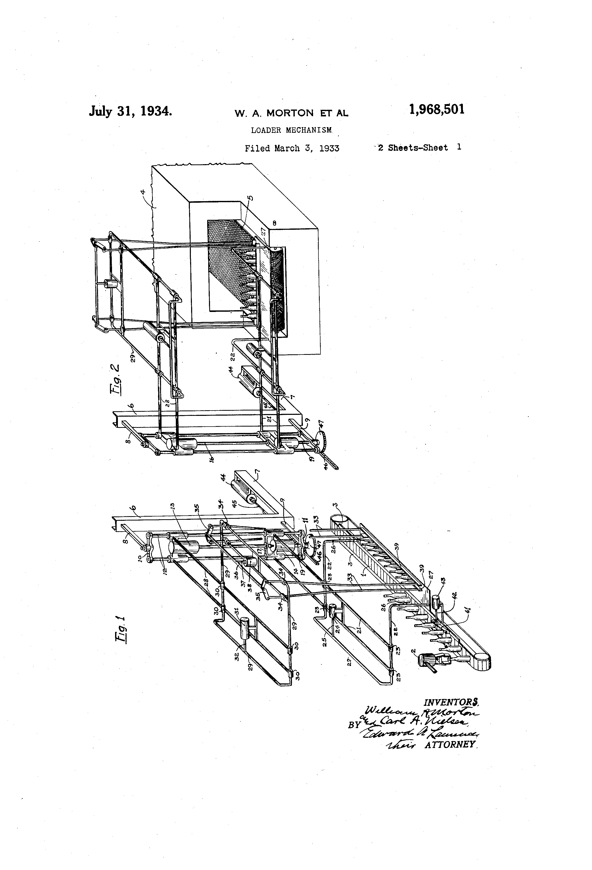 4 11968,50.1 ranging them on a lehr conveyer, it @is obvious that it may be employ6d for the transfer of other types of ware or articles from one conveyer toanother. We claim 1. In loader inechanism for removing articles from oiie coiiveyer and arranging said articles on a second conveyer which is disposed in angular relation to the first-nx , iiied conveyer, the combination of a shelf arranged for swinging m6ven2ent about a vertical axis between the conveyers, holder-m. eans associa6ed @rith the shelf and arrariged f or movement in unison with the shelf and also independently of the shelf, and means for -f5 selectiv6ly inoving the shelf and the holder-, means whereby the shelf is leveled in -parallelism with the first co-,iveyer, the holder-means engages articles on the first conveyer and shifts them onto the shelf, the shelf alid the holder-means are 7@0 brwight adjacent to the second coilveyer, the articles are removed froin the shelf and arranged on the second conveyer and the @helf and the holder means are returned to the first conveyer to repeat the steps. , 2 2. In loader mechanism for removing articles from one conveyer aiid arranging said articles on a secoiid conveyer which is disposed in angular relation to the first-named conveyer, the combination of a shelf arranged for swinging move'36.: mort about a vertical axis between the conveyers,- holder-means associated with the shelf and arranged for- moveme@nt in unisoil Nvi-th the shelf and . also independently of the shelf I and means for seledtively moving the shelf, and the holder35 ' means whereby the shelf is leveled in parallelism with the first conveyer, the holdermeans engages articles on the first i@onveiyer and shifts them onto the shelf, the shelf and the holder-means are brought in position above the second conveyi@r, 401:. the shelf is retracted from beneath the articles while they are sustained laterally by the holdermeans whereby the articles are deposited on the second conveyer, the holdermeans is disengaged from the deposited articles and the shelf and 45' the holder-meaiis are returned to the first conveyer to repeat the steps. 3. In loader mechanisin for removing articles from on . e conveyer and arranging said articles on a second conv.,yer which is dispoged in an5o'gular relation to th'e first named conveyer, the combination@ of a shelf arranged foi swinging movement about a vertical axis bet*een the conveyers, holder-means associated with the shelf and arranged for movement in unison with the 55 shelf and also independently of the shelf and means for selectively rqoving the shelf anh the holder-means whereby the shelf is leveled in parallelism with the first conveyer, the holdermeans engages . articles on the first conveyer and do.:- shifts them onto the shelf, the shelf I and the holder-means are brought in position above and dispo8ed . at substantially right an@les to the axis of the second conveyer, the shelf is retracted from beneath the atticles while they are sustained laterally by the holder-means whereby the articles aTe depbsited on the second conveyer, the holdermeans is disengaged from the deposited articles and the shelf and the holder-means are returned to the first conveyer to repeat the steps. 4. In loader mechanism for removing articles from one conveyer and arranging said articles on a second conveyer, the combination of a shelf arranged for both vertical and horizontal movement betvveen the conveyers, hol der-means@associated with the shelf and arrblnged for movement in unison with the shelf and also independently of the shelfi and operative means arranged for selectively moving the shelf and the holder-means horizontally and vertically whereby the, shelf is leveled in parallelism with the first conveyer, 80 the holder-means engages articles on the fixst conveyer and shifts them onto the shelf, the shelf and holder-meam, are brought adjacent to the: second conveyer, the articles are removed from the shelf and arranged on the second con- 85 veyer and the shelf and holder-means are -returned to the first conveyer to repeat the steps;- 5. In loader mechanism for removing articles from one conveyer and arranging said articles on a second conveyer, the combination of a shelf g(l arranged- for both vertical and horizontal movement between the conveyers, holder-means associated with the shelf and arranged for movement in unison with the shelf and also independently of the shelf, and operative means arranged 95 for selectively moving the shelf and the holdermeans horizontally and vertically whereby the shelf is leveled in parallelism with the first conveyer, the holder-means engages articles on the first conveyer and shifts therri onto the shelf, IOU the sheli and holder-means are brought in position above the second conveyer, the shelf is retracted from beneath the articles @vhile they are sustained laterally by the holder-means whereby the articles are deposited on the second con- 105 veyer, the holder-means is disengaged from the deposited articles and the shelf and the holder means are returned to the first conveyer to rePeat the steps. 16. Iii loader mechanism for removing articles 110 from o-Tie conveyer and arranging said a-rticles on a second conveyer, the combination of a shelf arranged for both vertical and horizontal movement between the conveyers, holder-means associated with the shelf and arranged for move- 115 ment in unison with the shelf and also independently of the shelf, and operative means arranged for selectively moving the shelf and the holderineans horizontally and vertically N@7hereby the shelf is leveled in parallelism with the 1-irst con- 120 veyer, the holder-means engages articles ol-i the first conveyer and shifts them onto the shell@, the shelf and holder-means are brought iTi position above and disposed at substantially right angles to the second conveyer, the shelf is retracted 'Lrom 125 beneath the articles while they, are sustained laterally by the holder-means whe