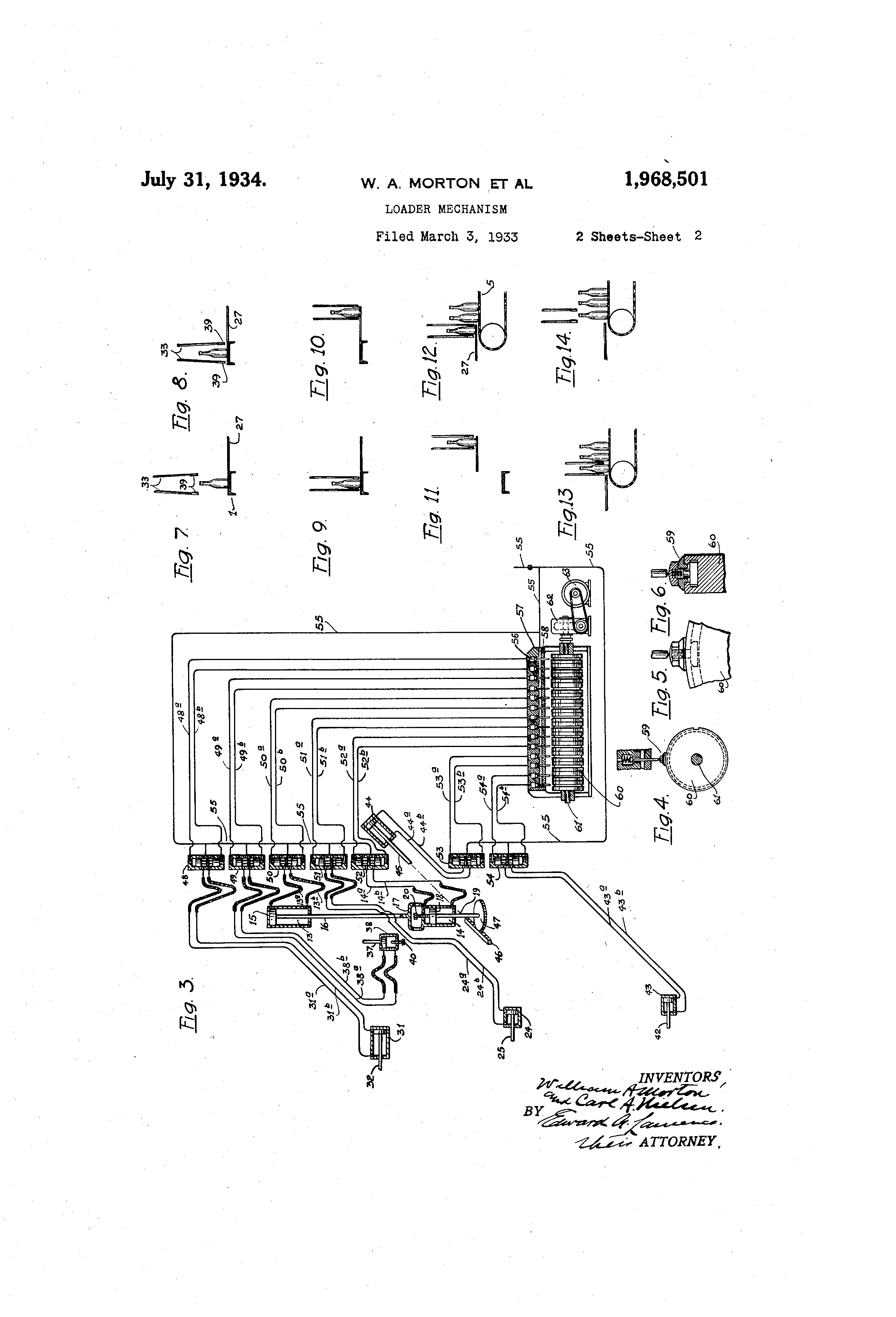 Patented July 31, 1934 1 1 9 6 8 1 5 0 , 1 UNITED STA.TES PATENT OFFICE .1,968,501 LOADER MECHANISM William A. @Morton and Carl A. Nielseli,@ Pittsurgh b p P&, assignors t4 Ameo, ]Incorporated, Pittsburgh, Pa., a corl)oration of Pennsylvania Application March 3, 1933 Serial No. 5 24 20 Claims. (CL 198--31): More p I articularly our invention is des . igned as a lehr loader@for glassware and the like. in designing an efficient @lehr loader certain@ problems are, to be r4et. Tlius the buck or conveyer which transports the ware from@ the fab i r cating machines to the lehr is adjusted to. the proper height to suit @the take,-out of the particular fabricating machine or %to suit the set-up of the machi,ne for the fabrication of a given type or length of the bottles or other glassware. Therefore the loader must be adjustable to enable it@ to transfer w e from ar bucks set at different elevations to the transport conveyer of the annealing lehr. ,157 Again, in modem pra,etice the operative speeds of the fabricating machines have been materially increased and therefore the bottles or otiler ware are @delivered@ by the buck at. greater speed and @20 v7oi,k more rapidly,,and :with gr4@ater accurac:y to:properly perform its function. @@Moreover owiiig to the inereas d speed@of ree moval from the buck, it is necessary to support the: ware agains I t toppling while the ware is being removed frorn the buck and ELlso while it is bei-hg transferred to and arranged on the lehr conveyer. .!Again, @frequently the @ware as ree ived from e the buck is only partially set or@hardened and t]@er,efore must @ n I t be pinched b 0 y t4e loader -30 mechanism, nor should it be moved in contact with extended supporting@ surfaces during the loading, f)peration. Otherwise the ware is likely to be deformed or marred. These proble?ns are fully solved by, ou r im,85, provqdi loader mechanism. ,characteristic feature of our improved loader mechanism is a movable shelf which -s disposed in juxtapozition with the delivery portion of the buck to receive a seledted number of articles 40 there@irom and@is L'hen moved into discharge relaL,ioii with the lehr conveyer for the deposit of the articles on the lehr conveker. We provide a liolder for transferring thi@ ware from the buck to the@ shelf, fbr supporting the ware from top45 pling, and also for assistii-ig in depositing the the@ shelf ' arrangement on 7@@,re frorn m proper the lehr conveyei. the preferred form of 'the h.older is a,, pair of parallel holder b@rs. The shelf i@ airranged foi both vertical and 50 horizbntal movement as is likewise the holder, provision being made for m6vement of the@ shelf and holder both in unison and independently of ea,ch other.,, Other novel features of constructioni and al@Q of arrangement of parts, wil I appear from the following descripti,on. In the accompanying drawings, wherein we have illustrated a practical embodiment of the principles of our invention@ Fig. 1 is an isometric 60 projection showing@the loader@'m receiving relation to the:buck. Fig. 2 is a like view showing the loader moved from its position in F.ig. 1 into discharge relation to thle lehr conveyer. Fig.3isadiagramm aticviewshowingt hetimer cams, valves and@ air cylinders, and their c6nneetions. F@g4.4 is an, enlarged de.tail partially in section &howing one of the timer cams and a poppet 70,valve arranged to Ve o@erated thereby. . FIg. 5 is a still further enlarged detail showing the adjustable cam structure. a plane at xight angles to that Of Fig. 5. 75, @Flg. 7 is a diagrammatic view illus,trating the relation of the@shelf, the holder and the buck bef ore@ the holder is@ depressed to the ware on the buck. Fig.@ 8 is a similar view illustrating the holder 80@@ depressect. Fig. 9 illustrates the holder closed about the ware on the buck. Fig@ 10 illustrates@ the holder moved horizontal@ ly to transfer the ware from the buck to:the shelf.. 85@ Fig. 11 il,lustrates the holder and the shelf with the ware elevated above the buck. Fig. 12 illustrates the holder, the shelf and the ware on the shelf moved over above the receiving end of the lehr conveyer. 90@ FIR. 13 illustrates the shelf moved honzontally away fr the conveyer to permit the ware preC'M v@ously on the, shelf to be deposited in a row on the egnveyer. Flg. 14 illustrates the holder elevated above gr, the deposited ware preliminary to swinging the loader back into the position as iuustrated in Fig. 7. Referring to the drawings, I represents a buck or conveyer which delivers the ware from the loo fabricating, machine or macliines, the ware be'With.:reduced @intervals, so that the loader m ust . Mg. 6 is a sectional view of the same taken in ing illustrated as bottles. The take-,out of a f - ating niachine is illustrated at 2 as deposabric iting a bottle on the buck 1. Thd belt, of the buck is assumed to be traveling from left to right 105 in Fig. l@ 3 represents the stationary side rails for the buck level with its top surfac I e. A represents the lehr provided with a conveyer 5:which is shown as of the wiremesh,type. The transverse 110 ware to be, annealed is. arranged in 2 1,968,501 rows on the lehr conveyer in accordance with the usual practice, The moving parl@-s of the loader are carried on a fixed support v@hich may be conveniently of rectangul,,ir forrn and comptising a vertical column 6 and a horizontal base portion 7 extending rearwardly. 8 and 9 represent upper and lower horizontal brackets extending forwardly from the col=n 6 and provided at their 10 outer ends with collars in which are journaled the upper and lower gudp,,eons of the main frarlie of the loader which comprises the upper crosshead 10, lower cross-h.- ad 11 and vertical connecting rods 12. lr-qe frame is thus arranged to 15 swing on a vertical axis which is coincident with the center lin.- of the frame. 13 and 14 represent, respectively, upper and, lower double-acting cylinders which are provided with sleeve-guides which are slidably 20 moun
