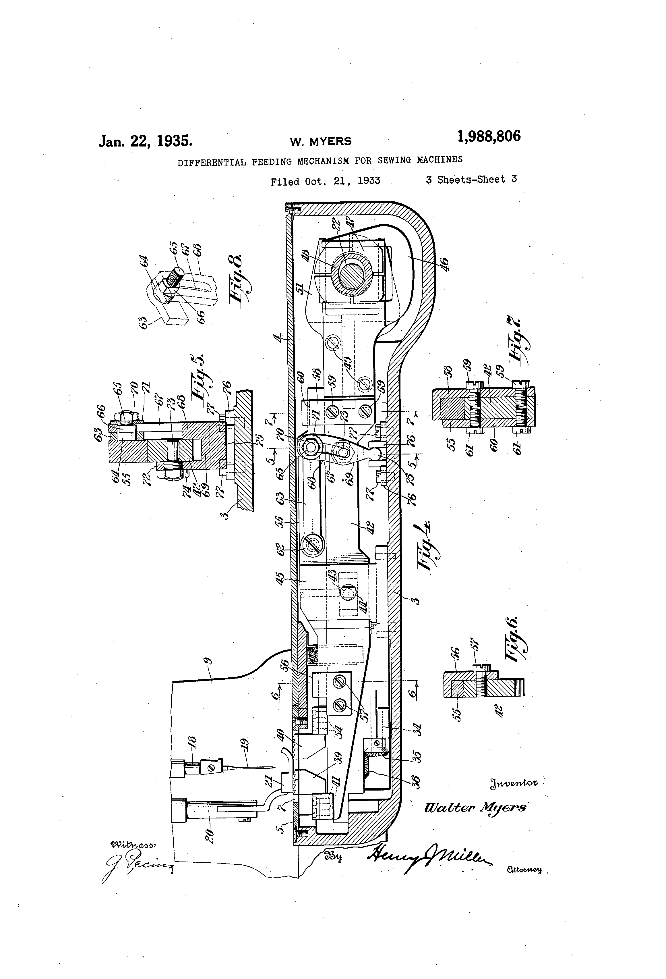 Patented Jan. 22, 1939 U@N@ITED STA@,-TES PAT@E'NT@'@ OFF.@1-- @C@E 1,988,806 D]IFFERENTIAL @F.EEDIING:MCHANISM @FO R SEW]ING P4ACMNES T7y7-llter Myei-s, Br@'d-epert, C-onn., assignor to'The Siiigerl. @manufa@t@-ring Company, Elizabet h@ -J., @& cori)oration@ of New' Jersey Application,@.October 21, 1933, Serial, No. 694,530 ]LS CWrns; - (cl. 112L.-2-@09), Th@'@s@ inveiitioi@ relates@,@ 'Llo, improvements- @iii. v@ ork@advan@eing or @fe&ding Lmechanisi-na@ for sewiv,,,@@r-,iachi-yies@a.nd@has for.:its@object:to provide-A lple and drrrlpoet differ-ential feeding. mecll-@ 9,rjism@ w- Iiieh is @.Particularly adai)ted;,:for em--@ riodiment in a seiving iii@ich@ine-..work-arm @for ,,,@,dvaiicir.g. the woxk.lengthwise of said.@arm_:.@.. '@Vith...tl,,e@.i.boT7e,@:@@nd other obj@,,cts- in.vi@-w,. as@ will hereii-iafter appe@- @-, the inventio-Ti., comprises io the- devices, -c ombti,,iatio@-@is'. and arra,-igements, of patts hei-e-ii-iafter set forth arid illustrated- iii the@ ar,co-Tnpanying dr,-win,as: of a praferried. embodime-qt of t,,Iae- invention, . from,..,which the, severaj. f cattires of the invention and.:the@ advantages at'@,qLTied,@'herebywilibe@readily@understoodbythose sk',Iled -irl- t-he art, @lig@ I i@,,, ,, Lrbnt@ elevation, partly in @ section, of a feed-,jff-arn-i sewing machine embodying@ the@ i-nventior. Fig.. 2 is n. top plan view of the ma@. 20 chine witli the head at the@ free end of the bracketarm broken. away. Fig. 3 is a top plan view of -the wo7zk-arin, -with the cover-plate-and,throat-plate: ,- emo@,,4,ed. Fig. 4 represents :a vertical section len,,)@thwise and substantially. centrally -of 2-i the s-e-will@ @iiachine .-work@arml- and sliowing. in, side elevation a portion@@@. of the . bracket-a-im s-@,andard a@,id portions of the needle-carrying -bar: a-id presser-device., Fig. 5 i:epresert@s.an.enlarged transverse section -of the. feed@- bars substantially @@i) rn the line. I.-5@ of Fig@ 4. , F-ig' @6 r&presents ari e.nlargc-d trans-verse section -of tha f ea-d-bars, sub@, stan@Llially on the, line- 6@-6 Gf Fig.@ 4. Fig. :7 rep i,esents an :erl-arged troiisverse- section. of @ the feed-bars subsu,"nti-,i.11@ c@n- the line 7-7 of Fig@, 4. l@-,ig., @' -,is n,. re--specbive view, of tlie- stud@bolt cr,l--inecti-on between'the rock-lever upon@the.-.inain@ feed7bar: @,,.id the@ @lirk actuated thereby.. Tia@, present. differential feeding mechanism is hei:ei,@-,i desc2ibed and- ilIListrated in the acdom4 panyi-ng draviiilgs as embodied i?-i a feed--off -arm ,,@e7@,,ing inaciiiiie which is w-ore fully disclosed in :ny priorU. S. pa-tent q@DPiicatiOn SerTial No. 6-@,17,409, filed Au.-.. 4, 1932. Reference may bel ii2,n,de to said prior patent application for an understandi,.ip., of details of constructio@i of the, sew,r,@ Lyi-ach-'iae not herein disclosed, but it iS tG be tiiid@.rsi.-ood 'uhot the present invention is not limit,ed in all its aspee'Ls to said specific sewi-ng raachine. The @-ewing machina 4,llust--.-ated in the drawings has a fraiLie comprisin.- a bed includin.- a forwarl,ly extending ar@-n I carrying a laterally,extending hollow arm 2 which,: in turn, caxries a i@earwardly e,%tending tubular4 and substantiaey vtraight work-arm 3. ; The @arms 1, 2 @and 3 are prf-- ferably , cast.:ir@tegr,.al aird@ are disposed sub-, stantiq -lly 'horizoiatally,'@coplanar or: at: the @@same@ level, forming: a - u -bed., The tubqlar@ wo-rk-arm 3 is opeii a@tits top: and:preferably. the entiro leigth tlaereof, said worl,@@arm bieing clo8ed 5. by a, detachobla cover-plate,4, a removable throat@ plate 51 and a pair- of :Pivotally. @secured@:auxiliary@ coverplate,@,,@ 6 disposed at: opposite sides of @ the, throat @p.'tate@ The@throat@platehosaplurality.,of feed@lots@ @7 ar-ld in the @present@:case: a pair @of i 10 - ieedl6-@apertvxos B. Rising fr6m.-thei-frame.,@bed,l a,@ the rea@ward portion of the arm @l,.'Ls the@stand-@ ard 9 ot@ a hollow'bracket-arm 10 which. terini.- nate.I 7@ i-ii .a head:, 11 'overhanging @the@ free end @of the @v6rk @sul)porting, arm 3.: - Rotatably jo-drraled in the; b-racket-arm,lo:@.is a ho 4Z r@ oiata@lly:d-isposed@ i-naii-i sh,@ft 12 extendiilg: outsid e of th,-@ biacket-ar-,ii at the right hand side tlie.,co f, the prbie-,tin@@;end of said shaft carryii-ig a clip@I)elt pulley@ 13'and a driving-belt pul-@ 20. ley 14@ with its. asso,,,iated -balarce-wheel.: I Ati i-@s opposite end, -the mai--q shif t@ carries @a crank-. disk 1,6'opero@tively connected iii any, usual @or suitable manner, as by mea@i.-is of a li@-1k: 17,t w-ith . a vertilally i-,@ecip@.@ocatory@ . needle-bar@ 18-.;: The 2r) iicedle-bar. is j , ournaled' f or@ eiid@v;se @eciprocation s it in u' able: bearings provide@-I @ii-i the@ bracket@-arm, head 11; aiid in the present instance: carries:-at, it@s 'LovTer bn'd @ a p@,,ir@: of i-Lieedies 19@.' @ Also @.jouriiL,,Ied -for@ vertical riovement'in the head;ll@@is 30, the@ tistial pre8ser@bar 20- carryiiig at its lower end q presser-foot 21. Di@@posedi Wi-tilin @@and extei@,-Iirlg; ler@th@vise.'bf tb-e laterailk e@ctb7lding -hollo-vi@ a@rm2@ of th6-frame: act-aating sl-iaft 22 adjace-Ti@t: o-ne 35@ eiid i-n- a, beavi,,-ig 23, iii said ar.-D_ 2'. The @shaft 22: enterq@ -nd exL-,e,--ids abross; the; for"@ -,AT,@rd eiid 6f@..'Ghei-,@io.11@-aTn-i-.@3'i-.q'a direction sub@' stantia'IY- iiovrnal to@ the length bf the v,,ork-@'axm, said ".@haft 22 being ibarral6,d. ih a- bearing 24@pro.@i 40 ,7idp-d i,,i: the aide@@wall of- tlie:@work-:arm@'remote om the carrier-arm 2. @ Thi@ end of@ the shaft 22, opp-.site to the work-arrq@ @end. t,.iereof.:6xtenids 6-C 7do'of the arr-ri@2: ana, car-rie@ a, clilibLlt.pulley' ,_t.S4 25 Of the@ saine size as the main, shaft pulle3@@ 13-, thei 451 w t o ptilleys - beitig cop-nected @ b3@ a clip belt 26@' Enclosing the belt. 26 alid the pulleys conn6eted, t'_qereby, i@ a belt@@tiard, @97@ disposed@ external-lyof the nachiiie frame and@ @detachably.,@ securecd tt-iereto P-ny. sui-tabl-e.'manner, I aid@,belt@gu@,trd. 5