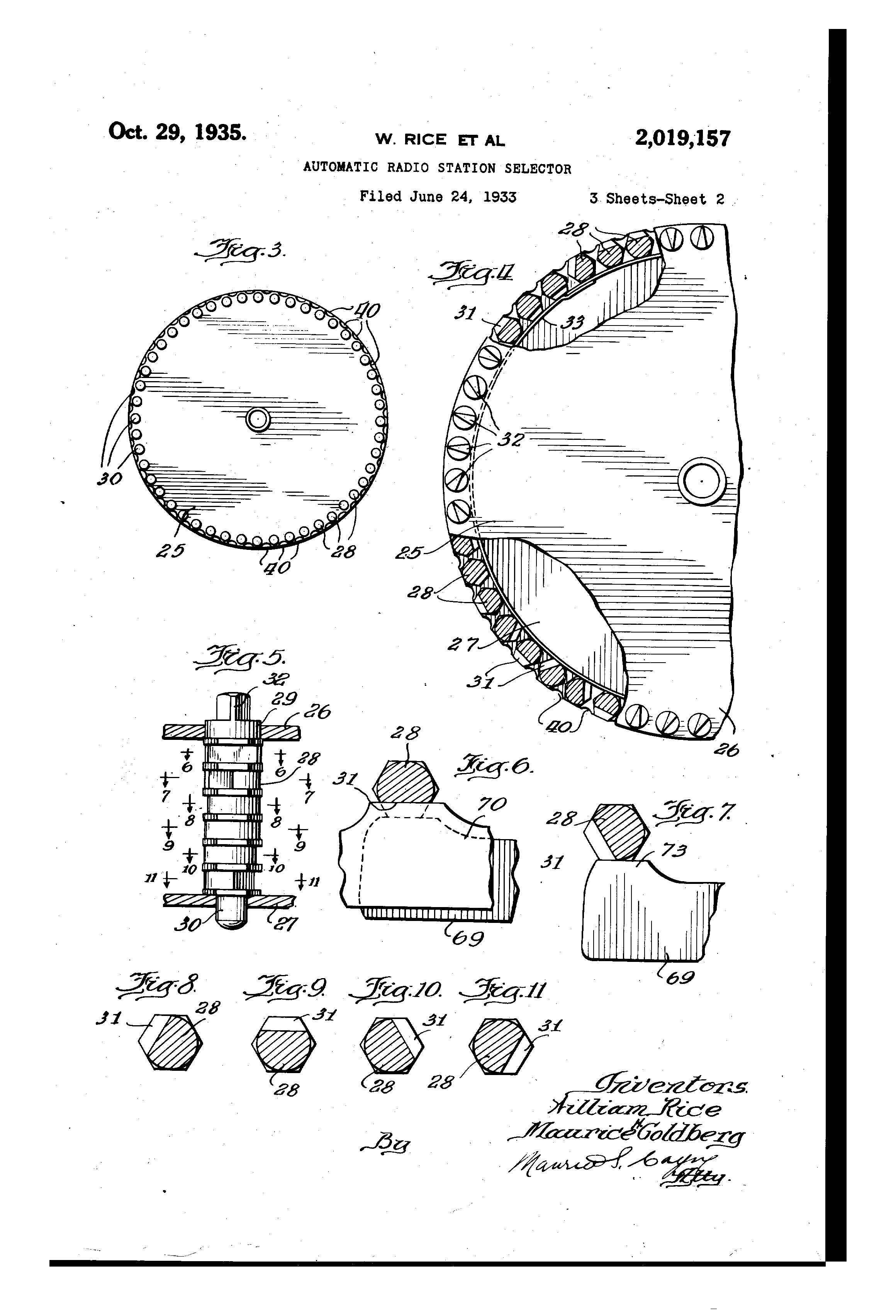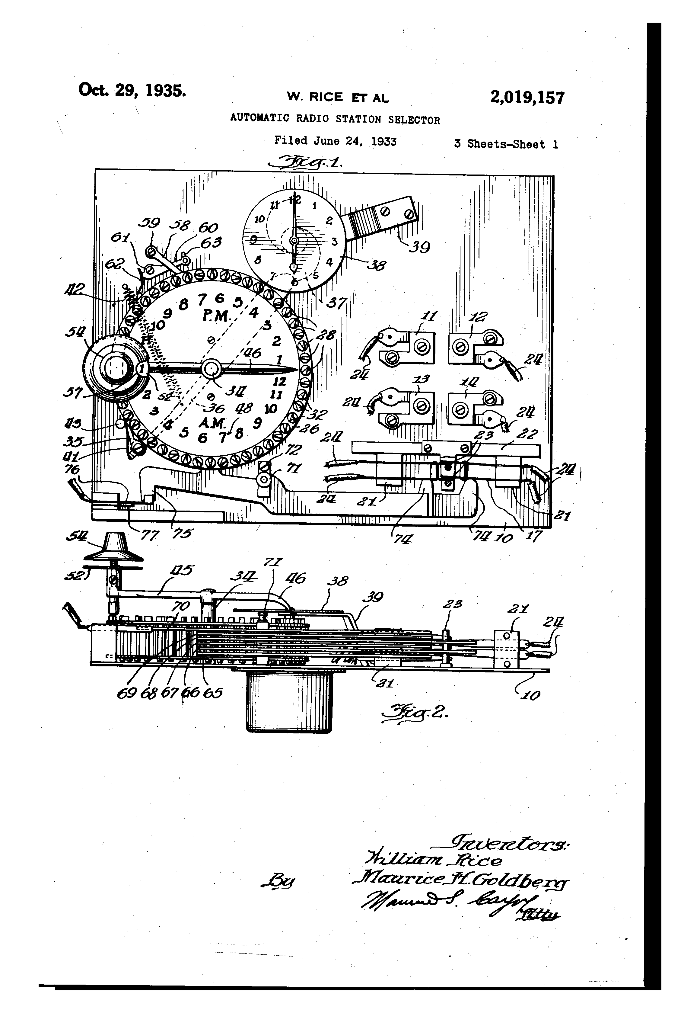 Letters Patent Is: 1. In a device for automatically conditioning a radio receiving set to receive radio waves from selected broadcasting stations, aWd receiving set havihg a plurality of semi-:ftxed tuning elements, switching mechanism to which slaid tuning elements are seleetably responsive a rotatable se lector drum having a plurality of equally spaced circumferentially disposed selector elements for selectably actuating said switching mechaniszn, means for lntermlttently rotaung add drum to bring each select,@r element to a stationm7 POsition at the same point and to retain &Ud drum in sWd stationary position for a predetermined Interval, means provided on each of said selertor elements Including a pluraty of cam surfaces 5 for co-operation with the actuating means for said s*itch mechanism whereby said selector elements may be set to bring about the desired op@eration of a predetermined part of said switching mechanism to bring in a predetermined broad- 10 casting station. 2. In combination with a radio receiving set having a plumlity of semi-fixed tuning elements switching mechanism to which said tilnin elements are selectably responsive, means for se- I r) lectably actuating said switching mechanism to successively select different impulses to be received, said las", mentioned means including an intermlttently rotating drum upon the periphery of which are provided a plurality of equally spaced selector elements each of said selector elements being provided with a plurality of cam surfaces arrglnged on the periphery thereof in offset relation to each other, each of said cam surfaces being arranged for co-operation with sead switching mecbanism to bring In a predeterrained broadcasting station, means for rototing Wd drum to bring each selector element to a stationary positlon and to retain the same In said posluon for a predeterniined tixne interval, and means for actuating each of said selector elements to bring the.desired cam surfaces thereof Into operative position with relation to the switching mechanism. 3. In combination with a radio receiving set, a plurality of tuning elements provided therefor, simple switching mechanism to which said tuning elements are responsive, means actuati.ng sWd switching mechanism, said last mentioned means including a rotatable drum, time controlled 40 means for intermittently rotating said drum, selector elements circumferentially disposed upon the periphery of said drum, said seleetpr elements being mounted for rotary movement relative to said drum, each of said selector elements being 45 provided with a plurality of cam surfaces armnged In offset rel.atiqn to each other, and means for actuating said selector elements to bring the desired esin surface thereon Into operative position, whereby said selector elements may be set 50 to bring about the desired operatiop. of a prei@a Imn to determlned part of said switching mc n bring in a predetermined broadcasting station. VVILLIAM RICE. 65 3UURICE H. GOLDBERG.