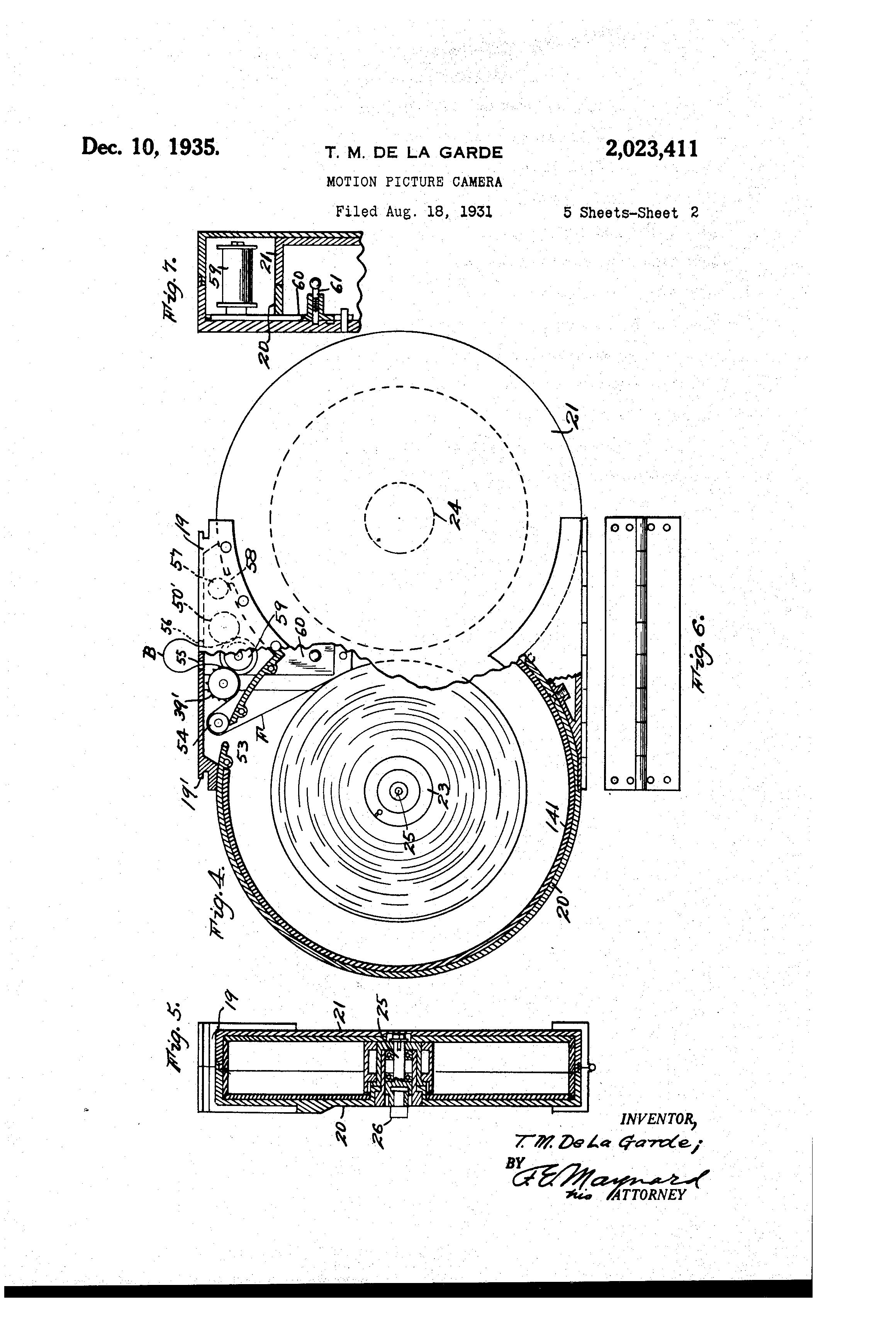 Patentect I)ec. 10, 1935 21023,411 UNITED STATES PATENT OFFICE 2,023,411 MOTION PICTURE CAMERA Theodor M De La Garde, Los Angeles, CaHf., assignor @f three-fourths to Thomas L. Tally, Beverly Hills, Cabf. Application August 18, 1931, Serial No. 557,810 2 Claims. (Cl. 88-18.4) This invention relates to cameras and especially to motion picture cameras of the type having a detachable magazine for a roil of film wliich is windable from one reel to another. 5 The invention has for, its object the provision of a camera involving numerous material improvements giving the camera (which term we mean to include an entire unit with tripod features, mount and photographing apparatus, and 10 actions) many valuable capacities and superior advantages in several particuiars over previous motion picture cameras. The invention consists in certain advancements in this art as set forth in the ensuing dis15 closure and having, with the above, additional objects and advantages, and whose constructions, combination and details of means, and the manner or operation wiII be made manifest in the description of the herewith illustrative embodi20 ment; it being understood that modifications, variations and adaptations may be resorted to within the scope, principle and spirit of the invention as i' is more directly clailned hereinaf ter. 25 Mgure I is a front elevation of the camera. Figure 2 is a left-hand side elevation. Figure 3 is a rear view. Figure 4 is a sectional i@levation of the cover side of the magazine. Figure 5 is a transverse vertical section of the magazine on a 30 reel axis. Figure.-6,is, a bottom plan of the maga,zine back and cover,hin .,ge plate. Figure 7 is a sectional detail roll6k in the magazine dome. Figure 8 is a front elevation of the gear ca,sing and mechanism therein, and a part of 35 the camera housing and related parts. Figtire 9 is a detail of clutch means between magazine sprocket and transrnission parts. Figure 10 is detail of clutch parts between transmission and ma'gazine reel spindle. Figure 11 is a trans40 verse section on line I 1-1 I of Fig. 8. ngure 12 is a vertical, longitudinal section of the camera head or box and shows film movement shell, and a focusing device in the box. Figure 13 is a perspective of the pull-down pres45 sure gate. ngure 14 is a cross-section of the cameri box on line 14-14 of Fig. 12. Figure 15 is a horizontal, transverse section of a portion of the camera box, and shows the improved lens mount. Mgure 16 is a detail sec50 tion of a part of the mount device. Figure 17 Is a front elevation of a fragment of the lens mount. Mgure 18 is an elevation of the movement means for feeding the fllm past the aperture; parts being in section. Mgure 19 is a plan 05 of movement parts. Flgure 20 is a cross-section of the movement. Mgure 21 is a detail of drive clutch between the movement and the transmission gearing. The apparatus includes a turntable 2 with a rigid pillar 3 standing on one side of its top and 5 providing a journ.al, 4 in which is turnable a substantial trunnion 5 having @a nutring 6 on its outer end. The other end of the trunriion Is fixed on the back of a circular housing part herein called the casing 7 which encloses transniission 10 means later described. This casing has V-shaped segmental beads 8-9, Fig. 11, at its lower part, the bead 9 resting in a fixed way IO and the bead 8 being engaged by a segment I I clamped down by screw means 12 passing to the front of the 15 pillar 3. The trunnion 5 is on a cover plate 13i Fig. 11, of the gear casing 7 and this Is secured at top flanges 14-15 to a box 16 forming the camera compartment of the housing one side of which IS 20 closed by a side door 17 having a bottom lip 18 to close over a dome 19 of a sectional magazine 20-21. The dome has side flanges 19' adapted to slide into channels 2 provided erefor in the bottom of the box 16 where this overhangs 25 the side of the gear case 7. Thus, the magazine can be easily attached or removed from the box while the cover 17 is open. When closed and locked, the cover firmly secures the attached magazine in place. 30 The magazine sections 20-21 are hinged on a longitixdinal axis at the bottom and open from top to bottom on a medial plane longitudinally of the magazine. The section 20 constitutes the main or body piece and contains certain oper-.35 ative devices for a roll of film to be exposed in the camera. Referring to Fig. 4 it will be seen that the magazine is in the form of two segmen,ts which meet on a vertical chordal line so as to form a common film chamber with reels 23-24 40 on parallel centers which are spaced apart a distance a little more than the sum of the radii of two equal rolls of fllm F passing from reel to reel. Hence, by this construction a magazine, with twinned compartments, of rninimum over-all 45 length is obtained. The reels 23-24 have center spindles 25 with clutch drums 26 exposed at the back (20) of the magazine so as to instantiy mesh with mutual drive studs 27, Fig. 10, which project from 50 the near face of the gear casing 7. These s ds have spring keys 28 to mesh in the drums 26 and form a part of an automatic action device whereby either reel 23-24 can be operated at will, without attention, as take-ups. 55