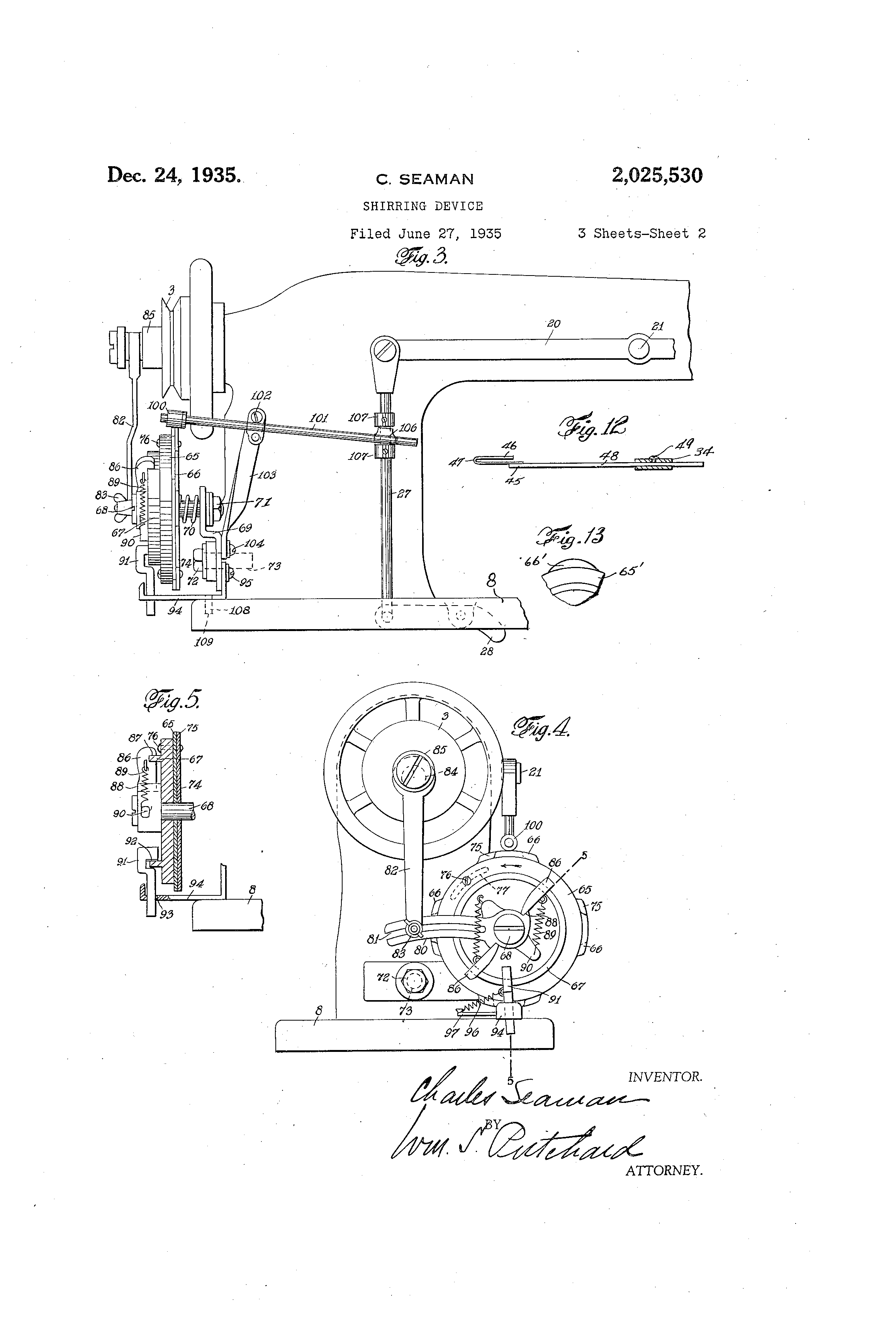 P atented Dec. 24, 1935 2 @ 0 2 5 @ 5 3 0 -FF UNITED,-@STATES PATENT 0 2,025,530 SMRRING DEVICE Charles Seaman, Jamaica Estates, N. Y Application -June 27, 1935@ @ Serial. No.: 28,594 16 CIaims. (Cl. 112@134) @M-us -inventi-on; relates to sewing machines and m or,eiparticularly to@ a device or- attachment for raaki-ng -and stitching shir-ring or ruffling ontol a base@ material. An object of @the invention is: to provide a de-vice for shirring at ,@paGed @intefvals so, as to make a;. trimniing 4Df at@@ractive design. -Another -object is @to provide means for automaticallyinterrupting or modifying -the@ shirring fj -@operation at, predetermined inter-vals. Another @ object: is to provide a trinuning having spaced shiri-ing or puckers. . Another -object is to, provide a shirring having non-uniform characteristies. 15 ';Another object is to provide a shir-ring the c haract,er@is'@ics of,@which--are varied at re@ular inter.vals. @ Another-@ object is -to prgvide a device for making- @and attaching a, shirring of @ the; above type. 20 with a.@single roiv of stitches. -Another object is to provide a simple, efficient and@ dependable device for the above . purposes. V,a,rious-other objects-and advantages will be appaxent as: -the @ nature @of. the - invention is more .5;, fully disclosed. I I AlthGugh the@ novel f eatures. which are believed to be chara;cteristic of-;this invention:will be pointed-@out mGrL- in detail in the claims ap30 pended hereto, the, broad aspects of the, inven tion Vfll, be better understood by referring to; the following description tak-en in-connection with the: accompanying drawings @in- which: Mgure I -is; a @ front elevation of a sewing machine embodying the-present invention. 35 Mgur@e 2 is -a top plan- view thereof, partly btoken away ta show the shirring attachnient. Figure 3 is a rear elevation of a portion of the sewing machine showing@ the internuttent drive. I I Figure: 4 - is an - end el6vation of the machine 40-@showingthe intermittent drive. . 1: Figure@ 5- is- a@ section taken on the line 5@5 of Figure 4. Mguxe 6- is a persp@-,ctive view illustrating the shirring attachment. Figure 7 is an end elevation of the,mach'me, partiy in sectio@n shgwing the shirring atta;ch-.@ ment and.presser foot operating mechanism. Figure 8 is,a. plan -view of one type of shir-ring -.,prGduced by the present device. 9- Figure -9 -is a;, section. taken on -the,line 9 Of Mgure 8. Figures 10 and ill are ploii -.views showing dif f.erent @ forms of shirring@ which can be: produced L@'iby- the- presentcdevice. -Figure 12 i& a side elevation,4partly in @section, of one of the guide -mechanisrns. . Figure 13 is a par-tial end- elevation of a. -modified form 4Df,,the@,cam. In@the-specification)and'in@the@claimscert. ,in specific temi-q have-been used for. tonvenience@-in referring to; the various details of- the -in;vention. These terms, however,@,are tobe given :broga.an inte-rpretation as the @@tate of. the art'@will. pernlit. -@t Referring to the@,drawings@ more. in,: detail-,@ he, -Lnvention is shown as embodied in-@ a@sewing@,machine.zomprising a@head, 1,,.@ha-v-ing,-a needl6 bar 2, which is reciprocatedi -by., suitable.,.driving means, such as a pulley. 3, . &iven by @a; belt (not shown). The needle bar 2.is--adaptedl-,to@aarry;1,5 a needle 4 by@- wwch the sewing @ is. effected -i-ri a wellknown manner. The-head I also.carxies.a p-resser f oot, bar 5,having a presser,f (>ot, .6.; adapted to hold the material in -engagement@@.,With ia--,@set ,@b of feed dogs 7. which@ are..mounted-@below @m. ase 20 plate 8 and extend through@ an -aperture'-@9 i-therein. The feed@:dogs:7,@may be@-operated-,.by.-i-@@any suitable means-to interm,.ttently@engagetlie@:material and feed T the:@.same..past .,.@the -,needle Tfor stitching. The presser foot bar 5 @eatries'@an@-arMr 25 12@ which is adapted to be. engaged -by@@.a@@cam lever 13 for raising the presser foot--bar-@@fTonv@,the work when it is -desired to @release-.,,the,:@.work;@'for example, to adjust.@the position.thereof @i-n:the maeliine. The cam lever'@l 3.:, may, be @.Pivoted- to@ 30 a pcrtion of the head I and mayhave a handle 14 located @-in a position readily Laccessible to the operator ;of the niachine. @ The upper..--.end,, of the presser fogt bar 5 may be journalp-d in.al-sleeve 15, which may be threaded into-, thi@..@,head@.A, ,and, 35 serves as an adjustable shoulder a;gainst@,which a spring 16 is seated. -The spring@@16 is.-coili@d around the presser foot bar 5 between the sleeve 15 and @the @ arm 12 ., and serves to, hblcl the@presser foot @ 6 -.against the. - mate-rial @ -when@ the@@.lever - 1 3 40 is released. In ,order to operate the presger@ foot: bar without removing the hands frorri 1; the @.@materlal,:; a kneeoperating means is provided@,@1--comprising;-a lever 20 wl-iich is pivoted to the back@,,of the-,,head 45 1, as at 2 1, and is connected @at oneend to -a,,link 22 wli,:ch is, in turn, pivoted-to the@-.arm 12;-, as by screw 23. The link 22,may be provided with ar, elongated slot 24, engaging a@pinl-25.,,caxried by a lug 26, secured to the.lever 20:.i The@elon@ ga-,ed slot 24,.providesi a suffleient amount'of @lost motion to permit@'the presser foot@@;bar-@@5.t6 -be elevated by the lever 13; without:.@moving - th6 lever 20. The lever 20 is operated by a link:.27 Nvhich is pivotauy connected to a@lev& 28,.-:. The @-,5'.