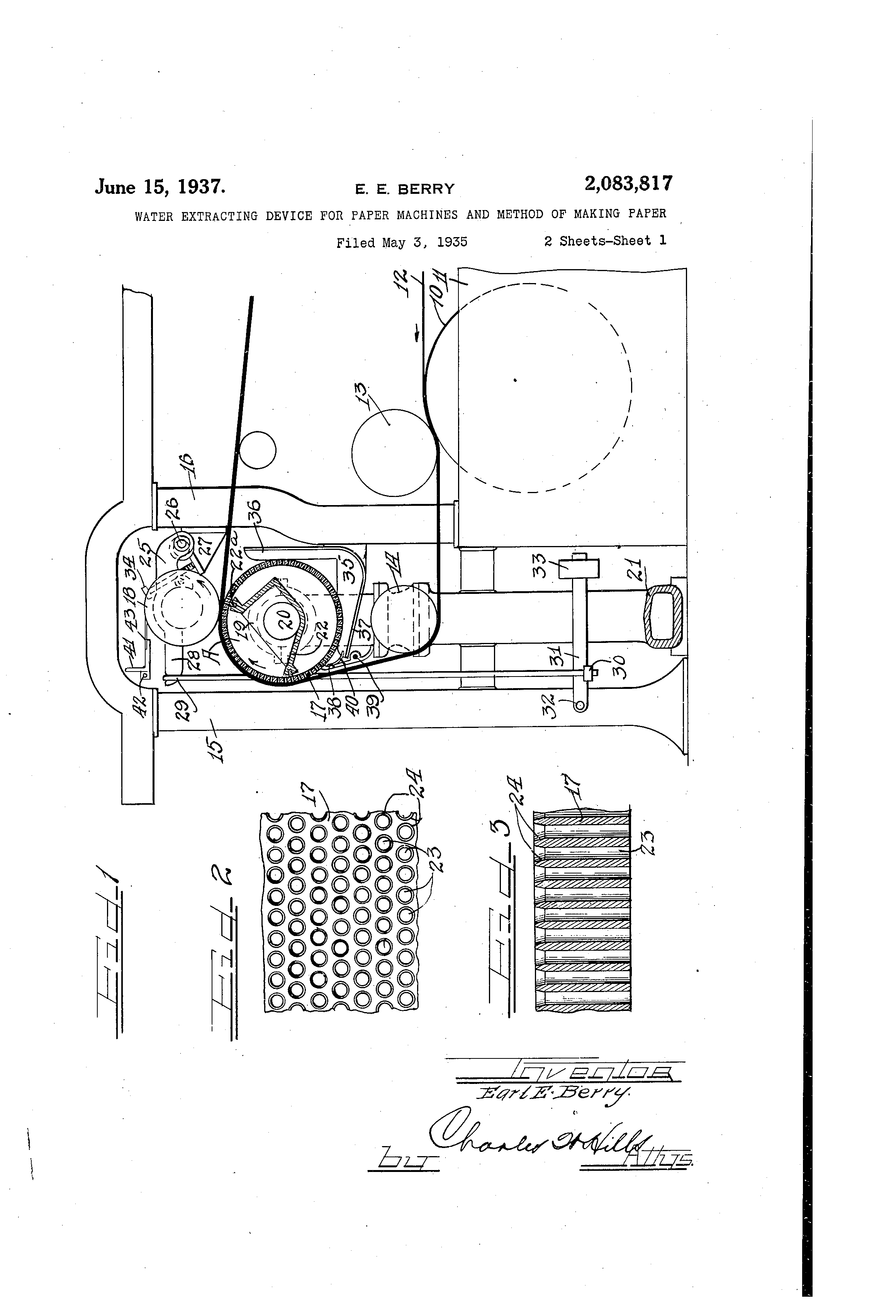 Patented June 15, 1937 2pO83@817 UNITED STATES PATENT OFFICE 2,083,817 WATEP. EXTRACMG DEVICE FOR P"ER MACEIINES AND METHOD OF MAKING P"ER Earl E. Berry, Eliloit, Wis., asgignor to Beloit Iron WorU, Beloit, Wis.,a corporation of Wisconsin Application May.3, 1935, Serial No. 19,590 9 Claims. This invention relates to a water extracting device for receiving the wet web of, paper directly from the,forming part of a paper machine. More speciftcally this invention relates to an impr6veid forin of suction and extractiori. device for rem ving moist7ure from' apet webs formed on a cylinder machine without' th6 I aid of the large number of primary or baby presses heretofore required on cylinder. type papei@ machines. 10 The invention also incliidog a process for, reriioving *ater from cylinder fotmed paper webs. r In the ,Onveritional multi-eylifider type 6i paper .;nachine, the pickup .-felt - is coritacted with the top portion of each.cylinder mold to thereby 15 remove, the @@wet fibrous web from the revolving csrlinder. A built-up fibrous web is thus caused to adhere to the under side of the -pickup felt. After leaving @the last cyl@nder mo ld,th6 *eb and felt is trained arbund a roll 'positioned at the 20 rear.,of tiie machine and trave,l back ol@e'r the c de@@i@iblds.@ Du@@g its ttavel back over the ,yliii 4ow niolds,,the fibrous wpbi thi@b i8; on the upper picku felt @is edvered with a top surface. of the, I P felt @nd pre@@6d while betwet-n the two felt& by. '25 m6alis@' oi-@piiinar@, press. roll@ airanged in batt etif,s. io@'iiii@@rt a graduall@- iricreasiiig pressure as,@the.-*a er is,removed frorritlie web and felt. It.is es8ehtial tha't the primary pres4ng action be ir6ii--.g,eiitl6 it 'flist and gradually inerea'sed -30 unt il the@ web is suffi6iently dry 8 o that it can be subje'cte&@to: high @pressures without severe crush in The'..Iieretofore'cbnsidered necessafy,piimarY rolls have M'n di dvantageous features, press a y sa 35, M ai b I' -objectiondbl,e. of which';m 6 isted as' ost f6ilows:- and,install (1), High initiiil. expense t(> purch.ase required -number of r4DIls 'itigh riia,inte nance cos t in k46ePin@ t4e rolls (2 (Cl. 92-38) cau se the web has to conform with the radius of the rolls. I have now provided a, water extracting device to replade the primary press rolls in cylinder type pap er niach,ines. My, device removes la-ge 5 amo unte@ of the water, from the cylinder form@d - web by.suction aiid thereafter presses the web 4gai nst the suction-device Itself to remove further cfubntities of water so that the web may be subj ected to high pressures without damage- or 10 niay .be directly passed to the driers. I n accordance with my invention, I provide a suct ion roll With small holes drilled through its peri phery and spaced as close together as possible . The holes are so shaped and spaced, as 15 will be hereinafter described, to reduce the resista nde of exitering air and water as much as pos @ible. Th4@ suction -roll is provided with the usual type of floating head suction manifold but Is arkanged so as to- have a relatively wide suc- 20 tion 'ar@a. A @ress roll is mounted above the suct ion roll so that the nip between the rolls occ urs either inside the suction area or just at, or beyond the end of . the suction area, as defined by. the suction manifold within the perfo- 2r, rated drum. This doiilbination suction drum and press roll is mounted after the last cylinder mold on the cyhnder type paper machine and the picku@ felt is trained,bround the suction roll and passe8'be- so tween the nip of the press roll.and sucti on roll. Thus the web carried by the felt is firsf @ubjected to a relatiVely high degree of suction, *hereby large amounts of water are, @r6nibved and @irohi @the 35 f'rom the webs through the felt felt itself. The web and felt' are@ theii@,@ubjected to pressure between the pies@'-ro a . nd suction,roll to r6move further quantities of v@at6r and@ sujmciently:form the web so that it may be 40 d in r6pl rs for - passed directly to heavy duty pres@es or to@ the 40 ground an acing wbrn rubber 'cove drying cylinders. 'Since the felt is somewhat some of "the roll@. r re4uired to &ied by the,precedilig suction treatment, it ab.(3), .0. erating 6'ost tor@ PGWE d sorbs watt@r whicli has been liberated from the drive the require lirge number.of rolls. web by pressure at the nip of the rolls, and (4) C6mplicated, drive mechanism required to thereby aids the dryl of 45 1 @g ttie web. 45 synclqrbni:te@and.,drive the gets or batteries of The suctioii,roll@mu st be provided with small rolls diameter -holes sd-,that the web and felt are not Pas@age of wet web through th(-,Iarge numsu6ked- or presged into the lioles and thus dam-. ber of. nips between the I rofls" tend@ to'distort and aged.@ I 'Me entry, of the -web and felt into the a! f the web. ro sreil 'tbe fiher form t on o holeg would ' also- s@ace the web and felt some- 50 (.6) Air, oit'e'n enters botween @the Web. and what froni fh I 'and thereby, make e@ top press ro 1 felts . @nd punc.tiirts or''@blows,, @he@ w6b:during the appliegtion@ of @pressur6 less effective. the pressing operaiion between @ the @r(ylls. In'iiiy 'copending @ application entitled "Cylin('i Multi-ply *ebs often- separate at the plieg der -paper, machine and method of making as they pass beiwe'e'n the. nips of ihe 'rolls be- paper", Serial No@ 19,591, filed of even date here-. 55. 2 2,088,817 with, I have described and