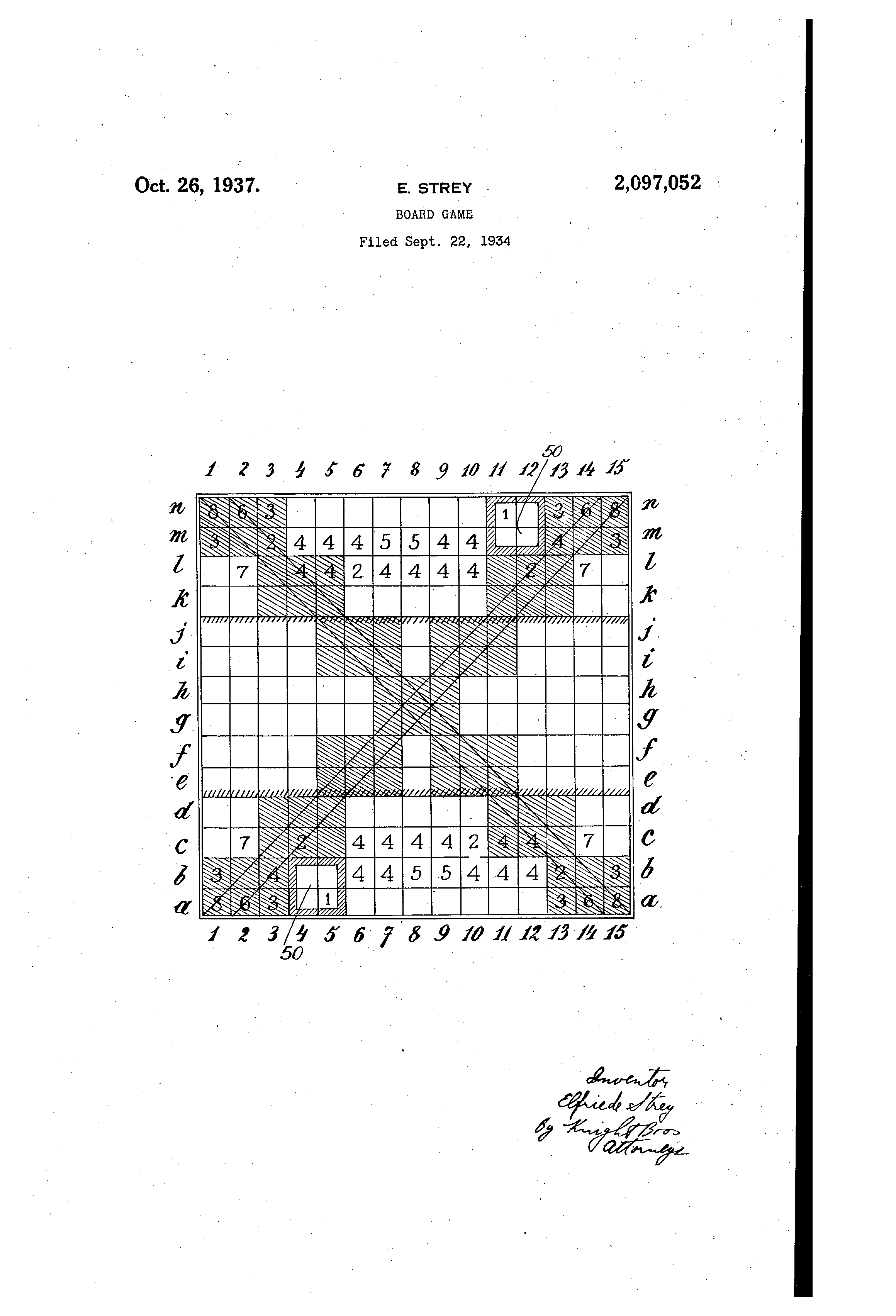 Letters Patent is:- 65 1. A game board dfvided into a large number of squares in vertical and horizontal rows, the number of horizontal rows being twice @an odd number and the number of Vertical rows being an odd niimber; groups of six squares being dis- 10 tinctly marked, each groiip comprising two horizontal rows and three vertical rows of squares, the grpups being In two diagonal series having one comraon group occupying the. three central squares of each of the two middle horizontal rows 4 of the boaxd, the groups lapping each other by one vertical row. 2. A game board as described in claim 1, wherein diagonal lines crossing at the center of the board cross all six squares of the central group of distinctly marked squares and four of each of the six squares in the other groups. 3. A game board divided into a large number of squares, cert-ain solid groups of said squares each 16 comprising two rows of three squaxes being distinctively marked so as to be distinguished from the remairiing squares, said groups being arranged in two diagonal series crossing in the middle of the board, the neighboring groups in 15 the same series lapping by one square in the direction of the three squares. 4. A garne boaxd divided Into a large number of squares, certain solid groups of said squares each comprising two rows of three squares being distinctively marked so as to be distinguished from the remaining squares, said groups being arranged 5 in two diagonal series crossing in the iniddle of the board, the neighboring groups in the same series lapping by one square in the direction of the three squafes, said board having diagonal lines extending in the direction of each of said series 10 and crossing through four of the six squares of each group. ELFRIEDE STREY. 15