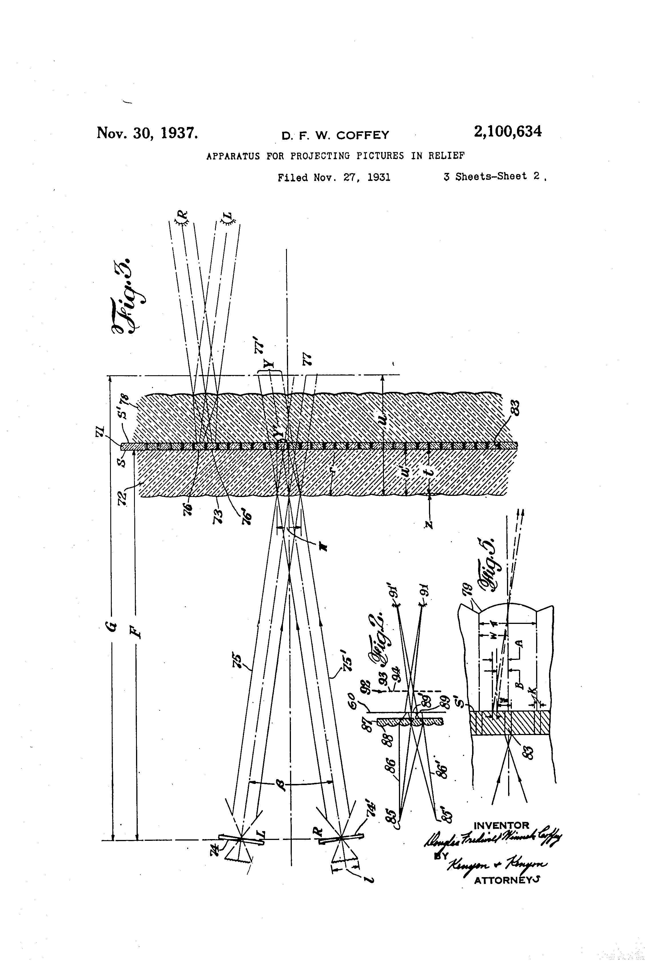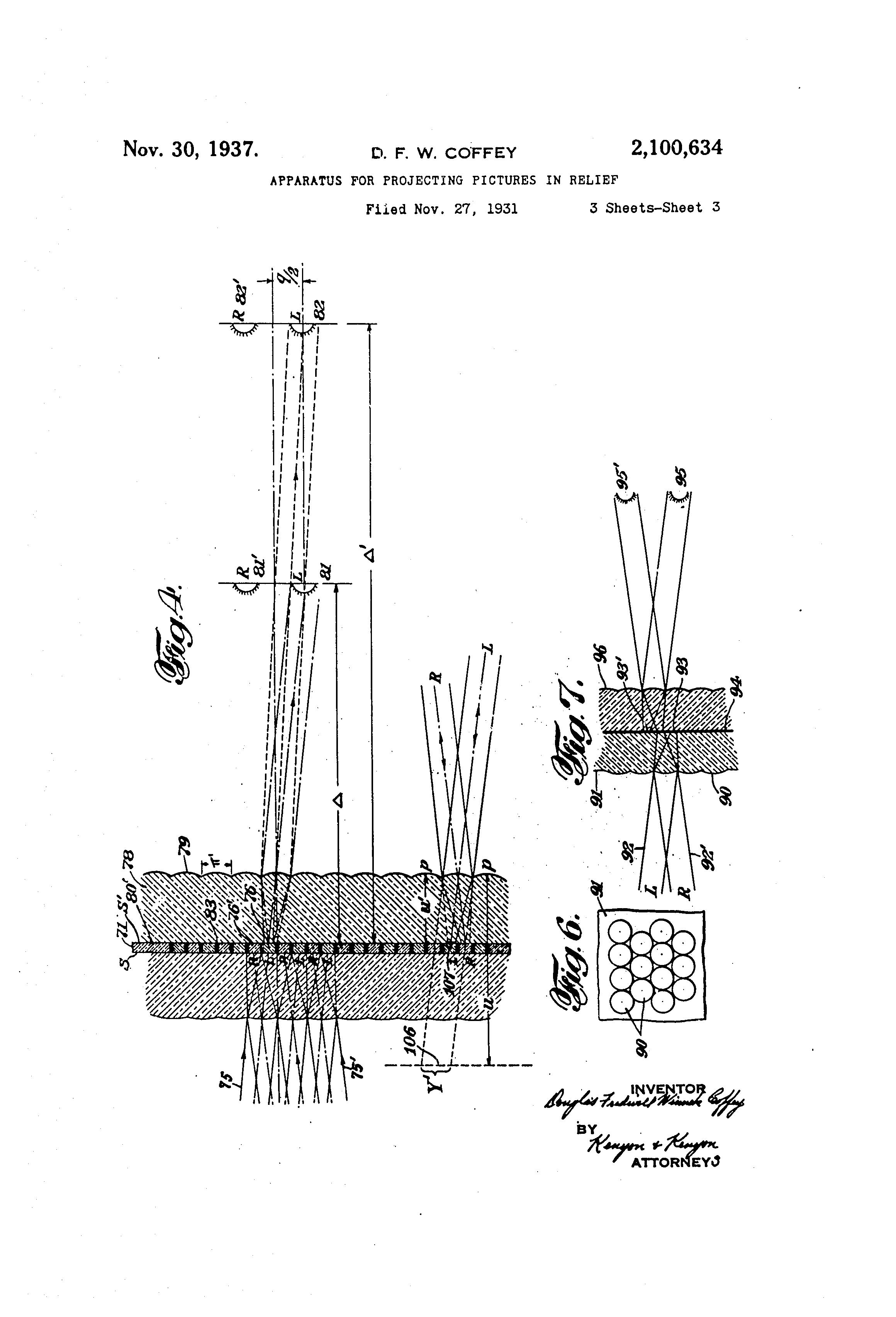 claim:- 1. A composite viewing screen for viewing projeqted left and right stereoscopic views of a pic- 30 -tiire in stereoscopic relief which comprises the combination of a flat translucent image screen disposed In a single plane, a resolving' screen of lenticular construction'on one side of'said image screen adapted to form on said image screen a 35 multipucity of small independent left and right Image portions liaving parts thereof independent of each other, and a selective screen on the other side of said image screen adapted to direct light from parts of said left and rig image portions 40 which are Independent of each other so as to be viewed by both the left and right eyes exclusively and respectively of an observer. . 2. In apparatus for viewing a picture in relief, a flat translucent Image screen disposed in a 45 single plane, a resolving screen on one side thereof adapted to form a multiplicity of independent left and right elements of a picture having parts thereof independent of each other on said image screen, and a lenticular viewing screen on the r)o other side of said image screen adapted to direct light frum parts of said left and right picture elements which are independent of each other so as t6 be viewable by the left and right eyes exclusively and respectively of an observer. 55 I)OUGLAS PREDWILL WIIMK COPTEY.