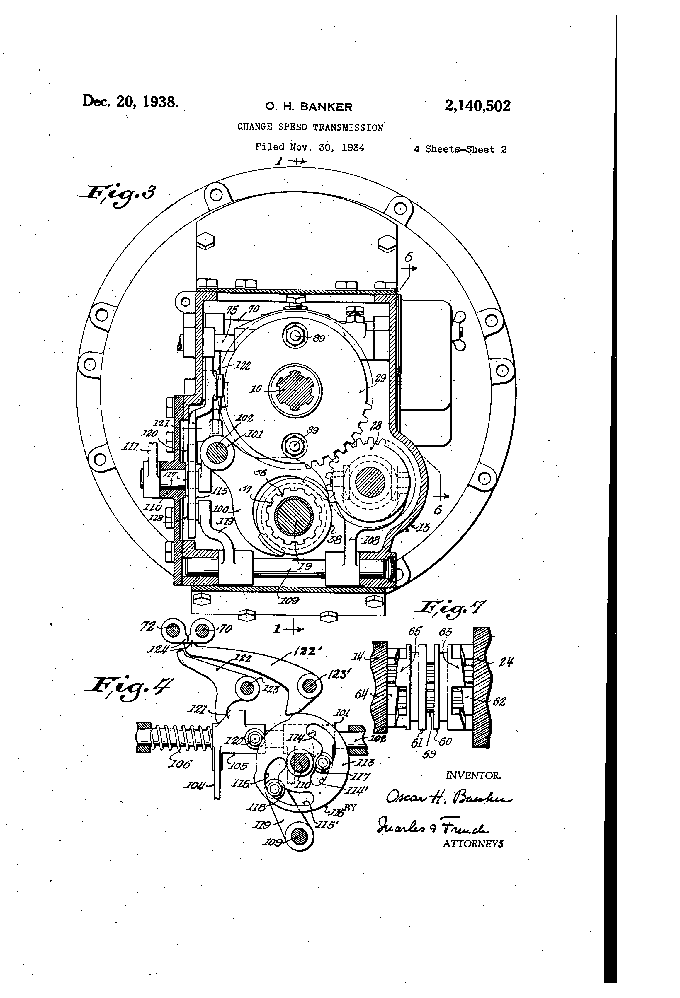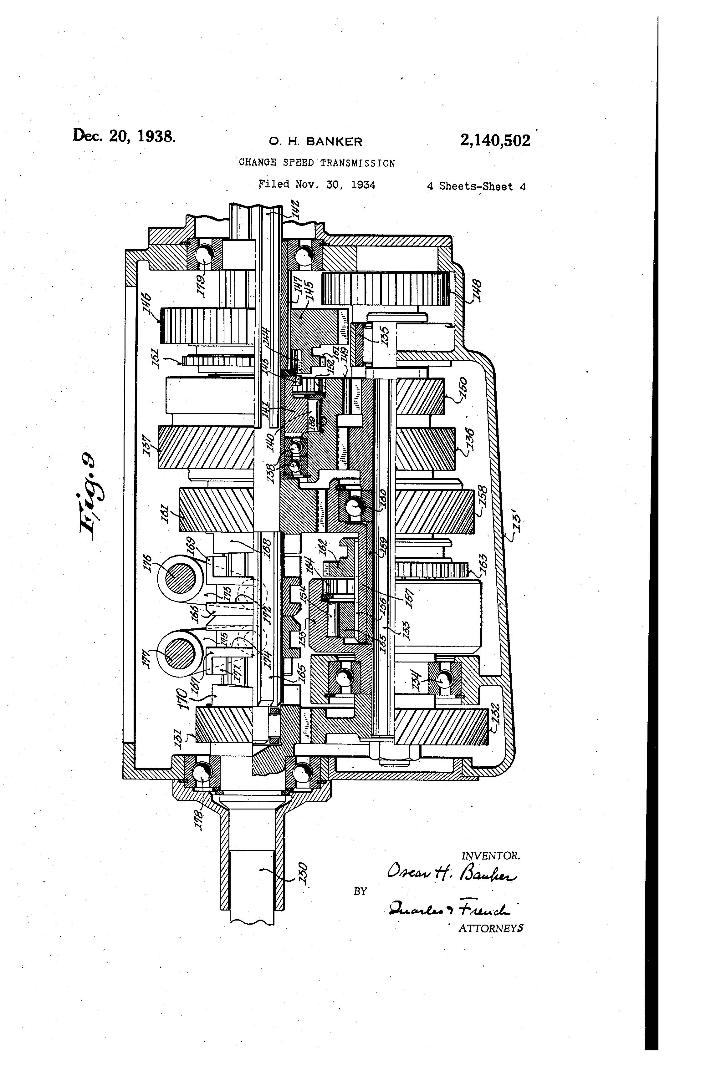 claim as my inveption is: 1. In a change oned transmlssion the com- TO bin&tion of a driVe Shaft,. a' driven shaft, automaticany vari&bie change speed mechanism for 5"nging the drlve of the driven shaft from Lthe grears ISLI, it will rotate at a faster rate of (Wwer gear ratio to "high" on a temporary redue75 speed than said gear and the gear 158 s .9 tb It ti(a In spftd of the (hive sWt below that Of is 6 2,140,502 the &iven shaft and means under the control of the operator to Immediately put,,said change speed me in a lower gear ratio without reducing the speed of the driven shaft when in "high", said driven shaft adapted while in the lower gear ratio to drive the drive shaft if the speed of said drive shaft faus below that of the driven shaft. 2. In a change speed transnilssion, the combination of a drive shaft, a driven shaft, auto10 maticauy variable change speed mechanism for progressively changiiig the gear ratios between the drive and driven shafts from "low" to "direct" drive, means to immediately render said change speed inechanism Ineffective to maintain said 15 mechanism in "direct" drive and put said mechanism in a lower gear ratio without reducing thci speed of the driven shaft when in "direct" drive; said dri.ven shaft adapted while In, the lower gear ratio to drive the drive sbaft If the speed of'said 20 drive shaft falls below that of the driven shaft. 3. In a variable speed transmission, the combination of a drive shaft, a driven shaft, speed responsive actuated clutch mechanism for con-, necting said shafts together for direct drive on a 25 temporary reduction In speed of the drive shaft below that of the driven shaft and having a driving connection from said driven shaft to said drive sbaft on a release of said direct drive connection, change speed gearing between said shafts 30 for connecting said shafts together at a different ge6,r ratio, and manually operated m6ans for moving said clut -th mechanism for a release of the direct drive ci @nection from said drive shaft to said driven sh.Lft without releasing the driv36, Ing bonnection from said driven'shaft to said drive shaft. 4. In a variable speed transmi ssion, the combination of a drive shaft, a drivi@n shaft arned with said drive shaft, an auxfliary shaft, chazige 40 speed gearing connectirkg said shafts together fprlow and second speed gear ratios, a free wheerng connection. between said low speed g6aring and said driven shaft,- a free wheerng connection for se@ld sec.ond gear ratio, speed responsive clutch 45 mechanisrd for. establishing second speed ratio through sald gearing, speed responsive clutch mechanism for connecting said drive and driven shaftg togeth,er for direct drive, said clutch mechanisrns adapted. to overrun when. the speed of au the driver exceeds that of the driven part being engaged but being constantiy engaged for the drive of the driver part by thb driven part find actinjg with sgid gearing and connections to lock the driven shaft against backward movement. 5. In a.varlable speed transmission, the combin6,tion of a drive@..,'-t@haft, a driven shaft, an aukiliary shaft, chang . e speed reduction gearing between said shaft @@reverse geariiig between said au)dliary and driveh shafts Including a 'gear on 60 the driven shaft, automatic, clutch mechanism of theoverrunning type for establishing the reduced gear rati6, automatic clutch mechanism of the (verriinning type for diribct connection of said drive @and driveri shafts,'azid govemor mecha65 nism mounted oh the reverse gear on said driven shaft and operativily connected 'to said clutch mechanisins to. move them to a P6sition forengagement. 6. Iii a variabie speed transnilssion, the com70 bination of a drive shaft-, a driven shaft, an aux-, iliary shaft, change speed gearing between said .s@afts for low and second. speed gear ratio and W reverse gearing connection between said auxiliarY and driven shafts including a shiftable geari 75 automatic clutch mechanism for establighing seeond gear ratio, clutch mechanism for connecting said gearihg for the low gear rittio, manually operated clutch mechanism for locking said gearing in second, and control mechanism for moving s@ld shiftable reverse gear to "reverse" position 5 while preventing operation of s;dd lGw gear connecting clutch mechanism and gaid second gear locking clutch mechanism. 7. In a variable speed transmission, the combination of a drive shaft, a driven shaft, change 10 speed gearing between said shafts, an overrunning Jaw, clutch for establishing connection between said shafts through said gearing, means for placing said elutch In a partly disengag6d position so as to prevent a forward drive through 15 the clutch and retain a reverse drive therethrough, said clutch when so released from a forward drive relationship, upon deceleratioti of said drive shaft, forming a connection for - drive from the driven shaft to the drive shaft with- 20 out changing Its direction of rotation when said driven shaft Is the driver, and meazis for holding said clutch In said partly disengaged position. .8. In a change speed transmission, the combination of a drive shaft, a driven shaft, change 25 speed gearinjg 'between said shafts, an overrunning clutch for connecting said shafts with said. gearing, an overrunning clutch for connecting said drive and driven shafts directly together, said overrunning clutches when not fully engaged, 30 upon deceleration of the drive shaft, permitting the drive of said drive shaft through said gliaring or through said driven shaft by the driven shaft without changing the direction ()f rotation of said drive shaft when said driven sha@t Is 55 rotating 'fa#er than said drive shaft. 9. In a change speed transmission, the combination of a drive shaft, a driven- shaft, chanse speed gearing between said shafts, an overrunning clutch for connecting said shafts with said 40 gearing, an overrunning clute-h for connecting said drive and driven shafts directly together, said ove