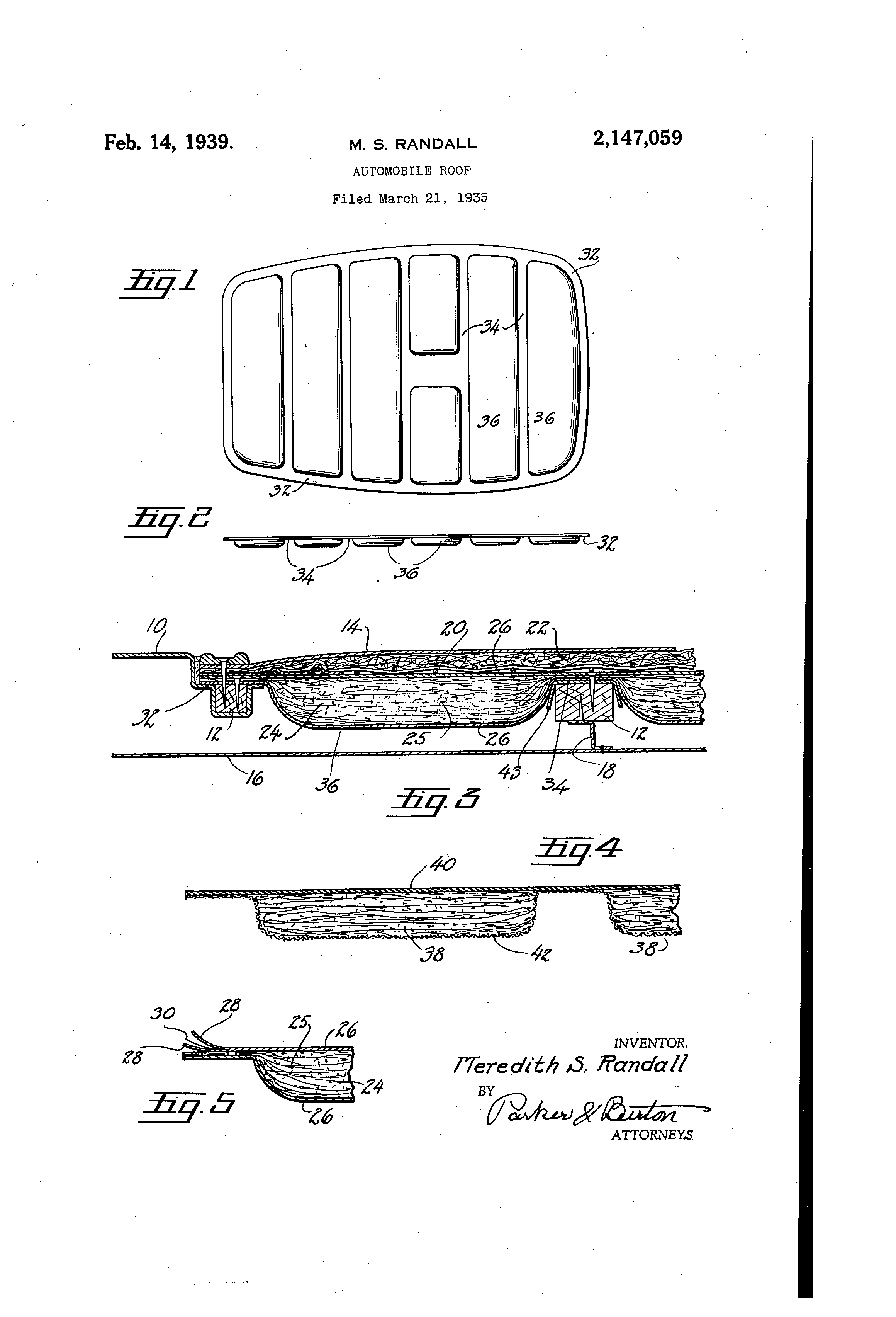 2 2,147,059 Each of these outer layers may be constructed as I Sliown iri the layer wliieh Is broken down in ]Fig. 5. It will be noted that this layer consists of two laminations of loose, flexible, extetisible, double creped paper 28 secured together by a layer 30 of,su@tabl4e, adhesIV6, preferably a moisture resistant adhesive, such as an asphaltum compound. These outer protective layers 26 are arranged sandwich fashion upon opposite sides 10 of the fluffy interior inswating lamination 24 as shown. The entire pad is then compacted as shown in Figs. 1, 2 and @3 around its margin 32 and transversely therea'cross along line 34 forming separate pad like portions 36 adapted for dis 1,5 position between the several pairs of bows As the pad is compacted under heat and pressure the thermoplastic particles serve to hold the flbprs permanently compacted togetherthroughout a. compacted area or along the compacted 20 lines and the asphalt 30 in the outer prote.ctive layer 26 ihigrates -and serves to assist in performing the same function thereby producing a compacted. area throughout which the entire pad is so c'ompressed as to form a relatively thin @ but 25 to@gh and strong iirea adapted to.receive and retalntherethrough fastening means such. as nails or th@ like to secure the l@ad in place to the supporting frame, of the roof. A pad, ihus formed having a compressed mar30, ginal p . ortion and compressed transverse line portions separating.the pad lengthwise'into a plurality of individual pad-like iri@ul-ating areas is.positi6ned upon the roof fra'me including the bows so that the I cus . h I ion-like aieas are dfsposed between 35 the bows and the framo as shown. As@ illustrated in Pig 3 the structur I e is of the cila racter of Figs. 2 and 5 above described and is disposed underneath the wire 'netting 2 0. @ The compacted longitudinal marginal,portibns of the pad are secured 40 in@ plac'e to the longitudin@l@ side fram6 members of the roof, structure which are h6t,sh@owril in the dfa*ing but are of the conventional well-known characier. This securement ma@ be in the many ner illustrated for attachment of the coinpacted 45 transverse !)drtions to the'bo'WS. @tioii' i@. iliustrat d in Fig. 4 where A mod fie e 's6piLr@te @@ds 36,Of the :sam:e fluffy fibrous insulatioii mati@rial are supported by a flexible fibr I ous or fabric Iayer..40 wncb may be of the same ma@6riAl@ As oile of the lo@yeis 26 or other suit@ble ma0 ,t6rial. Ik B boord might.be used. This is 4 c I om@ositi6n fiber board carrying a substaritial asphaltum corite@i and is capabl@ i)i b6in@'molded Under heat and @iessure. o' A layer of I osely woven fabric 55 @42 .siieh as:che@@e'cl6th, @crini, or ihe Iik6 is arranged underneat@ the- pads@ 38.and @dhesively secured to the IoLyek 40 holding the pads In place as sho,@vn. This composite l@E@d is adapted t'o be 60 us6d in' th@ same,@ manner as 'described in con@n6@tion v@'th t4e pad'of Mgs. 1, 2 -ind' 8@ gib6ve. strip@@ of sliitable materi@l 4t, may be'iaid over -the 'bows 12 underneath the p@d,@s shown in F,ig. 3.@ What I Claini is, 65 l@ An autom6bile roo'f h'aving spa'ced a"part suppoiting bows, top deokinlg mdterial' covering the tops of @ siiid bow's, a: layer of @ wadding Arranged @on tbp 6f @aid bbw@ underne2@tb @aid top d'ecking material, . trim material covering the@;b6ttoms of said 'bow4 and a pltir-alit@ of instilation pads supported within the ida@es b4@tween said ;b6ws and bet*een said wadding and trim. material. 2. An automobile -roof having spaced apa-rt 8upporting.bows, top decking material. covering the tops of said bows, trim material covering the bottoms of said bows, an insulation pad formed of alamination of loosely integrated fluffy fibrous material possessing high insulating capacity secured r, to @an outer I I amination of flexible protective material, said fluffy fibrous material being permanently adhesively compacted along its margin and along transverse lines corresponding with the, relative position of the roof bows separating 10 the pad into uncompressed pad-like areas, said pad supported upon said roof bows with the uncompressed pad-like areas depending between the bows aiid substantially filling the space therebetween and the compacted areas overlying and jr, secured to the bows. 3. An automobile roof having spaced apart supporting bows, top decking.material covering the tops of said bows, trim material covering the.bottoms of said bows, a laininated insulation pad 20 formed of an interior lamination of. loosely integrated fluffy fibrous material possessing,high insulating capacity arranged between two outer laminations I of protective, material, one outer lamination being formed of relatively tough and 2r, strong material and the other oute@ lamination being f6rmed of relatively porous material, said insulation pad being compacted along its margin and along transverse.lines corresppnding to the relative position of the bo.,ws separating @he 30 pad, into spaced apar,t. transverse unc6mpacted pad like areas, said,]@ad supported upon said bows with the. comp@icted lines oveilying @he bows and the uncompacted pad like areas. disposed within the,intervals between the bows and the. porous 35 lamination of the pad dispbsed on the under side. 4.,An insulati.on peid for an.autoriiobile roof in up 0 hav @ a s p rting frain6 including cross frame pad r i g members, said comp is n an iliterior lami,nation of loosely.,integrati@d fibrous fiuffy r4a- io te@ial arranged between tivo outer protective outer lamination8, said Pad being permanently'compact6d along its margin and along spaced apart ;tran@verse lines provid;ng relatively@ tough strong compact'ed'lines 6orresponding to ttie frame, of4 the roof and d pted to sea thereon and surA a t )r6un.din'g - spaced apart unc()m@res@bd areas, adapited to be disposed within th6 thickness of @.tiie 'fr@me..betw e4@n.. . said frame members, said fiiiffy interior lamination being @eriiianent]3@ adhesively secut6a@ 66iiipacted to