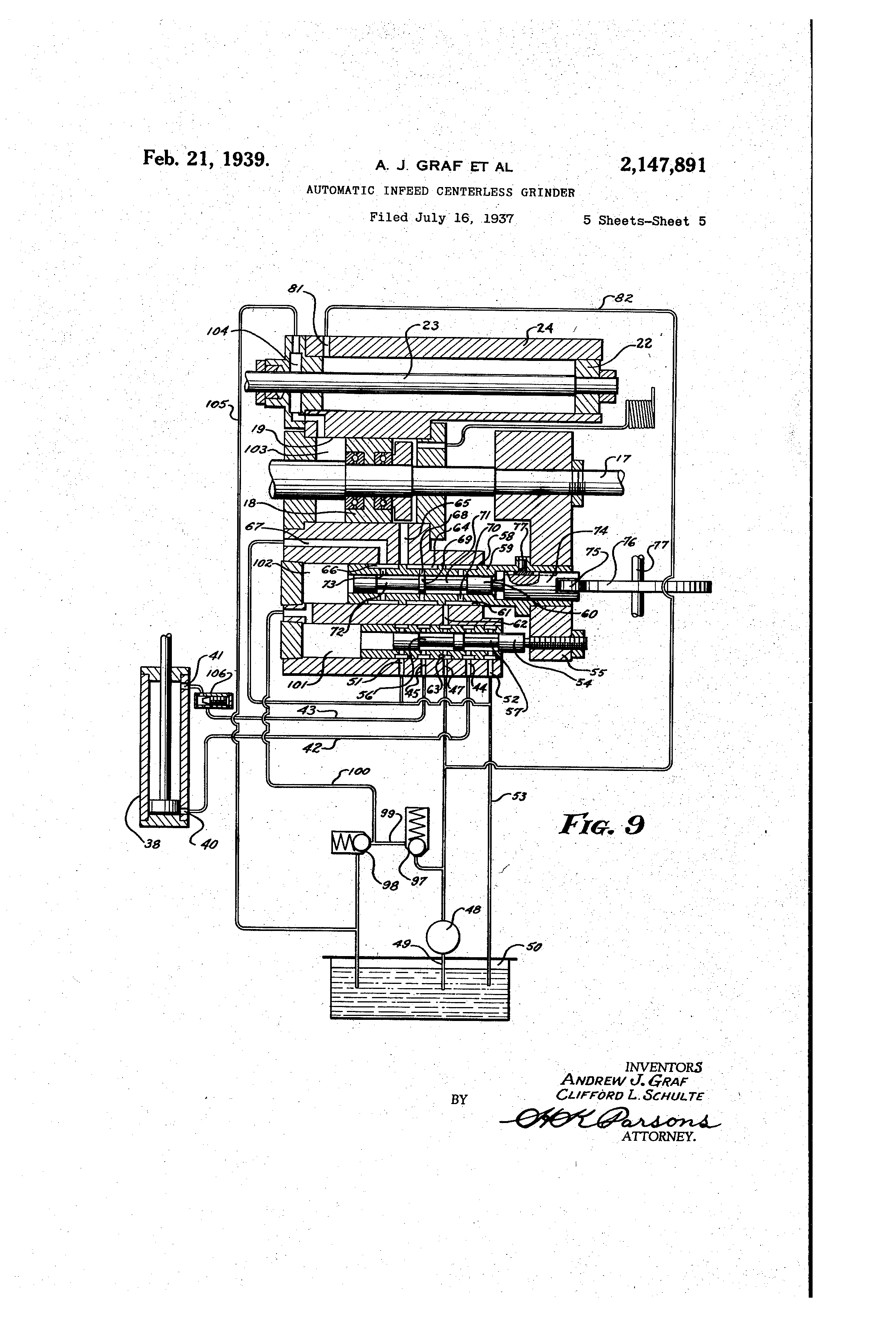Patented Feb. 21, 1939 2tl47@891 UNITED STATES PATENT OFFICE 2,147,891 OROP &AnO EMED CENTERLESS GRINDER Andrew J. Graf, Norwood, and Clifford II& Schulte, RossmoynL-, Ohio, assitnors to, OWeinnati Grinders incorporated, Cincinnati, Ohio, a corporation of Ohio tvphcation - July 16, 13 Clabip. 7bis invention relates to grinding machines and more particularly to improvements in automatic centerless grinders., One of the object@ of, this Invention is to proa vide an improved and simplified mechanism for obtaining greater advance and retractive movements between the grinding wheels of a centerless grinder of the inf"d type. Another object of this invention is to provlde 10 an improved hydrgulic operating and control mechanism for governing the,rnovements of the regulating wheel in a centerless grander of the infeed type. A further object of this invention is to pro15 vide a control mechanism for producing a complete automatic cycle in an infeed, type centerless grinder, including loading and ejecting of the work, which may be controlled by a single cam. An additional object of this invention is to 20 provide an improved automatic infeed type centerless grinder for automatic grinding of work pieces which do not lend themselves to through feed grinding principals. Other objects and advantages of the present in25 vention should be readily apparent by reference to the following specification considered in conjunction with the accompanying drawings illus-. trative of one embodiment thereof, but It will be understood that any modifications may be made 30 in the specific structural details within the scope of.the appeiided clainis without departing from or exceeding the spirit of the invention. Referrin'g to the drawings in which like reference numerals lndicate.like or similar parts: 35 Figure I is an elevation of a centerless grinder embodying the principles of this.invention. Mgure 2 is a plan view of the machine shown in Figure 1. Mgure 3 is a section through the cam ecitrolled 40 mechanism as viewed on the line 3-3 of Mgure 2. Mgure 4 is an enlarged detail section taken on the line 4-4 of Mgure 3. Figure 5 is an enlarged section taken on the -45 line 5-5 of Mgure 2. Mgure 6 is gn enlarged detail view of the control cam. Flgure 7 is a section through the work loading mechanism as viewed on the line 7-7 of Fig50 ure 1. . Mgure 8 is a section on the line 8-8 of Figure 7. Flgure 9 is a diagramme'ic view of the hydraulic control circuit. 55 3rir.,ilig operations oii a centerless griiider are 1937, Serial No. 154,046 (CL 51- 103) usuall y carried out by two different methods, one of which Is the through feed method and the other the infeed method. 7he through feed metho d is used for grinding cylindrical woik which passes through the grinding throat in -@ .5 contiii uous stream. The infeed method is utilized for grinding work pieces which either have an obstru ction thereon which is larger in diameter than the portion being ground, or have a contour@ d surface, which necessitates their remain- 10 ing in a fixed a)dal position relative to the wheels. When the latter method is used, the wheels must be retmcted for the purposq of removing and inserti ng work, and then b@r@ought together to for ' m the grinding throat, after wliieh an addi- 15 tional movement or infeed is effected to accomplish the,grinding operation and reduce the work re in deals with an automatiq mechanism which will effect a continuous repetition Of 20 an automatic infeed cycle including automatic Positio ning and ejecting of the work. In prior machi nes of this nature it was only necessary to provid e a relatively smau amount of separation betwe en the wheels to permit withdrawal of the 25 work, but iii the present nmehine the work moves lateral ly from the work rest blade and drops between the wheels into a conveyor chute,,which means that the movable wheel must be retracted a much greater amount than heretofore in order 30 to permit work ejection in this manner. Due to thislarger movement prior mechanisms have been found inade;@@ie and therefore an improve d structure has been provided by the present invention, whereby a large movement may be 35 easily and quickly effected, and one of the features of this invention is to provide a mechanism which will execute the Positioning movements at a rapid rate and the grinding movement @ at a desirable slow rate. 40 Ref erring tG Flgures 1 and 2 of the drawings, the reference nuineral I 0 indicates the bed of a center less grinder having a grinding wheel I 1, and a regulating wheel 12, supported on the top thereo f for relative movement toward and from 45 !Dne another, and with respect to a work rest blade 13 which Is located between the wh@els. On the present macwne the grindirig Wheel I I rotate s in a flxed position, and the regulating wheel 12, which rot9ltes at a much slower speed I than the grinding ivheel, and serves the function of rotating the work, is rotatably j6urnaled on a mova ble slide 14 for relative movement with respect to the grinding wheel to Permit insertion and removal of the work. 2 2,147,891 The slide 14, as more particigarly shown in Flgure 5, rarries a nut 15, in which is threaded a screw 16 having gn axially extending shank 17. The shank 17 has a piston I 8 secured thereto which Is reciprocably supported In a cylinder 19. The cylinder is integral with a brack@t 20 which Is attached to the bed I 0. The shank 17 extends through the rear of the bracket 20 for receiving an operating hand wheel 21 *hich serves 10 to rotate the screw 16 relative to the nut 15. It will jiow be apparent that the slide 15 taay be moved, either by admitting fluid pressure to the cylinder 19, or by rotating the hand wheel 21. The piston 18 has a somewhat limited move15 ment within the cylinder 19, but of sufficient amount to permit the work piece to clear the work rest blade, while the hand wheel is adapted to adjust. the regulating wheol the,full length of its stroke and serves to position