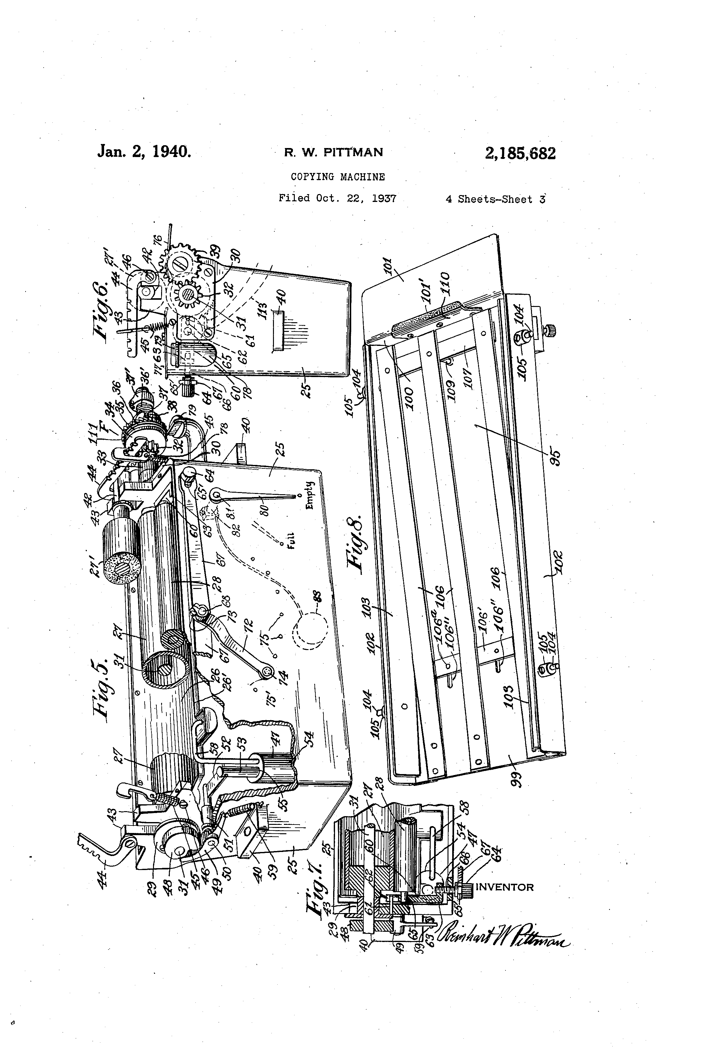 Patented Jan. 2, 1M 2@185fi82 UNITED STATES @PATENT OFFICE COFMG lucmm ]Uinhart W. Pittnum, Jackion Betchts, N. Y., assignor to The Beek Dupfleator Company. a corporation of New York AppHeation October 22, 1937, Serial No. 170,363 26 CW=. . (cl. ioi-ii2.5) This invention relates to copying machines, and more particularly to that . type of machines known in the trade as spirit machines, wherein -a master letter or the like is printed or typed, or otherwise prepared, with a suitable hectographic Ink or carbon, on the reverse side of the master, which is in the negative form, and with this side turned outward of the drum to which it is attached, copies are produced that are given a 10 surface moistening on the side of the sheet which contacts with the mastek under a suitable pressure roller to take off some of, the ink from the master. The primary object of the present invention, is 15 to provide a simplo, reliable, and efficient working machine, easy to handle gndladJuBt to its best working conditions, operated either by hend or autbmatically, adapted with the present itaprovements for producing a higher grade of 20 work, and a greater number of copies frcim one ihaster, than Is usually obtained on the prewnt type of machines. Other objects herein obtained, are by the use of improved adjusting devices,of the niachine, 25 such as the im@ression roller co-acting with the drum, to make a quick adjustinent from a great@er or less contact between the master sheet and the copy, providing-by,this means a greater number of copies obtiiiied from one mastc-r shei3t So and maintaining a uniform shade or color @i the imprint taken from the master. The amount of moisture d6livered to the copy sbeet to be copied, may likewise be instantly changed from a heavy to a light coating, or reversely, that is 35 delivered by a feed roller, the lower one of a -pair, that feeds and applies,the moi3ture@to@,the COPY sheet, and a contact roller above. the @rdoUtVning roller acting as a companion feed i@buer 'tith' the moisteriing roller to propel the abeets to tbe (In=, 40 tin reaulated to be quickly changed to, varyiug @contact pressures. Another. object Is the@ provision o-C mean@ @@:to -f. @ @ I - Obtain a perfect@ register with Ont,,another of ; the sheet-t to be, copled,,with.,@respect: to. @Ue Po. ,sition bf the muter -fixed@ @tol@@ the dr=, wl2ich includes a master. clamping ineraber, so,located in a cutout portion@ of the drtm that one wei.1 thereof becomes a pixt.of the registering me&=. A still further. object, is to proftde means to 50 rot te the feed rollers continuously,, or intermitIT la teritly, these being the aforesaid moistehing roller and the contact f6ed roller cooperatlng therewith, for propelling the moistened sheets to the register stop position of the &um. When feeding the machine automaticauy tlio rgllers may be continuously driven, or tnte.rmittently If desire d, since an iiutomatic feed member at the pro per time and adjustable for the purpose, foi6 es the sheets to be copied between the revolv ing or stopped feed rollers, to reach the 5 stop of the drum, while t ' he drum is at rest and abo ut to revolve again, or during the continuous rota tion thereof. When feeding by hand, the feed rollers are Intermittently stopped, to provide time to insert the sheet Into the bite of the 10 rolle rs, which start to rotate again at the proper time of rotation to propel the sheet to reach th6 stop of the drum, in the same manner as does the cont inuous feeding action of these feed rollers. I A still further object is to provide a container 1 5 to hold a suitable supply of the moistening fluid, whi ch container Is so constructed to be a removable unit, carrying the aforesaid moistening roll- - er, and its companion feed roller, together with othe r mechanism, to deliver and regulate the 20 moi sture applied to the copies. One form of this mech anism for applying the moisture o feed rolle r, provides 8, shallow baft, In the top of the.co ntainer, conforming to the lower portion of the moistening roller in which the same re- 26 volv es, to. be constantly supplied with the molstui@e, by a pumping system in the container to supply the basin from the main supply of the coniai rier, and maintain a uniform level thereof In the @asin by an overflow -from the basin to 30 the maiii supply of the container, and 8, regulating roller, to regulate the amount of moisture takenfrom the basin, and delivered at the top - of the exposed.portion of the moistening roller to transfet the same to thli sheets to be copied, 85 and in another form thereof, the basin and the pump are, omit ed, and instead,. an endless belt -t is suspended in the liquid, to the bottlom of the contai ner, aiid driven by a roller over which it Is.: supported and held against the, moistening 40 roller which drives the belt, and thus suppues the : Uquid -to -the same. , @ @ A@ dffl fm-ther object is to provide a universal feed @tablei or work holder,. arranged to feed the 45 sh.eet s therefrom automatically, -or.. by han.d. When feeding automatically, the top sheet ofthib pile of bIW31m is maintained at a uniform top positio n, to be engog@d by a. feed member, to move the sheets into the feed rouers, while these roll 50 err3 are constantly or intermittently driven, as may be deidred, ond when feeding the blanks by hand, the roners are preferably internlittently driven, and this top po6ition of -the bla@ks, Is not required, and the means for so supporting the 65 2 blanks, as well as the feed n@ember, may be moved to an inactive position. Other objects of my lnventioii will be set forth in the following descriotion and drawings, which 6 illustrate certain preferred embodiments thereof, or wM be obvious therefrom without being specifically pointed out. It will be understood that the foregoing general statement of the objects is inteiided merely to generally explain the same, 10 and not to limit it In any manner. With the above itnd other objects of the i