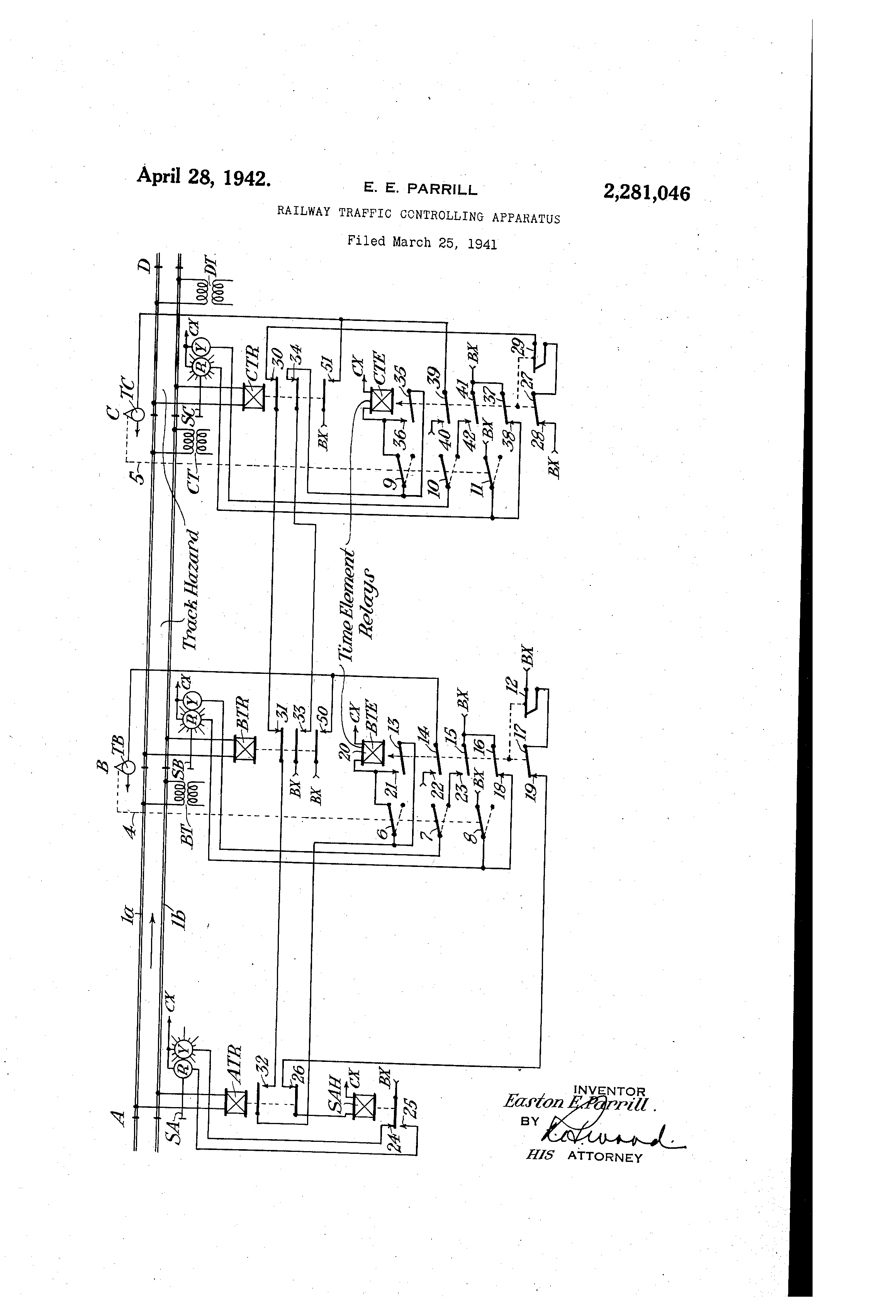 Patented Apr. 28, 1942 21281 046 UNITED STATES PATENT OFFICE 2,281,046 RAILWAY TRAFFIC CONTROLLING APPARATUS Easton E. Parr!H. Swissvale, Pa., assignor to The Union Switch & Signal Company, Swissvale, Pa., a corporation of Pennsylvania Application March 25, 1941, Serial No. 385,040 7 Claims. My invention relates to railway traffic controlling apparatus, and m6re particularly to train governing apparatus controlled accordin.@ to the speed at which a train approaches a designated locality. Vv'hen a train app,.,oaches the end of a track within station limits, or apprbaches the dead end of a track, a speed restriction for the train is required in order to avoid p6ssible overrunning of the track limits. Likewise at grades, con- @10 gested territory and like locations, it is desirable that the speed of a train passing through a track section in the approach to such a locati6n be at or below a predetermined value. In other words, it is desirable. that at least a predeter- @.15 mined period of time be consumed by a train in passing through a track section in the approach to a track hazard in order that a proceed condition of the signaling devices governing the movement of the train at such track hazard. be effected ' Accordingly, a feature of my invention is the provision of railway traffic controlling apparatus incorporating novel and improved means for controlling train governing devices according to the;"'3 speed at which a train approaches a designated station or location. Another feature of my invention is the provision of novel and improved means for reqliiring that a train consume a predetermined period of I" 'I@ time or more in moving through a given track section in order that a signaling device goveming the entrance of the train into another track section in advance be operated to a proceed @, : position. Again a feature of my invention is the provision of novel and inexpensive railway traffic contfolling apparatus of the type here contemplated for operating a time element relay when a train occupies the rear track section of two successive i4 sections and for including contacts of such time eiement relay in the operating circuits of an automatic train stbp and signal associated with the advance section of such two sections, and the usual control relays now provided are not re- @4i quired. Such time element relay is used to determine that a train consumes at least a predetermined period of time in traversing the rear track section. Still another feature of my invention is the j provision of novel and inexpensive means for railway traffic controlling apparatus of the type here involved wherewith a signal governing traffic in the rear section of two sections can be operated to a proceed position only if the signal ,5 @ 5 (Cl. 246-39) g6verning traffic in the advance section of the two sections displays a stop indication. The above features, as well as other advantages of my inventign wwch will appear as the speciflcation progresses, are attained according to my invention by providing a time element relay having a check c6ntact closed 6nly when the relay occupies its ira'tial position and front and back contacts which are operated after the relay has be6n energized for a preselected tiine interval, circuit means for energizing such relay, and train governing devices governed by the relay. Such circuit ineans is controlled by the track relays of each of two successive track secti6ns and by an automatic train stop associated with the a,dvance section of the two track sections. The operating circuit of the automatic train stbp and the operating circuit of a signal for the advance section include front contacts of the time element relay. A signal for the rear section of such two track sections is controlled over the check contact of the time element relay and hence the signal for the adva'nee@ si@ction displays stop in order for the signal of the rear section to display a proceed position. I shall describe one form of apparatus embodying by invention and shall then point out the novel features thereof in claims. The accompanyl'-ng drawing is a diagrammatic view showing one form of apparatus embodying my invention v,,hen used for governing an aut6matic signal and an automatic train stop for a stretch of railway approaching a track hazard such as, for example, a station or a descending grade or a congested territory. Referring to the drawing@ the reference characters la and lb designate the track rails of a stretch of railivay and whic rai s are forme by the usual insulated rail joints into consecutive track sections of a signal system and of @which track sections only three sections A-B, B-C and C-D are shown since these are sufficient for a full understanding of my invention. These track sections may be those in the apProach to a station or to a location of congested traffic or to a descending grade. The significant point about such stretch of railway track is that restricted speed is required for a train moving through these sections in the normal direction of travel as indicated by an arrow. Each section is provided with a signal designated by the reference character S, plus a suffix corresponding to the location of the signal. These signals may be 6f any one of the several types commonly used. In the present em- bodiment of my invention these signals are color light signals each of which is capable of displaying a yellow lamp Y for a proceed indication and a red lamp R for a stop indication. Automatic train stops TB and TC are located at the entrance of sections B-C and C-D, respectively. These automatic train stops may be any one of several well-known types ard are shown by the usual conventional symbol. Such train stops may be, for example, of the t,%roposition type covered by Letters Patent of tle Tfnited States No. 1,775,811, granted September 16, 1930, to John P. Coleman, for Railway traffic controlling apparatus. It is sufficient for this a.pplicatio,p- to point out that the trackway