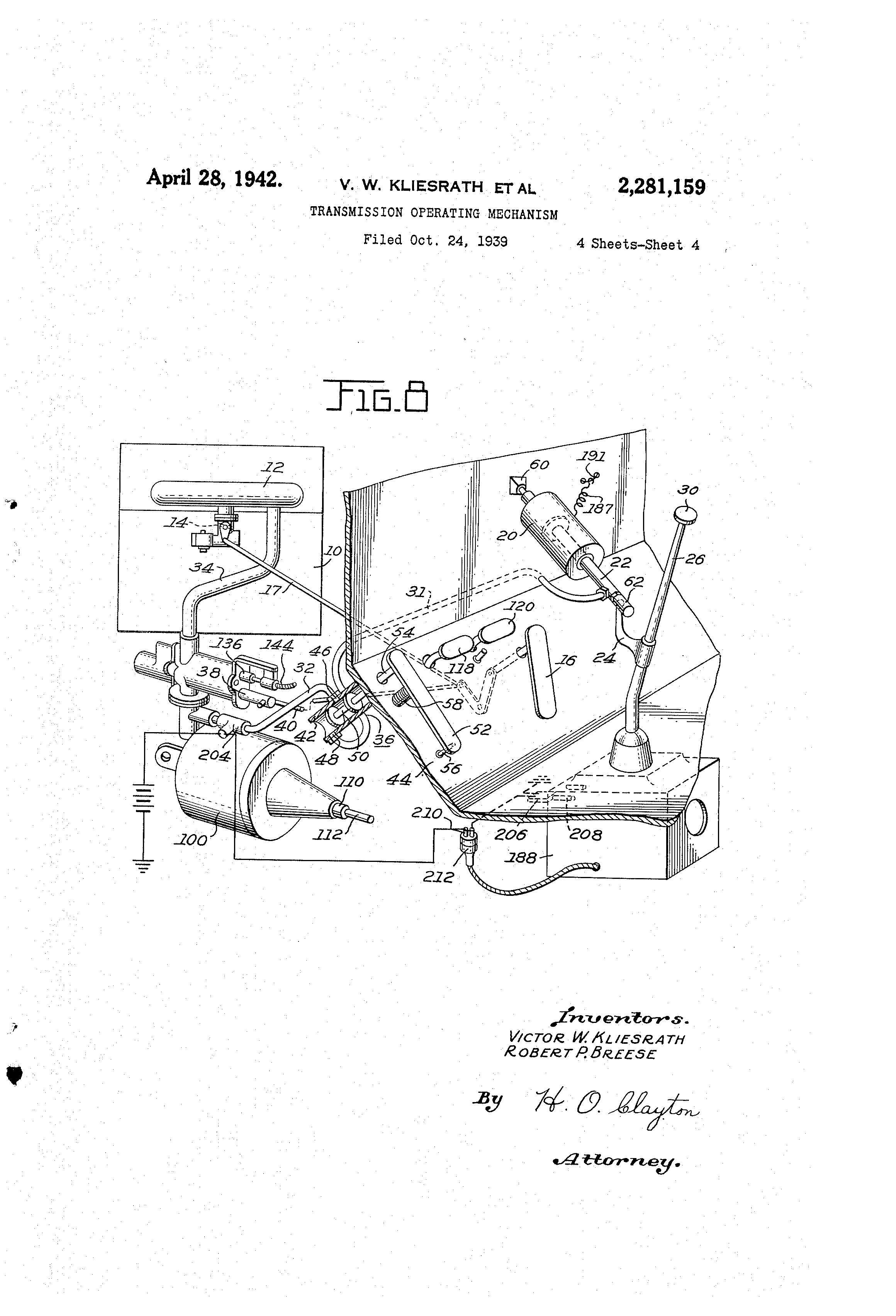 serves as a preselector means, for when it expands to move the valve member 14 to the post. tion disclosed in dotted lines In- Figure 2, the relay valve 91 Is then opemtlve, when the treadle 52 is again depressed, to effect either a bigh gear 5 or a low gear operation of the motor 20, depending of course upon the position, at that time of the shift rail selecting mechani= within iie t-an=Won casing. After the treadle 52 Is released, the driver then 10 depresm the accelemtor to effect an engageme , nt of the clutch as previously described and to, open the throttle to speed up the vehicle. Asssuming that a high gear setting of the transmmon is now desired, the driver then releases the accel- 15 erator to close the throttle to effect a partial evacuatio n of the intake nuwffold and, incidentauy, to effect a disengagement of the clutch. The manually operated treadle rnember 52 is then again depressed to open the valve 38, which Im- 20 mediately results in a @aru&l evacuation of the m6tor compartment 119. The aik passes from this compartment via duct 71, compartment 190, ducts 94 and 05 and tube 71. Air Is at the time admitted to motor compartment 189 vla port 194, 25 the Interior of connecung rod 22 and ducts 86, 18, 90 and 92. The piston 18 is accordingly again subjected to a differentw of pressures, resulting in its movement to the right, Figme 2, the force- - tran'smitti ng connections and the shift rail mov- 30 irig mechanism, including the member 28, being then actuated to place the transmiwlon In high gear. The valve parts then take the position disclosed in ftih lines In Mgur6 2. The transmibsion having been established in high gear, the 35 treadle 62 Is releawd, thereby closing the valve 36. This operat'@on, as previously desetibied, will 6.ff6et a venting of the motor compartment 192, re,.-ulting in an immediate expanslon of the sprin-L, 200 to preselect the valve 86 for a second gear 40 operation of the motor, the valve parts assuming the position digclosed in Mgure 3. There is thus provided means for effecting a shift from irigh gear to smnd gear and back again by merely, depressing the tieadle 52 Of 45 the mechanism of Vigure I or the clutch pedal 184 of the mechanism dmosed In Mgure 7. When the vehicle Is stopped, the transmission is then established in one or the other of these gear ratios, and If the vf,,hicle is equipped with 50 both a :Eilid clutrli and a spring operated plate clutch it wiU be umiecissary to disengage the latter clutch. Prefembly, however, the tranmission should be established either In second gear or in low gear in starting the vehicle, even If @-,5 the vehicle is equipped with a fluid clutch. Accordin gly, a Wenoid operated three-wav valve 204 may be incorporated either in conduit 32 6r in conduit 34 to cut off the connection with the manifold and vent the conduit to the (10 atmospher e when the vehicle is at a standstill or is traveling at or below a relatively low speed and the transmission is established in second gear. The solenoid may be controlled by a switch 206 operated by the second and high gear shift . 65 rail 208 and by a switch 218 operated by a propeller shaft operated govemor 212, said switches being coi@nected with the soienold in series so that both switches must be closed to energize it wiU also be noted that with the mechani%m of our invention the driver Is at aU thnes'advised df the then existing setting of the transmission, for the driver has but to glance at the knob 30 toldetermine Its pwition. If desired, the-driver may at any time elect to operate the transmission by manually operating the member 28, the motor and the niechanism housed therein being con. structed to make this poulble;. for in this event the motor swivels upon the pivot 60 and the pis. ton,18 and the valve 96 move back and forth as the knob 30 is being moved As stated supra, the.valv;s 38 and 136 and the clutch operating motor 100 may be eliminated and the conduits 32 and .34 joined to provide but one conduit Interconnecting thd manifold and the valve 36. The accelerator operated throttle and the valve 36 then become controls for initiating an operaltion of the power means for actuating the transnilwion operating mechanisnl Purthemore, the clutch pedal operated out-in valve 36 may be omitted, thus making of the accelerator a control member cooperating with the power operiited relay valve 90. for preselecting the operations of the motor 20, for, after t-le transnil,@zion has been placed in gear, the acce-erator Is then depressed, thus Increasing the gas. eous pressure wi-thin the intake manifold and pemiitting one or the other of the springs q96 and 200 to operate the valve 96. @ In starting the vemele, should the driver desire to place the trf,@nsmission In low gear or in reverse gear, h6, may do so by first manually moving the niember 20@ to the left @La select the low and i-everse gear sbift rail of the tronsniibsion and then inonuf@lly nioving said member and the rail connected thereto in the direction to establish the desired gear retio. There is thus provfded a slmple and efficient transmission operating mechani-sm for opprating a standard type of transmission, gaid merhpijlgn-i including two foot operated members, the accelei,ator, a treadle or the clutch pedal and a hand operated member. The driver of the vidhicle may elect to completely operate the transnilssion manually or, with the exception of the bross-shift operation of selecting the low and -Ieverse gear shift rail, he may operat-- the transmwion by -the power ineans, and as the power rieans is operating to move the shift rvil the driver may aid said means by a maniif?,l operation of the knob 30. After the transmission has been placed in low gear by the physfeal effort of the driver, it is thereafter placed in second gear and then In high gear upon release of the accelerator and depression of the remaining foot operated control member, that is, either the treadle 52, disclosed in Pligure 1, or the clut
