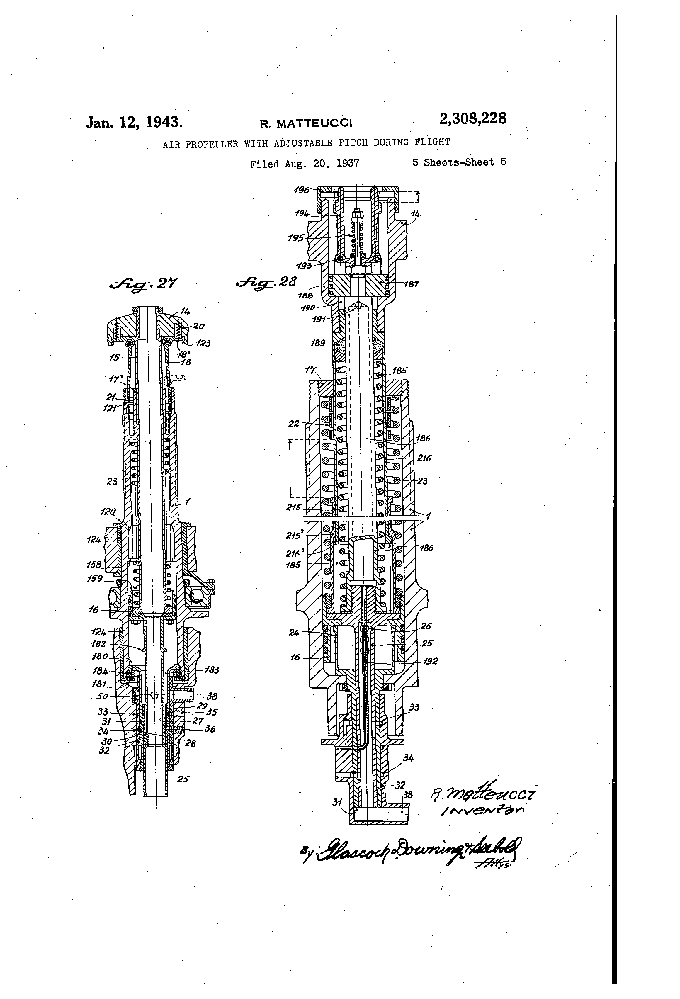 Patented Jan. 12, 1943 2@3089228 UNITED STATES PATENT OFFICE 2,308,229 AIR PROPELLER WITH ADJUSTABLE PITCH DURIING FLI[GEET Raffaele Matteuccl, Turin, Italy, vested in the Anen Property Custodian Application August 20, 1937, Serial No. 160,170 li@ Ualy August 31,1936 17 Chams. (Cl. .170-135.6) The present invention.relates to a propeller, the pitch of which can be varied during flight and which is more particularly intended for use in aviation, the propeuer being such that it is possible to effect the variation in pitch under such 5 conditions as to obtain at will any one of a number of fixed pitches, and in addition, if desired, an infinite series of pitches between two "flxed extreme propulsion pitches, and also a,certain number of auxiliary pitthes capable of being uti- 10 lised under spepial conditions of operation bf the aircraft. In the propeller according to the pie@ent invention the control of the pitch of the blades is effected by the aid of fluid under pressure, the 15 action of which is controlled by the pilot, if desired with the assistance if desired of an auto- , matic regulator controlling the variation of the pitches in the field of the pitches used for the propulsion and which, for the intermediate -pitches 20 between those determined by mechanical stops maintains the blades in conditions of equilibrium in the different -desired positions in opposition to a return member which tends to bring the blades to a deter-mined pitch used normauy for the pro- 25 pulsion. Certain pitches, which due to the effect they exert upon the operation of the aircraft, @must be used only under certain conditions or in certairi predetermined relationship with the operat- '0 ing conditions of the engine driving the propeuer, are made dependent upon a particular control which in its tum is connected to suitable safety devices, with a view tG preventing accidental or dangerous manceuvres. Some embodiments of the present invention ari@ inustratea by way of example in the accompanying drawings. - ngure I represents in diagrammatic cross seetion the propeller shaft-with the .root of a blad4e 40 and the pitch varying'device which in the case inustrated is placed in the propeuer shaft, in combination with a number of controuing safety devices. Mgure 2 is a diagrammatic plan view of the 45 ro6t of a blade with its actuating device, and gives an indication of the various pitches that can be obtained. Figures 3, 4, 5 and 6 illustrate diagrammaticaby the relative conditions of a propeller blade, of 50 the balancing counterweight and of. the controlUng device iihder different pitch conditi,ons. FU-ures 7, 8, 9 and 10 illustrate in part section and oil a large-r scale' the coiiironing distriba@torunder various operating conditions ;)5 Pi - gure'll is an enlarged sectional view of apatt ' of Fig. 1 showing a pawl device applied to the blade actuating member with the object of maintaining it in a fixed position. Figures 12, 13 and 14 illustrate in elevation, in part section and ln'detail, an asseinbly arrangement of the members actuating a propeller blade. , Flgure 15 illustrates diagrammatically an arrangement'for regulating the angular position of a blade relative to its actuating member. Figure 16 illustrates in longitudinal se6tion a @ontrouing device adapted to art upon the conditions of operation of, the carburettors of the engkne and in general upon the supply of fuel to the engine, in a manner which is dependent upon the conditions of operation In which the properer has been placed. Flgures 17 and 18 illustrate resp@ectively a vie* from the left hand erld and a cross section on the line I Bx- 1 8x iii Figure 16. Figure' 19 is a section of an automatic discharge vent employed in the air cotitrol piping. Flgures 20, 21 and 22 illustr-ate a device for obtaining a reciprocal lgcking action between a control for the propeller and the control for the carburettors or for the supply of fuel to ihe engine. i-igures 23 and 24 iuustrate in section along the line, 23x-23.t in Ogure 24 and along the line 24x-24x in Mgure 23, an arrangemlint for regulating the control slide valve. . Mgiire 25 ibustrates diagrammatically a simplifled embodiment of the device for controlling the pitclx of th@-propeller blades. Plgure,26 illustrates a t@@ of propeller according to the invention, pro,@ided with another type of Pawl device, adapw to secure the propeuer in various pitch positions. Figure 27 JJlustrates thE, pr6peUet ac6ording to the invention, constructed iii such a manner as to peMAt firearms to be flred tlirough the propeller shaft. Mgure 28 ibustrates ariother embodiment of the properer. With the propeller according to the present invention it 'is possible to obtain a plu@ality of con. ditions of pitch. Tne various pitch ELrrangementr, are as follows: Three or more fixed propeller pitches and In particular a high pitchla mean pitch and a low pitch, and if desired intermediate pitches between the fixed pitches. Reversal of the pitch combined with the automatic opening of the fuel to the engine wmch driv6s the propeller for the purlbose of exerting