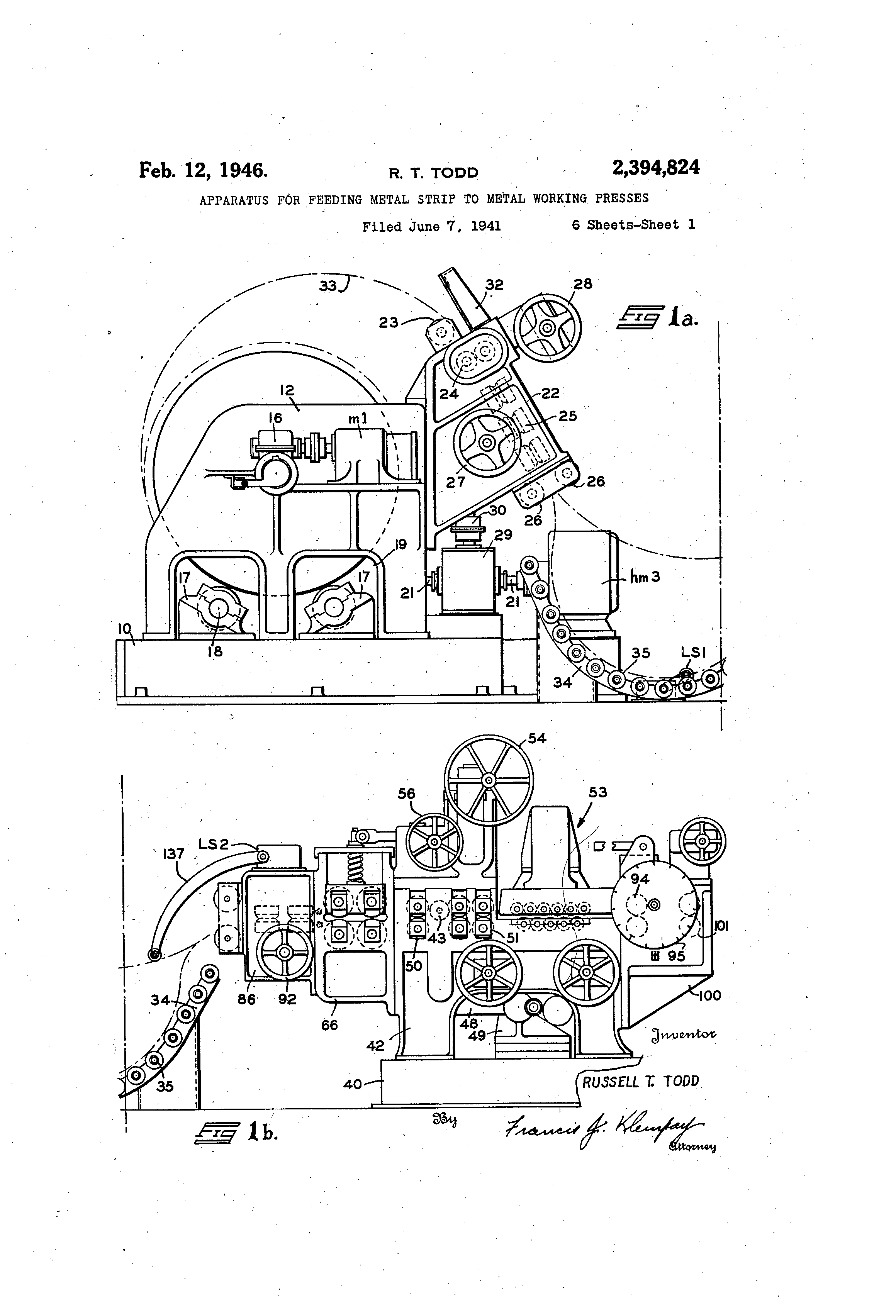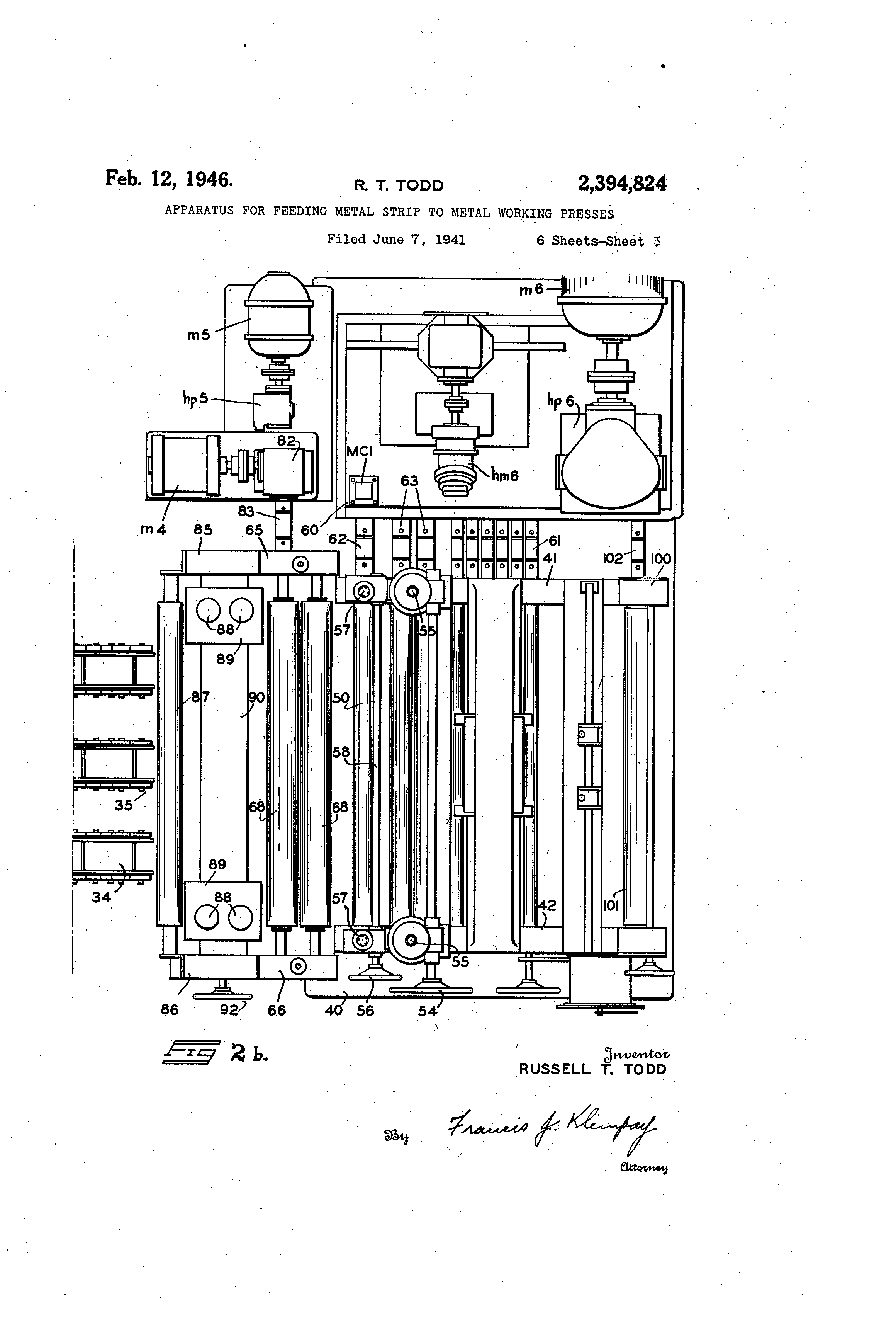 of sgd measurim device to diwonnect the output of sgd p=p from said motor. 8. Appamtus amrding to claim 7 further, ln-@ cluding means to control and adjust the drift of .said rolls upon actuation of said disconnecting meazis, 9. Apparatus amrding to claim 7. further including a closed path through which the fluid contained In said motor upon, actuation of said disconnecting means mav circulate, and means to vary, the resistance of flow of the @last mentioned fluid through said closed pwsage. 10. In apparatus for conditioning and feeding metal strip to a mptal working press and the like the combination of a strip uncoiler having means to support and rotate a coil of strip, a processing unit having a worldrig roU adapted to be moved through the plane of the strip pass through the appa,ratus to @ubject the strip to severe reverse ,bendings as it passes through the appamtus and roller leveller, a loop pit adapted to receive supply of strip positioned interinediate said unco,Uer and said procming unit, and means responsive,to the position of the strip loop in said Pit to interrupt the operation of said first mentioned rotating means when a pridetermined supply of strip Is deposited in said pit. , 11. Apparatus according to claim 10 fulther Including a pinch roU interinediate said working roll and said roller leveller to draw the strip over said worldng roll, means to rotate said pinch rolls and the rolls of said roller leveller in unjson, and means responsive to a second position of the strip in said pit to interrupt the last nientloned rotating means when the supply of strip In said pit is deficient. 22. In apparitus for feeding, metal strip to a metal worldng press and the like a strip uncoller comprising in combination a pair of cradle rolls adapted to support and rotate a coil of strip, a pair of pinch rolls positioned above and to one side of said cradle ro]Us and arranged to rotate about spaced parallel axes parallel with the axes of rots@tion of said cradle rolls, the pass plane. of said pinch rolls being adjacent th6 outer Periphery of a coil supported on said cradle rolls and being substanti&Uy tangent to the strip emanating therefrom along -a short spiral curve extending downwardly,and outwaidly from a line Positioned centrally above and parallel with the ar,es of said cradle rous, and,means to drive said cradle rous and said pinch rolls in tir@on. 13. Apparatus according to claim 12 further including a downwardly looped roller table positioned below and to one sid6 of sald pinch Yolls to receive the strip imuing from said pinch rolls whereby the strip Is caused to follow an S-c' urved path as It comes off a coff guppdrt on said cradle ions. 14. In epparatus for uncoiling and feeding-metal strip to a metal working press and the like which requires a predetermined length of strip in each cyple of opemti6n the 'combination of an uncoller Itiaving'means to support and r'otate a coil of strip, means comprising a switch responsive to the position of &.loop In the unegiled strip aWMmt the u'neoller to interrupt said rotating means upon said loop @attaining a predetermined size, a Pair- of pinch rous to receive the strip from said loop and move the same Into said press and the like, means responsive to the lezim of, strip P"sing through said pinch rons to JaWrrupt operation of mdd'rolb upon sMd predetermined lenoth of aWp being fed, and means re-' sponsive to a shortened condition of said loop to -stop rotation of said pinch rolls when the length of strip in said loop reaches a minimum value. 15. IrL apparatus for conditioning and feeding metal strip to a nietal working Press and the like the combination of a strip uncoiler having means to support and rotate a coil of strip, a strip proc10 essing and levelling unit having means to drive the rolls thereof, a loop space between said uncoller and said unit, means including a switch in said space adapted tobe aetuated by the attainment of a strip loop of prddetermined propor15 tions to lnte@mpt operation of said coil rotating 'means, and means Including a second switch in said space operable upon a predetermined decrease In said loop to interrupt the operation of said coil rotating means and of the means to 2o rotate the rolls of said unit 16. In apparatigs for conditioning and feeding metal strip to a metal working press and the like the comnnation of a base, a pair of spaced parallel housings mounted on said base, pairs of pinch 25 rolls Joumaled in said housings to guide the strip horizontally through the apparatus, a working ron adapted to be moved through the plane of the strip pass whereby the strip is subjected to severe reverse bends as it passes,through said 30 apparatus, a rouer leveller having its rolls journaled in said housings and being ol>emtive to level the stn'p, after It pa'ss;es over said working, roll, one of said pairs of pinch rolls belng positioned intermediate said *orking roll and said 35 leveller, means to rotate the rolis of the said one of said pairs of.pinch rolls and the rous of said leveller, a strip ipeasuring roll journaled in said housings, and means@, operable in response to a predetermined rotati-on of said measur-ing roll 40 to interrupt said rollrotating mesns' 17. In appamtus for conditioning and feeding metal strip from coill'of such strip directly to a metal working press and the Hke which requires a predetermined length of SI,@p In each c'ycle of 45 operation the com-bination, of a strip une6iler having means to -upport and rotate a coil of strip and further means responsive to the position of a looped portio-n of the strip as it leaves said coil in control of said rotating means, a processing .5o and feeding unit positioned lmmediately b6YOnd said means and having a working roll adapted to be moved through the plane of the strip pass, to subject the strip to severe reveise bendings and a roller leveller, a strip ineasuririg deviee immedi55 ately beyond said leveller and adapted.to control the iotation