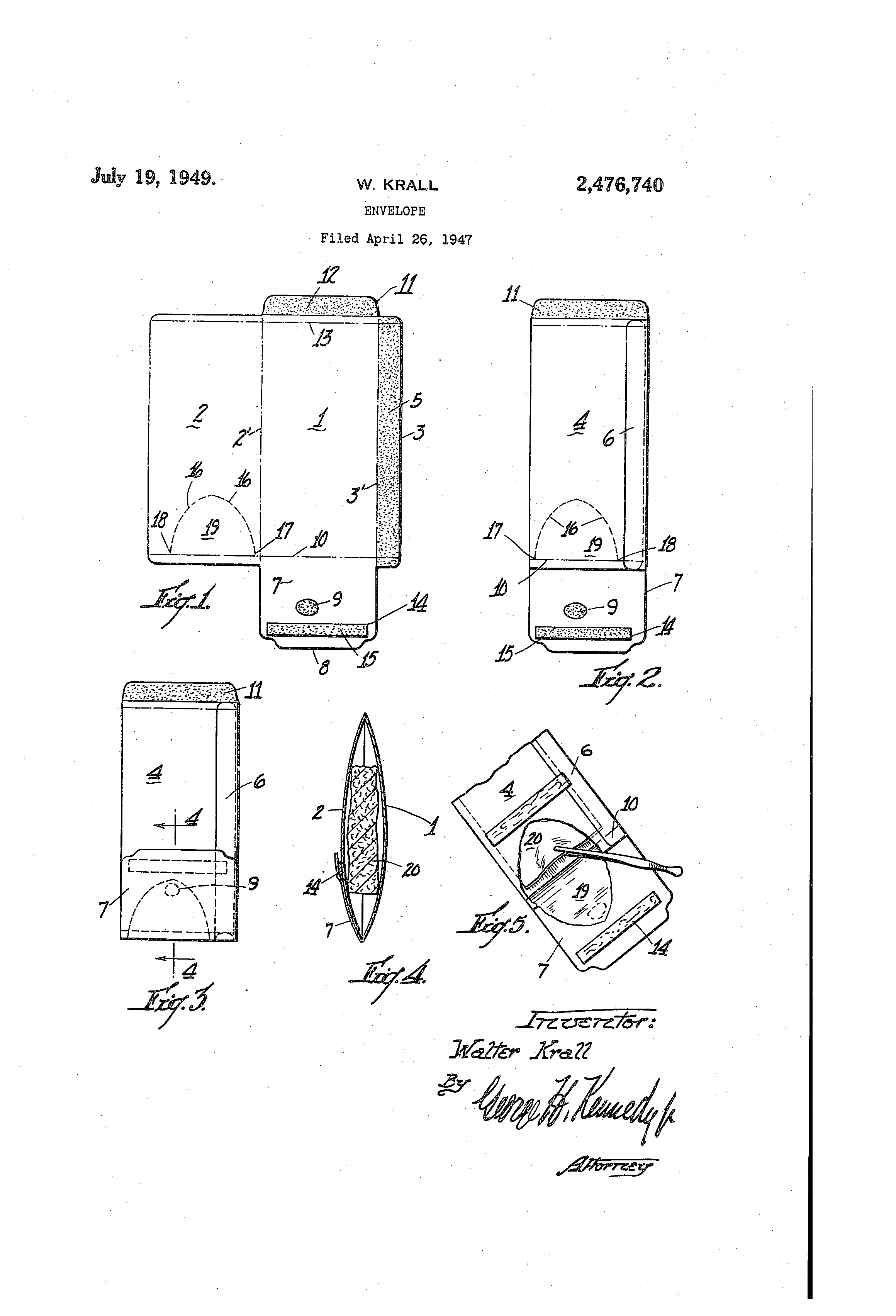 claiin: As a- new artdcle of manufacture, an envetoge made from a o-ie-pi-ece blarilt safd btank betng glued and folded'to igrm oppa@site front and re:D@r wallsliaving, a pocket space between them- the lQw. er encf of said. pocket@ spact beinit, clased by tlansverse cTouble-tTaickness f6rct of the materfat bf bathofsaicl-'v,,aIls, said blarik. includitig Tieyoitcr said- fold an. integral ext6nsion of, the.'ffoiit wor portion including a partfalISr.@severed area formed by two upwardly convergent' lines, of' slitg that start from Wfdely spac7ed pofnt.%'on @sal(t@ tronsverse fold,, said- area. befh&r adhesfvel@- conrrected adjaceftt the conv-ergence ofsaicf hnes of slft@5 with said extension, a-nd 9 layer of- loose.;ftbrecr material adhesively interposed between. said extension and -safd r'ear watr lieyoncf s-afd, c(ynvergent, lines of- slfts-. saict iciosefrlbre&- matbrifrf being 1-n,,vard of'thff free edg@@ of said extensiun,, to leave the latter, as oL pitn ta-a for, the openfng- crf the lower end of said pocket- sprace-. W A L T E R E M A L L @ , REFERENCES@ CIETED The fqllowing,, reterentes, arL, oiC recor& fiL the file ot tbis. patent.:. UT,=, D@STATES@PATEN',M. Niimber N=e Date - 1.,,972,995 Irrgang ----------- Sept. ri- 1934% ff,001,340' Bear et ar ------------ Miiy 14,,193& 2@218fi7O Bennett. -. -------- Oct. 2Z, 194CP ever-, this protection involves uo Gbstact@ t(:L quick,@ 3,5 -materi&L whfch overraps and covers'a substantiaf access, t@o said, aa@UdiE@, wherx its', paxtiori- of' safd rear walr, said I coVereT r@ar walt