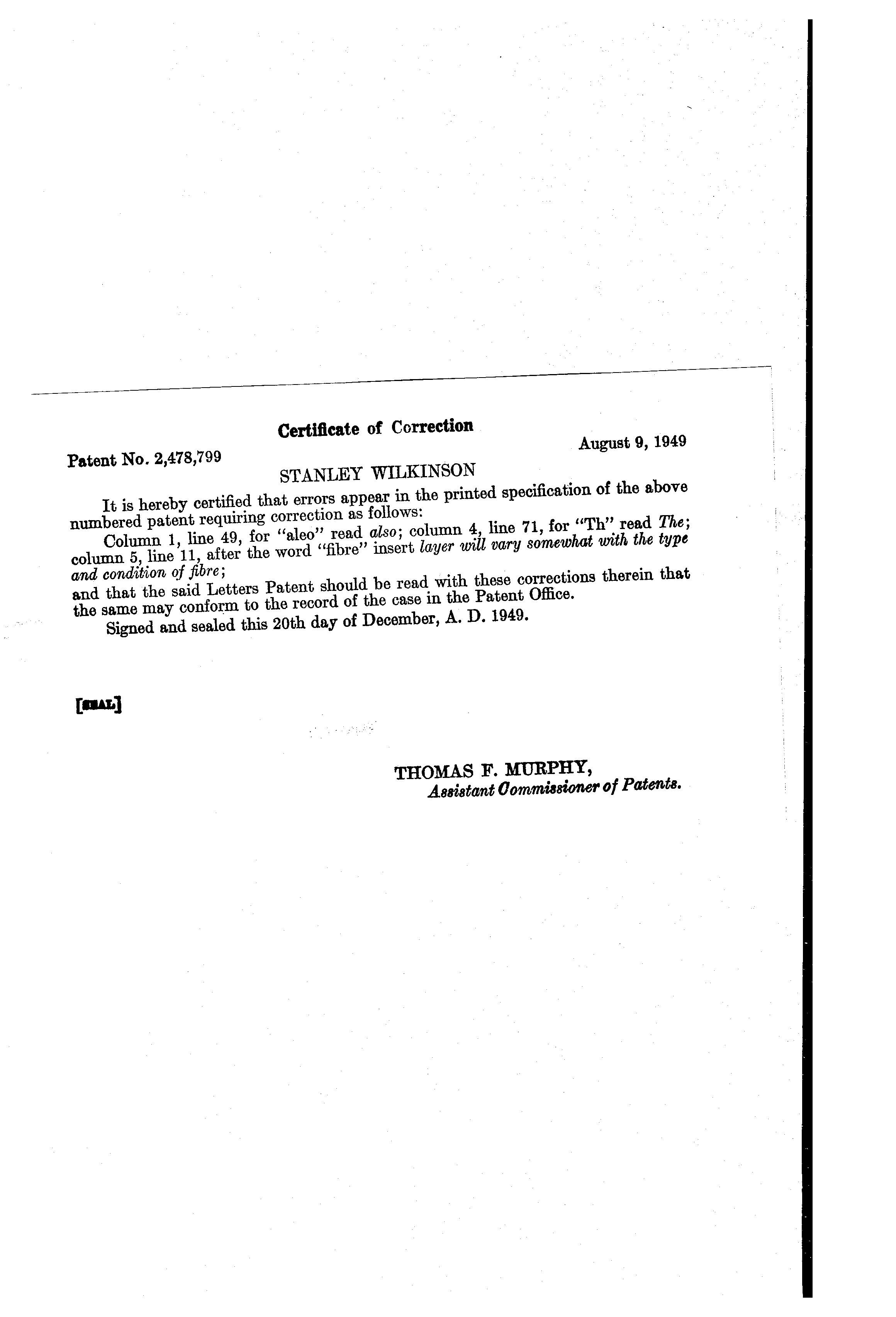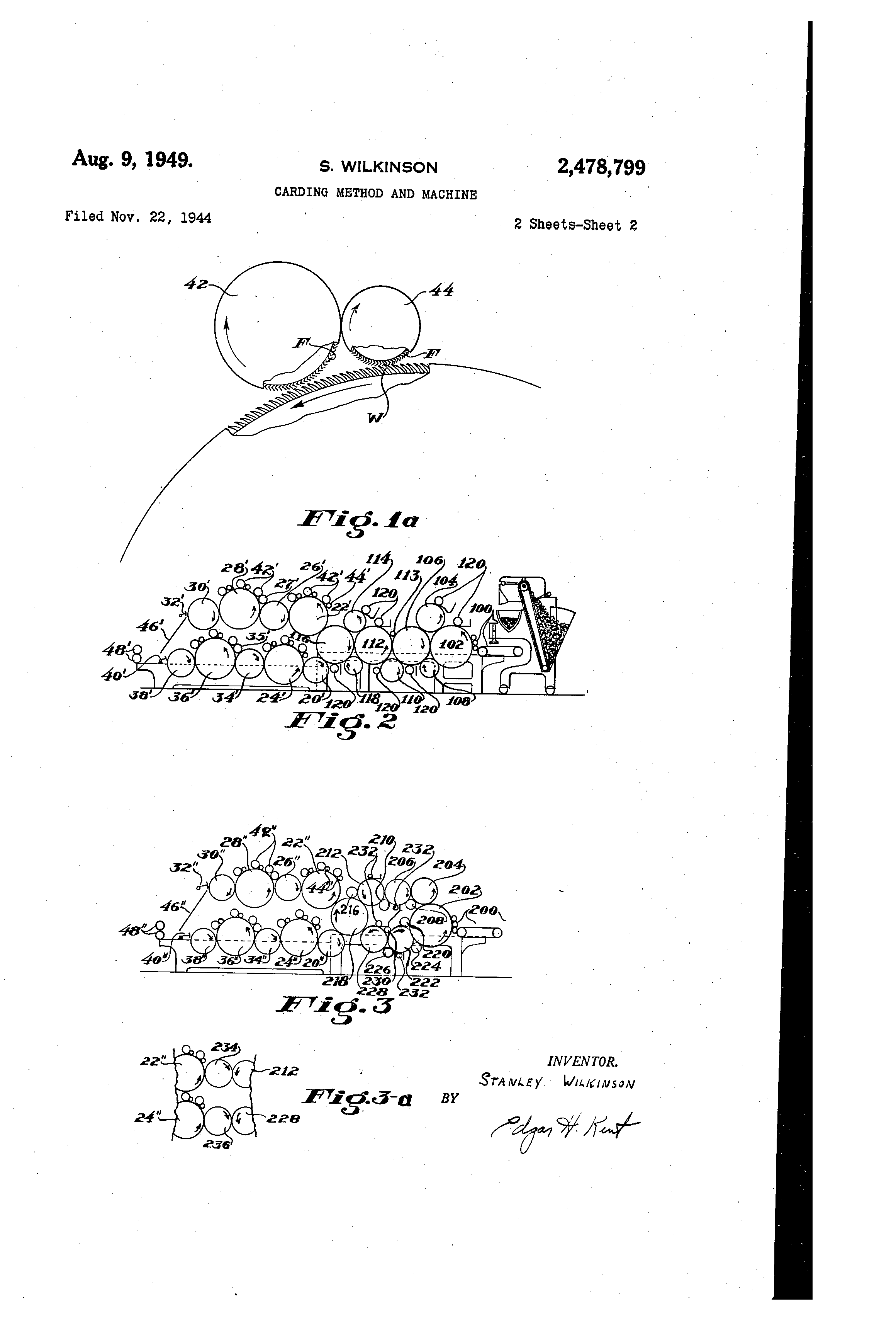 claim:i 6 wherein @ said splitter means separates @the: fibre @-lay4er into-two fibre streai-ns epch of approximately -,@,hal f,@.the.-thickness and, flbre. content of the -initial .1a,@er. ,.Iniev,ns@ for -simaltalieously operating.@said-two.,sets - 175 -@9@, -Carding:@-apparatus as claimed@@,in @claim.@ 6 g means,associated with- said cyli @.,in nder-land loated's,bove'the same, ea;ch@ including a-.work erroll comb a portiori. of-the' flbre@stream ,.from, @the cylinder; and means@ for, stript-)ing@-t@ie @,@to:.the.cylinder-. at @the side: of the@.-worker,@roll ,,,@toward whieh 'the rotates, Splitter, means @,-IocELted@@ between- said @ feeding means snd @'said .@tylinders@:for separating said unitary -layer@,of r,fibres-into two'fibre streams 'each of substantially 170- @,uniform@lesser thickness than said layer! and f-Dr t.Itrarmf erring 4 one- of@ sgid fibre streams.@ ontc, I one -@@of s-aid @ cylinders @ and@ -the other of said@@ fibre ,@-Isty-eams;. onto the@@other,one@ of, said cylindersi and 9 wherein said feed means includes a toothed surfaced rotary drum for advancing the fibre layer on its said surface and said splitter means comprises a toothed surfaced rotary roll associated with said drum and rotated about an axis parallel to the drum axis in the same direction of rotation as the drum, said roU and said drum both having the teeth of their toothed surfaces pointing in the direction of rotation thereof. 10. Carding apparatus as claimed in claim 6 wherein said carding cylinders have a diameter substantiauy less than four feet. 11. The combination with fibre opening mechanisr@i which includes means for feeding a unitary layer of the fibres, means for splitting the layer into two fibre str6ams each of lesser thickness than said layer and means for advancing said st,reams in verticauy superimposed paths while treating each streamseparately to open the fibre thereof, of two sets of carding mechanisms disposed one above the other, each set including a rotary carding cylinder ad2ipted to carry upon its surface, above and partially about its axis, a stream of fibres to be carded, and a plurality of fibre working means associated with said cylinder and located above the same, each including a worker roll operative to comb a portion of the fibre stream from the cylinder and means for stripping the fibre from the worker roll and for returning it to the cylinder at the side of the worker roll toward which the cylinder rotates, means for transferring one of said streams of opened fibres onto one of said cylinders and the other of said streams onto the other said cylinder, and means for simultaneously operating said two sets of carding mechanisms to separately card said two flbre streams. 2,478,799 10 12. The method of treating wool ana other flbres which comprises feeding a layer of the fibres to be treated, splitting from the layer two fibre streams each of lesser thickness than the r alo .) initi al layer, advancing said streams ng separat e, vertically superimposed paths and while so advancing said streams separately simultaneously subjecting each stream to the action of fibre opening mechanism, then separately 10 simultaneously carding each stream by carrying the stream on a carding surface past successilve ilbre working zones and in each of said zones combing off an outer upper portion of the fibre stream from said surface and recirculating said 15 portion beyond and above said surface to the combing off point by depositing it on a preceding part of the stream. STANLEY WILKINSON. 20 REFERENCES CITED The following references are of record in the file of this patent: UNITE D STATES PATENTS 25 Nu mber Name Date 2 1009,282 Thibeau ----------- July 23, 1935 2, 115,605 Allenet al ----------- Apr. 26, 1938 2, 189,519 Harrison et al - ------ Feb. 6, 1940 30 FOREI GN PATENTS Nu mber Country Date 96,167 German y ---------- Feb. 19, 1898 193,80 7 Great Britain ------ Aug. 23, 1923 380,01 1 Great Britain ------ Sept. 8, 1932 35 Certfflcate of Correction Patent No. 2,478,799 STANLEY WILKINSON It is hereby certified that errors appear in the printed specification of the a:bove numbered patent requiring correction as follows: Column 1, line 49, for "aleo" read also; column 4, line 71, for "TW' read The; column 5, line 11, after the word "fibre" insert layer will vary somewhat ivith the type and condition ojfibre; and that the said Letters Patent should be read with these corrections therein that the same may conform to the record of the case in the Patent Office. Signed and sealed this 20th day of December, A. D. 1949. August 9, 1949 THOMAS P. MURPHY, A88i8tant Oommisa~ of PatentB.