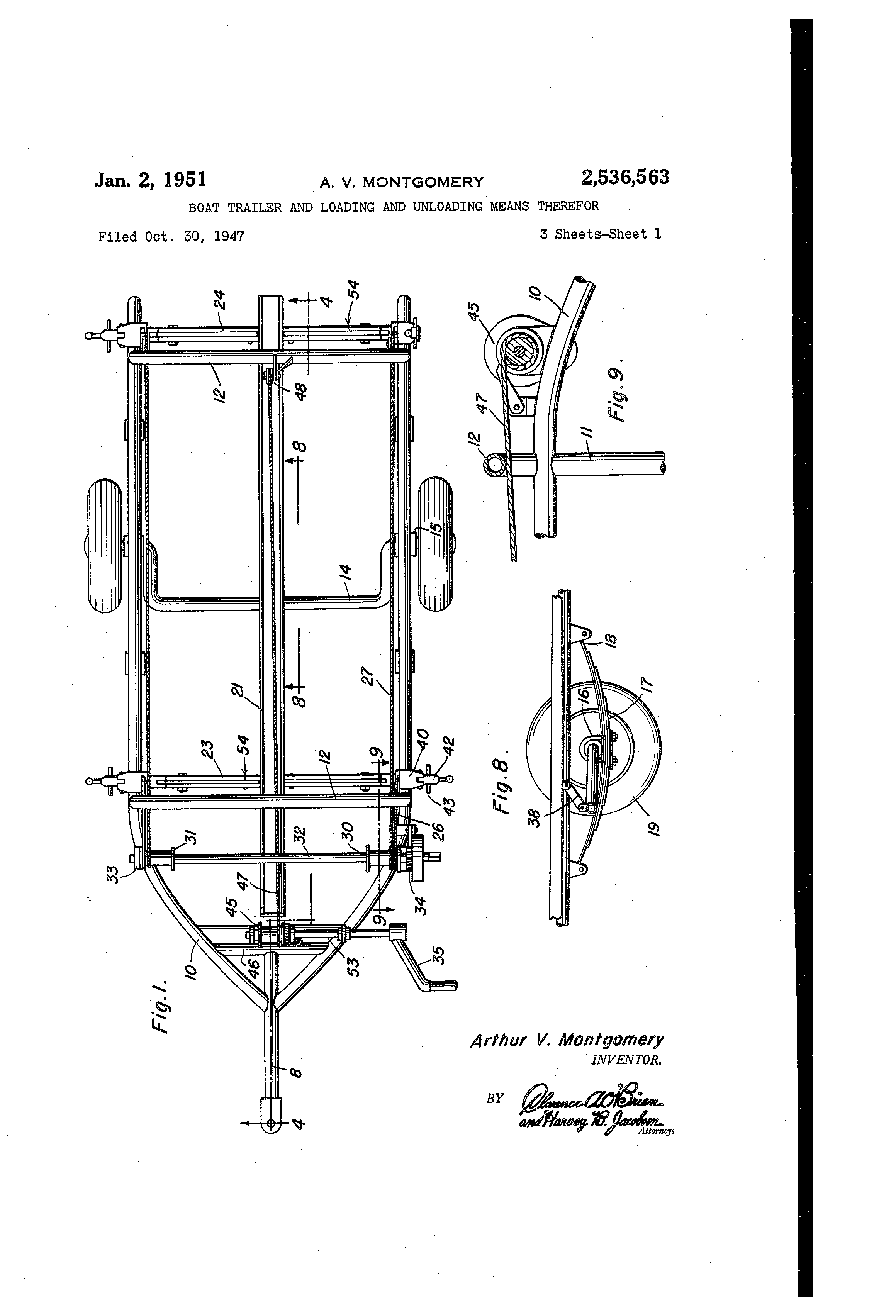 Patented Jan. 2, 1951 295369563 UNITED STATES PATENT OFFICE 2,536,563 BOAT TRAILER AND LOADING AND UNLOADING MEANS THEREFOR Arthur V. Montgoniery, Sinton, Tex. AppHeation October 30, 1947, Serial No. 783,045 8 Claims. (Cl. 214-65) 2 The present invention relates- to new and useful improvements in boat trailers and more particularly to means for loading and unloading a boat on the trailer. An important object of the present invention 5 is to provide a boat cradle including a full keel support for a boat to keep the keel from sagging while supported on the trailer. A further object of the invention is to provide means for raising and lowering the boat cradle 10 while loading and unloading the boat on the trailer. A stM further object of the invention is to provide winch means for sliding a boat onto the boat cradle for loading the boat thereon in shallow 15 water and also for sliding the boat off of the cradle for unloading the same into shallow water. A still further object is to provide a boat trailer of this character of simple and practical construction, which is strong and durable, efficient 20 and reliable in operation, relatively inexpensii?e to manufactu re a-nd otherwise well adapted for the purposes for which the same is intended. Other objects and advantages reside in the details of construction and operation as more fully 25 hereinafter described and ciaimed, reference being had to the accompanying drawings forming part hereof, wherein like numerals refer tD like Figure 2 is a side elevational view; Figure 3 is a rear elevational view; Figure 4 is a longitudinal sectional view taken on a line 4-4 of Mgure 1; Figure 5 is an enlarged fragmentary sectionai 35 view taken on a line 5-5 of Figure 2; Fligure 6 is a similar view taken on a line 6-6 of Flgure 2 and showing the locking means for the cradle lifting strap; Figure 7 is a side elevational view of the cradle 40 locking means; and, Figures 8 and 9 are fragmentary longitudinal sectional views taken respectively on the lines 8-8 and 9-9 of Mgure 1. Referring now to the draviings in detail wherein 45 for the purpose of illustration I have disclosed a preferred embodiment of the invention the numeral 5 designates the trailer fra-me generally and which is preferably constructed of longitudinally extending tubular frame members 6 converging .50 at their front ends as shown at 7 and provided with a tongue 8 for towing the trailer. Side rails 9 are forrned by bending the rear en& of thelongitudinal frame members 6 upwardly and for,wardly above said frame members and inclining t-he front ends of the rails to join with the frame members as shown at 10 and welding the same thereto. Posts I I supp(>rt the front and rear ends of the rails on the frame members. Inverted U-shaped cross frame members 12 have their lower ends welded to the rails 9 immediately above the posts I 1. A U-shaped or crank axle 14 is formed with outwardly extending ends 15 pivotally supported in spring saddles I 6 at the central portion of leaf springs 17 which have their ends secured to the underside of the frame member 6 by conventional shackles or brackets 18. The central portion of the axle 14 is swingable ver'Lically substantially in the arc of the outer periphery of wheels 19 journaled on the axle extensions 15 whereby the central portion of the axle may be lowered on the ground when loading a boat on the trailer. A boat cradle designated generally at 20 . ineludes a channel-shaped keel 21 extending longitudinally at the center of the frame 5, the front end of the keel support or seat 21 being curved keel support 21 and are welded or otherwise suitably secured thereto' To. the outer ends of the cross braces 23 and 24 are welded or othel-wise suitably secured the lower ends of metal lifting straps 25, the upper ends of the front and rear lifting straps having cable.% 126 and 27 attached respectively thereto and are trained over front and rear puileys 28 and 29 secured respectively to the front and rear portions of rails 9. The cables 26 and 27 at each side of the frame are attached to driuns 30 and 31 suitably secured to the opposite ends of a transverse shaft 32 for winding the cables on the drums. The shaft 32 s supported in bearings 33 suitably secured to th6 front ends of the side rails 9. The drum 30 at one end of the shaft-32 is pro@vided with a conventional pawl and ratchet riie6hanism 34 and t-he shaft is rotated by means@ of @ 6, parts throughout, and in which: 3. upwardly as shown at 22. Front and rear cross Flgure I is a top plan view; braces 23 and 24 extend transversely under the