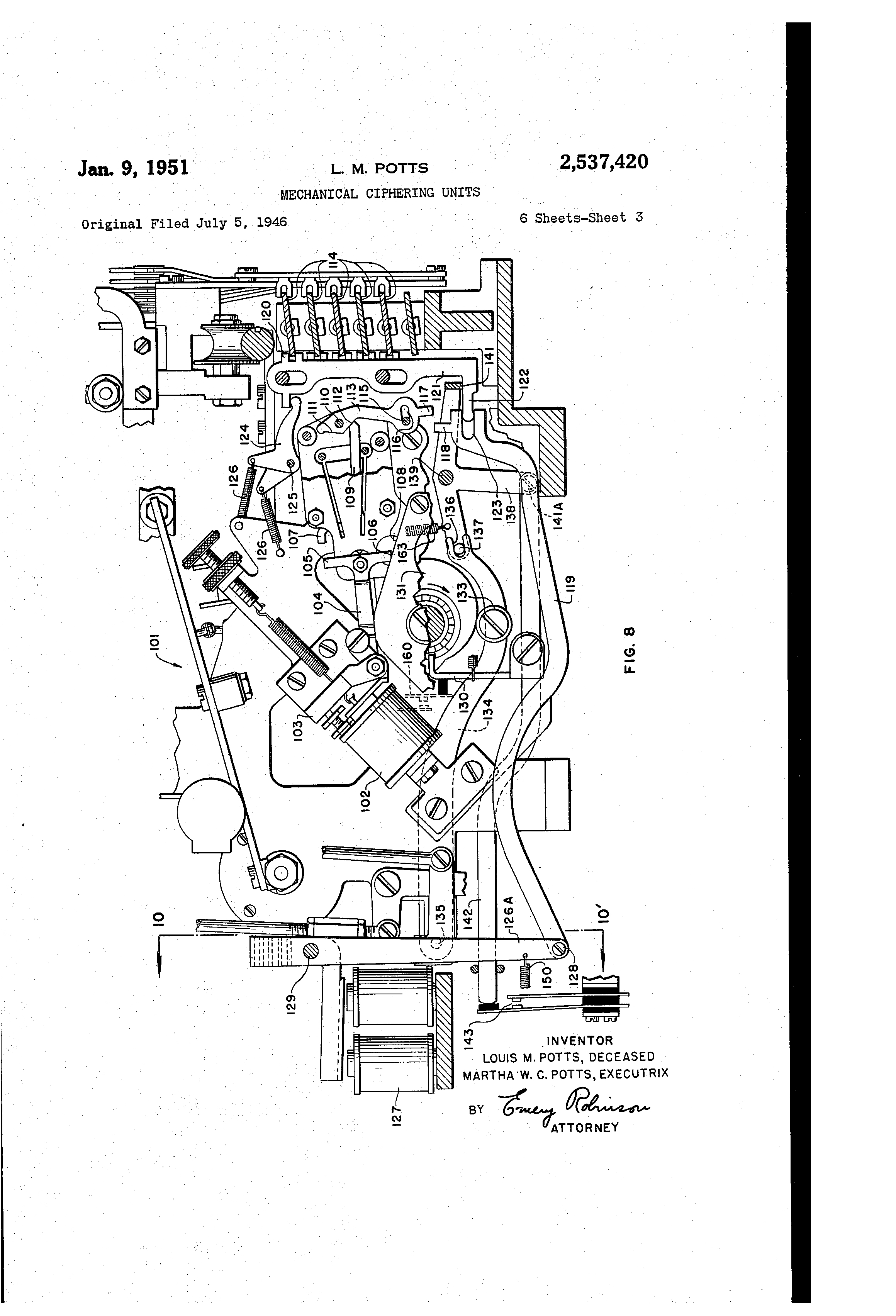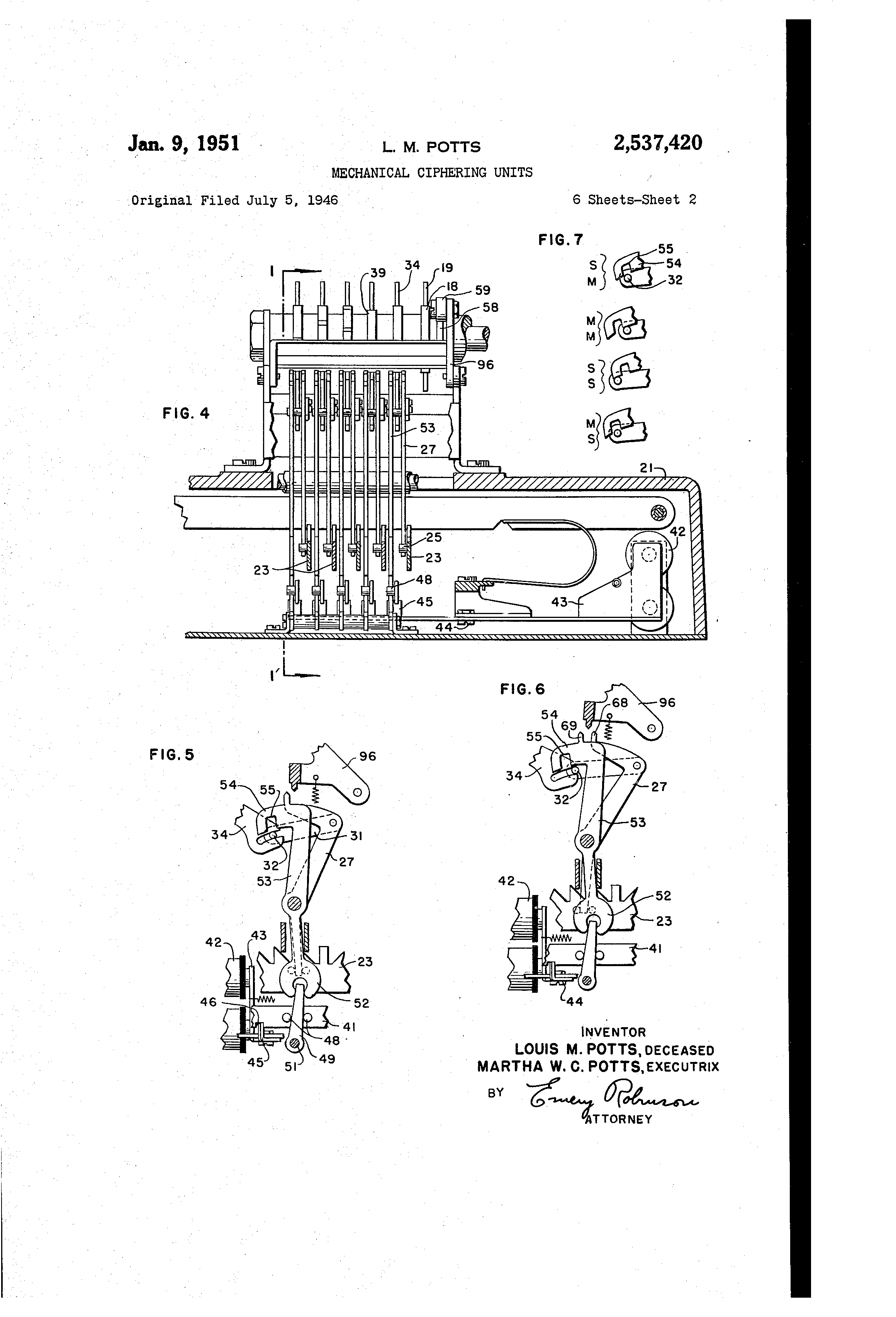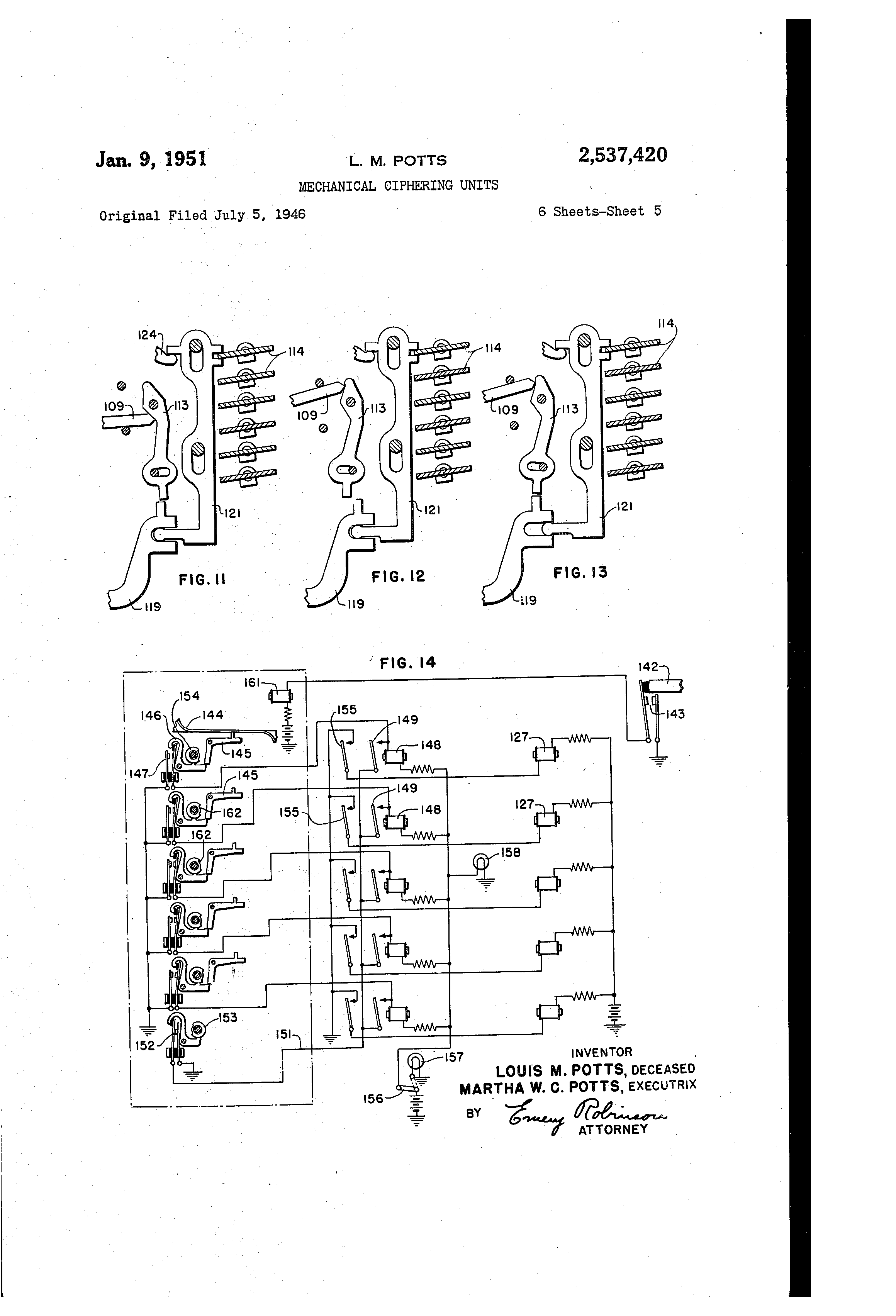claims, What is, claimed is:: 1. A ciphering selector for a transmitter., com-@ prising, a plurality of slidable perriutation, bars operable according to, original. code combinat'ons, an equal nuniber. of selecting: levers 'controlled bk said permutation bars,, a, like number, of. key signal responsive code magnets, a series ot &Iid,able ciphering Lars@ controlled- by said, coding magnets,, a plurality of ciphering levers iiadivkdttally associated with said ciphering bars, aL -zet of transmitter levers: operable uiider the joint control, exercised thereover by said se:iectirlg fin@ gers and sadd ciphering levers and means coatrolled during, the@ transmiss,,'Dn of one- resultant signal cqde combi-nation by said, tran,mitting levers for energizing said code magnets, in aecordance. with. the next key code combination for thereby setting said, ciphering bars for- th-e next operation. - 2,.@ In a ciphering selector, f or a printer,. a selector magnet for receiving incoming. signals- inr eluding a set of swords- controlled- by said. mag@ net, an equal nlmber of levers controlled by said swords and having interfering, m@embers carried thereby,, a. set of, key signal controlled. coding rnagnets,, a plur-ality. of ciphering slides operable by said coding magnets. and having interfering members, a set of printer selector vanes, means controlled by the joint positioning of said interfering members for determining: the uitiniate@position of said. printer vanes: and, means operable during the utilization, of a signal code combination provided by said printer selector vanes for a printing, function for,- energizing. said, code., mag@ nets i@n,.- ac@aordance- with the next key signal code com. bination for thereby, setting said ciphering slicles for: th6 next operation. 3; In-,-a, ciphering transmitter,, in- combination, a plu-rality of slidable permutation bars, operable aecord-ing to original-code corqbinations,,an equal number of selectiv@g. fliagers control-led by said permutation bars,, a hke number of ley signal re" sponsive@code magliets@ a series of slidable ciphering. bars controlled by said.coding-- magnets, & pluralit_v , of ciphering leveis- individ-aally associated with. said ciphering bars, and, a rireuit arrangement operable during the utilization, of, a: key code combination for one operation --,'or, erasing the previous key code combination eetablished by said second mentioned members and. preparing a;, new key code combination therefor- for the next operation. 4-., ln a teleg-raph receiver., in combination a se@'ectiar including a selector magnet for -rece'rvln@ ineoming @--i.@nals and a set-of swords controlledby' said: magnet, an@ equal number of levers having interferilig. mem-bers carriedtherelly and controlled by said swords a. set of key code combina-tion Qontrolled codi@@ riagnets, a pluality of cipheriiig slides. operable by said cod-ing magnets an&, having interfering members, a set of pi@inter seiector vanes, and a. circuit arrang-,ment oper-@ able during the utilization of -a code combination established by said printer selector vanes for a printing, operatiori for erasing the previous@ key 2,537,420 13 code combination existing in siiid code magnets and pirei@aiihi'a new key code c6 bination therefor for tl@e @6xt i)rinting oper@ii6ii. g - a'@'d 5. A combi-ned transmittin n receiving apparatus,i, Lgnets the 5 .a@@set of code mc transmitting api)@i'@tlis, a set of cod6 i6iia@ nets for the 9 receiving",ap-Dai,atus, a single k ding device for contr6iiiiig both of said 6e magnets, a series of t@aiismitting levers, 'iriechanical means controlled bk@'said first mentioned.set of magnets 10 for varyirik t ' he normal operaiion@ of said transmitting l@vers accordin- to ke@ c6dd combinations furnished by said key @oding@,d641@e for producing resuliiiht@enciphered signall@, , '@d;,selector magnet for receiiiing said resultant.enciphered sig- 15 nals, s6lector members controlle'd.,.-by said selector eries of printer -s@iii @tor vanes, and said second mentio d s6t of magnets and-cooperating with said se! - e ' 6ior@ members ior Varyiilg the norrnal 20 operation- of said pi,inter sele'e..t-o'r' vanes according to,-id&nti@al key code combiii@iions for producine, res@ltant deciphered signals. 6. A 66inbined transmitting @And receiving apparatiis@ d,set bf cbde magnets'fo'r" the transrnit- 5 ting app@ratus, a se@t of c6d@- iiiagnets for the receiving apparatusi a single--key.. coding device for coiitrolling both of said s@t-s'of magnets, a series - of transmitting levers, @ "Mechanical means 6ontrolled by said first mentioned set of magnets for varying the normal operation of said transmitting levers according to @@Dode combination@' furnished by said key 6oding device@ for producing resultarit en(, @iphered@@@igiials, a series of print6r selector vanes, and.meenanicai means 35 controlled by said second mentioned set of magnets for varying the noriiie@i@;1.6ii.@ration of said printer selector vanes according to identical key code .'combinatioiis for pr6dUcing. resultant deciphered signal@ and a circuit arrangement for 40 controlling said key coding device. 7. A combined transmittirig and receivin@ apParatus, a set of coide mag@iets for the transmitting apparatus, a set of . @.code"'magnets for the receiving apparal@us, a ke@ 66ding device for contrblling both of saic'l setsbf..i@agnets, said transmitter inciiidi'ng EiL set of levers, meaii@@ under the control of first mentioned set of inagnets for altering t@6'ii@rmal operation of - said transmitting ievers, a@-receiver including go a set of priiiter seiector means under the control of sbid secon,d m@lifi6ried,@set of magnets for alteriiid the normal o@ei@iii6ii'of said printer selector vanes, and a eirci@t a@-r'@;rangement for said magnet, @ s mechanical -@ineans controll6d 14 key coding device for providing key code combinations for each of said sets of magnets and prior thereto erasing key code combinations previously existing in said s