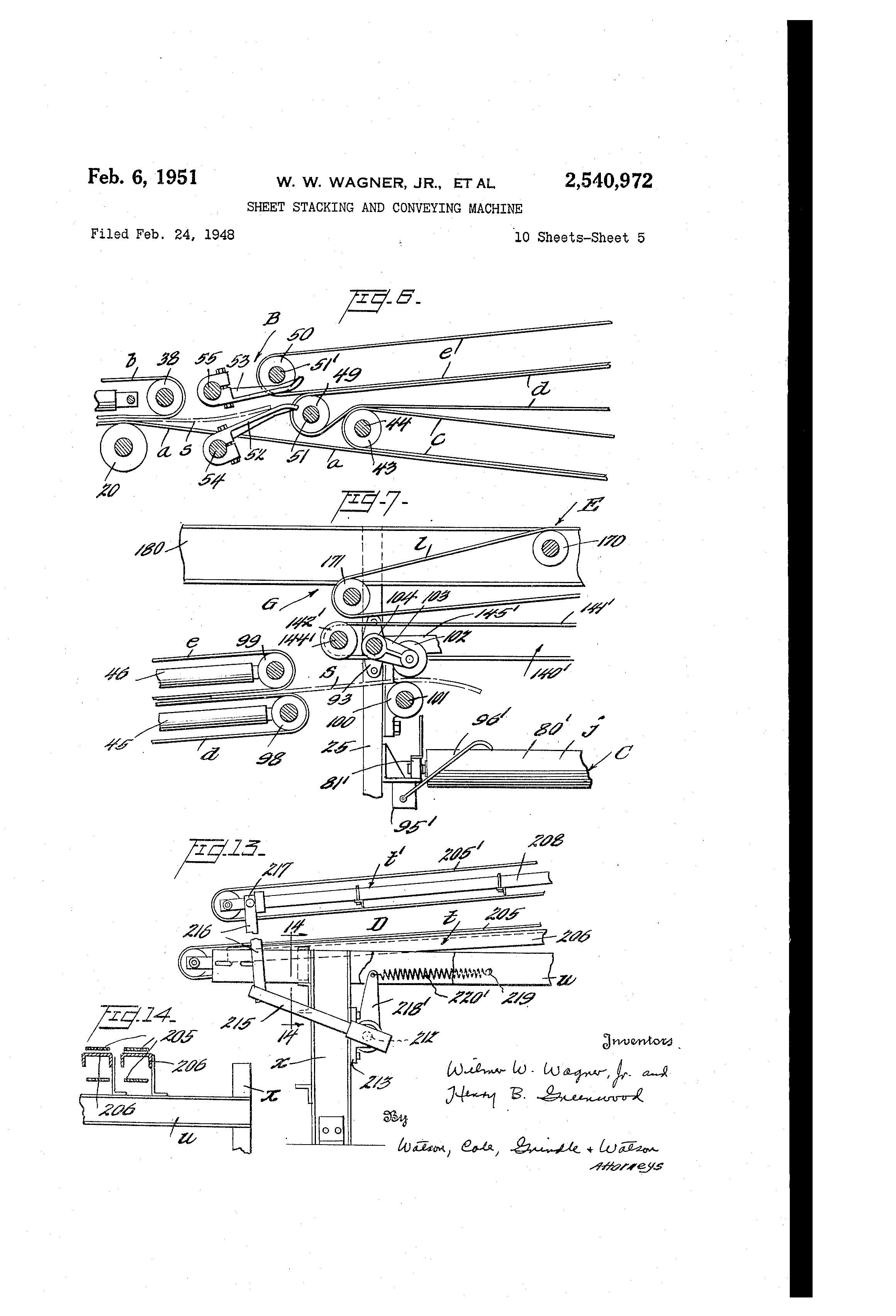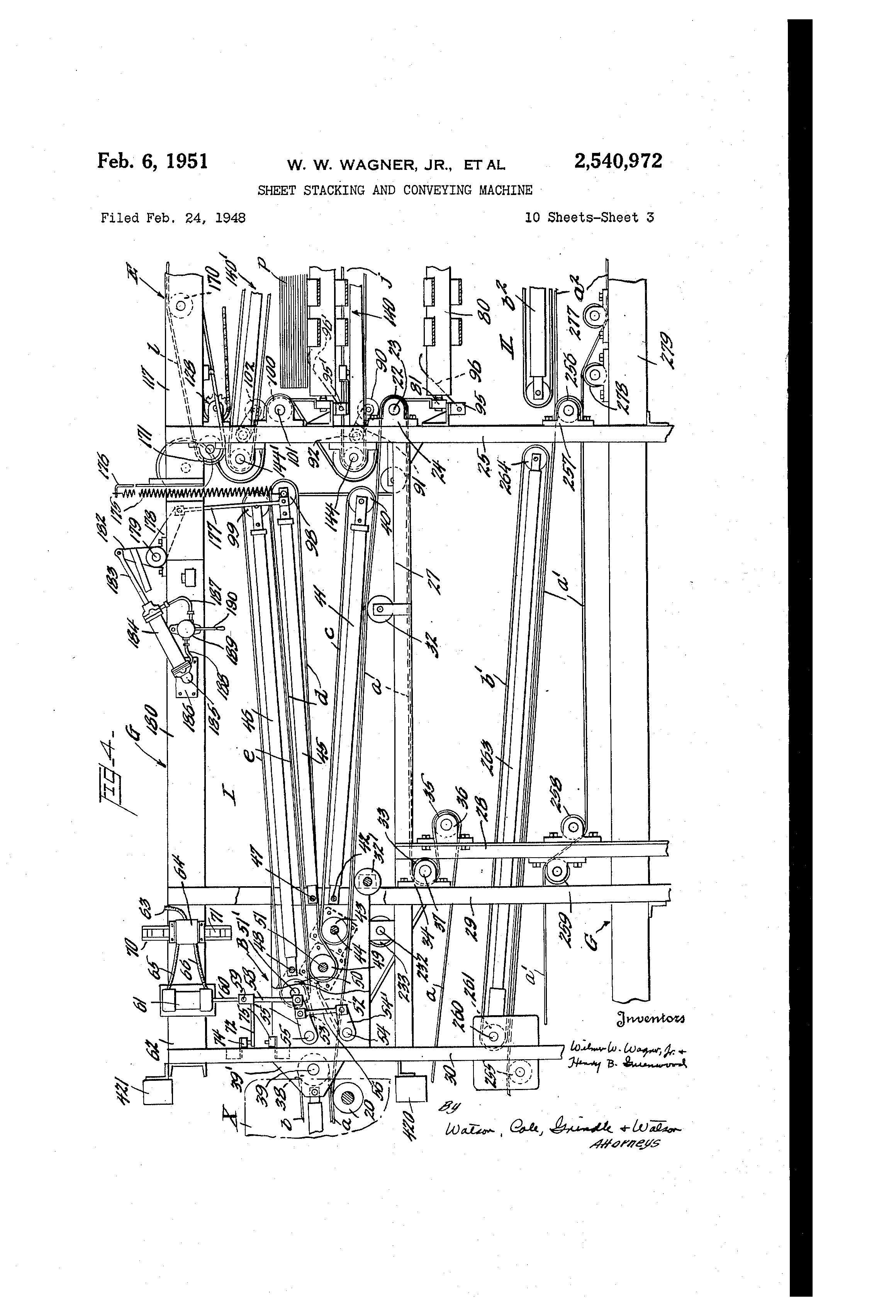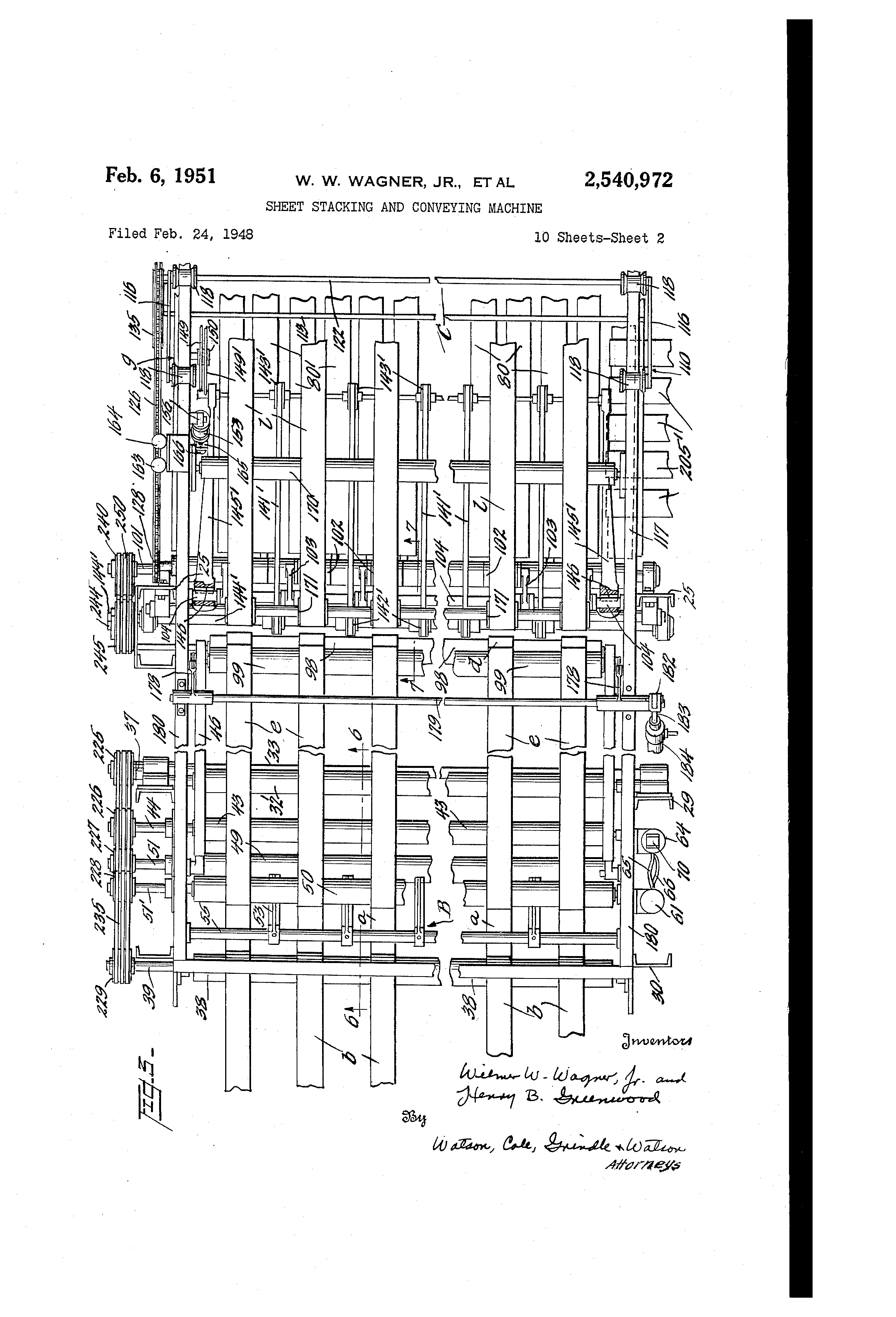Letters Patent is: 1. A sheet stacking machine of the cla s described comprising, in combination, a forked conveyor system for supplying sheets alternately 45 to two superposed stacking area,, said system compr'lsing a relatively fixed receiving conveyor portion, and two superposed branch conveyors extendinf., from said receiving portion, the lower branc@h coneyor adaptect 6o ueilver successive 50 sheets upon the lower stacking area, and the other branch conveyor adapted normall@y to dbliver sheets to the upper stacking area, and a sheet diverter for de-.Flecting sheets to one or the other of said branches at the fork iii said con5r, veyor systerji, a third receiving are-a for sheets above the upper stacking area, means for pivotallv mountinf the upper one ol said branch conveyors, and means for raising the delivery end of said branch so as to deliver sheets normauy iii) destined for said upper stacking area to said, third area. 2. A sheet stacking machine of the class described comprising, in combination, a forked conveyor system for supplying sheets alternately ii,-, to two superposed stacking areas, ,zaid. system comprising a relatively fixed receiving conveyor portion, and two superpo ed branch conveyors extending from said receiving portion, the lower branch conveyor adapted to deliver successive At) sheets upon the lower stacking area, and the other branch conveyor adapted iioriii,,Iily i:o cLeliver sheets to the upper stacking are--, and a sheet diverter for deflecting sheets to on.e or the other of said branches at the fork in said con7a veyor system, a third receiving area for sheets ,i@ove@,the@ @@upp6r @@taaking @area, @ift@ans @fok pivotally mounting,the,@,upper one of @,said branch conweyors, @ and @means for -raising @the delivery end @.of ..said branch 7so a-s to deliver sheets normoclly ,destined@ for @said @uppex stocking;area to said @third area, .and automatically operated rneans :idei)endent @@upon -the@ -number of sheets to com.Prise a staek-onsaid:.alternately @usable,stackl@ver M @ing @ar-eas for ;actuating, said @d' ter, and t an .ually - Tactuated means @ f or moving said @pivoted -branch conveyor to @and ,from @positi(y,@is @for @dilv.erting a. sheet@ to said @ third -area. - .3. In a @machine :of the -class deseribed, @ a !branched @conveyor system comprising an ond'less belt coni@eyor:@member h avin g a i,oller.supported -upper axticle -carryipg run and a lower @ret,urn run, . a. oboperating @ endless bel@t hold@down ,member;@bearing -upon the upper run :of said .conveyor -member@ for @the initial portion @thereof, -sec ond endless @.belt hqld-down @member beal-,ing Upon@La final portion@of:said i@irst iiam--d,conveyor. member, said.-hold-do-vvn conveyor mem,bers @:co oper@ating @wiith said @ co@iveyor meraber ito .confine. and @:gui-de.sheets therealoiig,.@said hold@ -do,w.n members bei-ng spa-.ed ,tpart at @aii intermediate @point.for-a:distance somewhat less than - the.minimum length of sheets to be handled by .the -machine, @.a second endless belt conveyor ,membe,r @disposed ,@vith its. receiving end adja@cent the @space between the -.S-aid hblddown m.embers iand -above the @.first named conveyor member, said secondendless belt conveyor membor@divergin.q froinsaid..L-inal -oort@ion -of said first iiamed conveyox -member, -a @third endless @bel-t hold-down iriaember cooperating with said sec.on-d endless .-,belt @caii7veyor@ iiie,@nber, @.and. a sheet diverting member @.disposed adjacent said @.space, and means for shif ting said diverting member p .to bet,@iee:a the ornveyo r andi@the ,tion,.of eildles@':-belt 'co cooperating seco-Lid endless --'oelt 'hold-do-@vn n:te-.,nb,o,r@- oribebw.een.'-.the-,Sec-olid@endless@belt'U- e-nn@v@eya r -@. Prd @,the cooperatina . -third -@hold-@dou@n inernber. @she@et gtac-ling - @rjaachir@e:.of @,t@l-le @class @Qonveyor syster@i as I set: @ ort-h-:@in one,@of-ithe rollers support-@ng iiaiicl@ 'first ,xlained i@ndless belt @:corlveyor is .,.ex@ tended laterally @beyo,,id the be!-ts thereoii and carri@s a Pulley; @means are provided for driving said :,first named conveyor' pulleys are 2re;S,Pectively,@provided-upon the eiids of at.least@one of ',the @rollers @suppor,@ing said initial @@holddovTn endless @belt@conveyiiig,memb-,r,,,said.fir@al holddow,n @endless @belt eqnveyor me.@-iiber, @said secoiid endless,belt conveyo.-@and its hold7.doT@vn member; and driving belts are provided 'coyi-p@ect;iiig @said@--!iLIlieYs -foi@ @'tra-@isni@.Lting, povzer f ro@-ii said--first named coaveyor-,to @t4e,Qther,@coiivey-or;3 ,aiid-,Ii@old--down-,.znE[mbers. 5. in a machine of the class dewribed, a bri@ne,bp-d codvovor.sy-tem beit-.cQ-ti@@eyor@Tr4eiiib.er.-ha,ving,,a@r-oll r s ,e . iipportod upper arii,-Ie carry-ing :run q-nd @@n @lower @return run'- @a@7cQ.Opera-ixlg@- end'@'ess@belt..hold.:.,dp.ivnem-M upo. ;t@ier., r@t e iiitial- orti.onthereof@@asecond menkb fo . b -P..- a f-ina portioi-i.- .of.- @s@2@id@fir@t @named@c nveyor@mem4e@ , aid -4old@d6wn, -,eoi-vel@Qr n@embpr -coo Pr,- p ating @with said conveyor iner!iber to confine.and guide @ sheets therealong, said hold-down rf@embers being spaced apart at. an intermediate poilit.-for a. distance somewhat less @thaii the minimum length of sheets to be handled ..by --tlie t4 @ber -disposed @with':its@@receiVing @end@adjacL@'fit@ thd. space @between the @saidhi)ld@down -members ':above @the:@first Pnamed@zonveyor member,@ said second endless Velt@conveyor member diver-g-ing @from said @fingl @portion @of said fij.,@ t named coiiveyor @ member, @ a -,.third @ endless belt holddo member cooperating with said second @endless belt @cbnveyor member, and-.a sheet @diverting @riiember @disposed adjacent said 'space means 10 for shifting said diverting @ @member to direct. -sheets either @ b@-tween the-,@flnbl @portion of said first endless belt conveyor @and @the @cooper-- ating second endless belt hold@down member :or 'between the: second eridless: @conveyor and @the co operating third hold@d