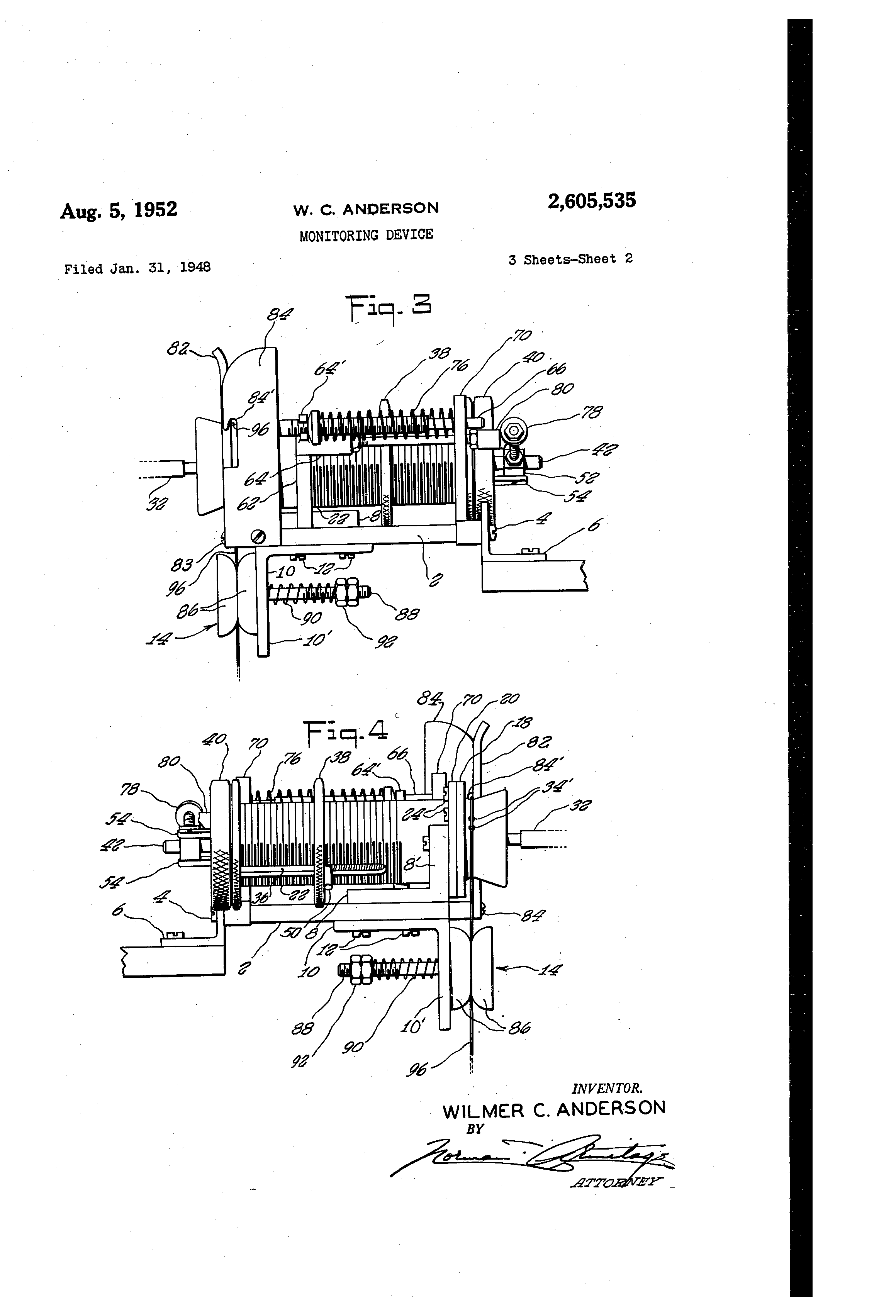 Patented Aug. 5, 1952 21605 535 STATES PATEN'T OFFICE 1-40NITORING DEVICE Vvi-lmer C. Greenwi@h, Conn.@ as@ ign6r to Deerihg Milliken R6search Triist, Ndtv Ybtk, 16nl3rofit trust of New York Applical@ion January 31,1948, Serial No6 5,58'0 44 ClaIii--ns. (Cl. 28-64) 'Th,e r(@sefit invehtion r6late8 tb the M@,huf'a@c.p titre of yarn a:nd more pa@rticulorly to tl-ib itisteetion of Y-arn for detecti6n iind r6riioval bf oversized sectibbs theteiii, iiiid borApkise8 a nbvel pneifmatieo,lly operated yarn rh6ftitoting device r) which is 8imple and economidol of con@trticti-o'ii, positive in ac@tioii,@ ofid opettlt -es tb tomsb bi7oatoge Of @the e ,yarn when the diamlitot th6rO-of 4@@te @-d@ @t prodetermiiie d Vgluo OV4@it a pred6terhiiht@d length. The iiew device does fi6t dtiiitlgo t'ho Yarn, cbbii 10 be threaded in one siihple Ulie-tOtion bnd is tliiick aetitig, p6rniitting relatiVOI-y- tapid kbte oi yarn travel therethrbugh. The itivontiori includes OIso a novel method of detecting and 8ignalizing yarn dialneter variations 15 There ate various kiAoWn mechanical devices, called @sltib catchers, fiow iii iise in thi@ textile industry, each 6f Which operate8 to cut br break yarn whenever the diameter thereof e-.cceed8 a vglue for which the dovice is 8et. In general, 20 these deivices respond only to the diarhetor of the yarn 'Ond do not distiiigtiish between 8lubs of different lena.th. As very short slubs are ordi@ naril@r not objectionable, niost known devices cut or break the Yarn more often tha;n ig nee6ssarY. q5 This regults in an excess of knots in the Yarii and in u e I:Ibor on the part of the operator whc) niust -remove tho glub from one end of the 'Ydrn after severande by the device and tie th6 Cal slub oatchers now in use, the yarn in its travel i,@- constalitly enggged by tlle otttting or break@ if.ig niember8 of.the dlivice and henc6 its surface l@@to 1-mes abradeci or roughened dilring passage th@ough the device. 35 There ha8 thus been a decided ii(@ed in the industry for a slub catoher thqt ebuld distinguish bL@Ltweon loiig @Ltid short sitibs -and that w.ould not damage the surfaee of the yarn. As slub catchers are used at va-rious stag@s of y -arn 40 mo,nufacturo, a great nttmbet at6 required iii atiy one mill. Hence, it iq of iinportance that the device be of simple and ecbnomical - construction, that it operate witholit f6ilure atid th@Lt it can -be ea8ily. arid:tapidISr roset atid rethreeidi@d. 40@ The morlitor de'vice of the.prosont irivention meets these and other desidereita,. It - discrimiiiates bet@reen short and long slubs, allowing t]@e former to pass and causing bri@okage of the'yarn iipon occurrence of the latter. it is of simple atid .50 durable construction and Liconomical to operote. It has' no-sharp or roiigh Odg6g.fbr travel (if thereov,er and hence does@not damage the arn. y'@ Tn@the neW sliib catcher, ait, or other comptesfl ug@ o@ sible@ uid, is deliveted undot pre@sure't'hro h, 65 severed endstogether. Moreover in the m@chaiii@o f6J@ con@Tenielit mounting bii e@ny suitoble fixed 2 r- t"' t d es rice passage t o a charnber from which it bleed8 to the @Ltino@phere through an brifice oveftliieh tho yarn travels. When the Yarn diam@ eter ext I eed8 a; @predetermined value ovor a preermined length, the resulting increase in pr@s@ @ure in tlj:e chamber operates through a pressureraspoiisive raember to trigger a yarn holding elen I m6 t, the dioLlhLter of slub to be c@iught 'and ininimuin length thereof, depending upon the adjustmtiit .-of, the ttiggering element, upon the su DIS? ptessure, upon the size of 'orifice'and upon @p +.ht 'rate of yarii ttavel. Por g, b-ett6r understanditig of the invention, reference may be had to the accomijanying 'drawinks '01 which: @M9. I i@; a top plan view of a pneumatic y@arn mbiiitor OMbodYing:the iiivention, Pig. 2 is 'a front view of the dovice bf Mg. @l, Pigs. 3 Ond 4 are side view8 of the device Of lqg. i looking from the right and left res,oectiv6ly of Mg. 12, Fig. 5 is a sectional view on the line 5@5 oi Fig. 2, and Mg. 6 is a 'sootioiial@ view of 'an alternative type 6f @res@ure head. Iii thi@ i@ortieWE@k emb6dim, ont of the inven@ tidh@illustrqted iii Figs. 1 to 51 tho vatious parts of tho device are mounted on a b8;se late 2 which p is 8ttuti3d, g@ b)r sdrew bolt8 4 to a brackbt 6 p-att of @i; win ding m4chine br other niechaiiism With thich'thia device is to b6 @ised. Tw6 L8hb,,p6d @iii)pbrt rhoiribe@ts 8 and I 0 are p68itioiiod j:e8pootiv6ly above and below the base '2 with oiio leg of 6ach gecu@ed there@to by bolts 12. The othor leg 8"6f inember 8 supports the pres8ure rb@pbh8iVe @10nierit dnd as8obi8@ted potts of the d6vice toW t6 be describ6d and th6 other leg I O' ofnleinbet'll0support8geonventionaly nguido ar and'tensioiier 14. The DressUre regpotsive elemeilt c@omptises a eirculor diaphr@.igm 10 (see lqg. 5) which is Clahip6d, adjac@nt its periphery, between a disk 18 and ail anliular flange '20 of ii cylindridal M@rnb&t 2.2 as bv means of setews 24. Certairi of ilie-@erews@24 Pas' throu s gh tli6 leg 8' of s-dpport @ 8 @ and: -BOrv6 to4 secure the Osiliiider: 22 td the -SuP@cir.t; @ the ieg 8'. bei'ng cut, away, as shown, fdt receliti6n of the b6d cylinder. 'The Y of the disk@ 18 ha@ @a Peiitt@tl apertute thekdin Whi'c;h is sbrew thteaded 'fo@r @ r@6blitibh of a turned, doivn and e@te@ritliiy throaded pbrtion 26 of the y@ar'n 9,Ltrgtng, head t6 -Head 28-cbiiiprises a g @'t fit@l- @ efle -ali@7 tb.@-6onicAl rAeTAber' having, an exterh@:il a'nh-u-- i 2 s v groovi@ 8' fok iiiding arn in it it66 'bi 3 through the device. Portion 26 and the central part of head 28 are reamed out to provide a pressure chamber 30 communicating with one side of diaphragm 16. An air inlet tube 32 6xtends into a passage 32' in element'28 leading from the face of the element to chamber 30, the tube 32 being press fit and welded or soldered to the wall of the passage or otherwise tightly secured in place so as to prevent leakage of air. The p