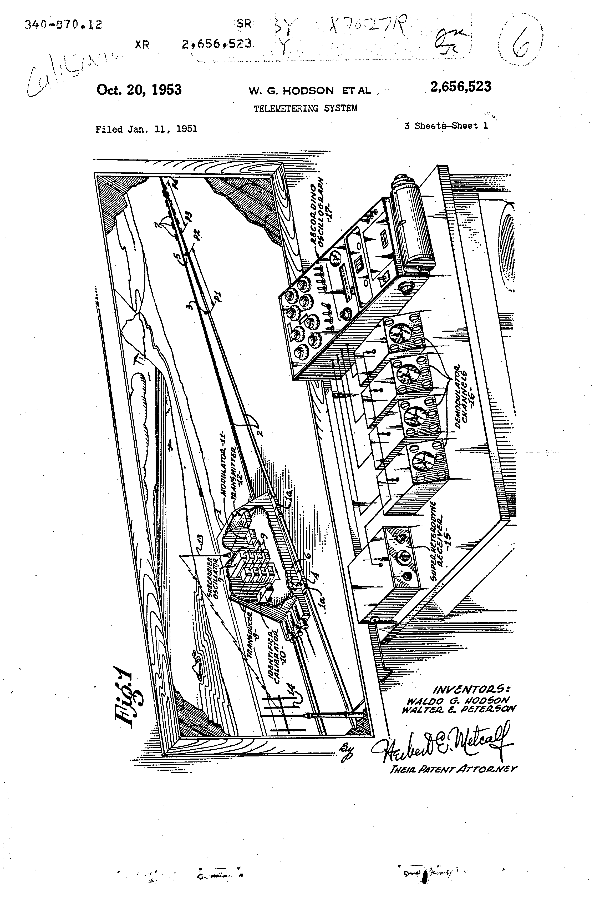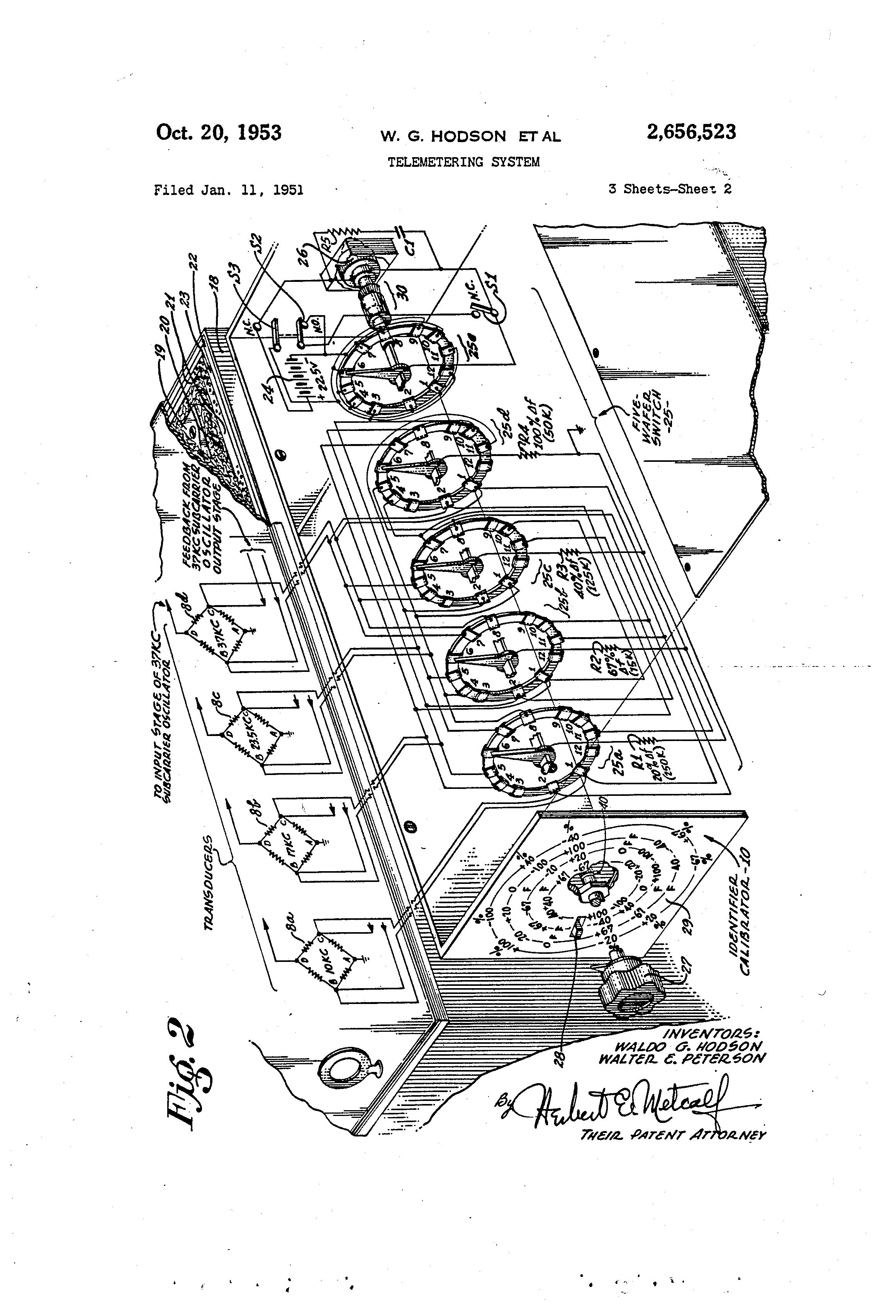 claimed is: 1. In a radio telemetering system for transmitting data fron, a vehicle to a remote receiving station, the combination of means Producing a single transmitter carrier -wave from said vehicle, ping said inotor at said "off" position of said -i switching means at a later point in said vehicle . - plurality of subcarrier channels each connected to simultaneously feed a portion of said data into travel. saici carr'Ler producing means for simultaneous 6. Apparatus in accordance with claim 2 modulation thereof by all of said data from said 1 wherein at least one of said information trans@,ubearrier channels, and identifying and cali- ducers is replaced by a dummy, nonvariable means adapted to be connected int-o-- sa-l-d transducer which is connected in a desired subsuzca-rrier channels as and when desired, said carrier channel to normally give a steady "zero" idei-itifying and calibrating means arranged to output, whereby improper spurioiis signals approduce ,t different predetermined series of se- 10 pearing in the output of the entire system can be que,-itial signals in each of said subcarrier Chan- detected and allowance made therefor. nels, whereby each channel can be easily identi- 7. Apparatus in accordance with claim 2 infied at the output of said system and furnished cluding a receiver adapted to receive and detect with calibration information for deterrrlining tbe said carrier wave to reproduce said subearrier true value of the data fed from each of seid j5 channels, a plurality of demodulator channels subcarrier -@hannels. each connected to the output of said receiver, 2. In a radio telemetering system for trans- said demodulat-or channels being respectively mitting data, from a vehicle to a reniote receivtuned to accept the signal from a different one of ing station, the combination of means producin.- said subcarrier channels and no other, each of ,,t single transmitted carrier wave from said ve20 said demodulator channels being adapted to conhicle, a plura,ity, of -subearrier channels each vert its respective frequency modulated subearh@-vin.g a diferenl", operating frequency and con- rier signal into suitable current for driving an nected to feed a Portion of said data into said indicator in accordance with a function of the carrier producing meaiis for sepa.-rable modula- instantaneous frequency of said respective subtion thereof, an information transducer in each 25 carrier signal, and recording means for preservof said subc,,trrier channels connected to produce ing said data, as shown by said indicators, in rean electrical si-nal representative of a certain lation to elapsed time. varia@le coridition making up said portion of 8. In a radio telemetering system for transmitting data from a vehicle to a remote receivdata, and chalinel identifying and ca3ibratirig means comprising a plurality of different valued 30 ing station, the combination of means producing ele(-,trical components each adapted to be mo- a single transmitted carrier wave from said vementarily shunted a-,ross an@, of said transducers hicle, a plurality of subearrier channels each to produce a predetermined variation of output having a different operating frequency and conof said. tra@-isducers in the form of a pulse, and nected to feed a portion of said data into said switching -neans con-nected to pro-ressively 3,3 carrier producing means for separable modulashunt each of said electrical componei@is across tion thereof, an information transducer coneach of said tralis(@ucers in_ a predetermined nected in each of said subcarrier channels and order, i7;hen actuated, so as to produce a cycle adapted to produce an electrical signalrepresenof pulses in the output of each of said subearrier tative of a certain variable condition makin.a up cha,-mels, vhich cycie is ijeculiar to a desi,-,nated -1( said portion of data, and a channel identifieront-, only, of said ' ,ra-isducers for channel identi:ricatioii, the values of said electrical components bein- e,,ich designed to give a respective pulse ,ha,racterisl@'ic correspcnding to a kliown value of the desired data, to be transmitted from said tramducers, whereby tlae transmitted data, arriving at said receiving station Nvhen said switching mea,is is non-actuated can be accurately cah]- )rated throughou@- the entire r@cnge of operation. 3. Apparatus irl accordance with claim 2 wherein said electrical components are four resistors having the proper respective values to give outpi,,t pulse amplitudes corresponding to approximately 25%, 50%, 75% and 100% full scale deflection of each of said transducers when respectively shunted acro@s said transducers. 4. Apparatus in accordance with claim 2 wherein said identifying and calibrating means is positioned on said vehicle, and including manual-' control means for ac@uuating said switching means to any position when de@ired, and wherein switch actuating and de-actuating means is pro-@' ,jided to produce at least gne cycle of said output pulses when said vehicle is mo,ving over a predetermined part of its rtin. 5. Apparatus in accordance with claim 2 -,vherein said switching means includes an "off 11 position where all of said electrical components are disconnected and a plurality of active positions in which the different ones of said electrical components are shunted across respective transducers, and includin@ a motor connected to drive said' gwitching me:ns through said positions, means for startifig said motor at a desired point calibrator unit comprising a multiple pole, multiple position rotary switch, a resistor connected between the rotor of each switch pole and a common connection point with all of said transducers, at least one of the Position of said switch zi being at an open terminal at each -of said poles so that the rotor end of each of said resistors is open, conductive connecting means between the remainder of the switch terminals and each re30 spective transducer so that each of said resistors is 